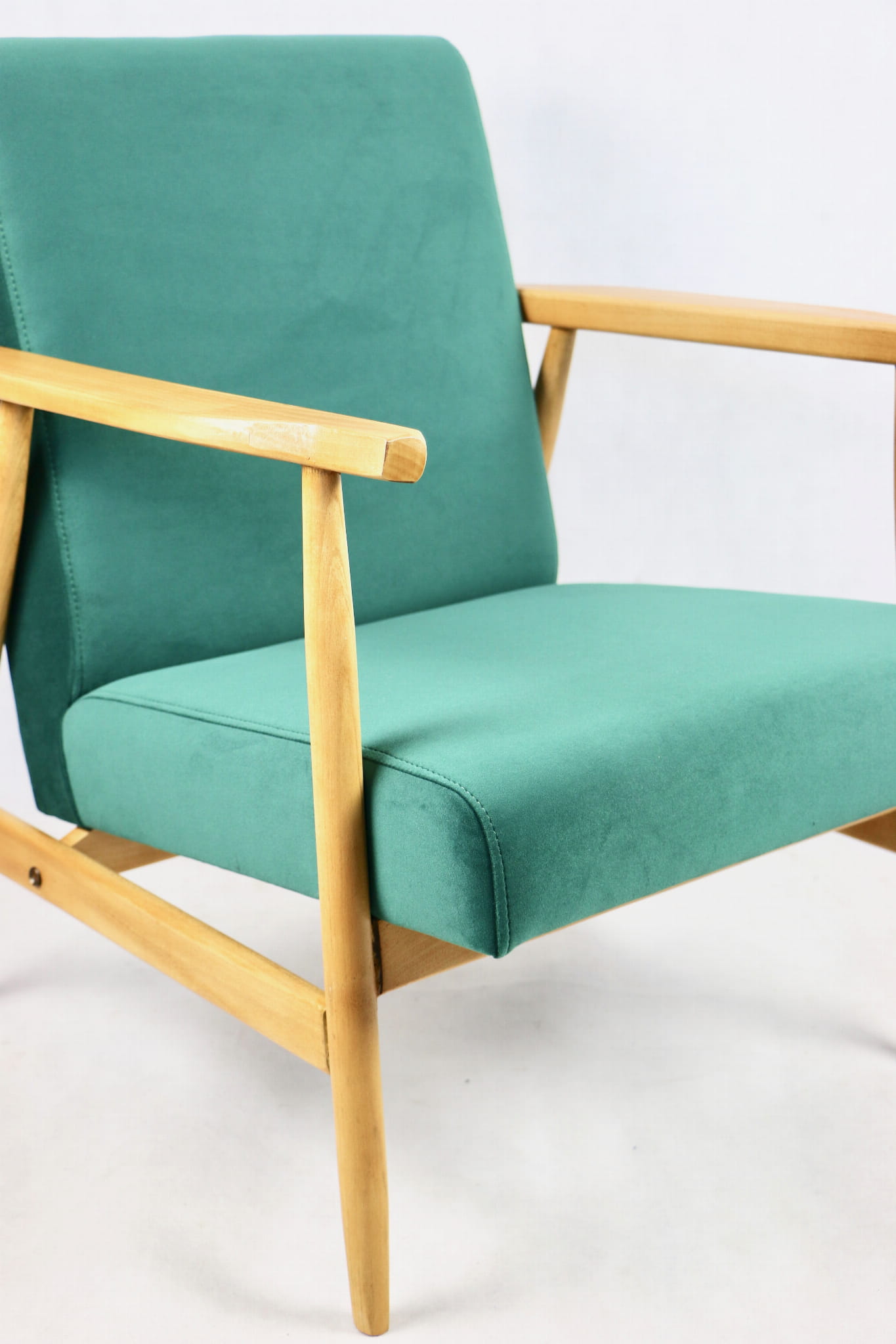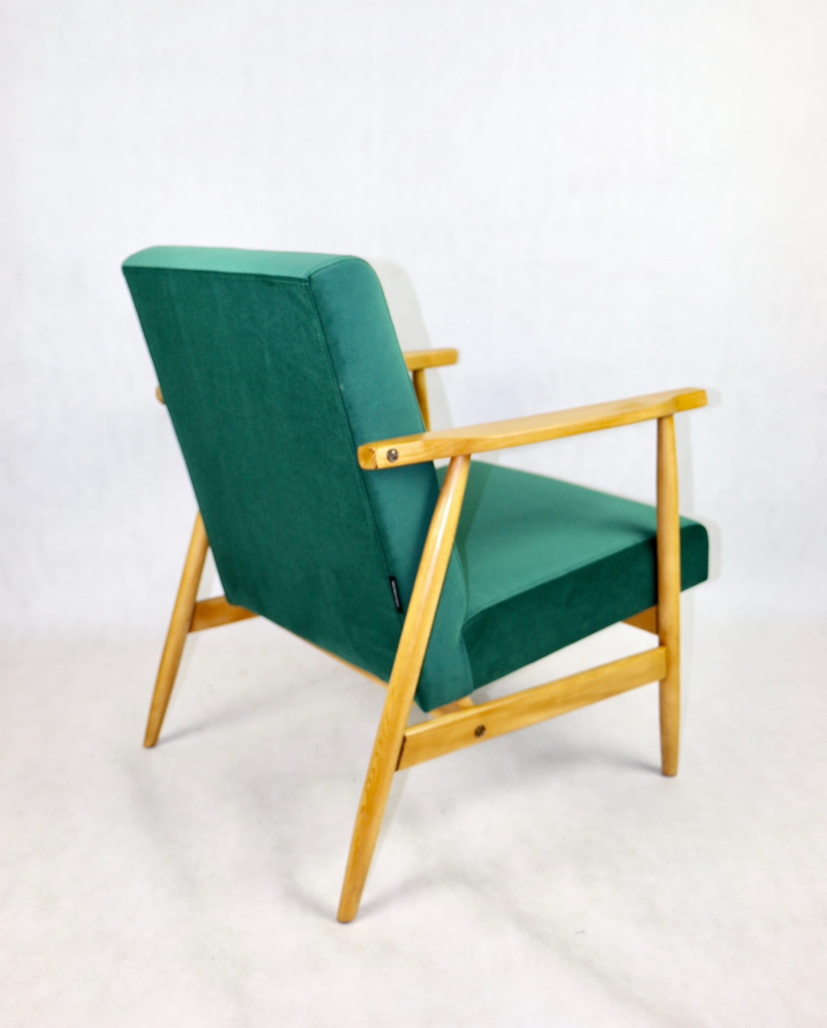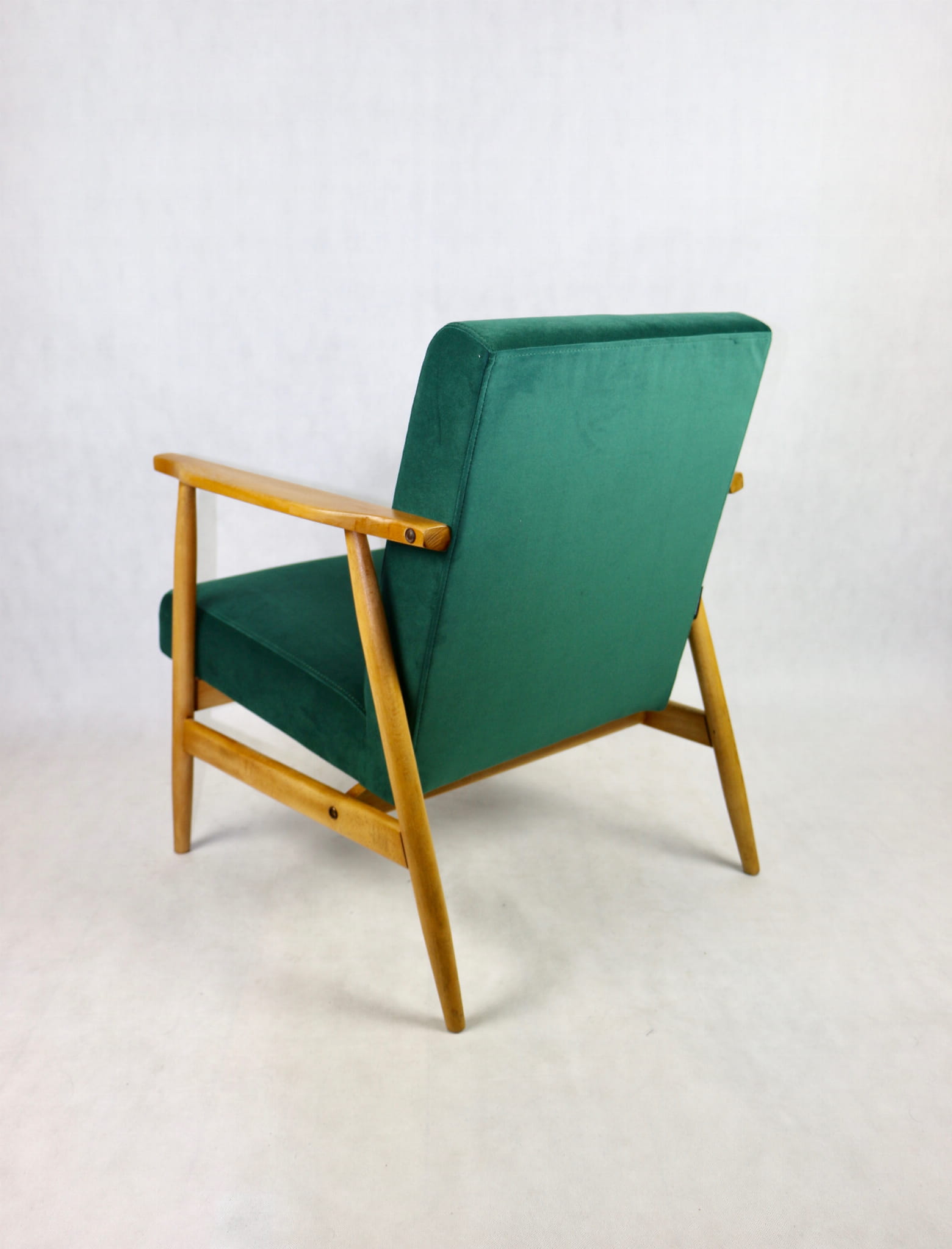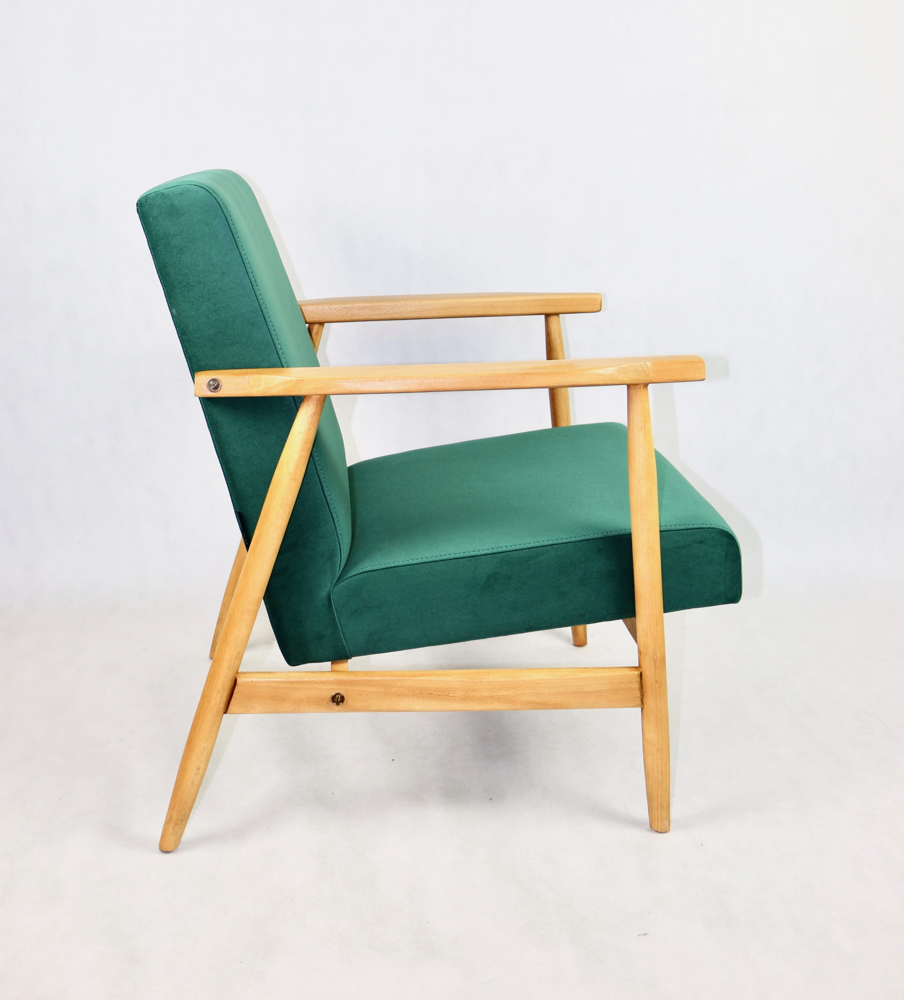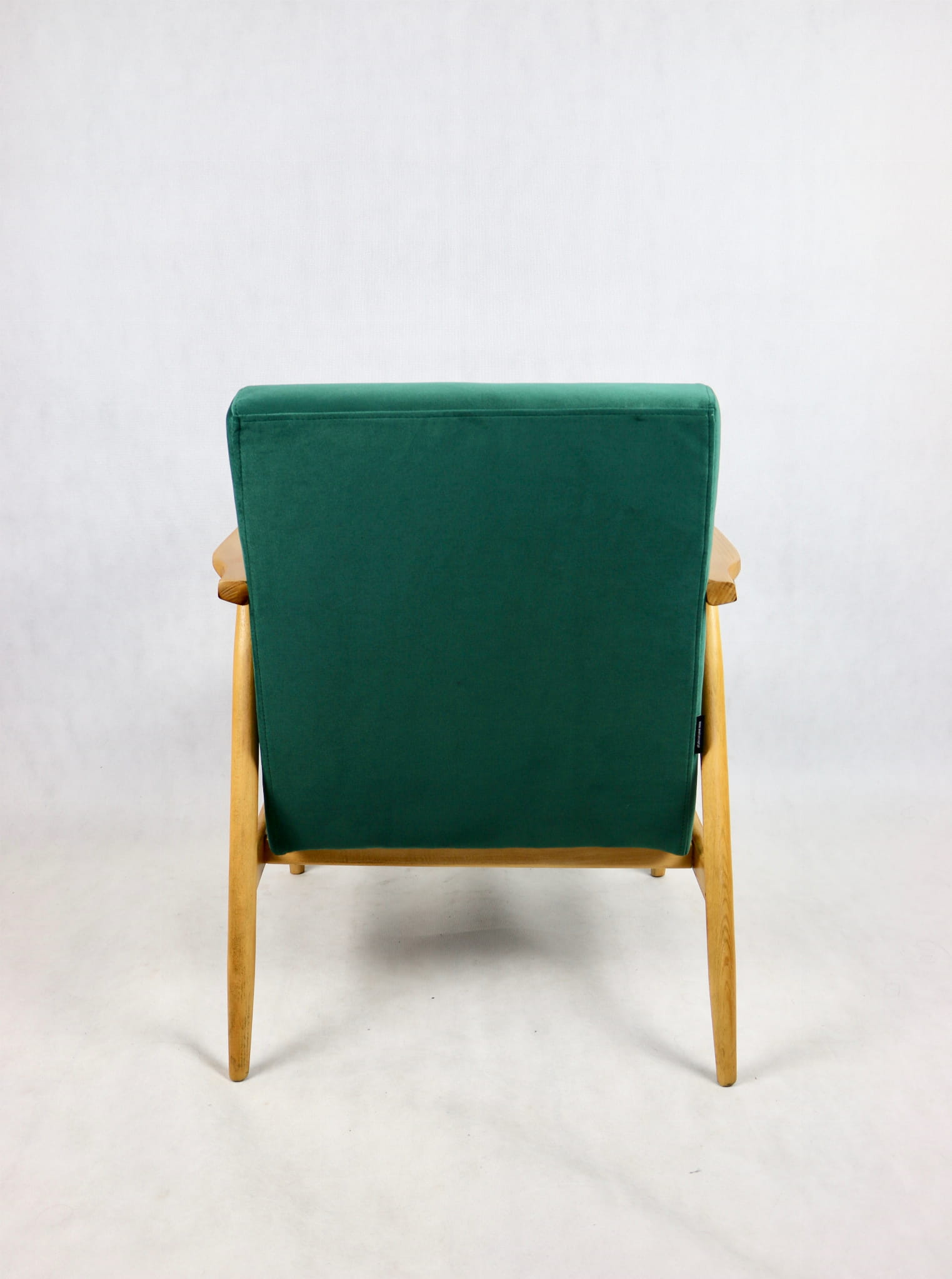 Fotel podobny do bardzo popularnego modelu Lis był produkowany przez zakłady meblarskie w Radomsku w latach 70 tych. Został całkowicie odrestaurowany, zyskał nowe i modne obicie w kolorze zielonym - materiał typu welwet z serii Jade - easy to clean. Stelaż drewniany połączony jest z podłokietnikami w jasnej kolorystyce drewna pokryty lakierem.