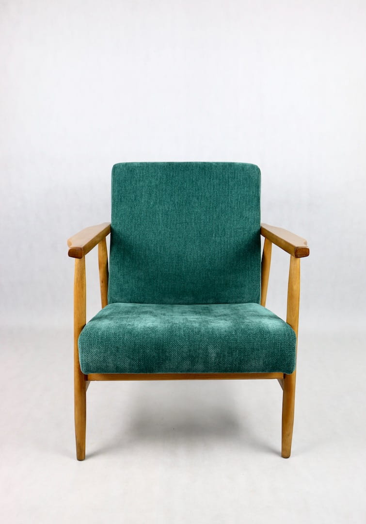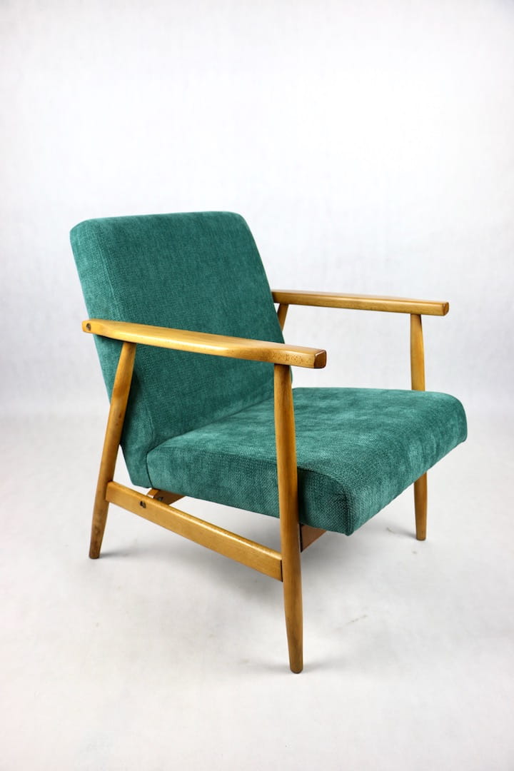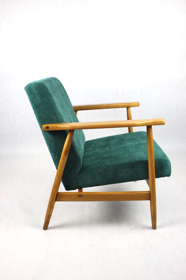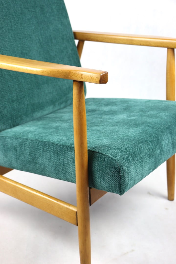 Fotel podobny do bardzo popularnego modelu Lis był produkowany przez zakłady meblarskie w Radomsku w latach 70 tych. Został całkowicie odrestaurowany, zyskał nowe i modne obicie w kolorze zielonym - materiał strukturalnym. Stelaż drewniany połączony jest z podłokietnikami w ciemnej kolorystyce drewna typu orzech pokryty lakierem.