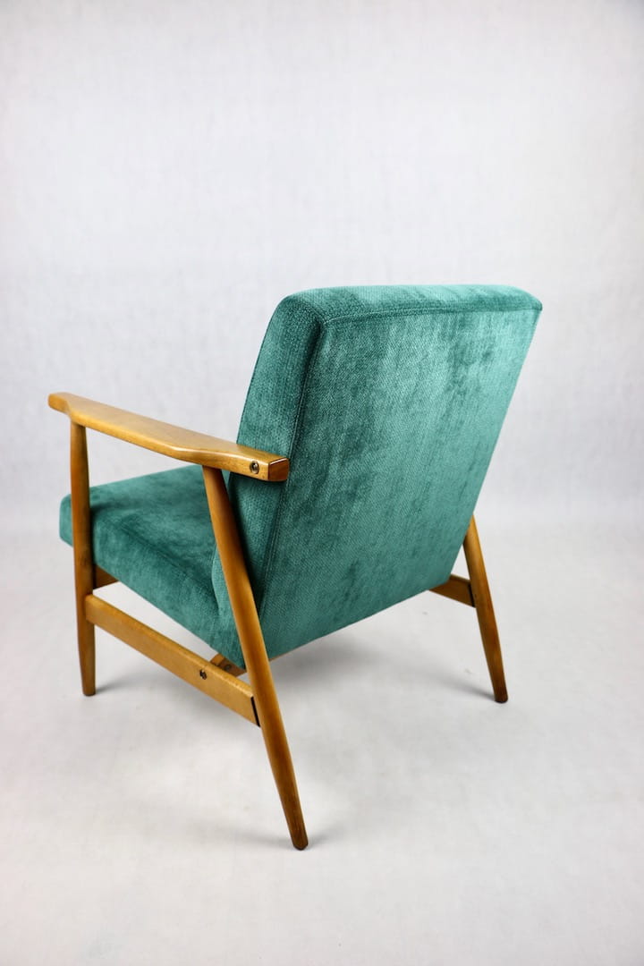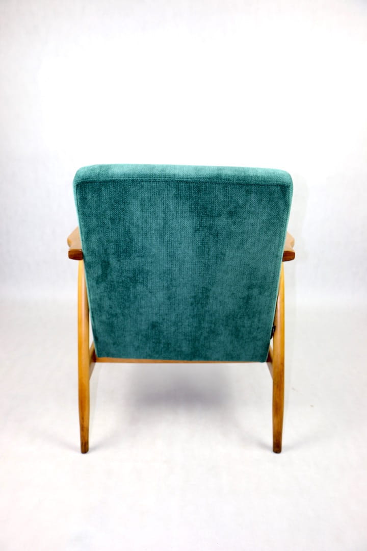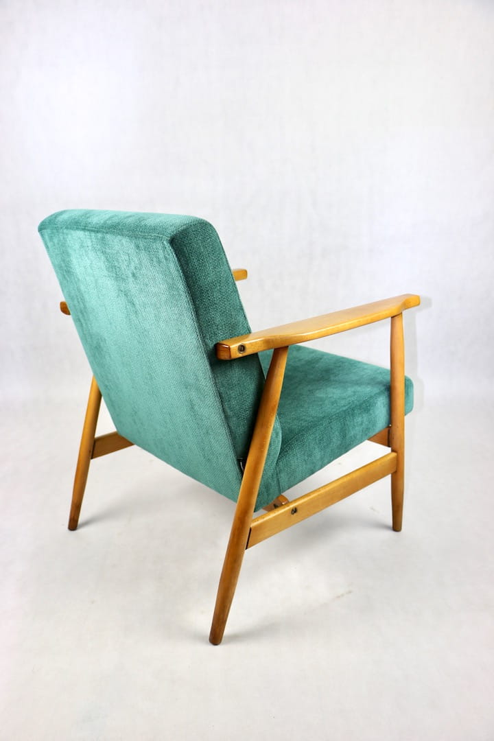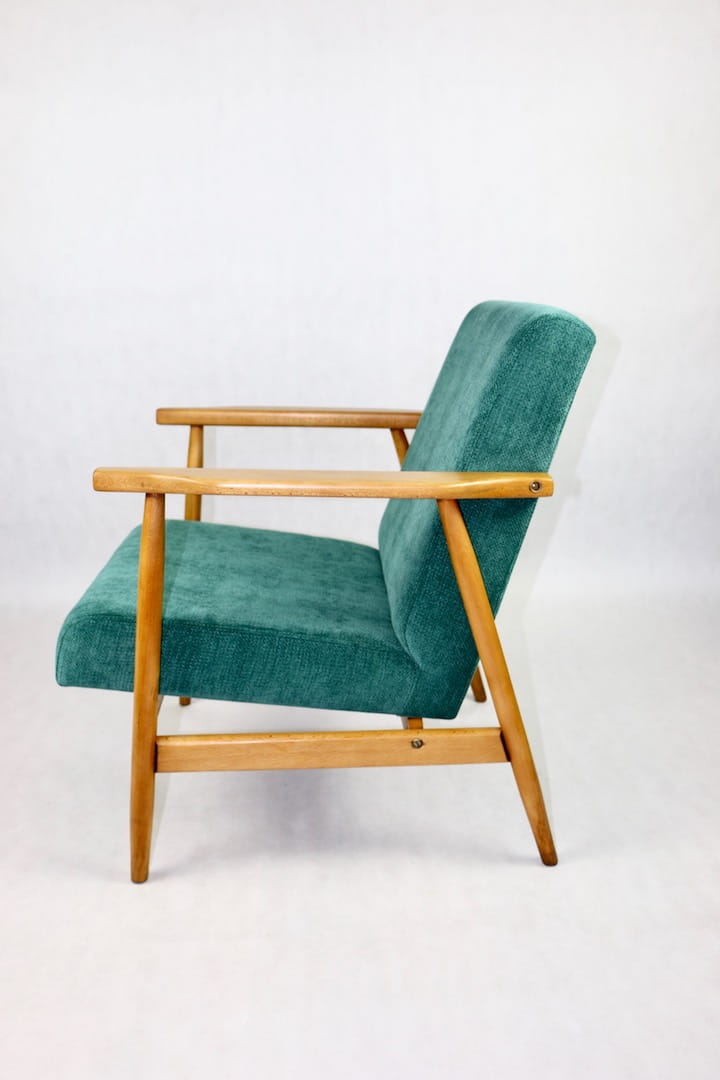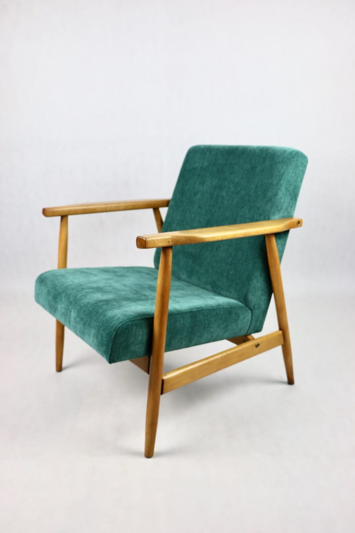 Fotel podobny do bardzo popularnego modelu Lis był produkowany przez zakłady meblarskie w Radomsku w latach 70 tych. Został całkowicie odrestaurowany, zyskał nowe i modne obicie w kolorze zielonym - materiał strukturalnym. Stelaż drewniany połączony jest z podłokietnikami w ciemnej kolorystyce drewna typu orzech pokryty lakierem.