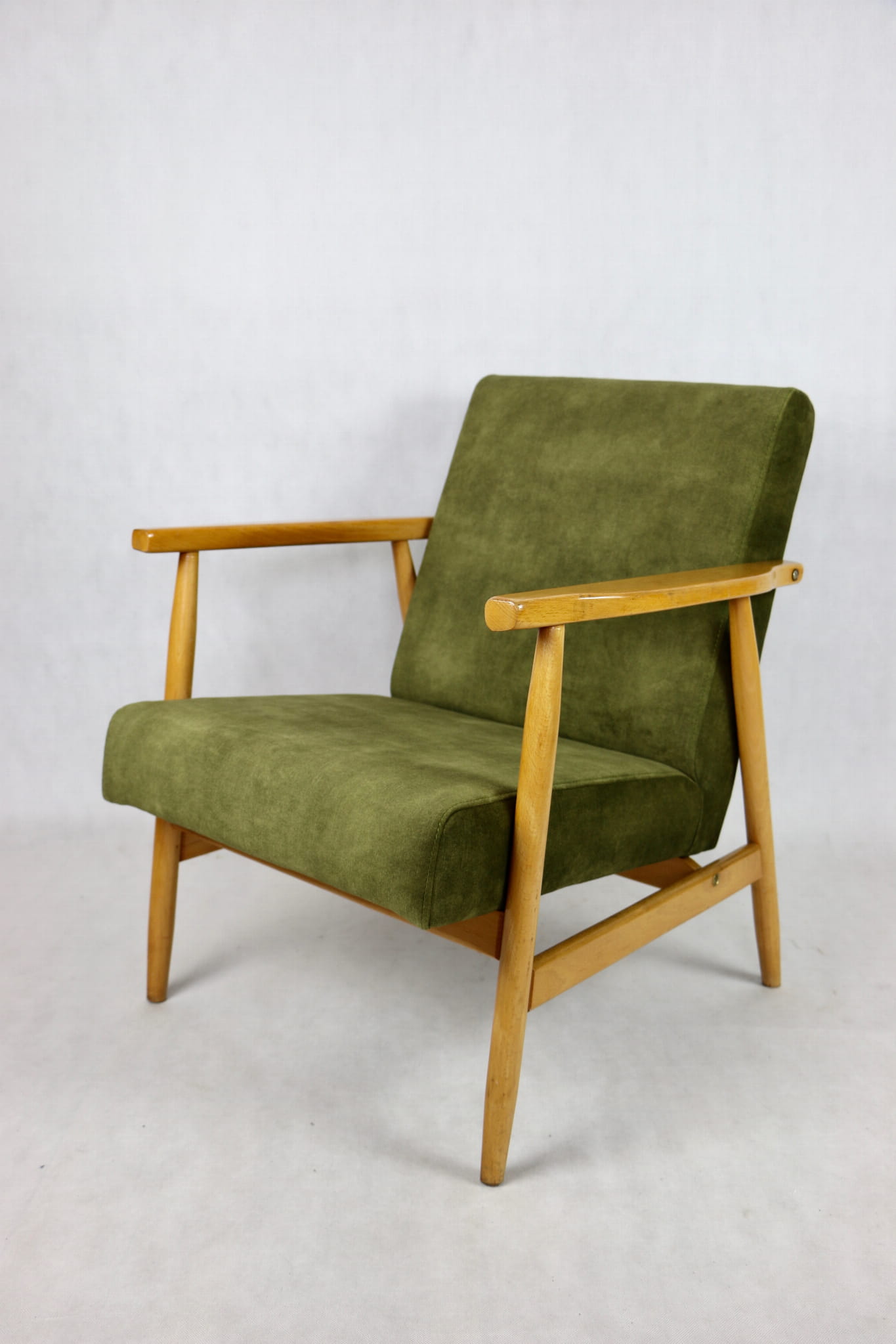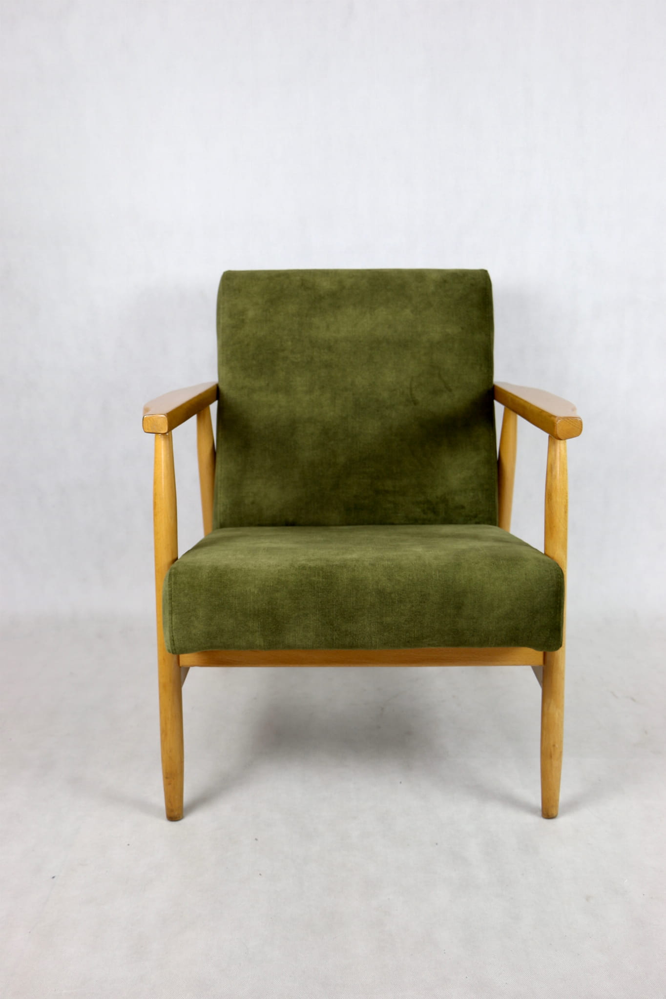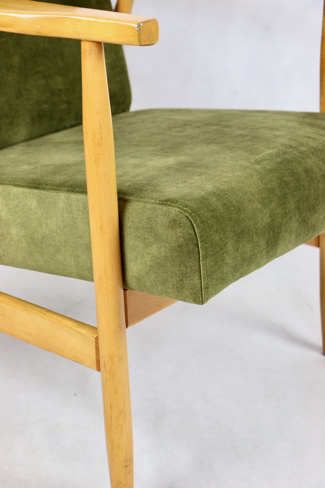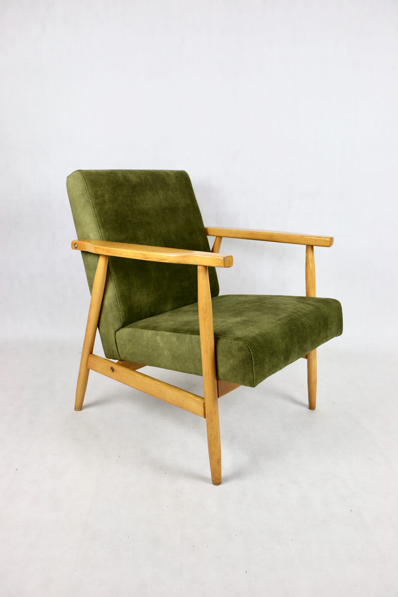 Fotel podobny do bardzo popularnego modelu Lis był produkowany przez zakłady meblarskie w Radomsku w latach 70 tych. Został całkowicie odrestaurowany, zyskał nowe i modne obicie w kolorze oliwkowo - zielonym - materiał typu welwet z serii Macau. Stelaż drewniany połączony jest z podłokietnikami w jasnej kolorystyce drewna pokryty lakierem.