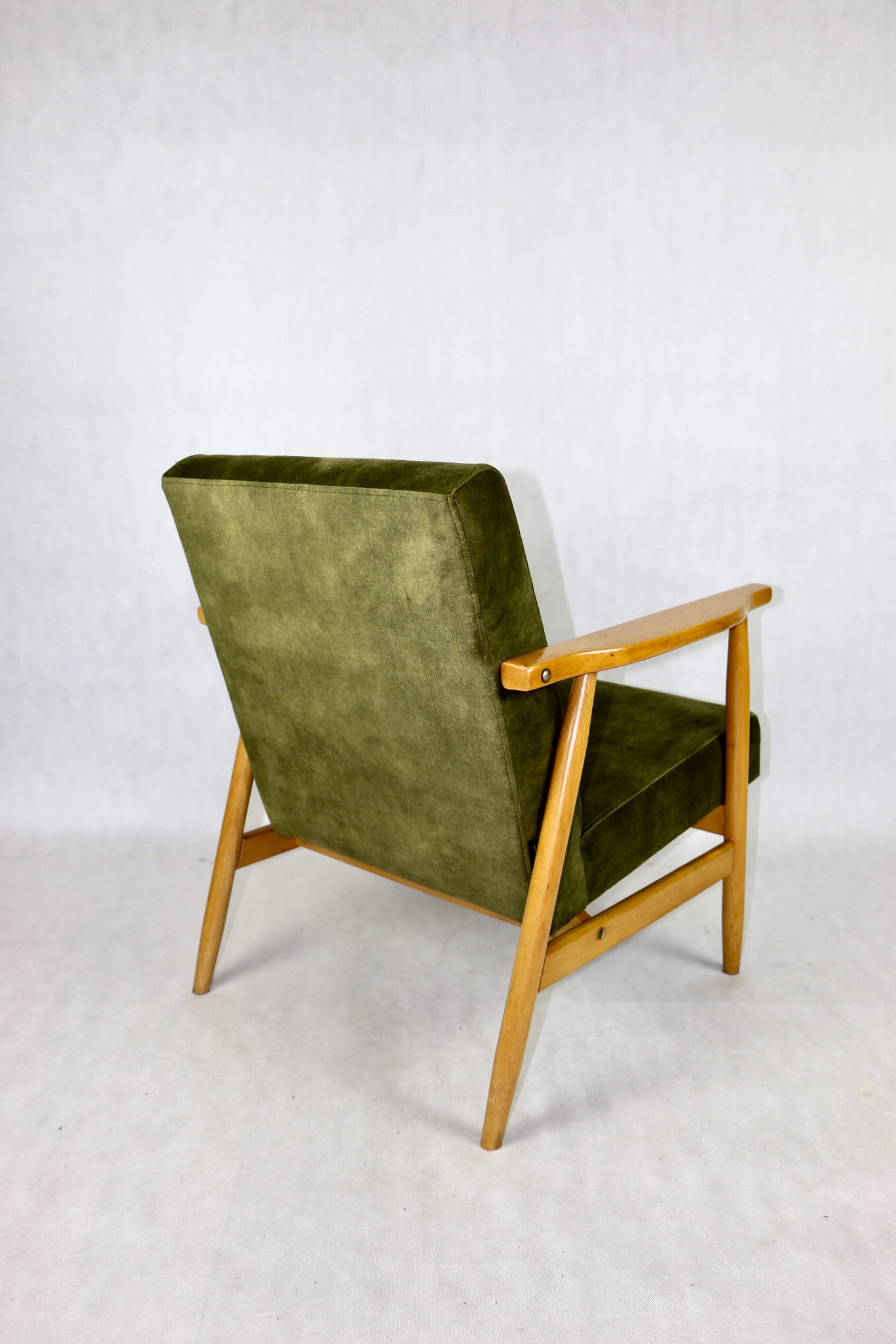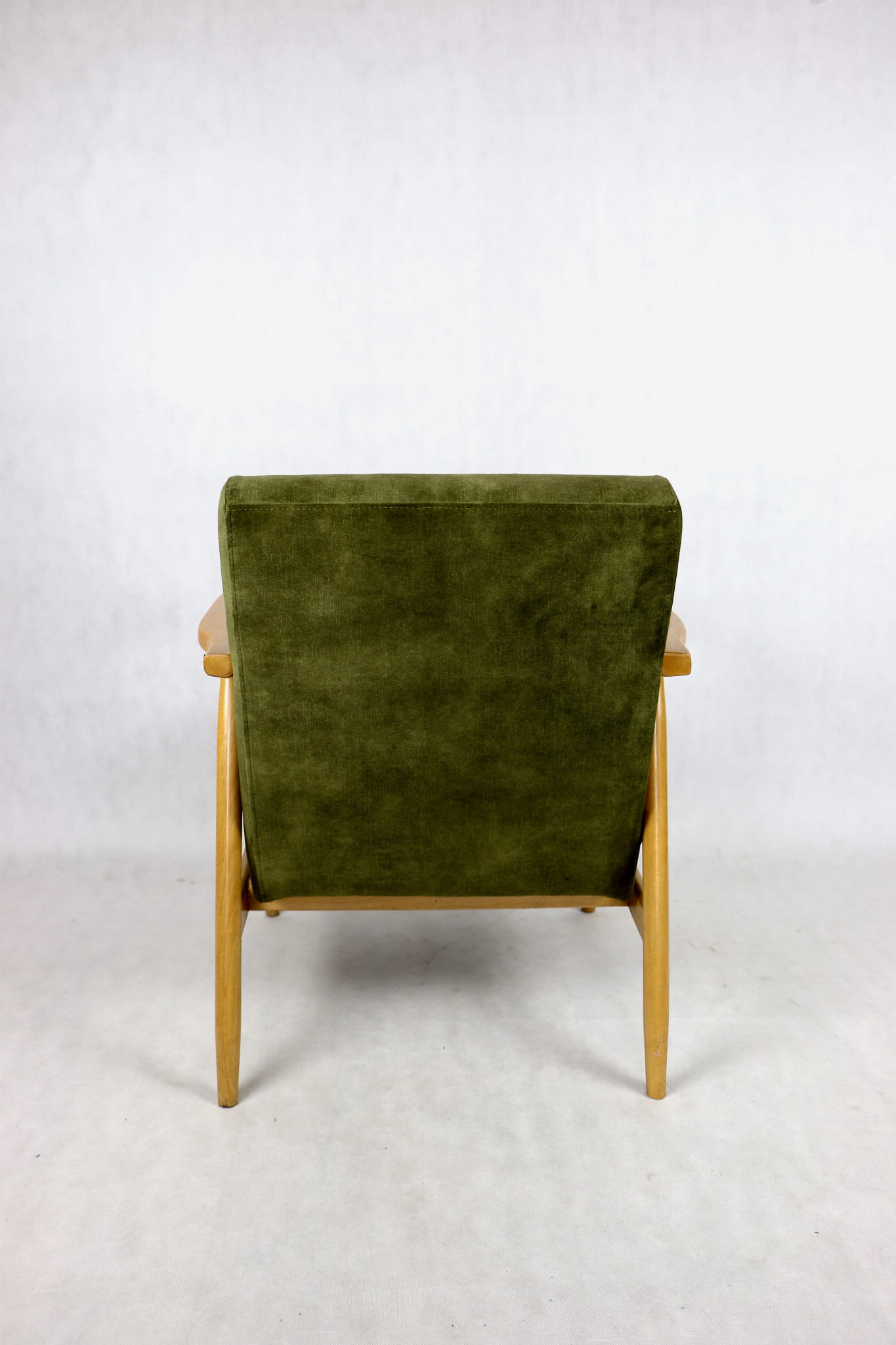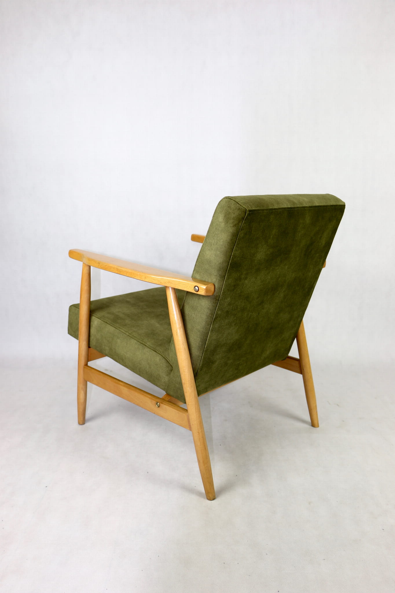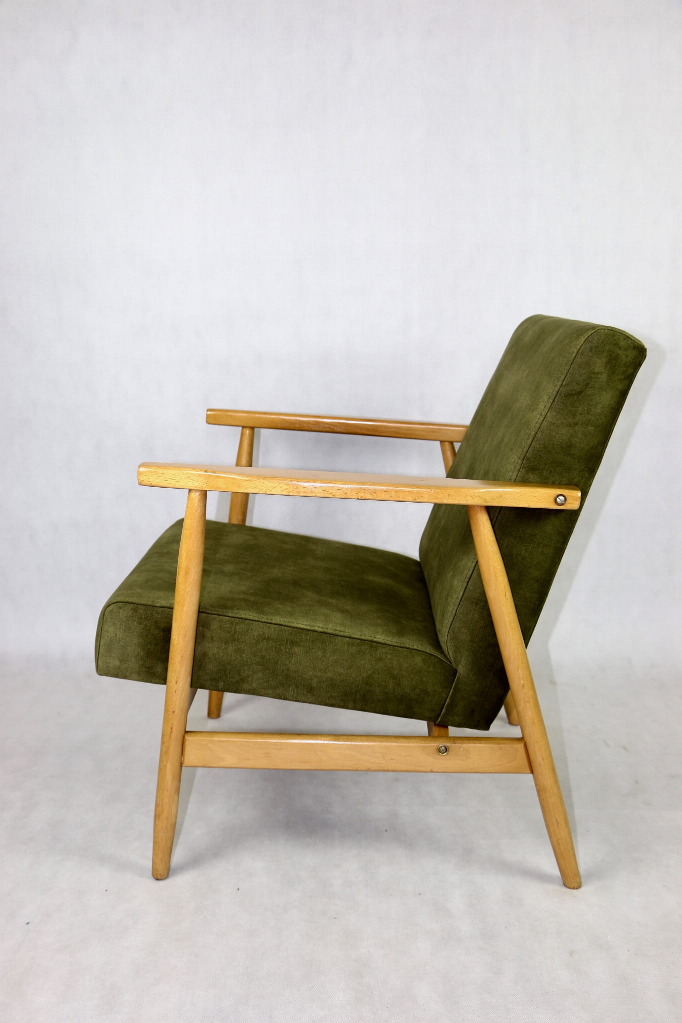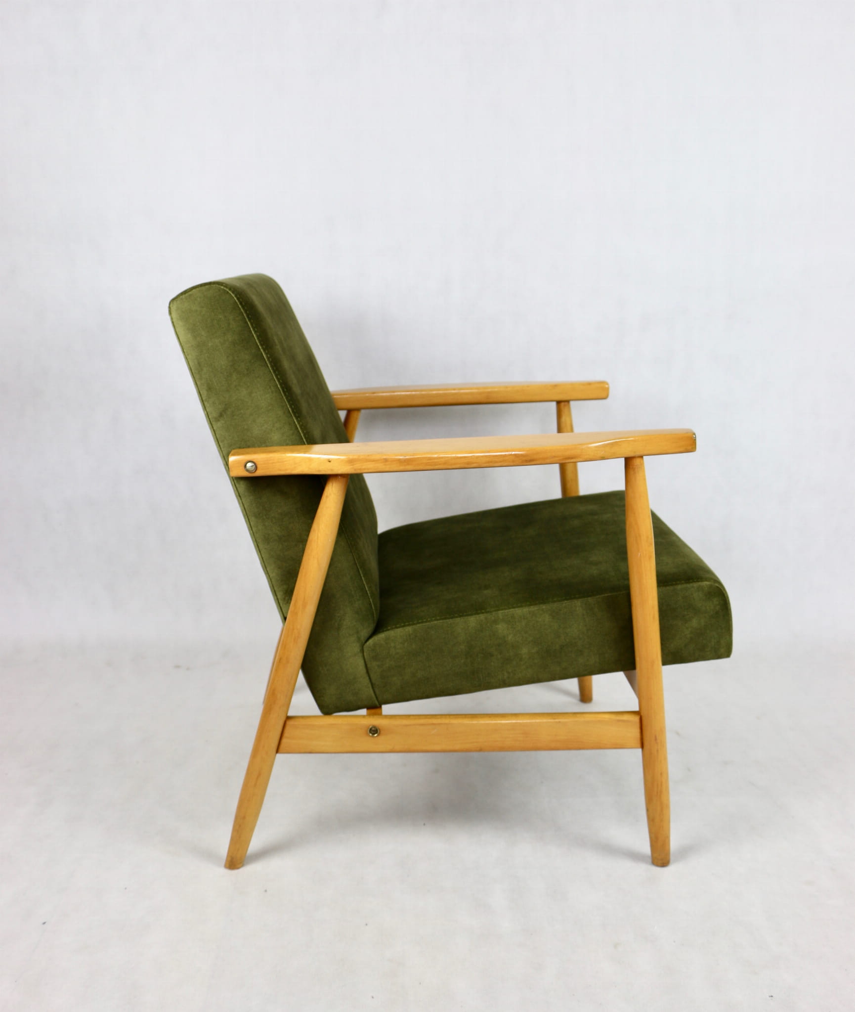 Fotel podobny do bardzo popularnego modelu Lis był produkowany przez zakłady meblarskie w Radomsku w latach 70 tych. Został całkowicie odrestaurowany, zyskał nowe i modne obicie w kolorze oliwkowo - zielonym - materiał typu welwet z serii Macau. Stelaż drewniany połączony jest z podłokietnikami w jasnej kolorystyce drewna pokryty lakierem.