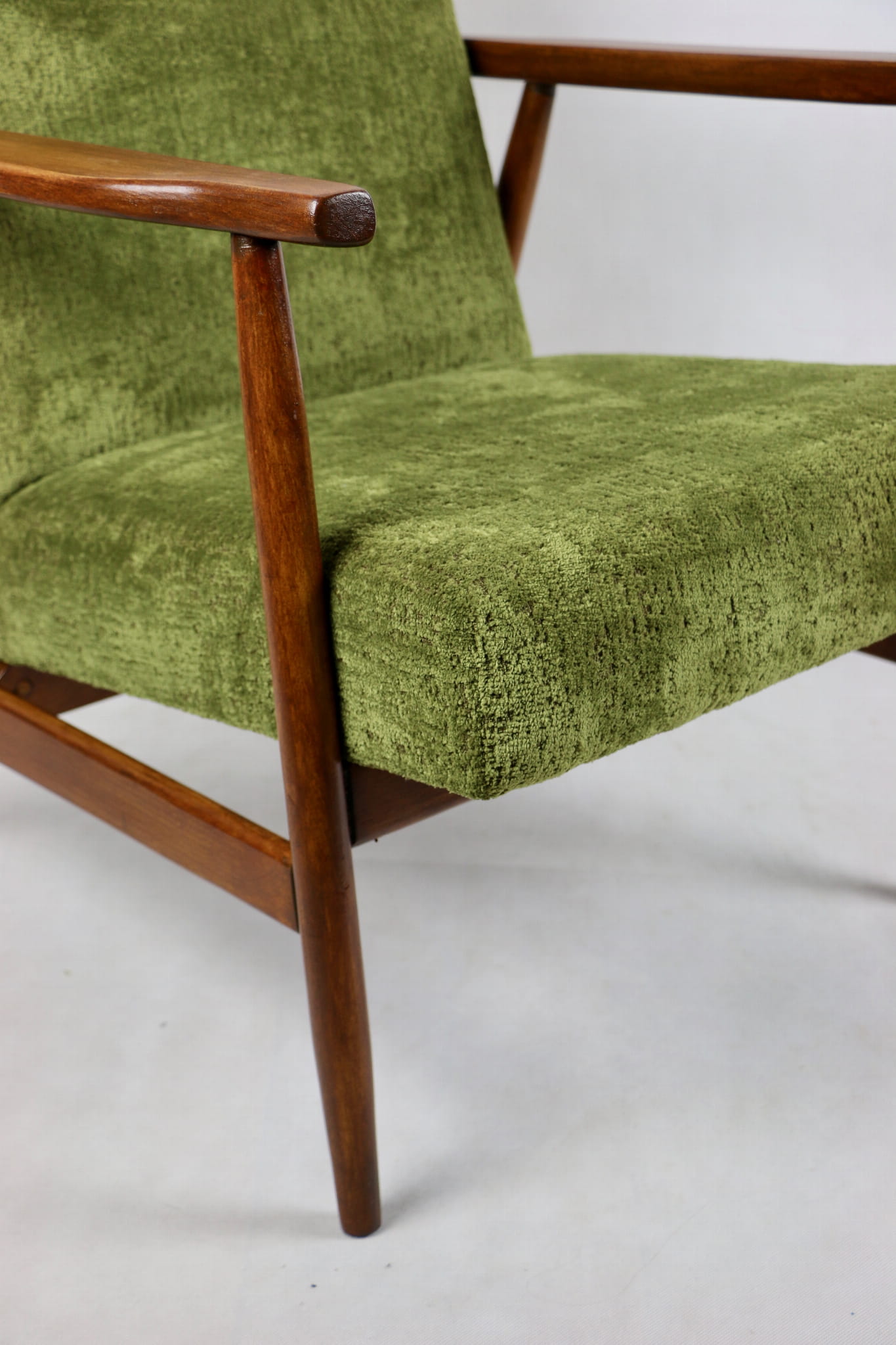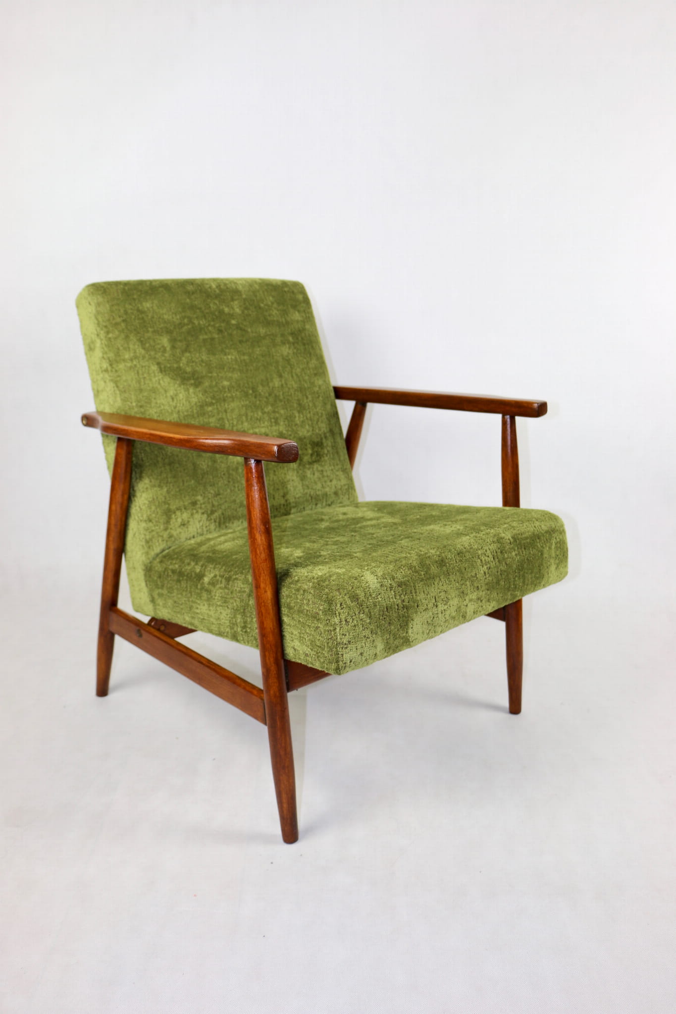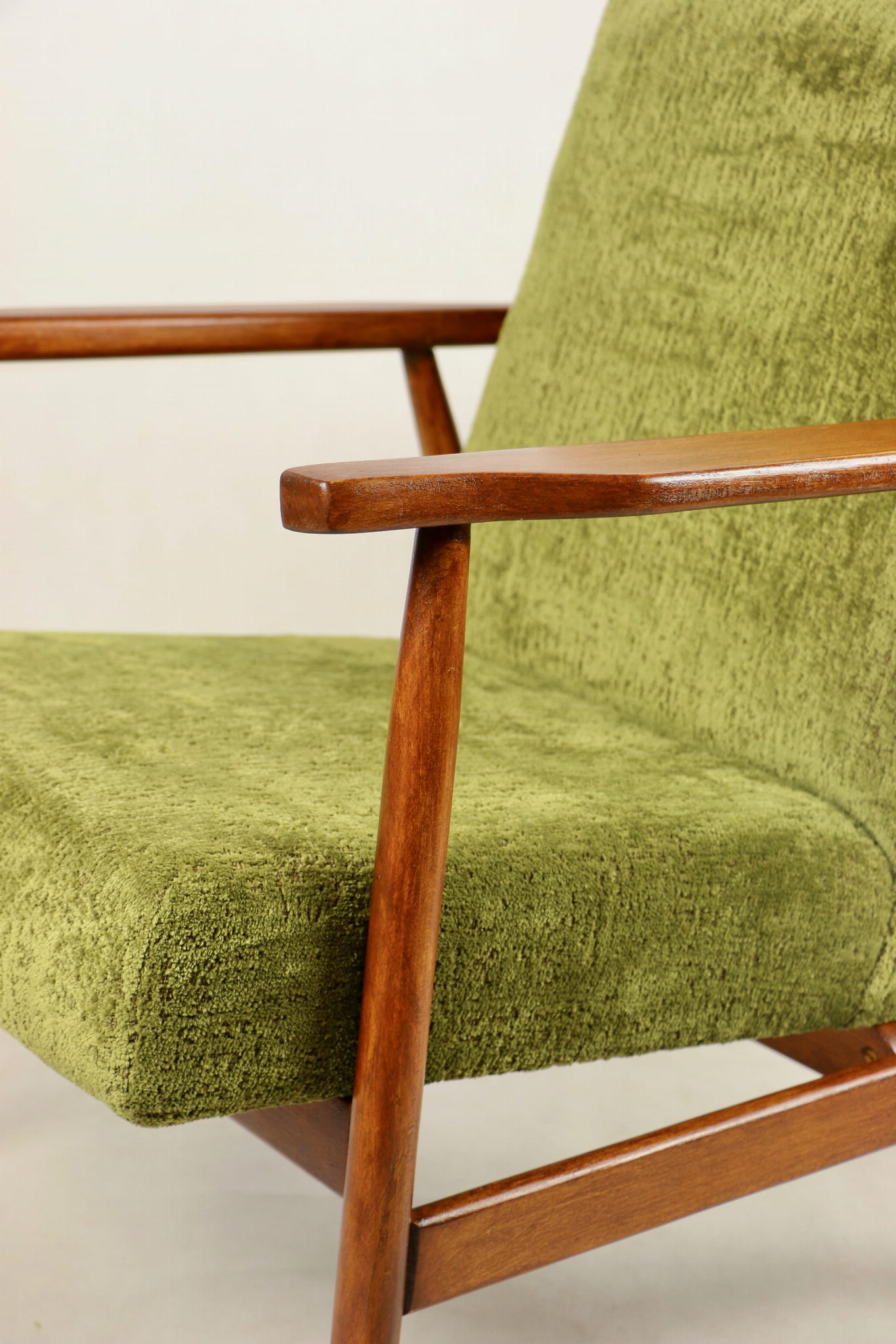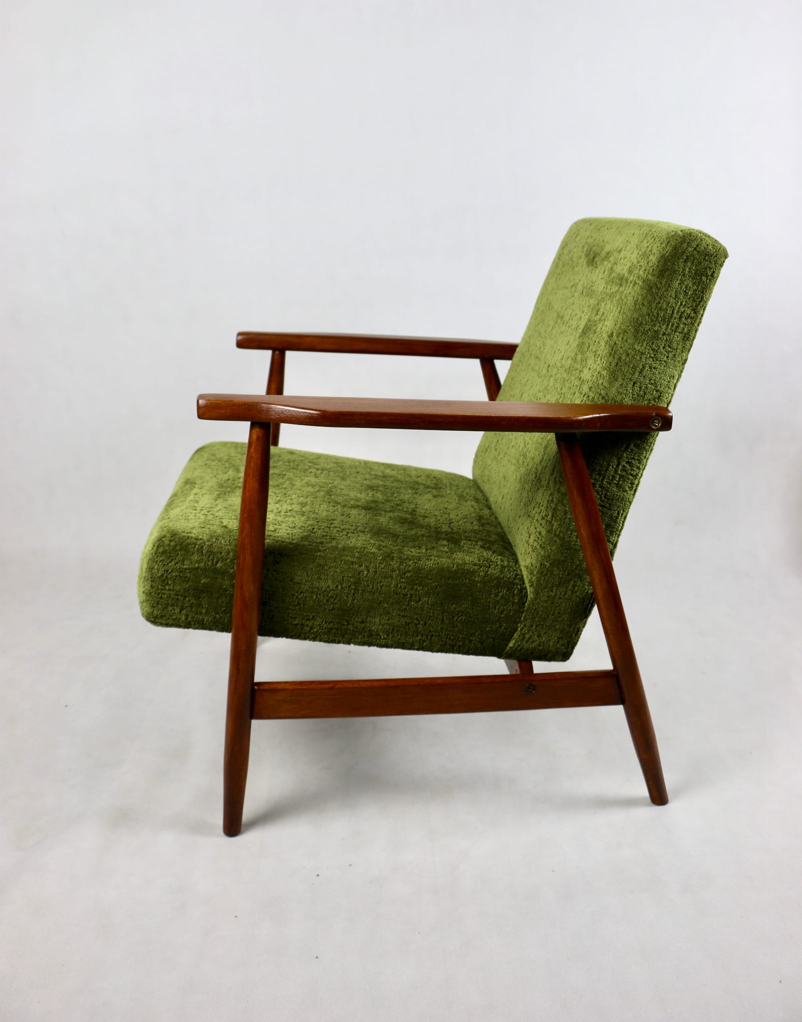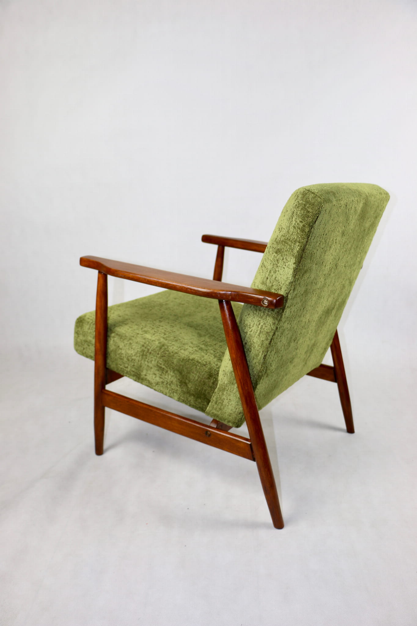 Fotel podobny do bardzo popularnego modelu Lis był produkowany przez zakłady meblarskie w Radomsku w latach 70 tych. Został całkowicie odrestaurowany, zyskał nowe i modne obicie w kolorze zielonym - materiał strukturalny typu velwet. Stelaż drewniany połączony jest z podłokietnikami w naturalnej kolorystyce drewna typu orzech pokryty lakierem.