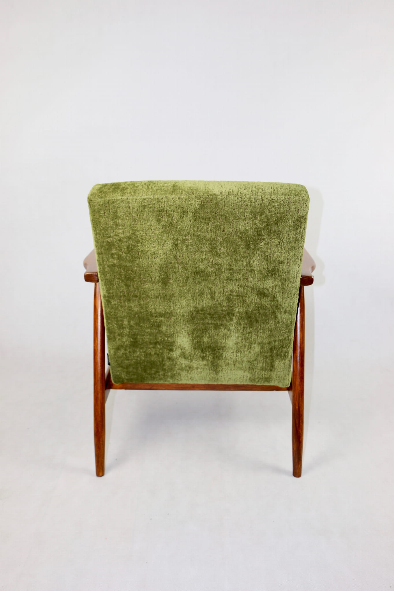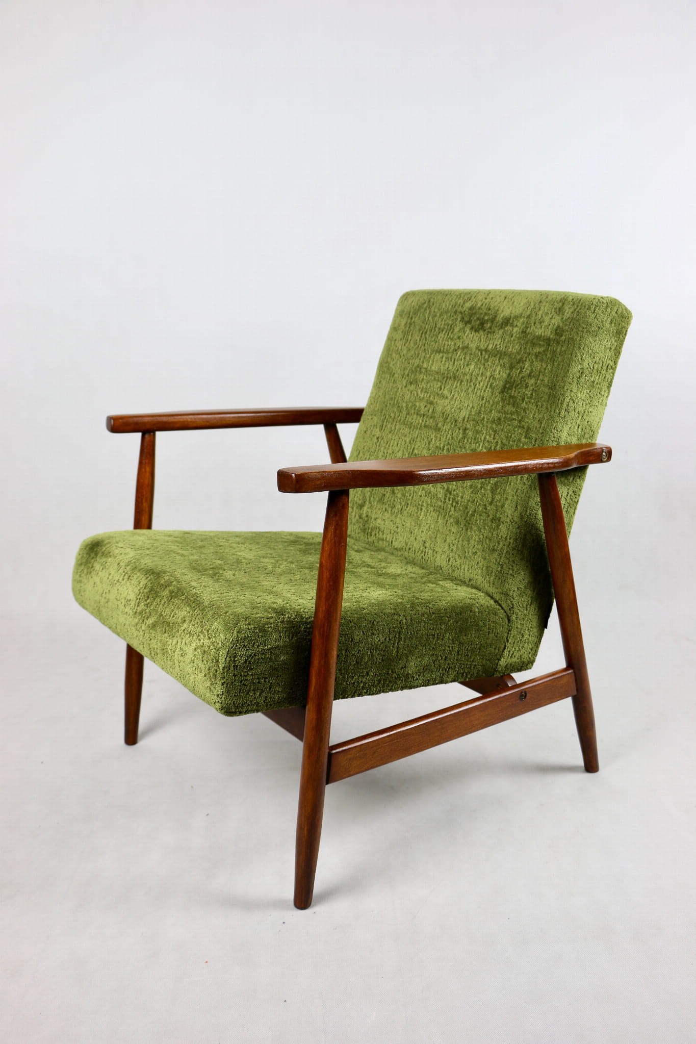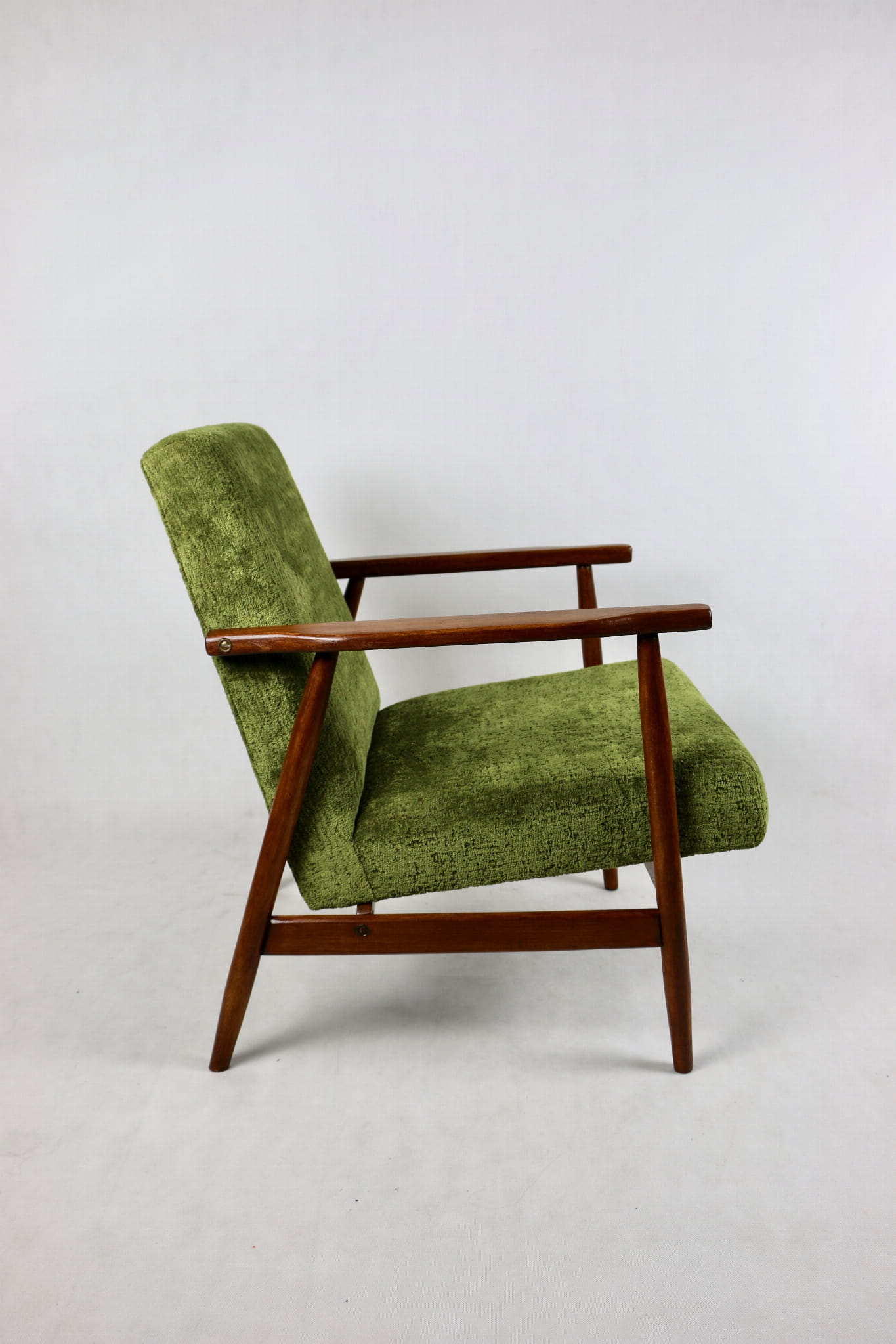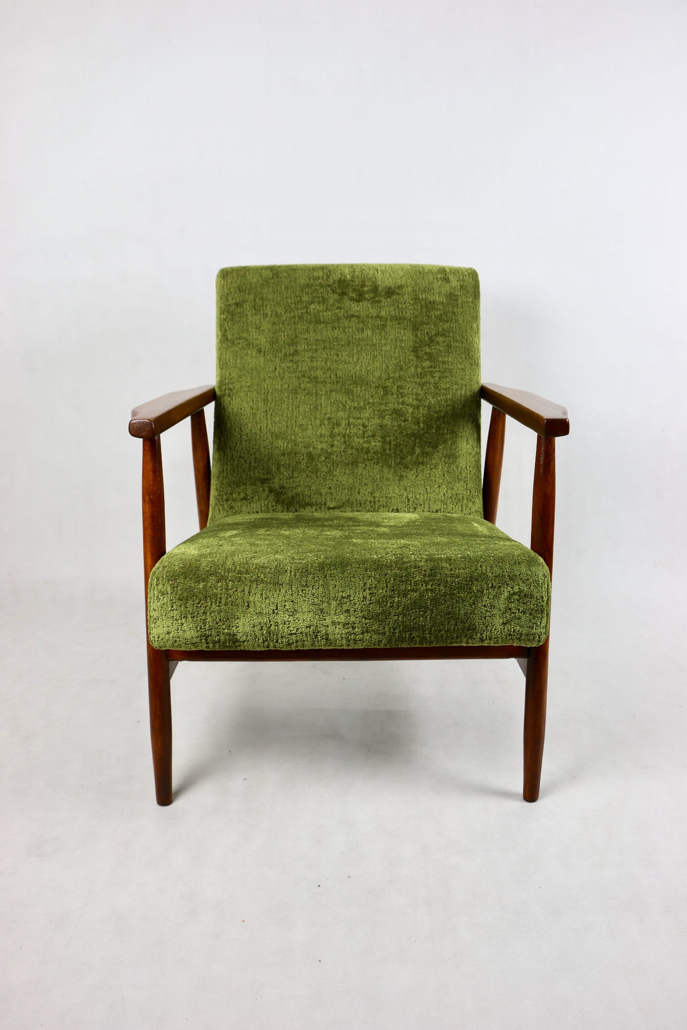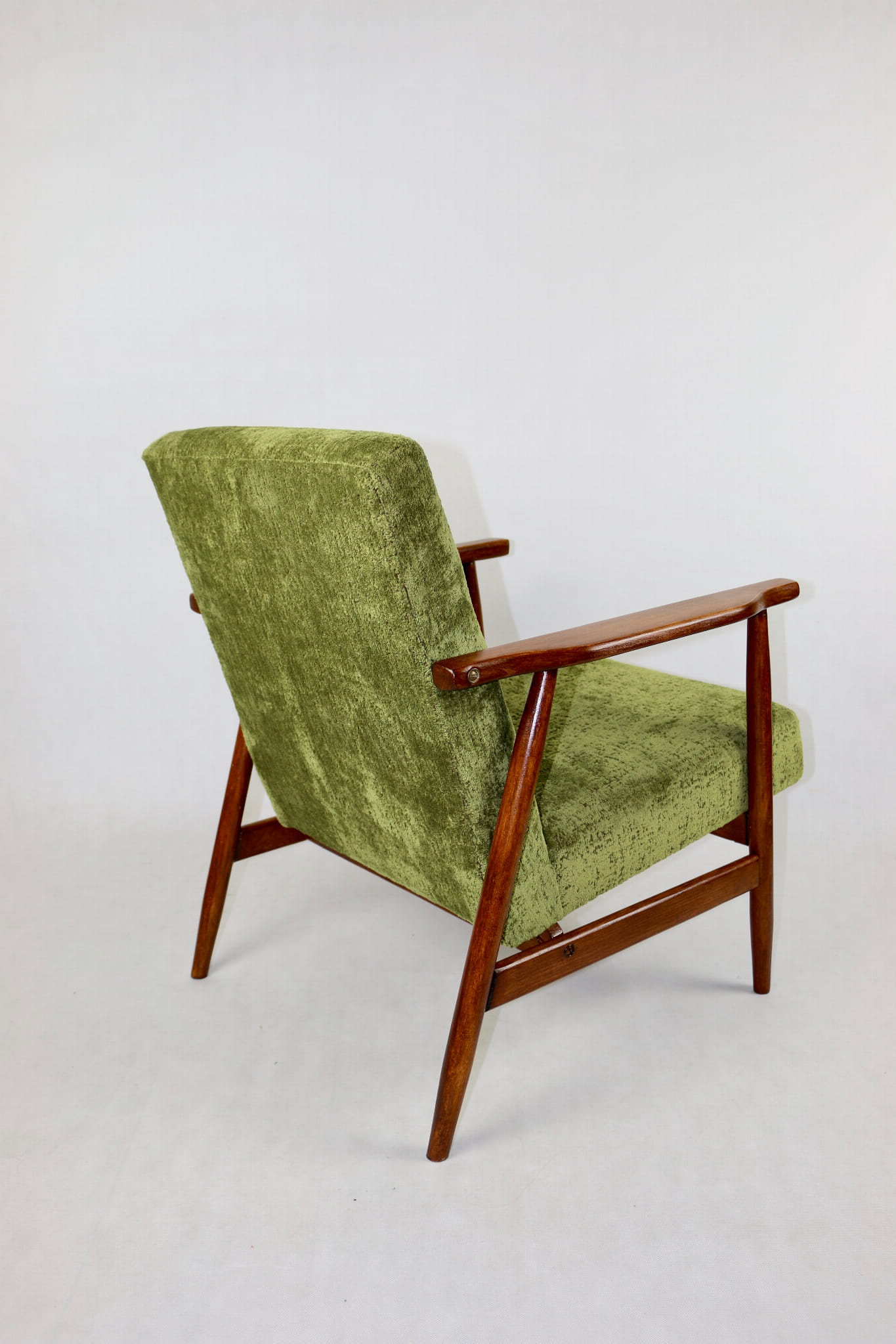 Fotel podobny do bardzo popularnego modelu Lis był produkowany przez zakłady meblarskie w Radomsku w latach 70 tych. Został całkowicie odrestaurowany, zyskał nowe i modne obicie w kolorze zielonym - materiał strukturalny typu velwet. Stelaż drewniany połączony jest z podłokietnikami w naturalnej kolorystyce drewna typu orzech pokryty lakierem.
