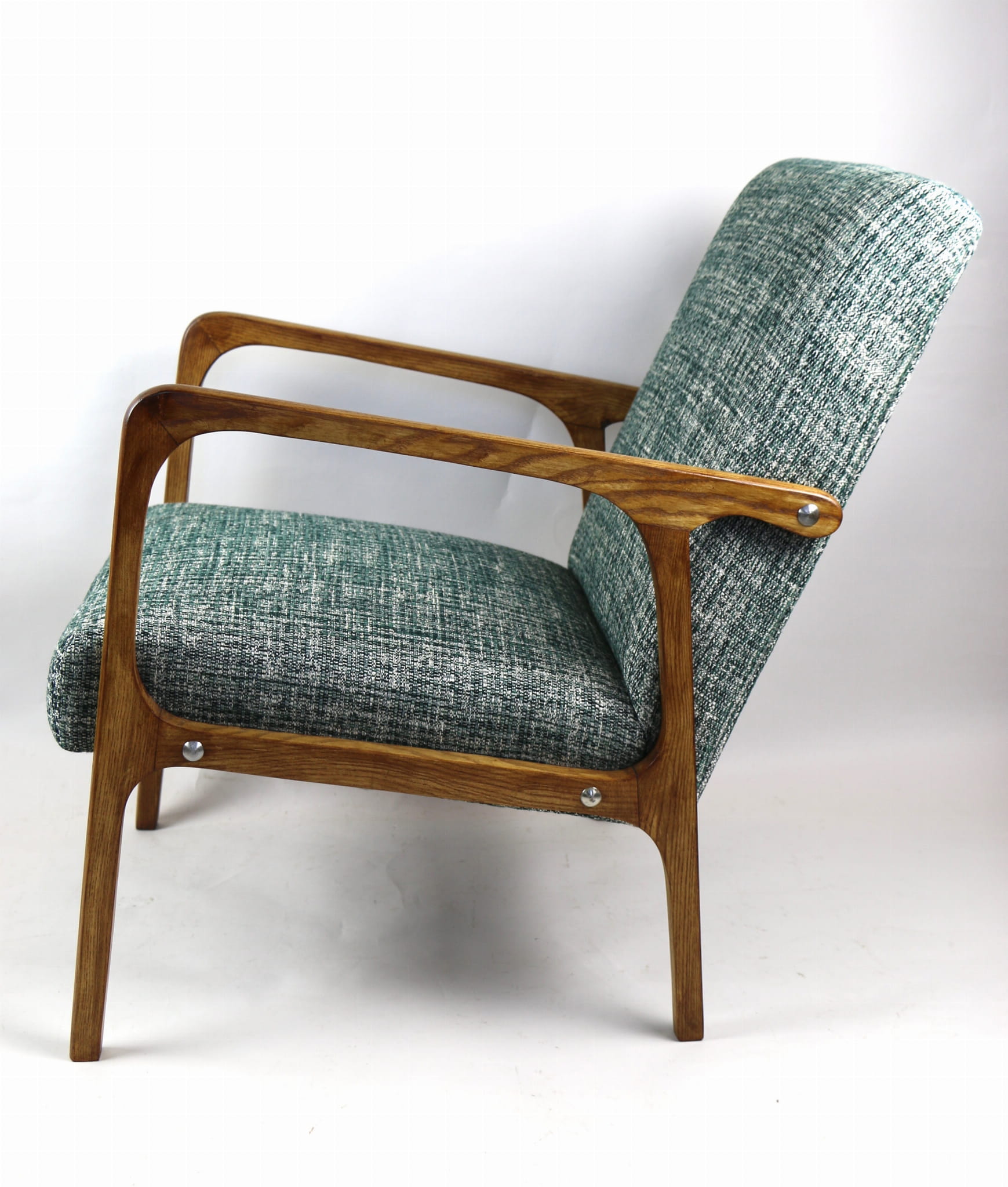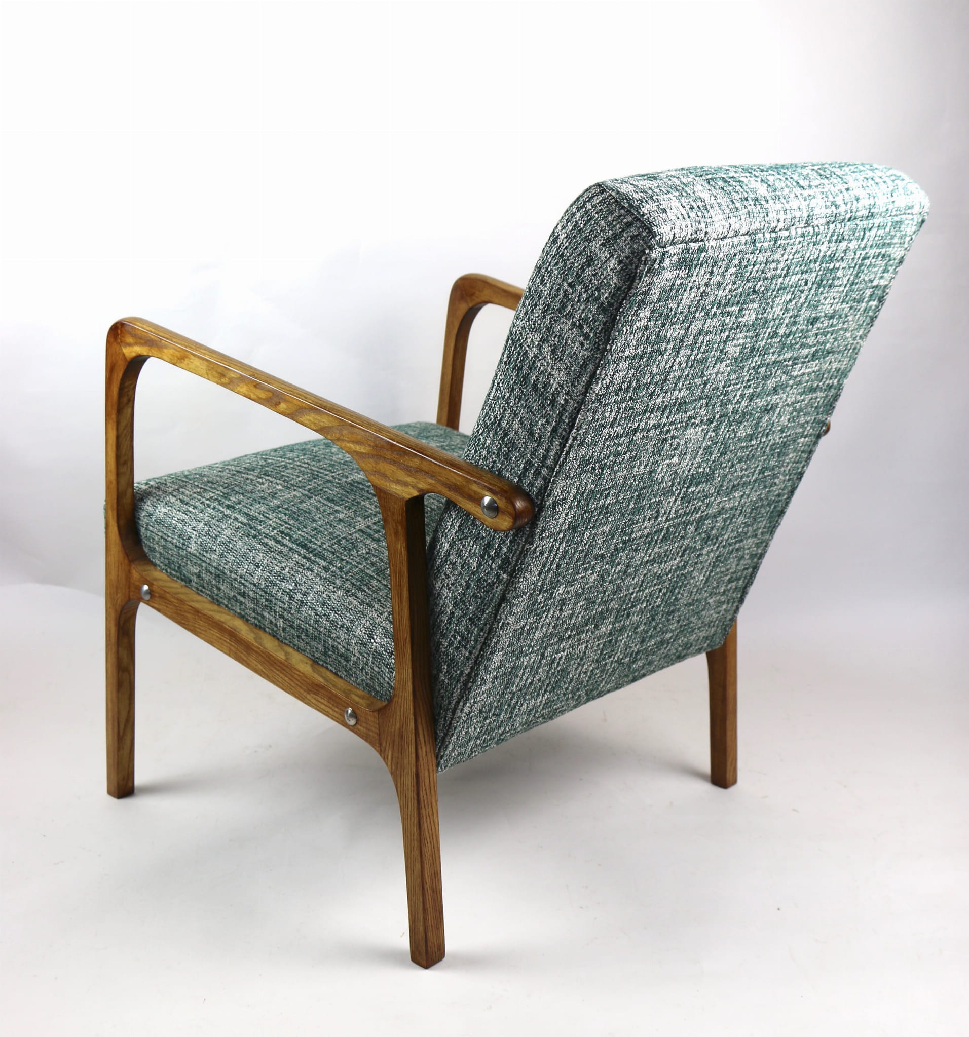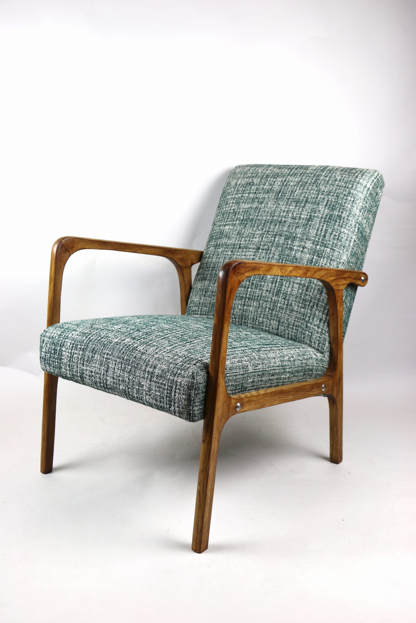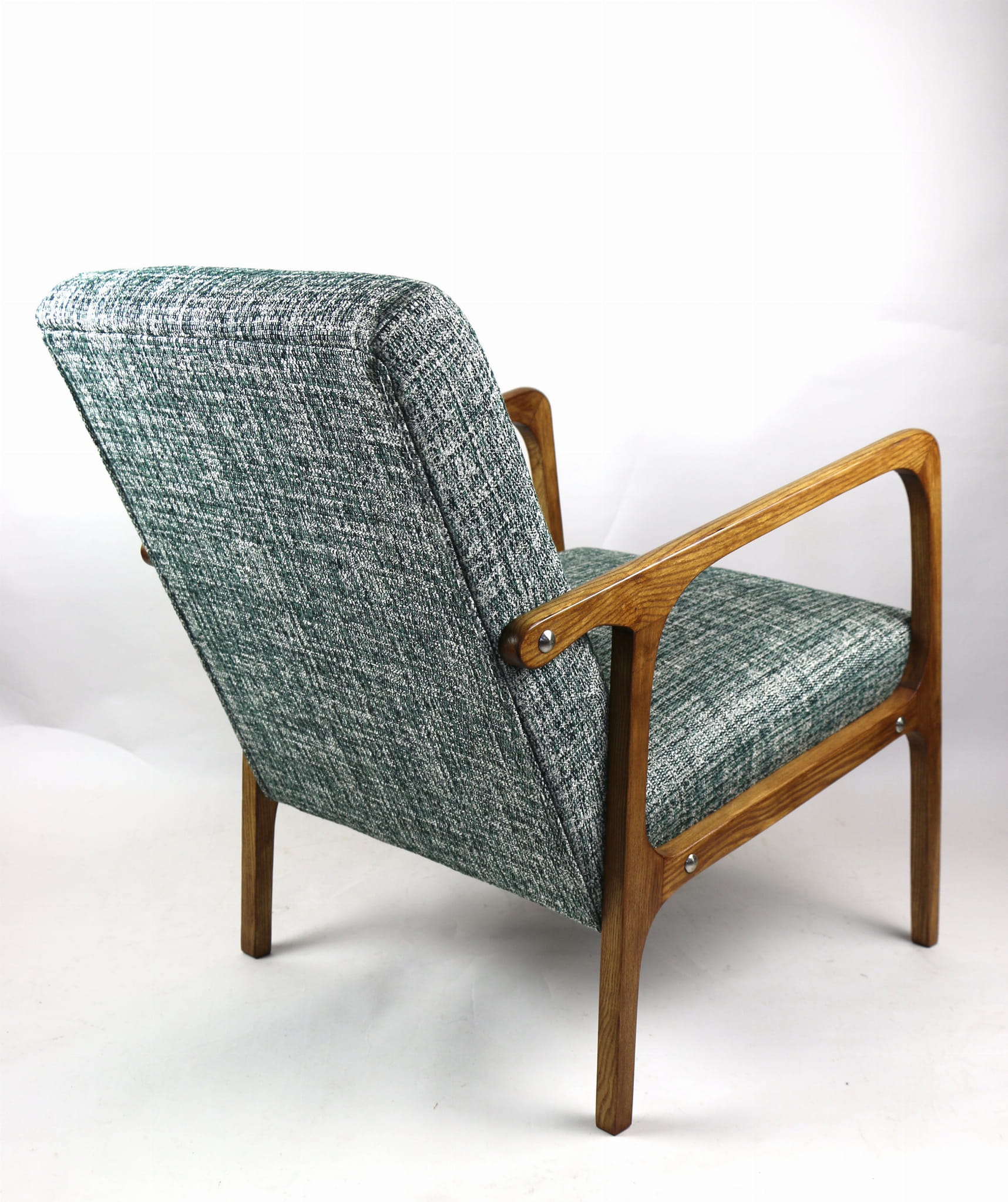 Fotel klasyczny Vintage z lat 70. Został całkowicie odrestaurowany. Zyskał nowe obicie pokryte strukturalnym naturalnym materiałem tapicerskim w kolorze zielonym. Stelaż drewniany z podłokietnikami w kolorze naturalnego drewna utrwalony lakierobejcą - drewno jesion. Dostępne 2 sztuki .