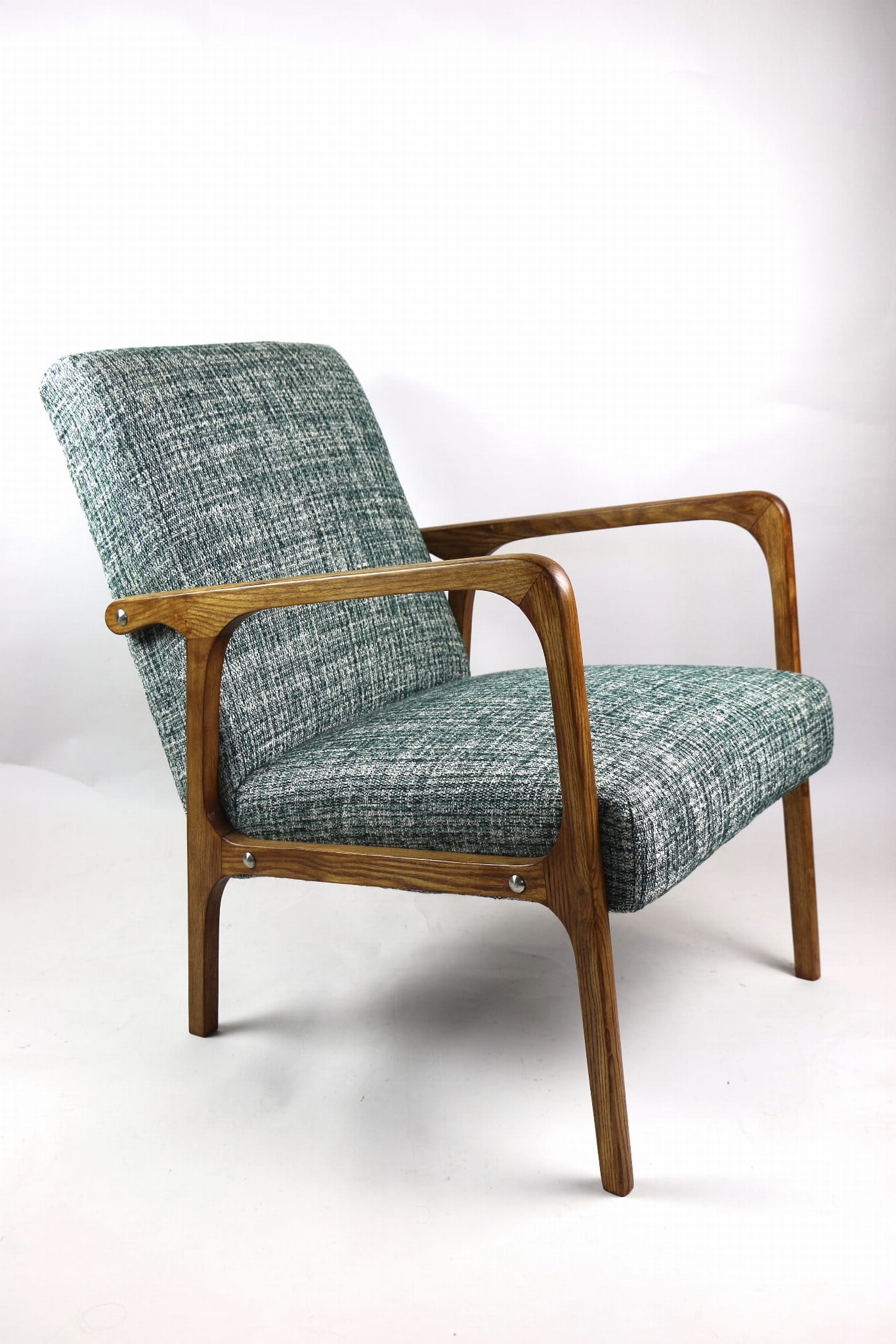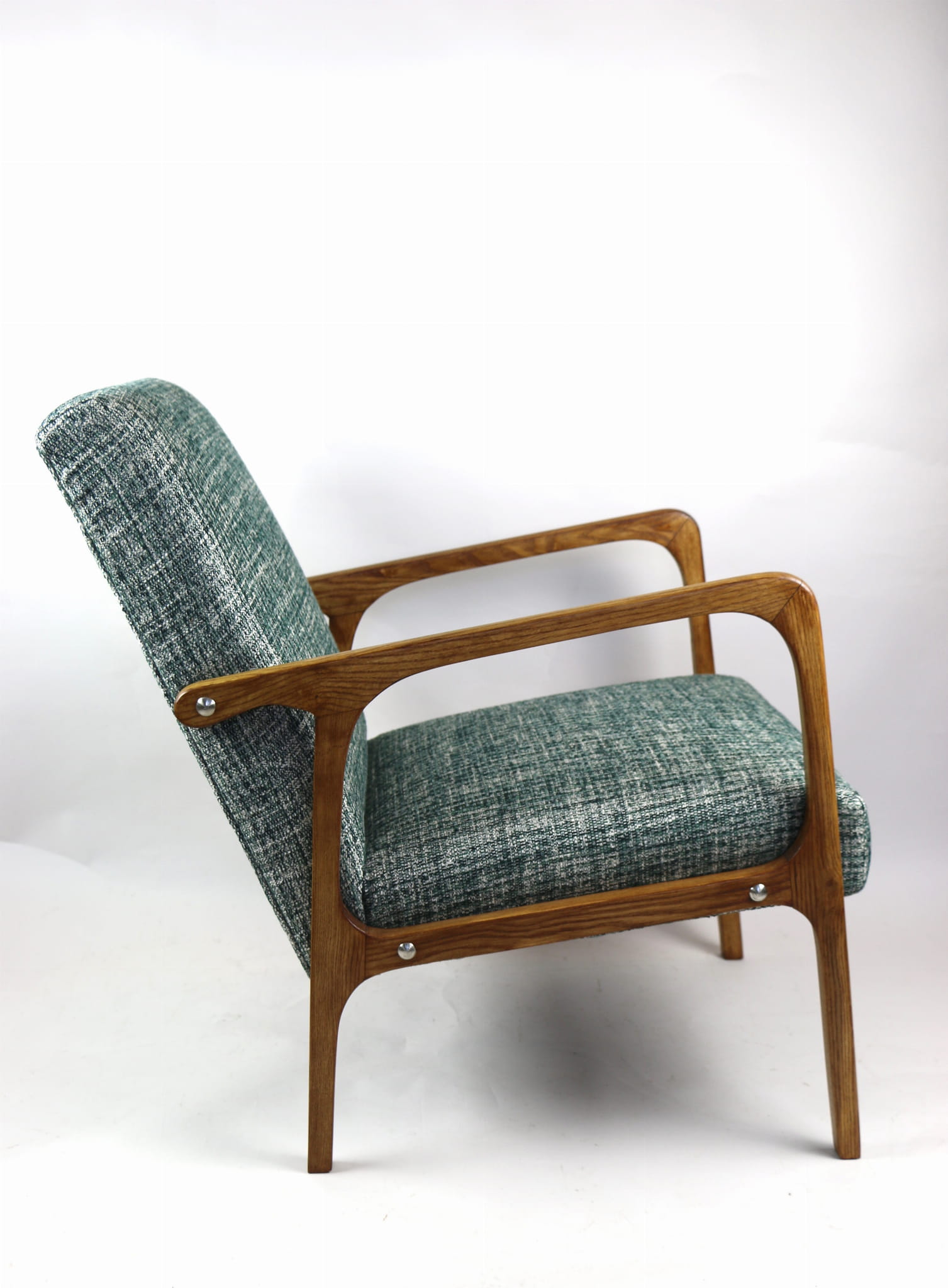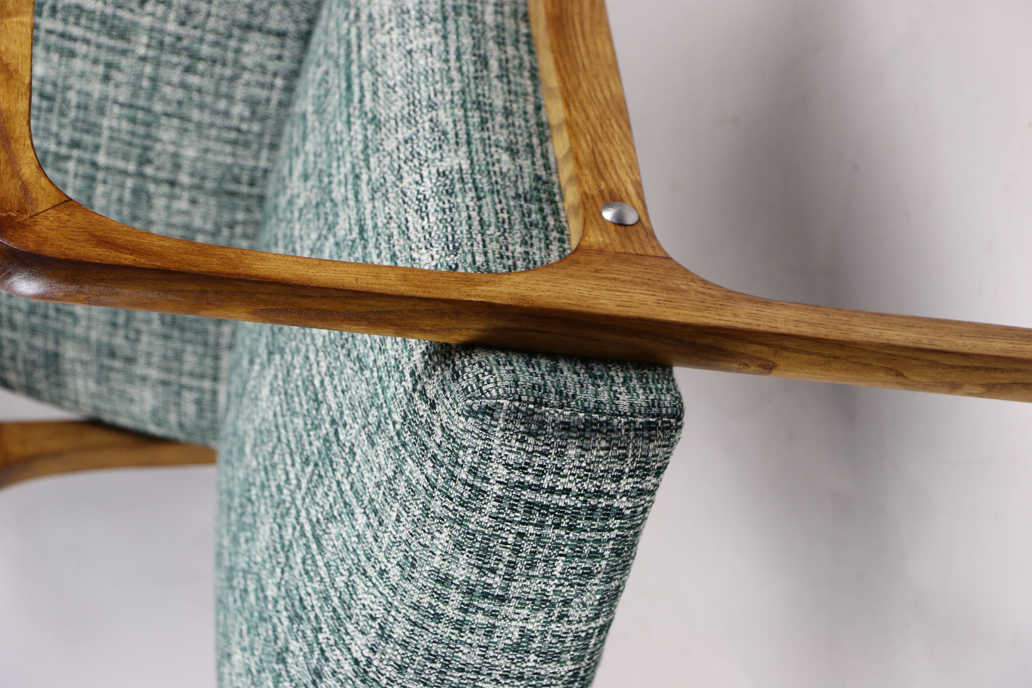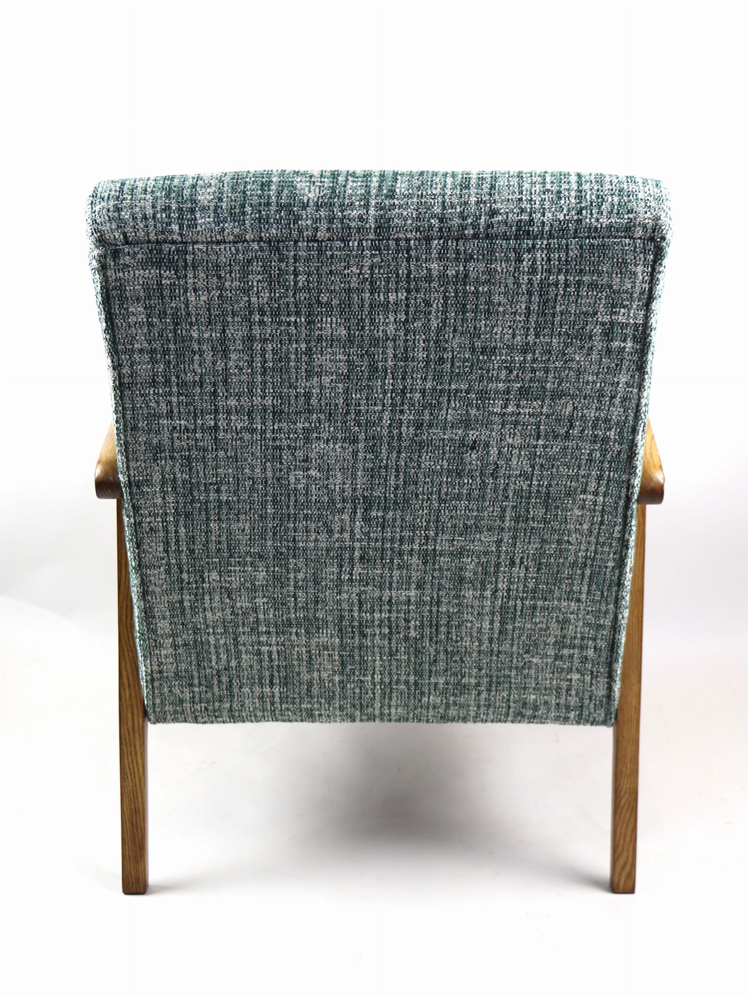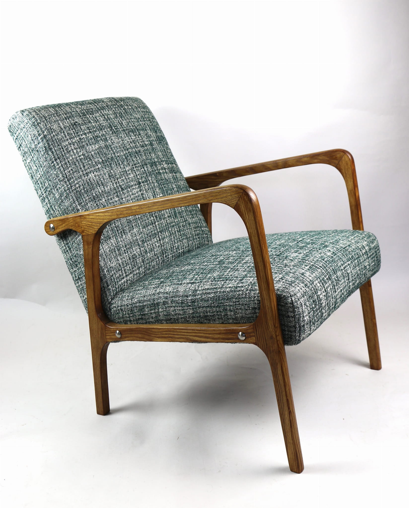 Fotel klasyczny Vintage z lat 70. Został całkowicie odrestaurowany. Zyskał nowe obicie pokryte strukturalnym naturalnym materiałem tapicerskim w kolorze zielonym. Stelaż drewniany z podłokietnikami w kolorze naturalnego drewna utrwalony lakierobejcą - drewno jesion. Dostępne 2 sztuki .