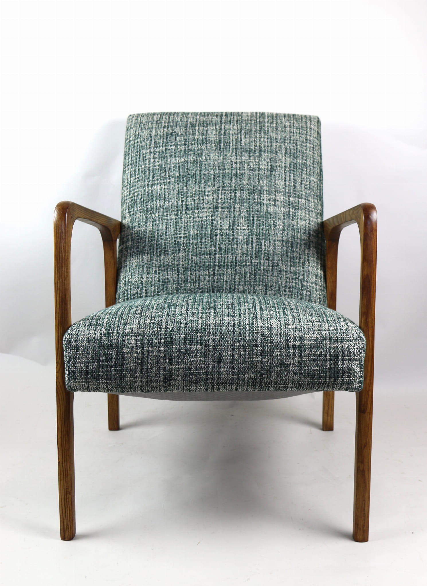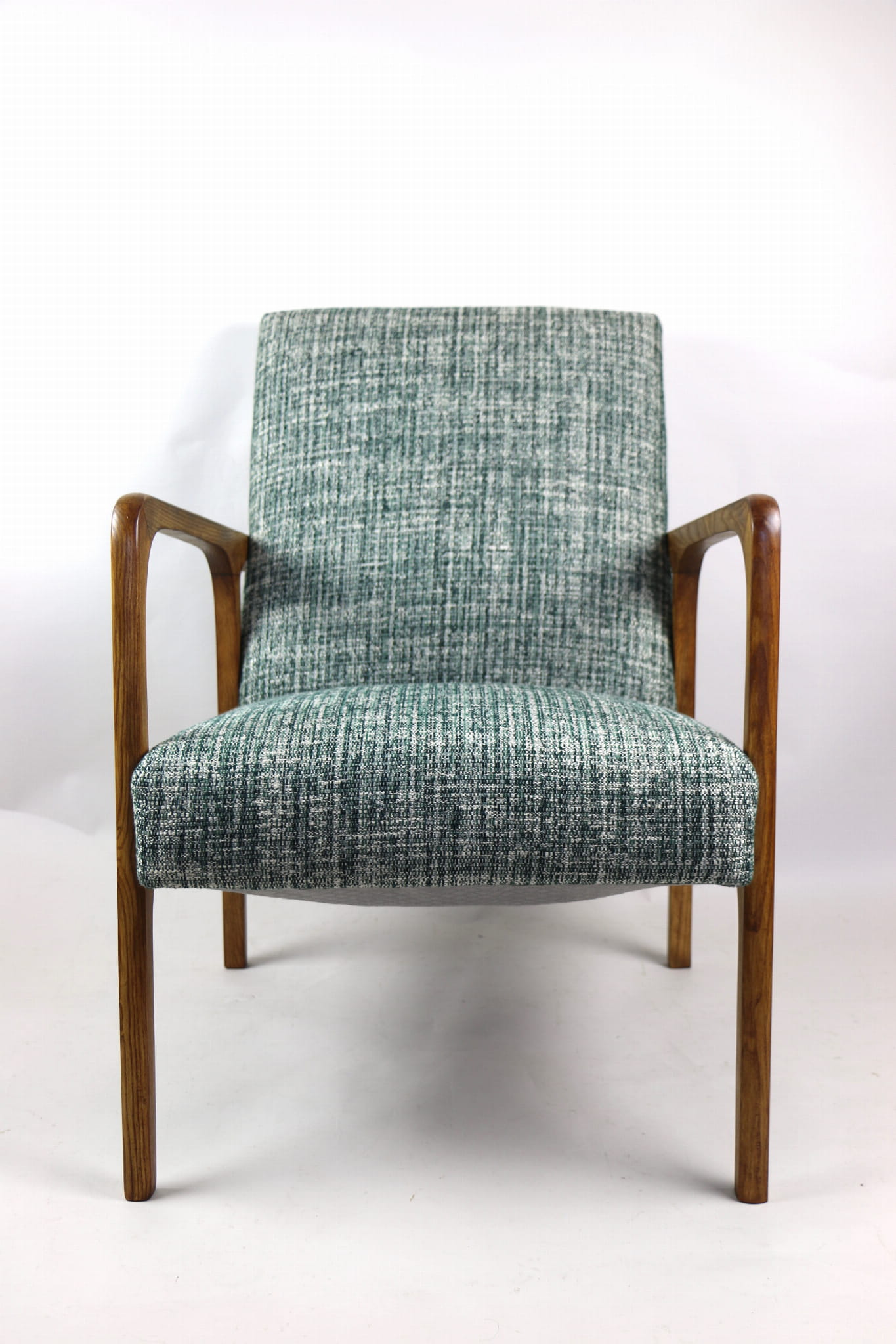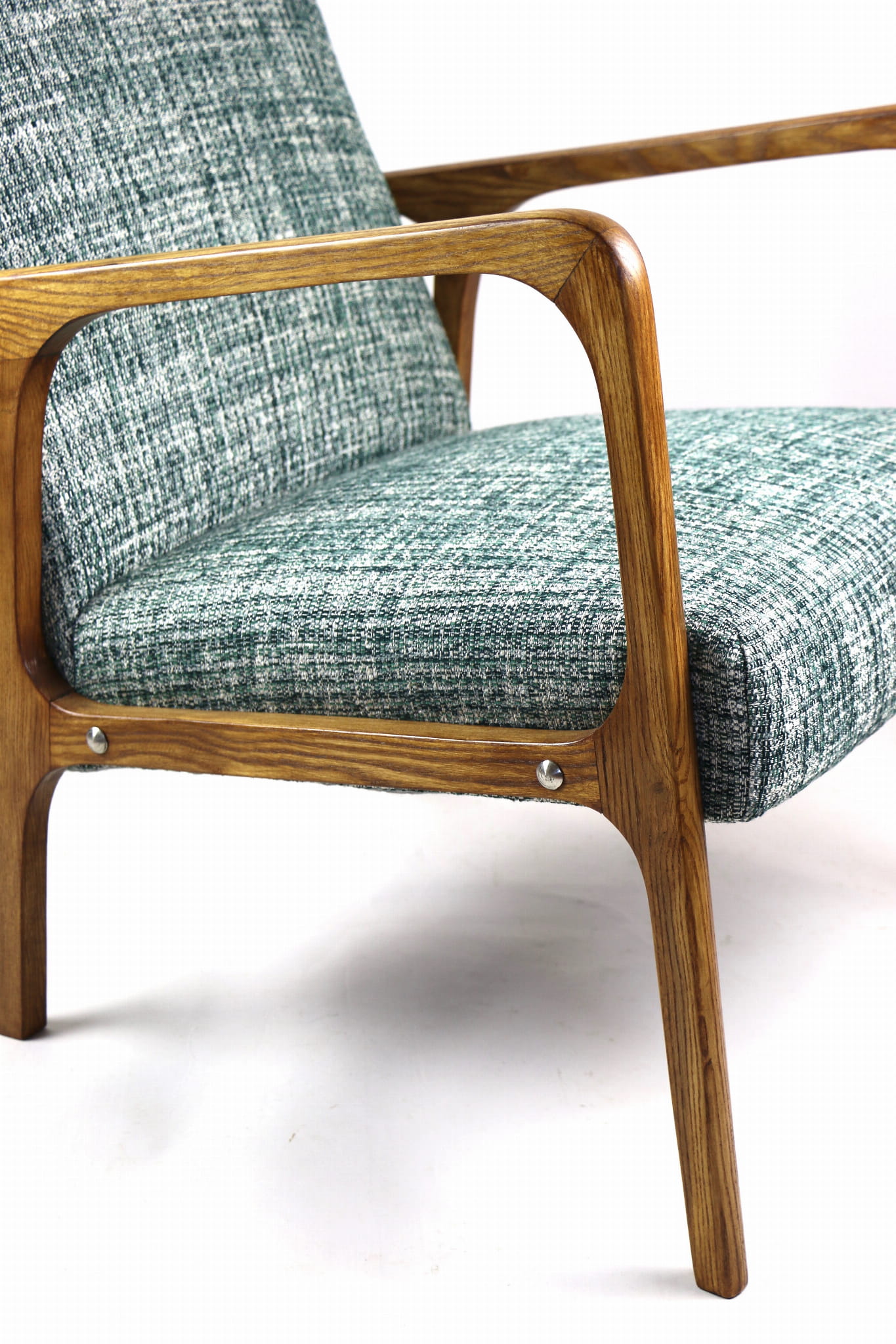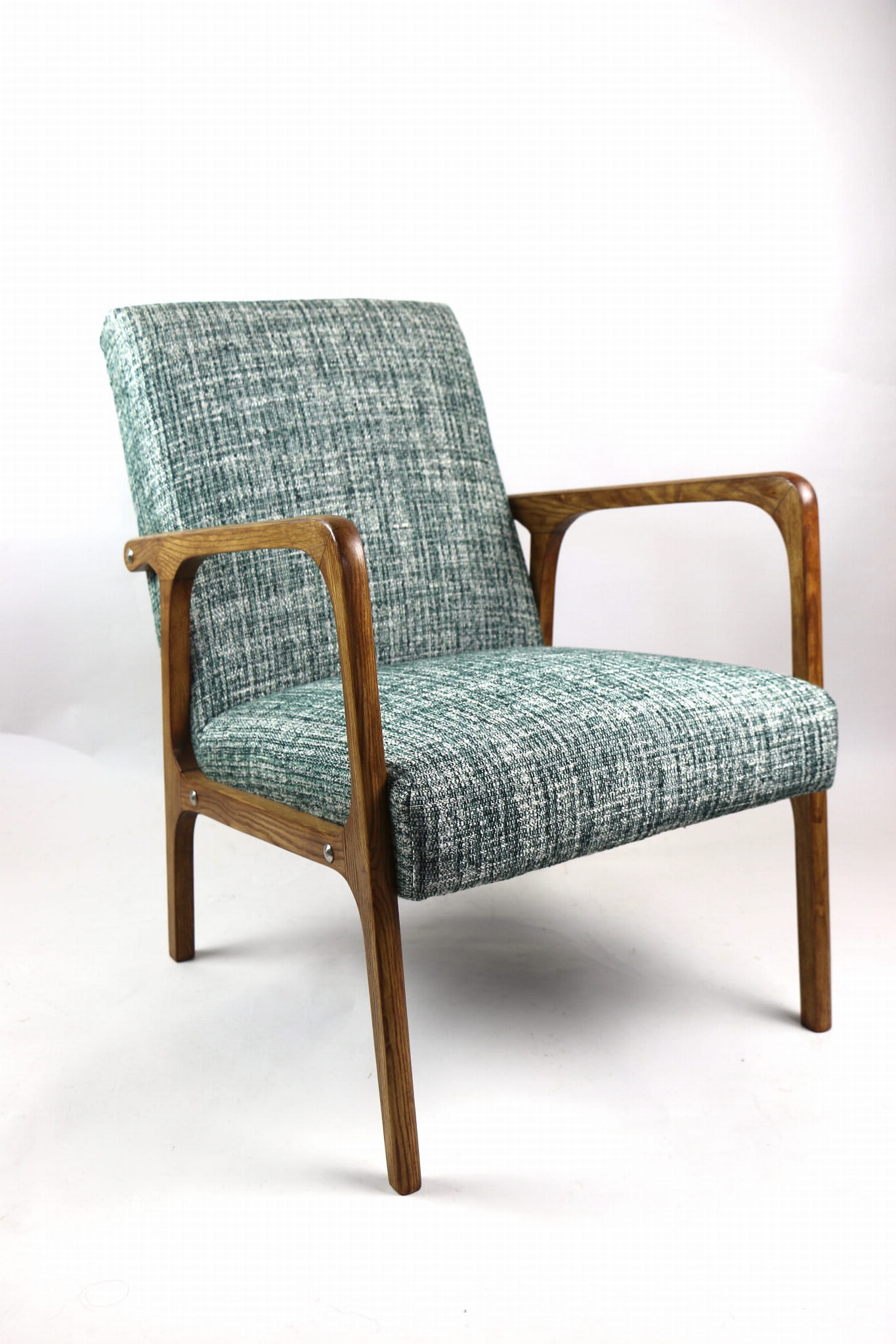 Fotel klasyczny Vintage z lat 70. Został całkowicie odrestaurowany. Zyskał nowe obicie pokryte strukturalnym naturalnym materiałem tapicerskim w kolorze zielonym. Stelaż drewniany z podłokietnikami w kolorze naturalnego drewna utrwalony lakierobejcą - drewno jesion. Dostępne 2 sztuki .