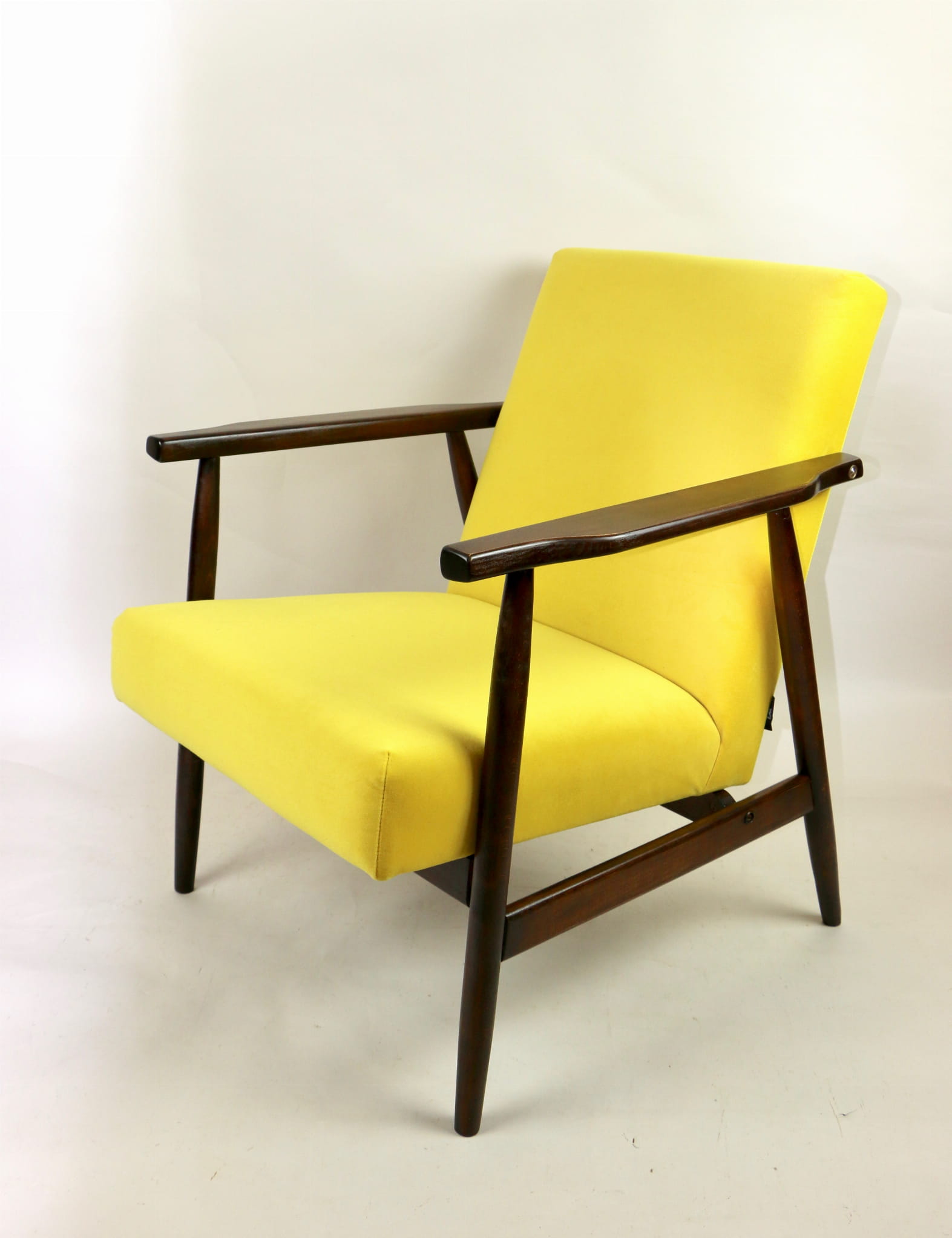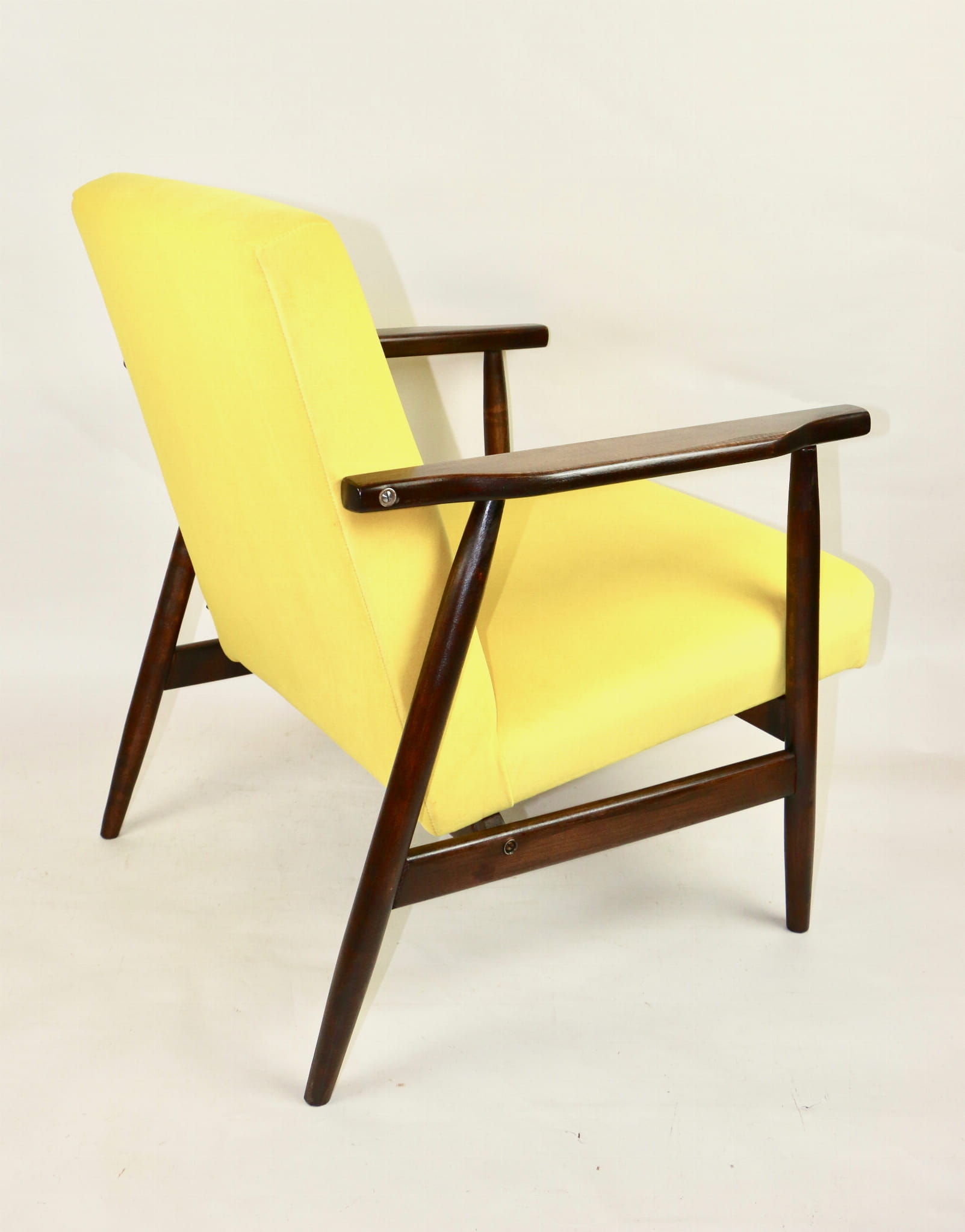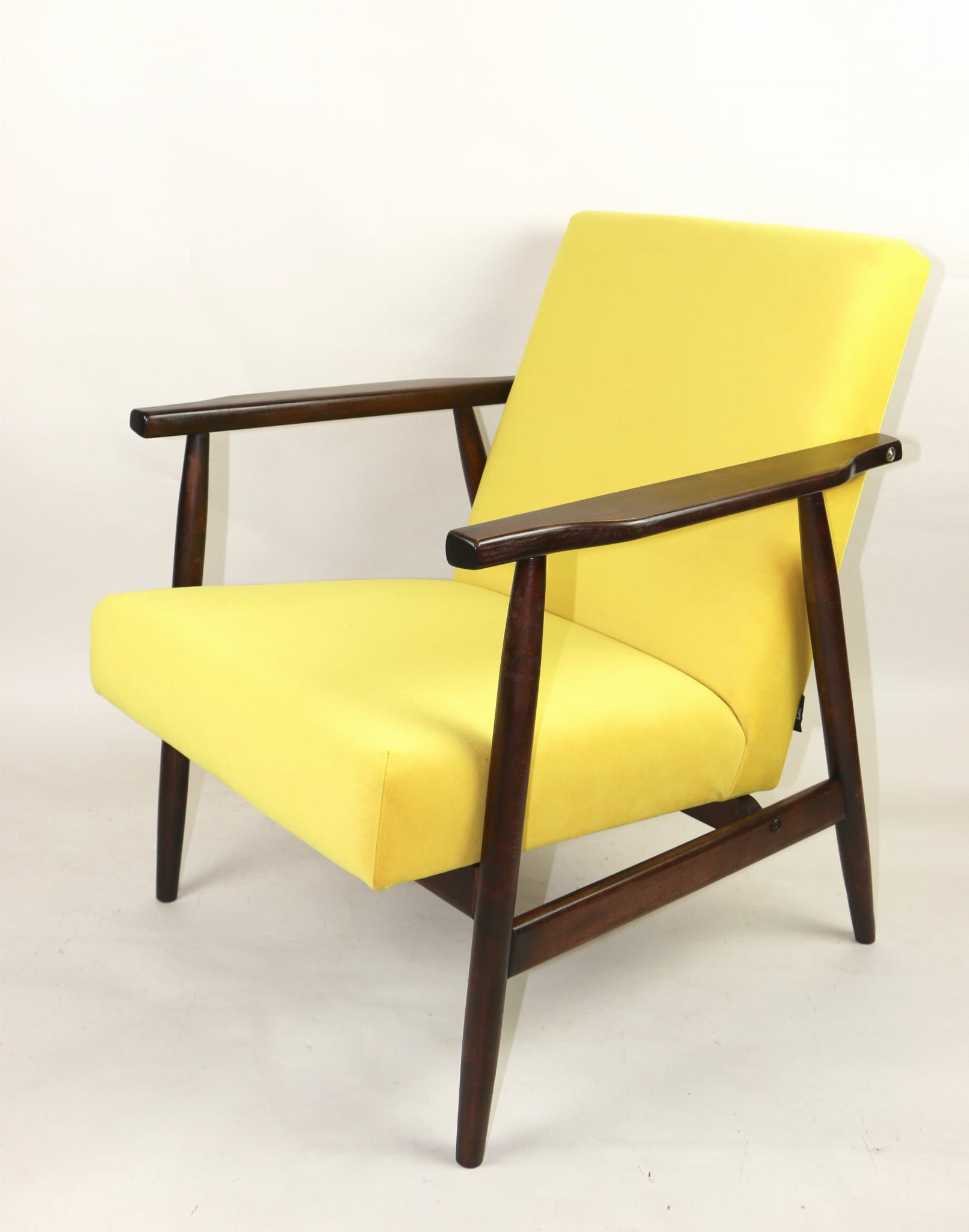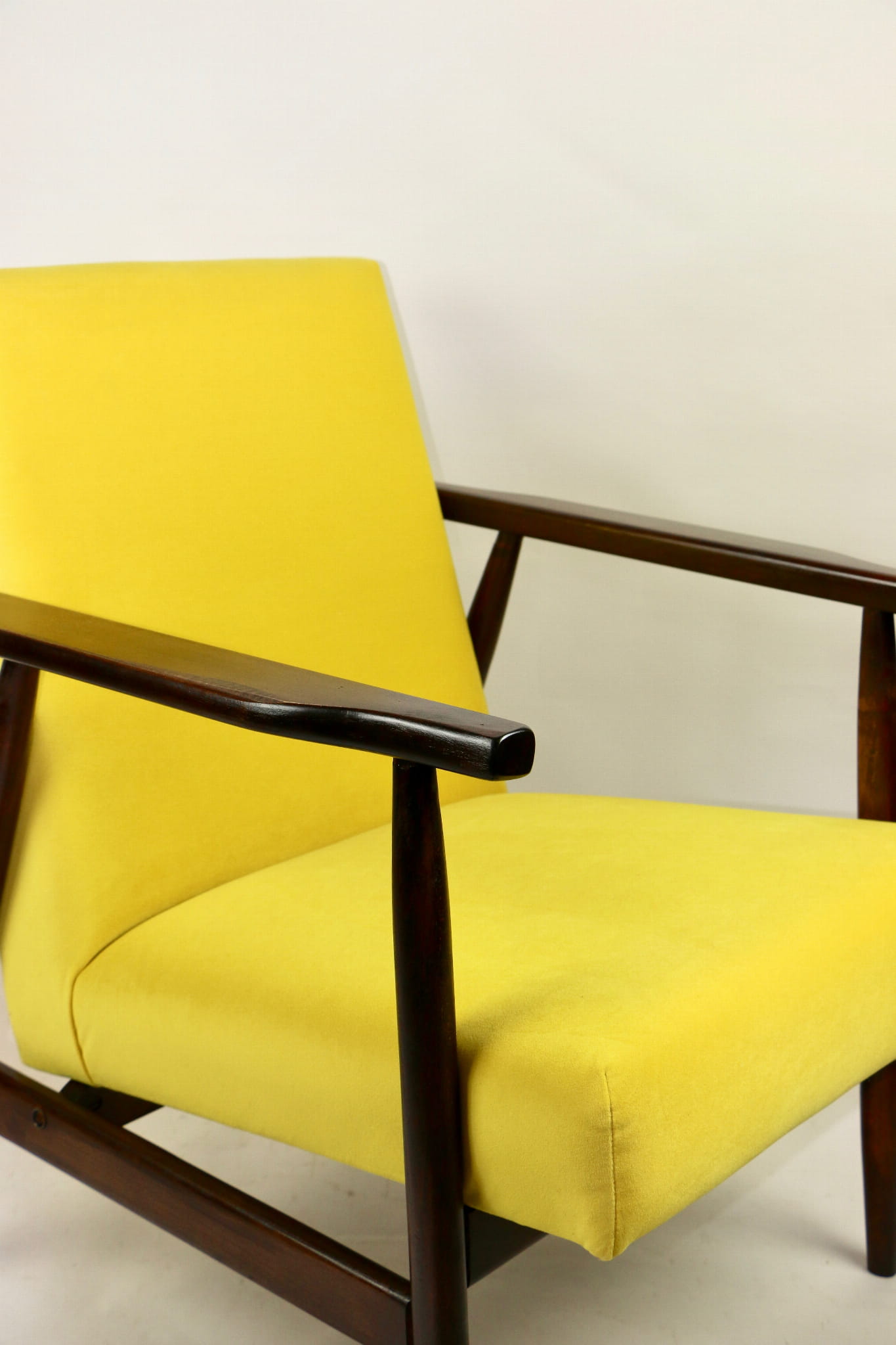 Fotel podobny do bardzo popularnego modelu Lis był produkowany przez zakłady meblarskie w Radomsku w latach 70 tych. Został całkowicie odrestaurowany, zyskał nowe i modne obicie w kolorze żółtym - materiał welwet z serii Jade - kolor 400. Stelaż drewniany połączony jest z podłokietnikami w ciemnej kolorystyce drewna typu orzech pokryty lakierem.