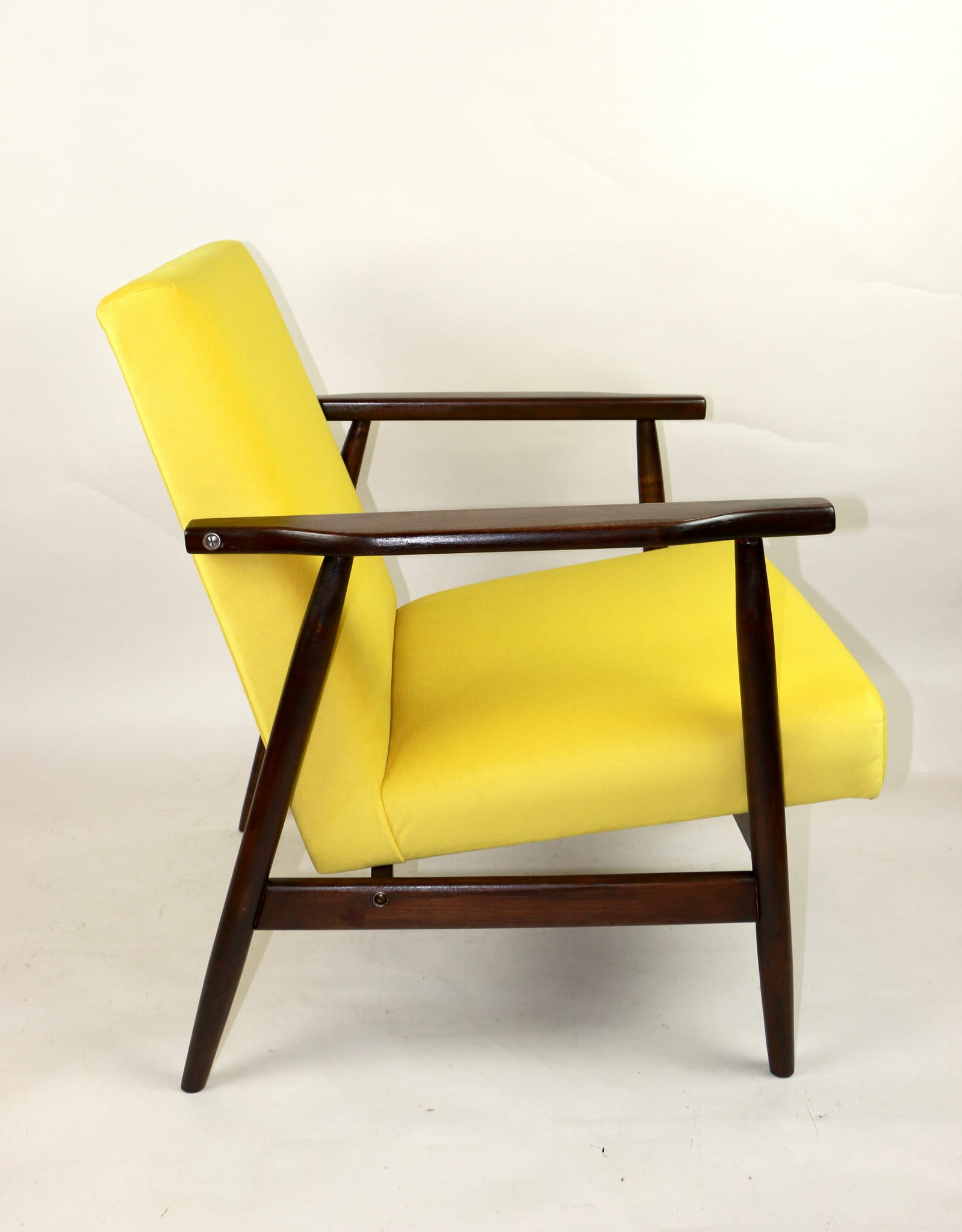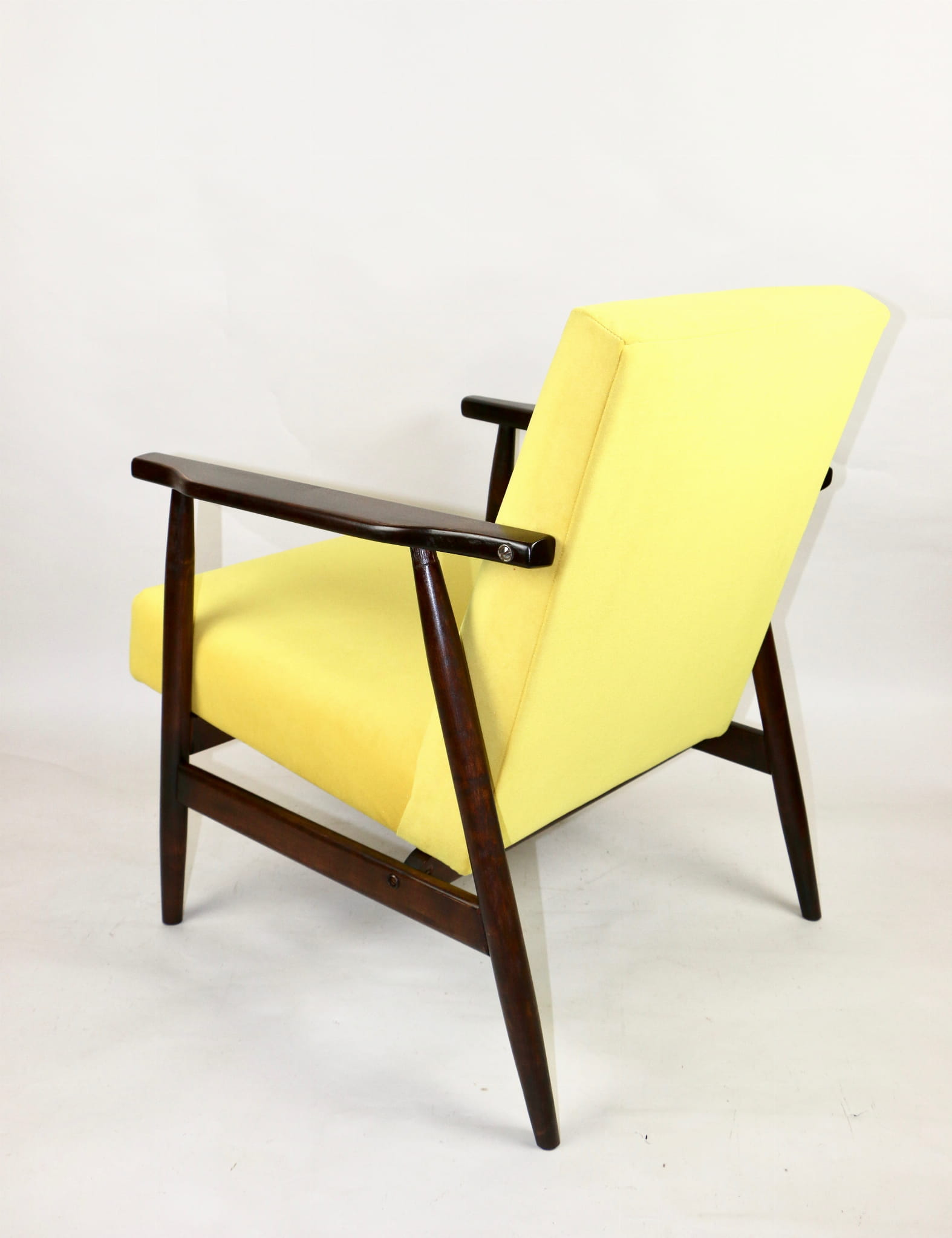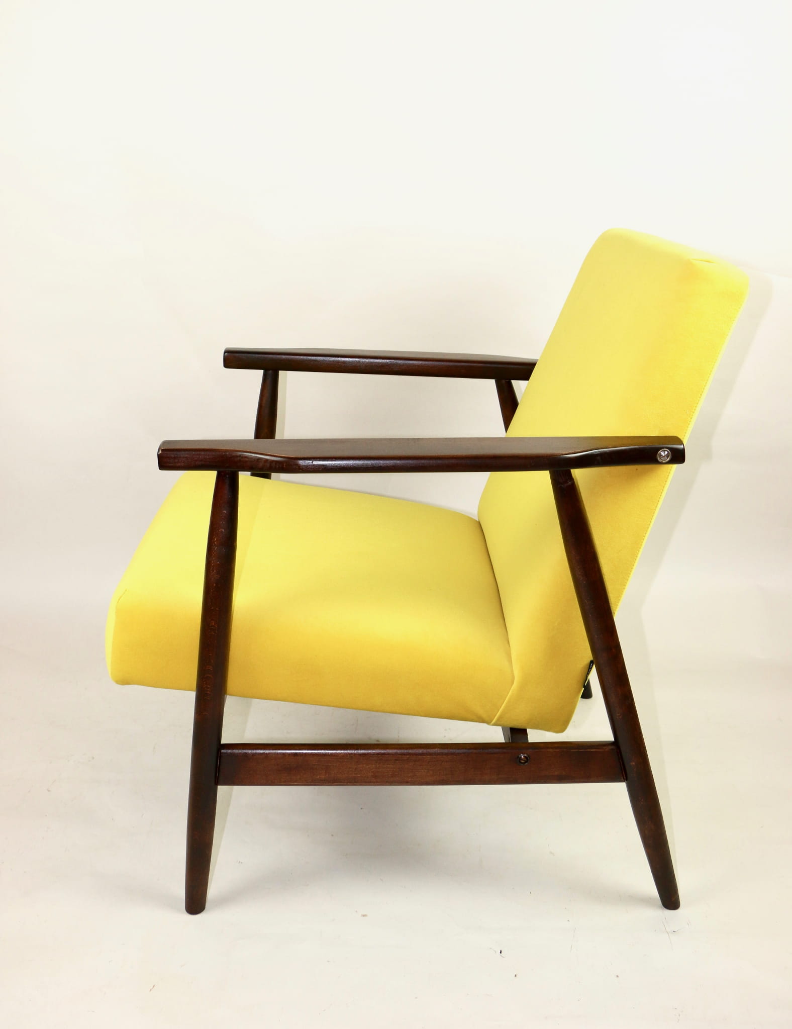 Fotel podobny do bardzo popularnego modelu Lis był produkowany przez zakłady meblarskie w Radomsku w latach 70 tych. Został całkowicie odrestaurowany, zyskał nowe i modne obicie w kolorze żółtym - materiał welwet z serii Jade - kolor 400. Stelaż drewniany połączony jest z podłokietnikami w ciemnej kolorystyce drewna typu orzech pokryty lakierem.