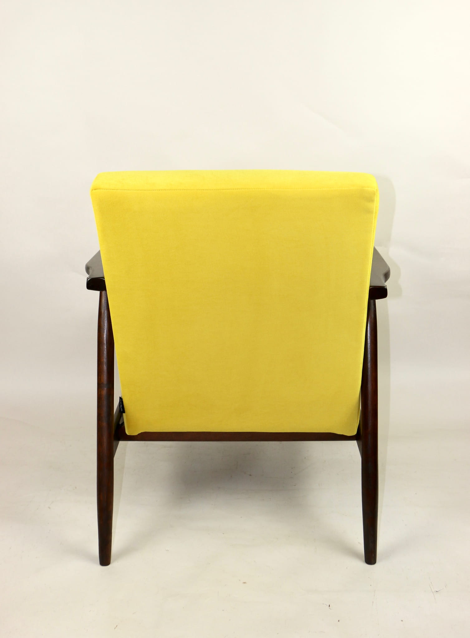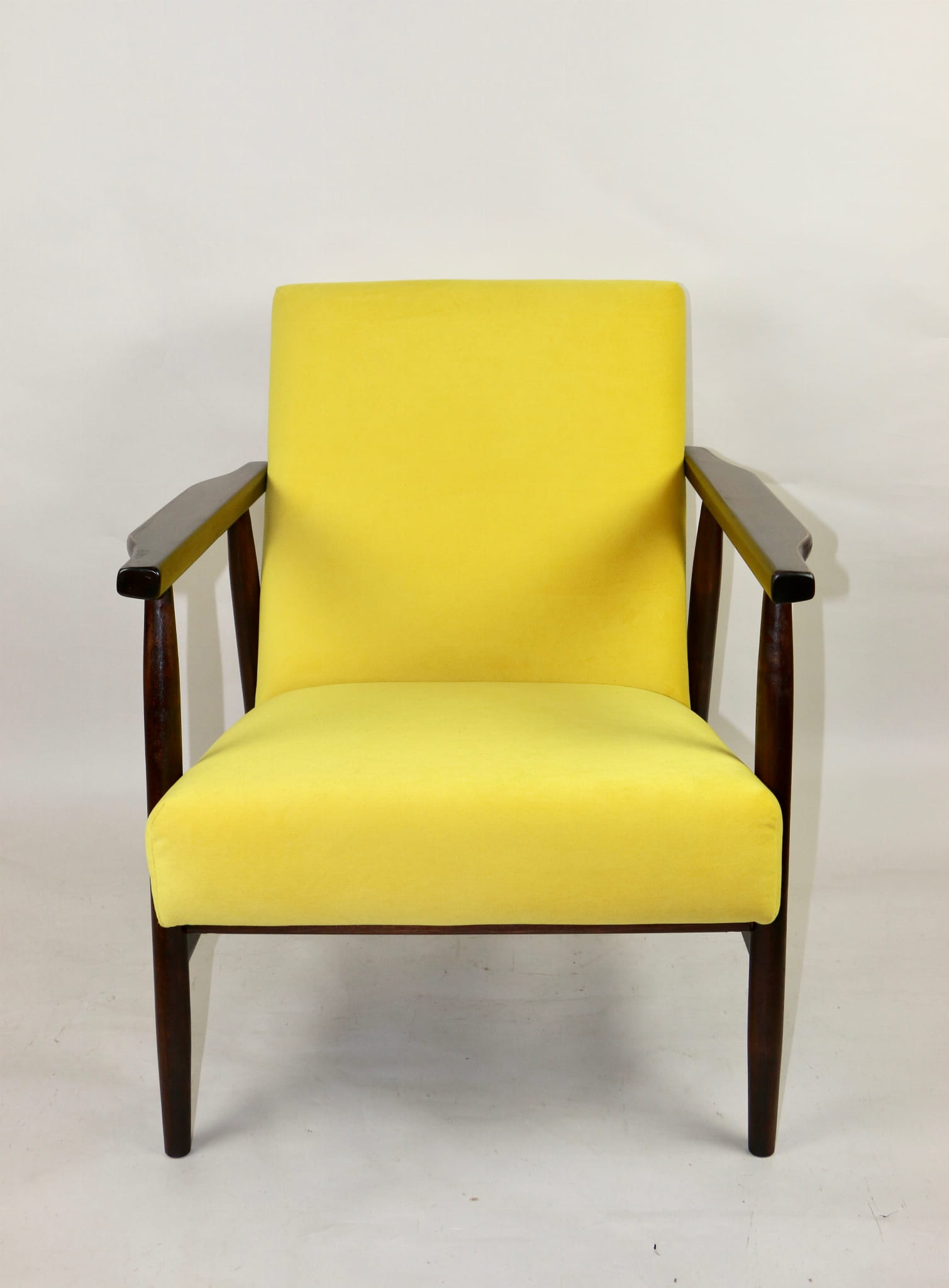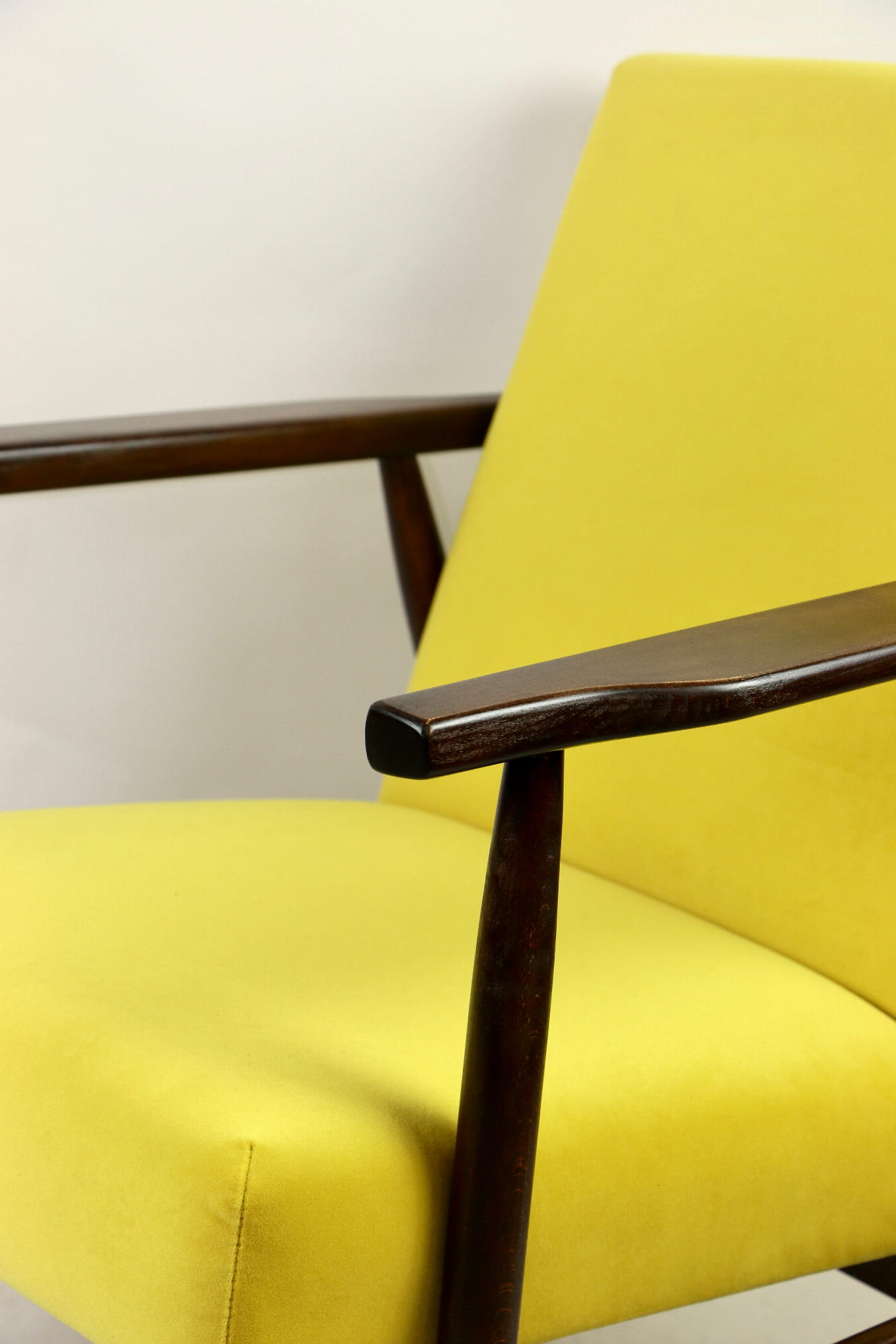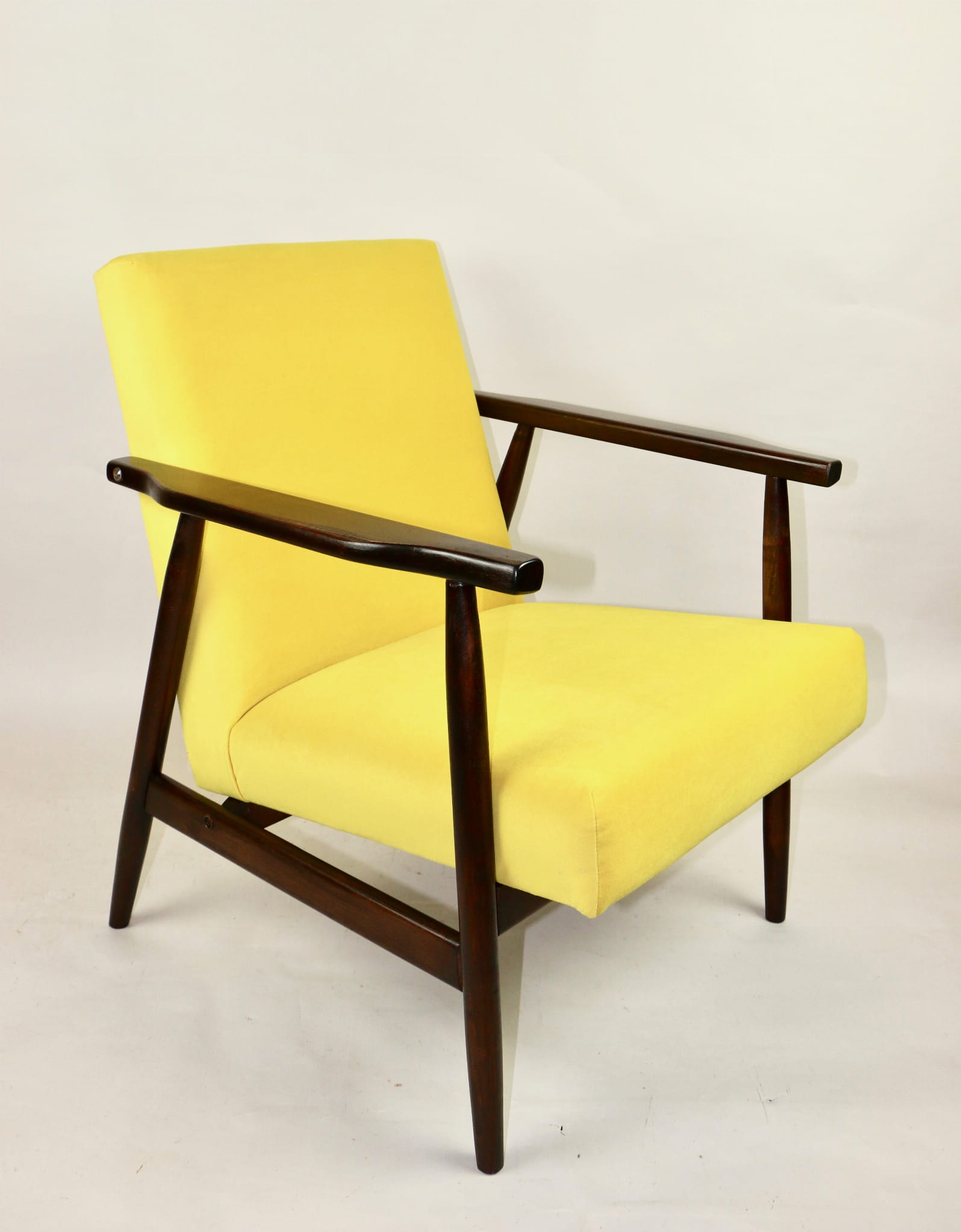 Fotel podobny do bardzo popularnego modelu Lis był produkowany przez zakłady meblarskie w Radomsku w latach 70 tych. Został całkowicie odrestaurowany, zyskał nowe i modne obicie w kolorze żółtym - materiał welwet z serii Jade - kolor 400. Stelaż drewniany połączony jest z podłokietnikami w ciemnej kolorystyce drewna typu orzech pokryty lakierem.