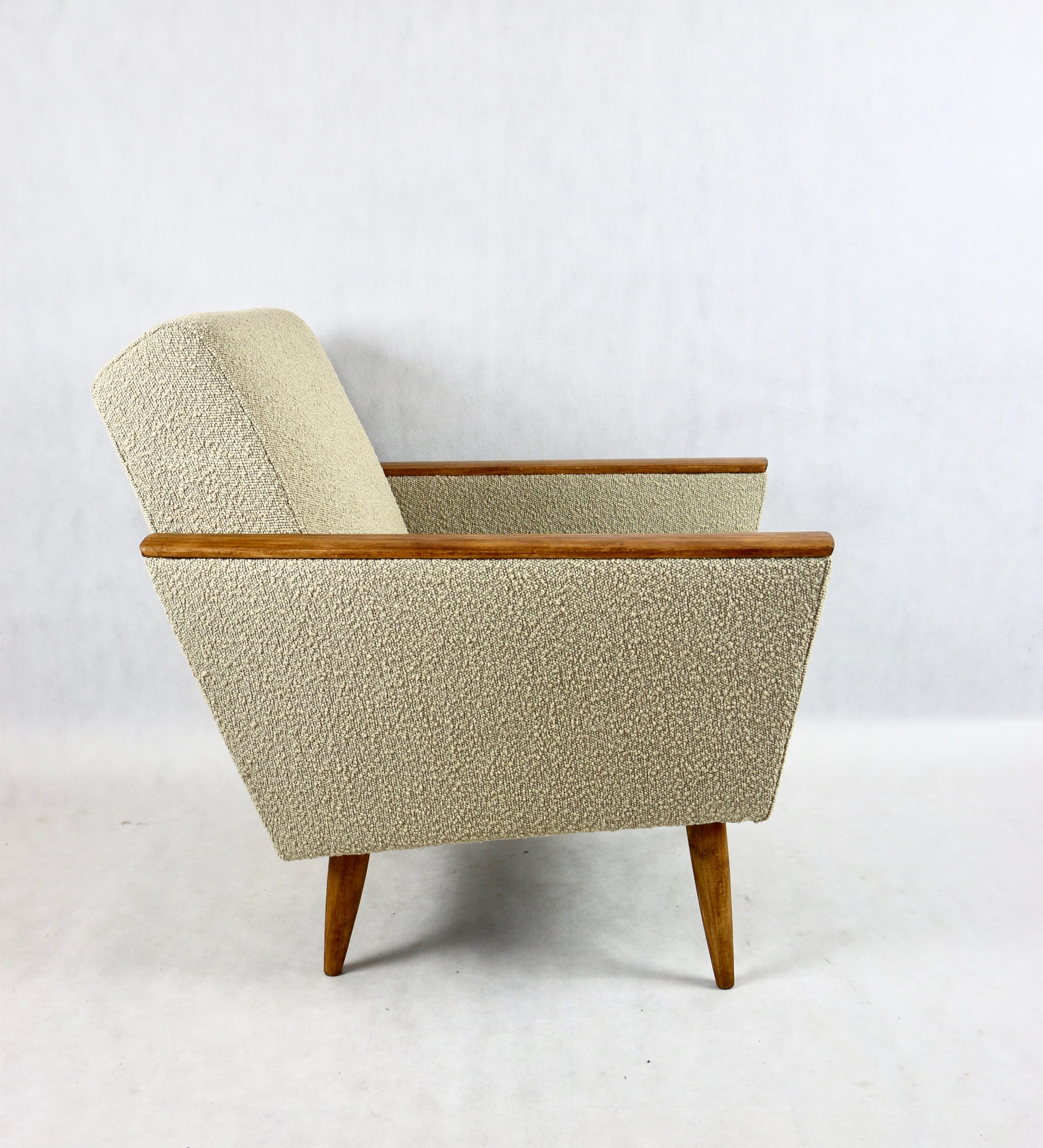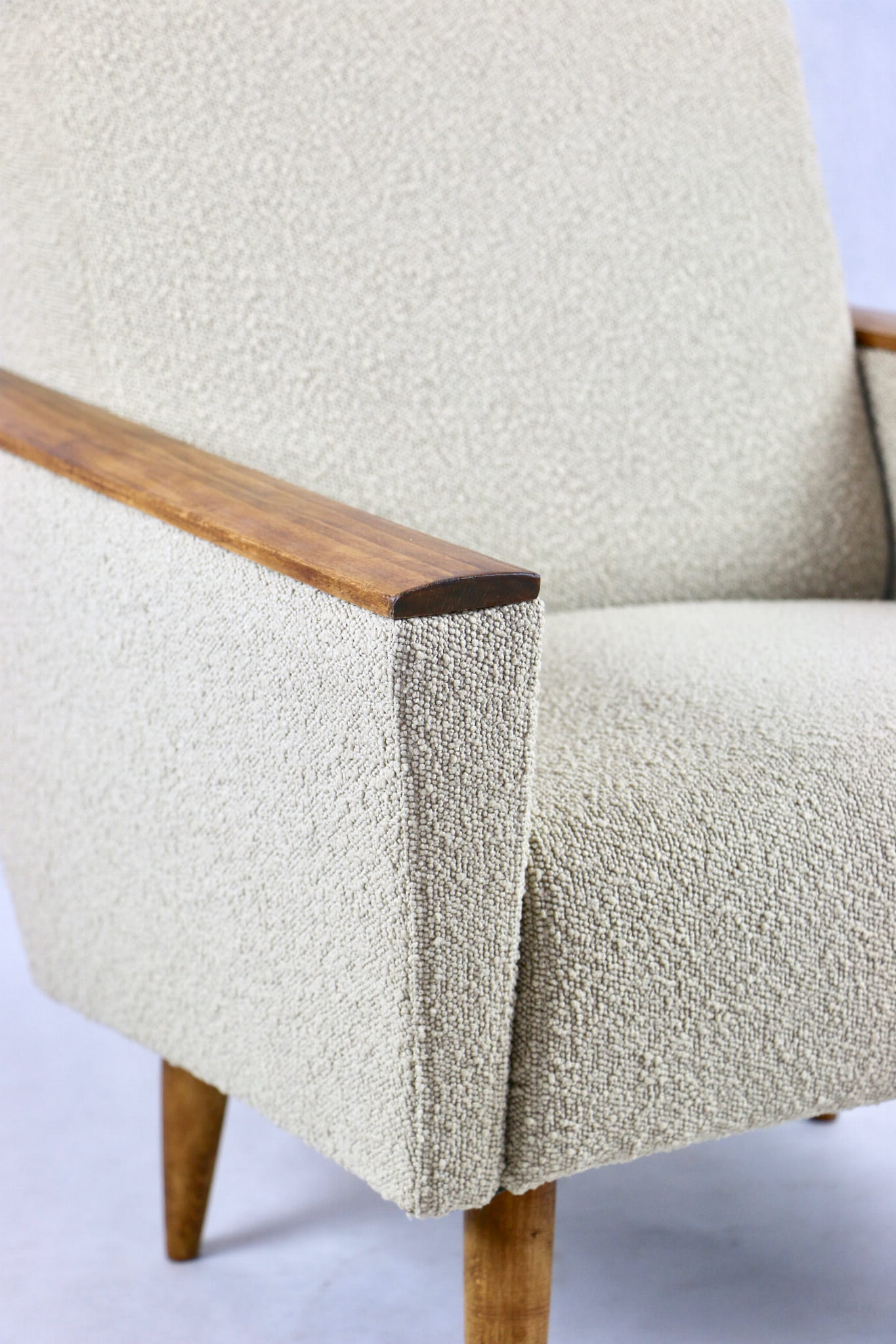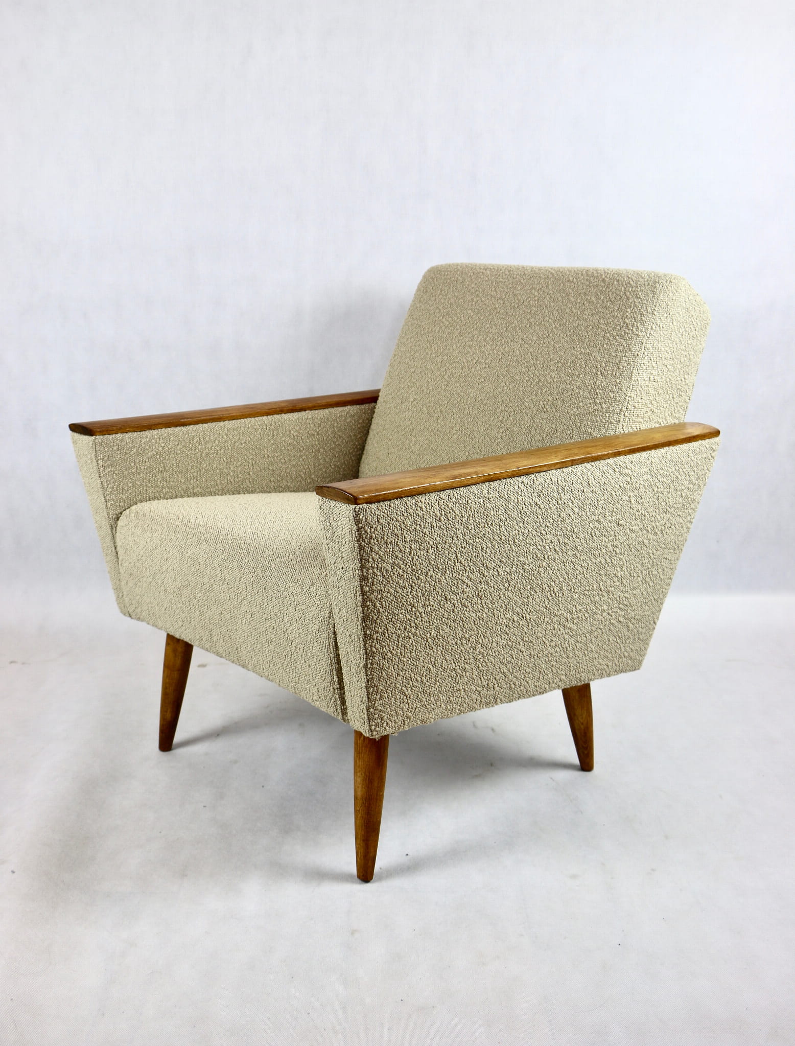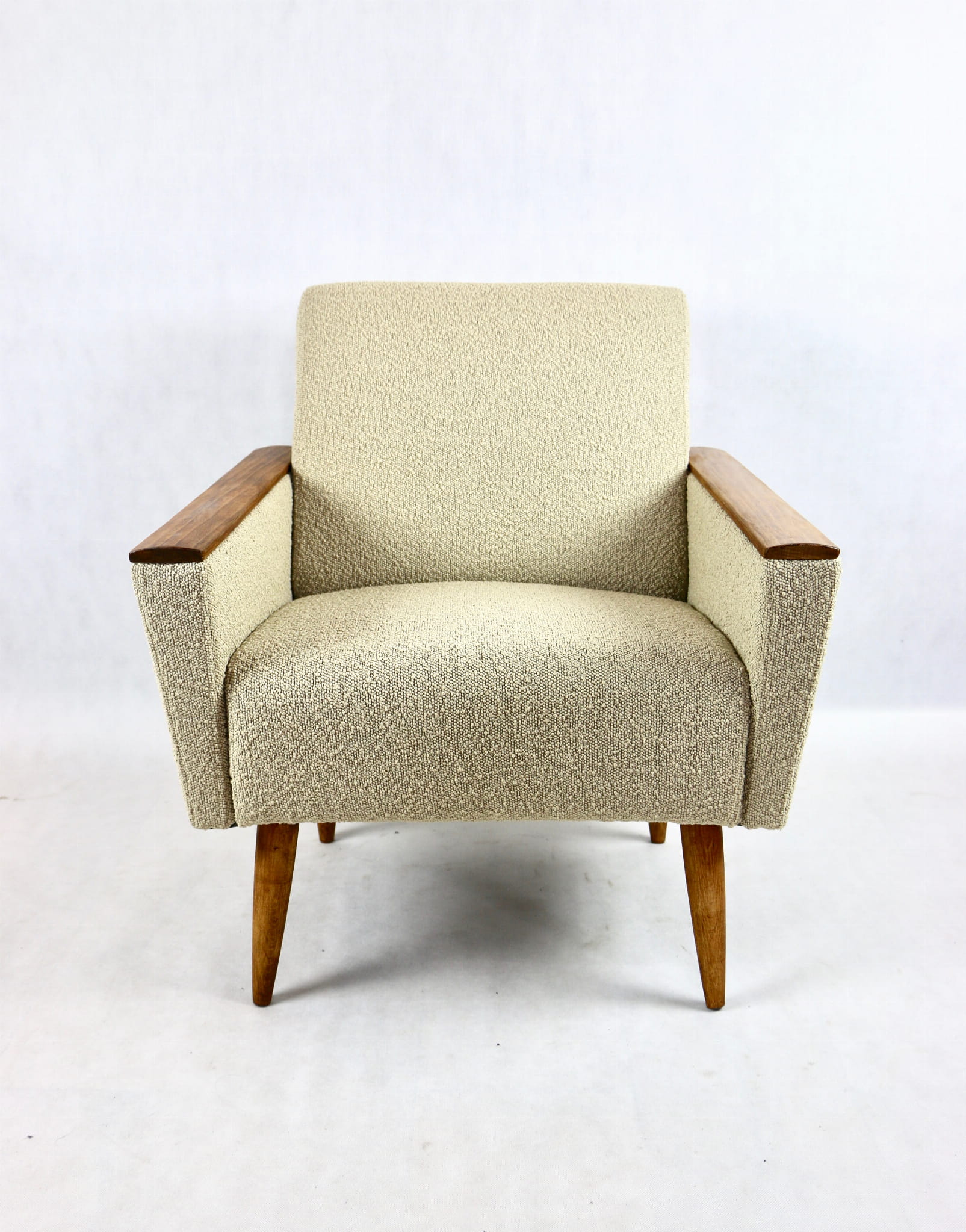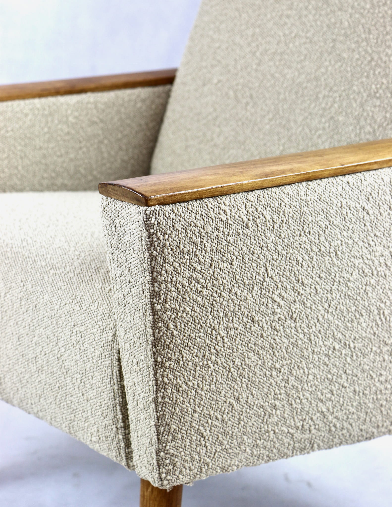 Przepiękny fotel w stylu Art. Deco w kolorze beżowym, kompletnie odrestaurowany z dodatkami różnej formy i stylu. Nowa tapicerka wraz z wypełnieniem wnętrza siedziska i oparcia pokryta została tkaniną typu boucle. Podłokietniki i nóżki drewniane w brązowym kolorze drewna - zostały pokryte lakierowoskiem.