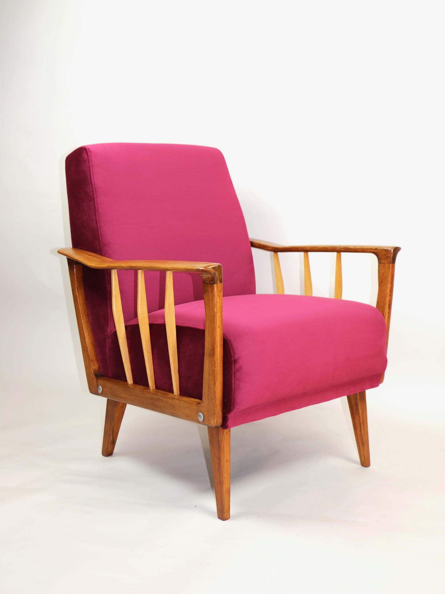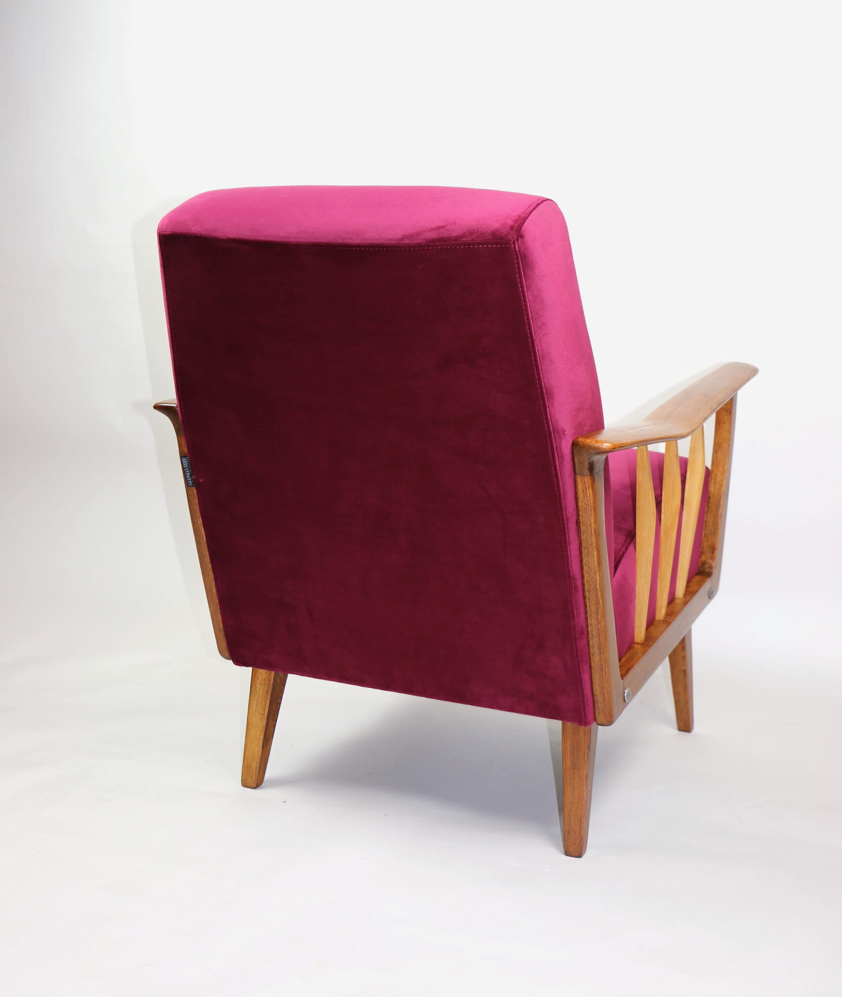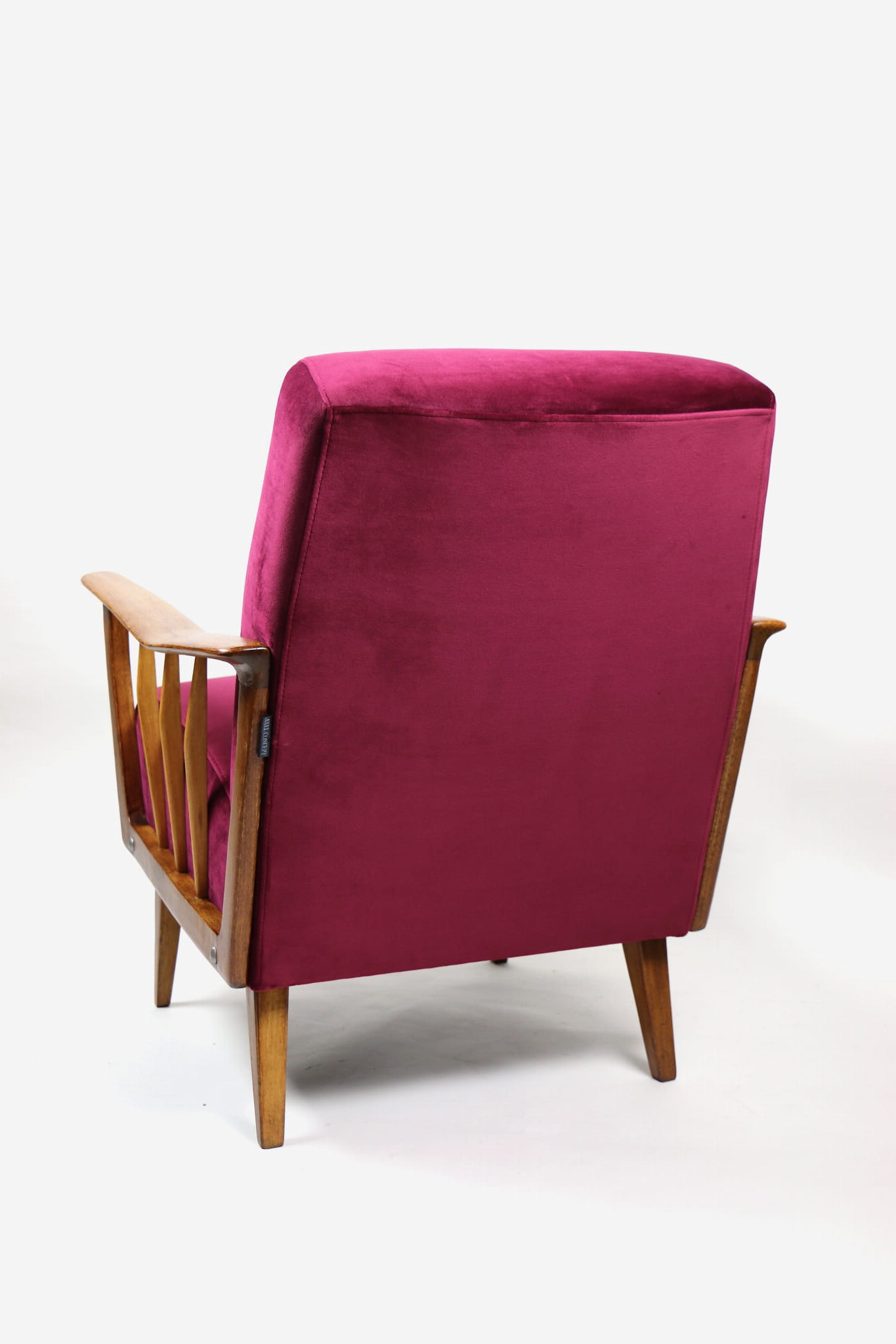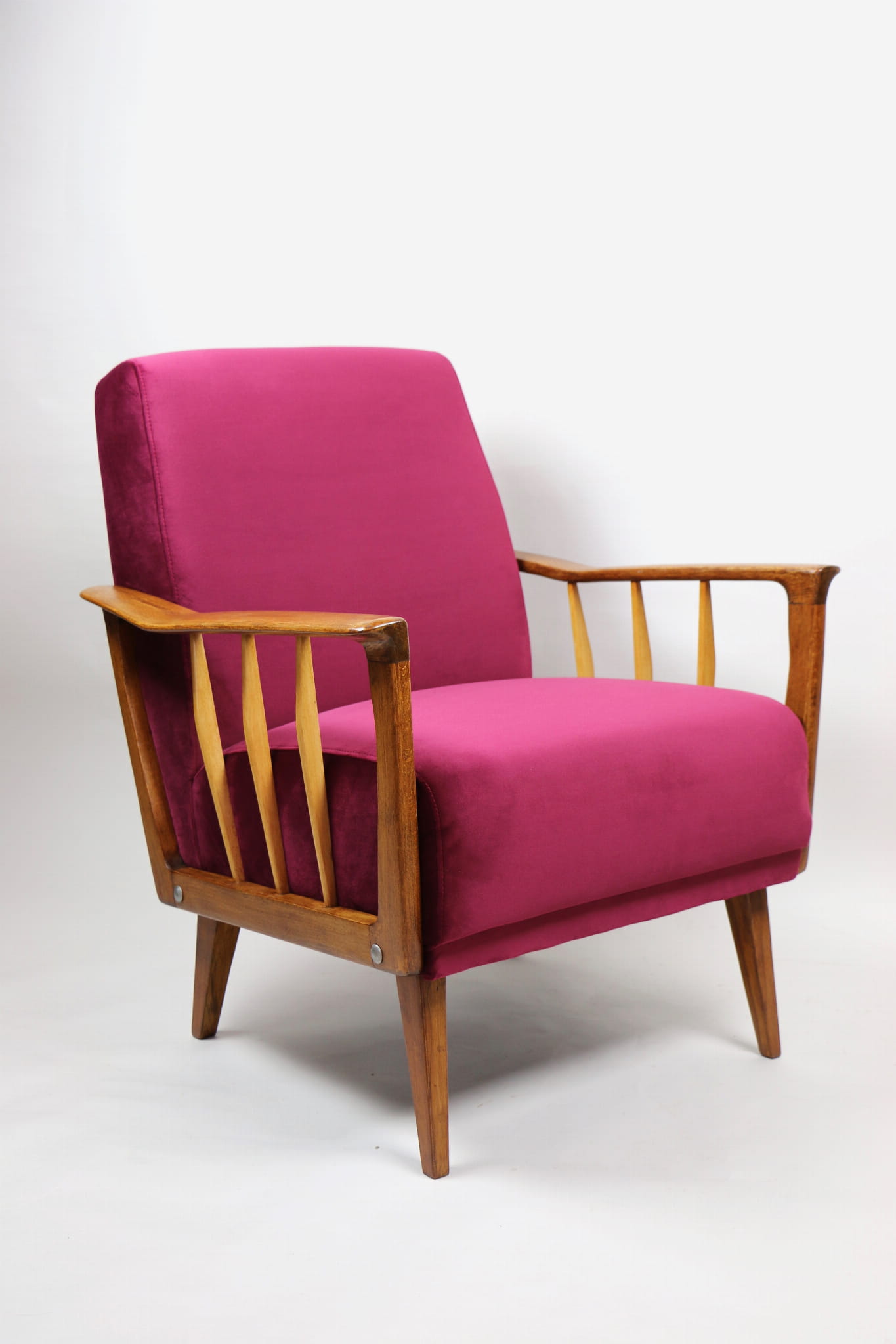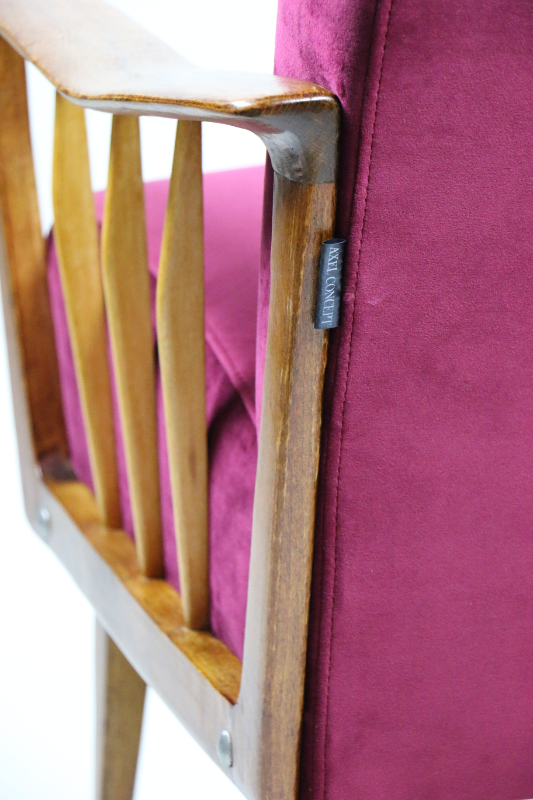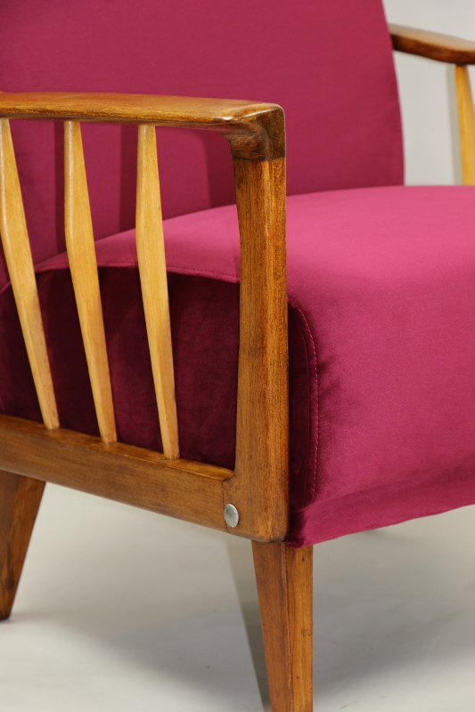 Przepiękny fotel w stylu Art. Deco., kompletnie odrestaurowany. Nowa tapicerka wraz z wypełnieniem. Oparcie wraz siedziskiem pokryte aksamitnym materiałem w kolorze malinowym typu welwet. Podparcia - podłokietniki i nóżki drewniane w naturalnym kolorze drewna zostały odpowiednio woskowane kolorem antic.
