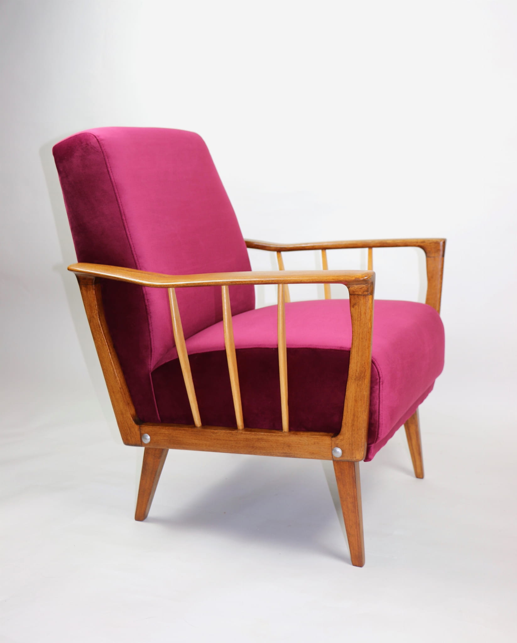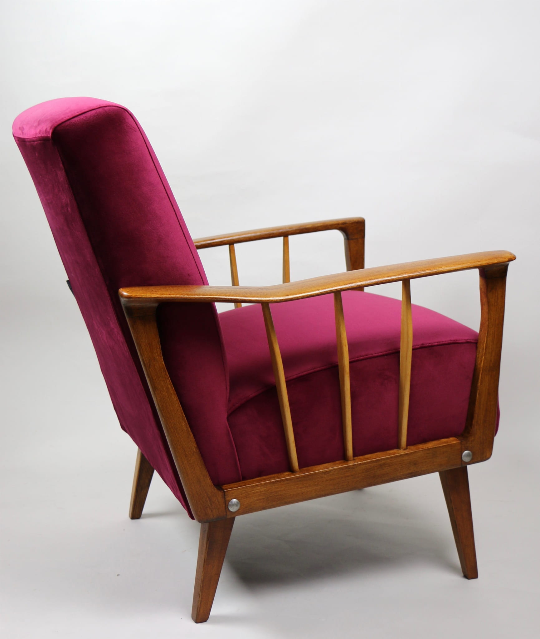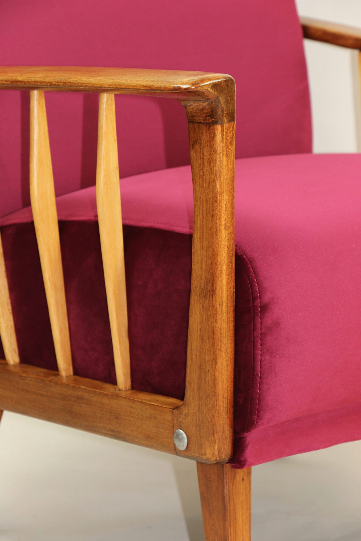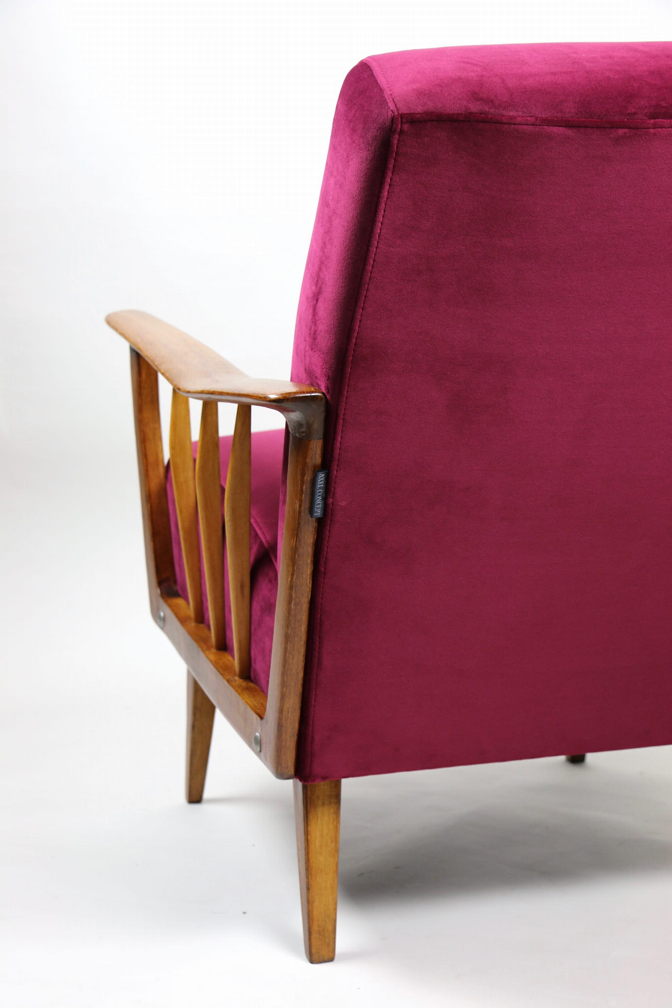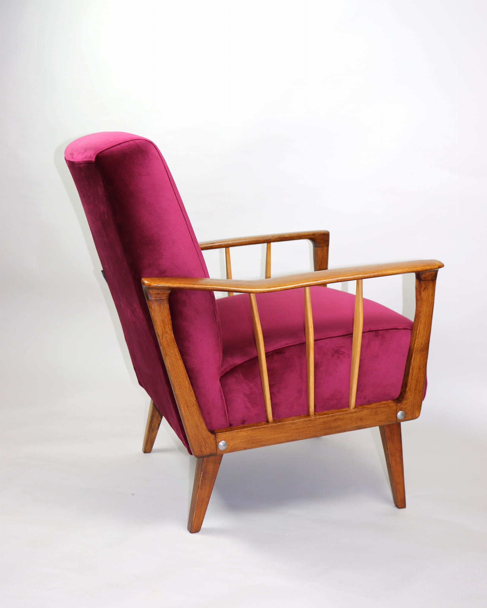 Przepiękny fotel w stylu Art. Deco., kompletnie odrestaurowany. Nowa tapicerka wraz z wypełnieniem. Oparcie wraz siedziskiem pokryte aksamitnym materiałem w kolorze malinowym typu welwet. Podparcia - podłokietniki i nóżki drewniane w naturalnym kolorze drewna zostały odpowiednio woskowane kolorem antic.
