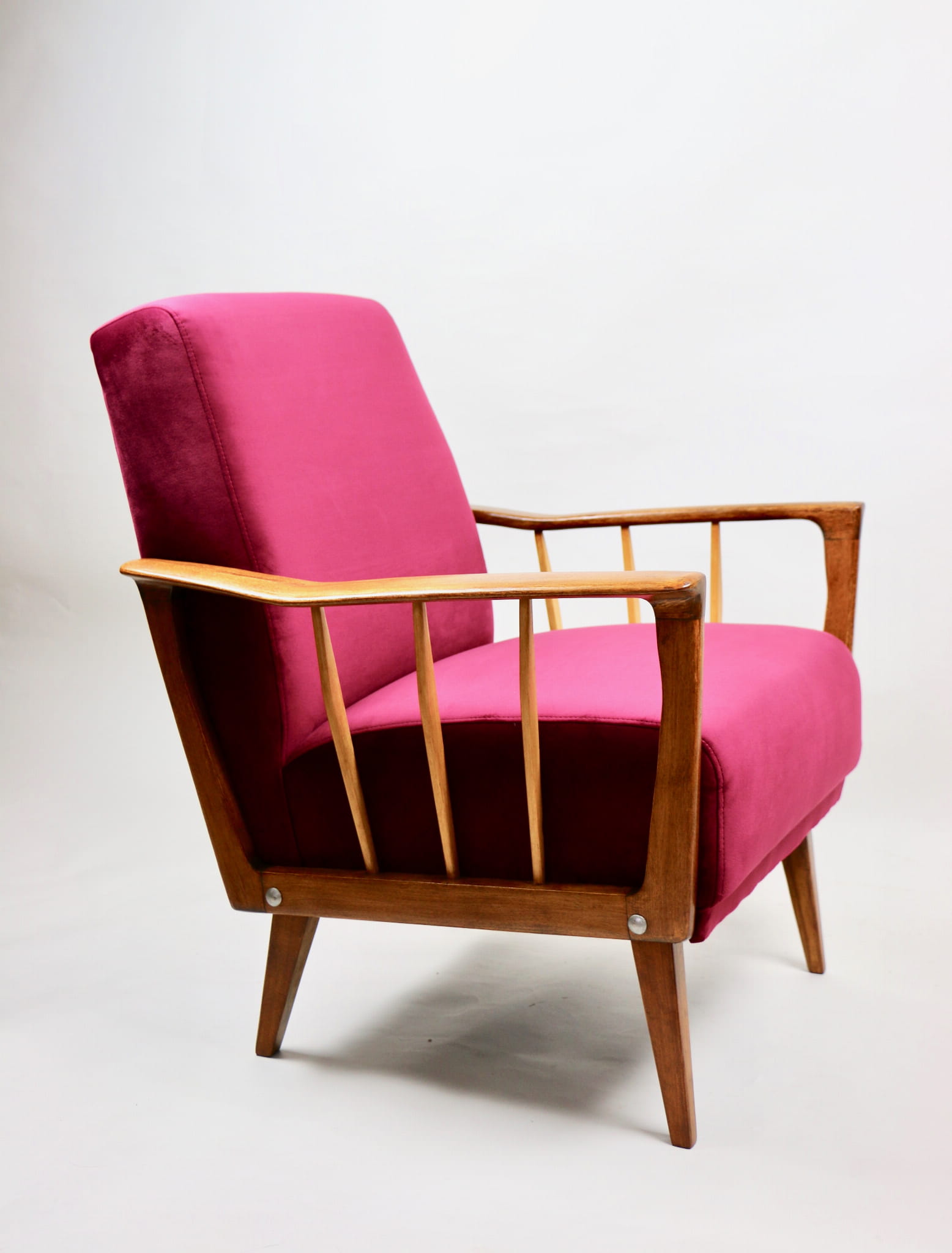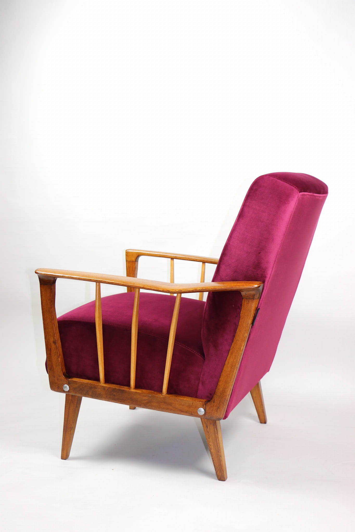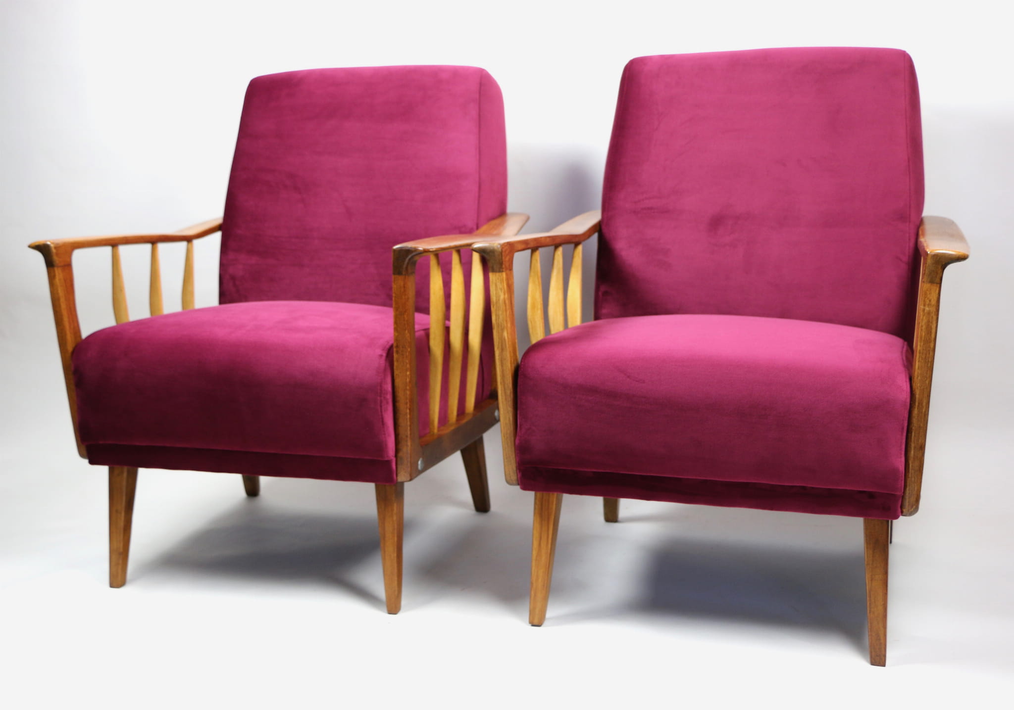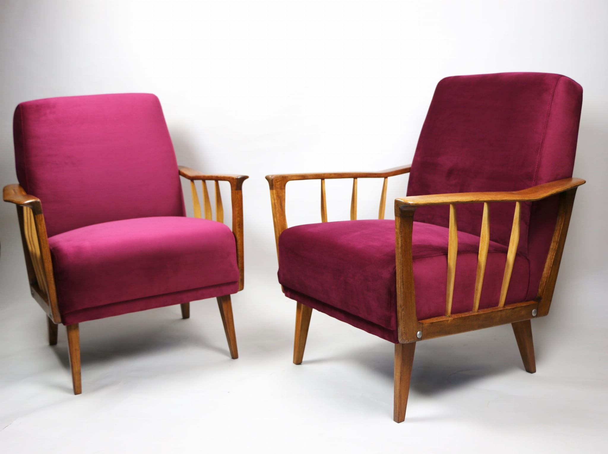 Przepiękny fotel w stylu Art. Deco., kompletnie odrestaurowany. Nowa tapicerka wraz z wypełnieniem. Oparcie wraz siedziskiem pokryte aksamitnym materiałem w kolorze malinowym typu welwet. Podparcia - podłokietniki i nóżki drewniane w naturalnym kolorze drewna zostały odpowiednio woskowane kolorem antic.