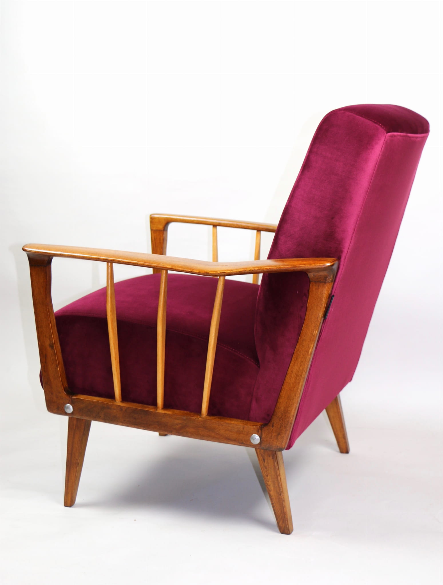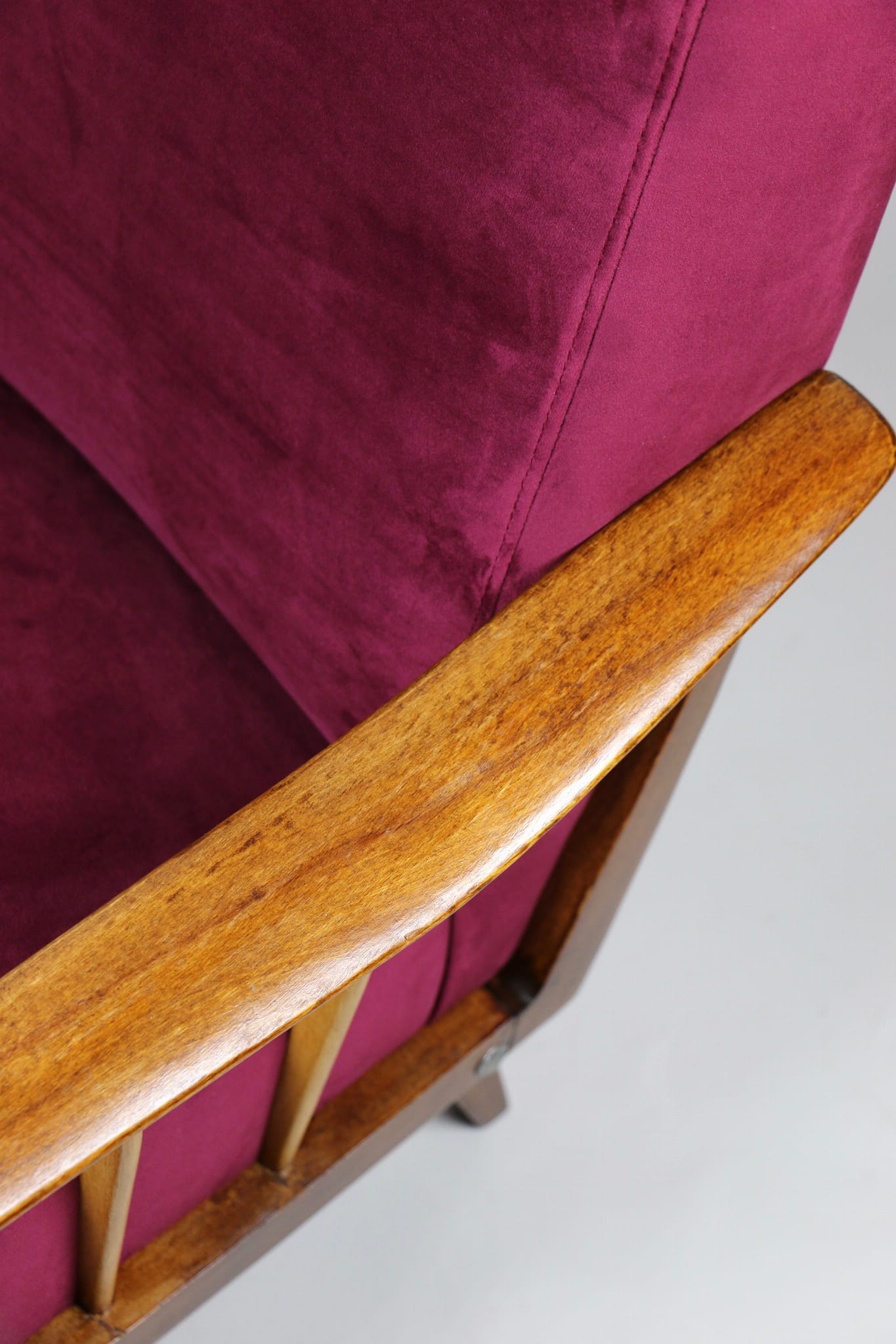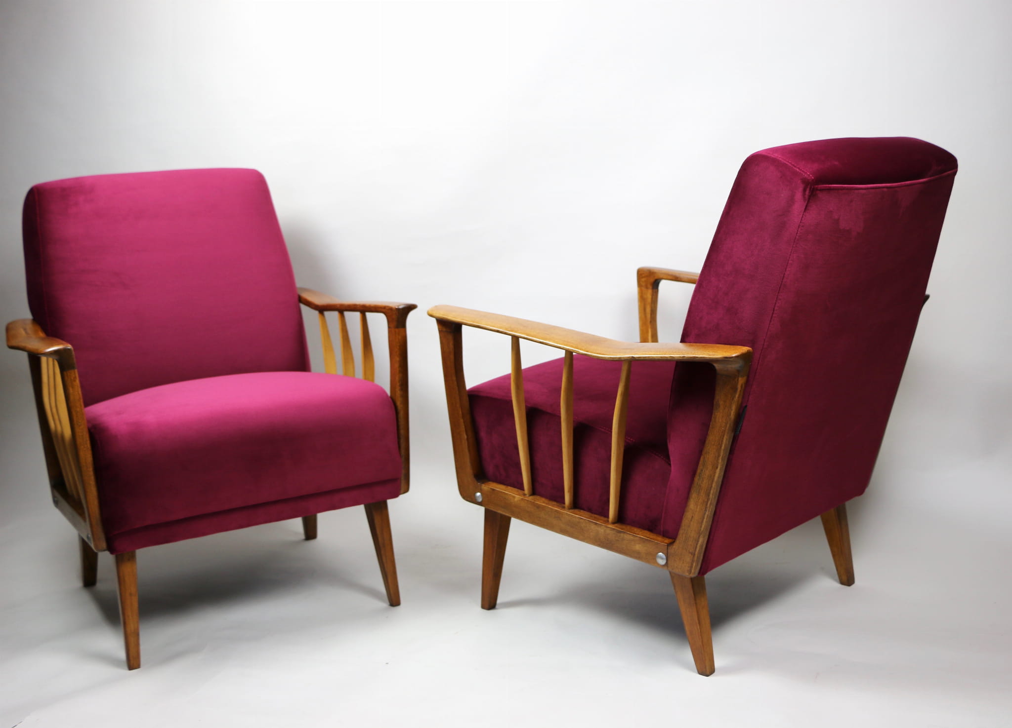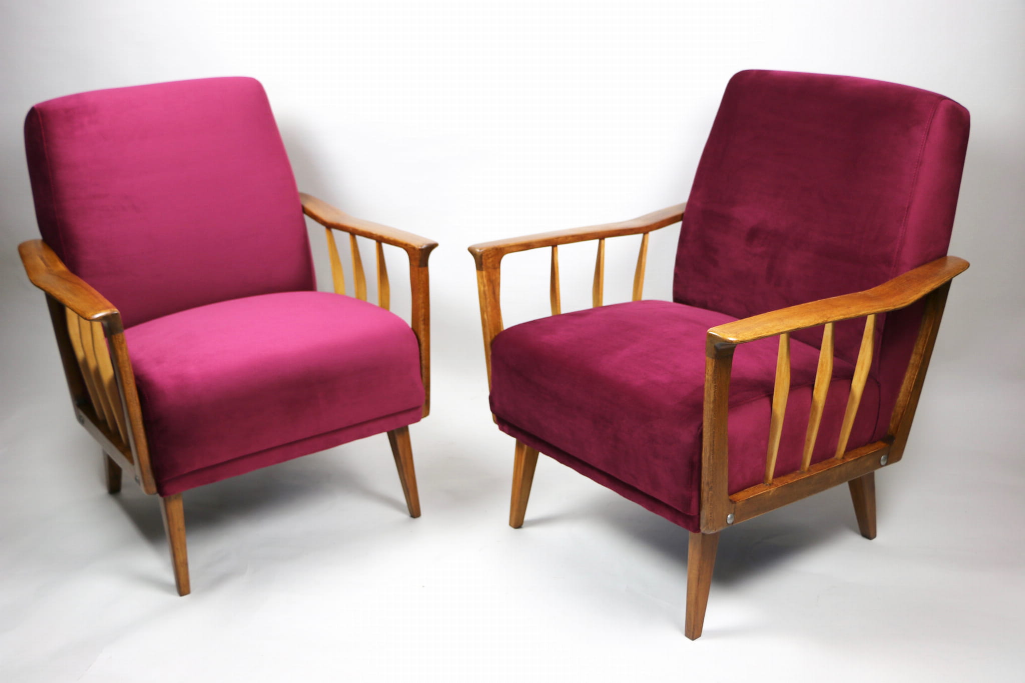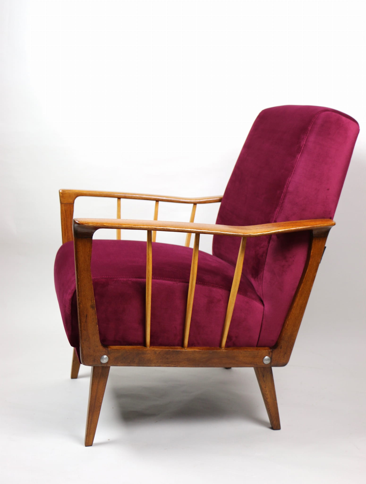 Przepiękny fotel w stylu Art. Deco., kompletnie odrestaurowany. Nowa tapicerka wraz z wypełnieniem. Oparcie wraz siedziskiem pokryte aksamitnym materiałem w kolorze malinowym typu welwet. Podparcia - podłokietniki i nóżki drewniane w naturalnym kolorze drewna zostały odpowiednio woskowane kolorem antic.