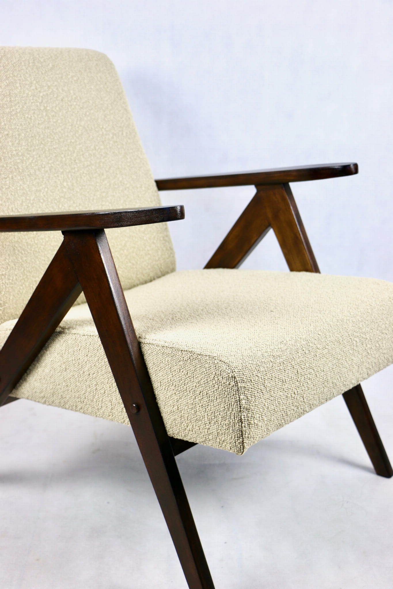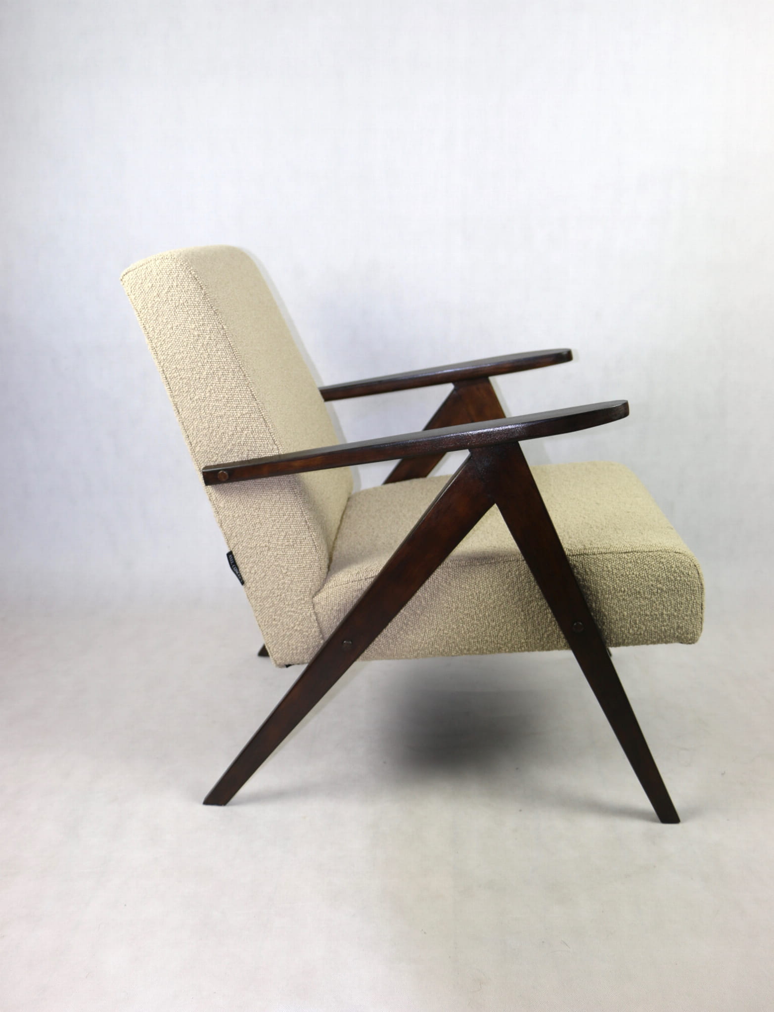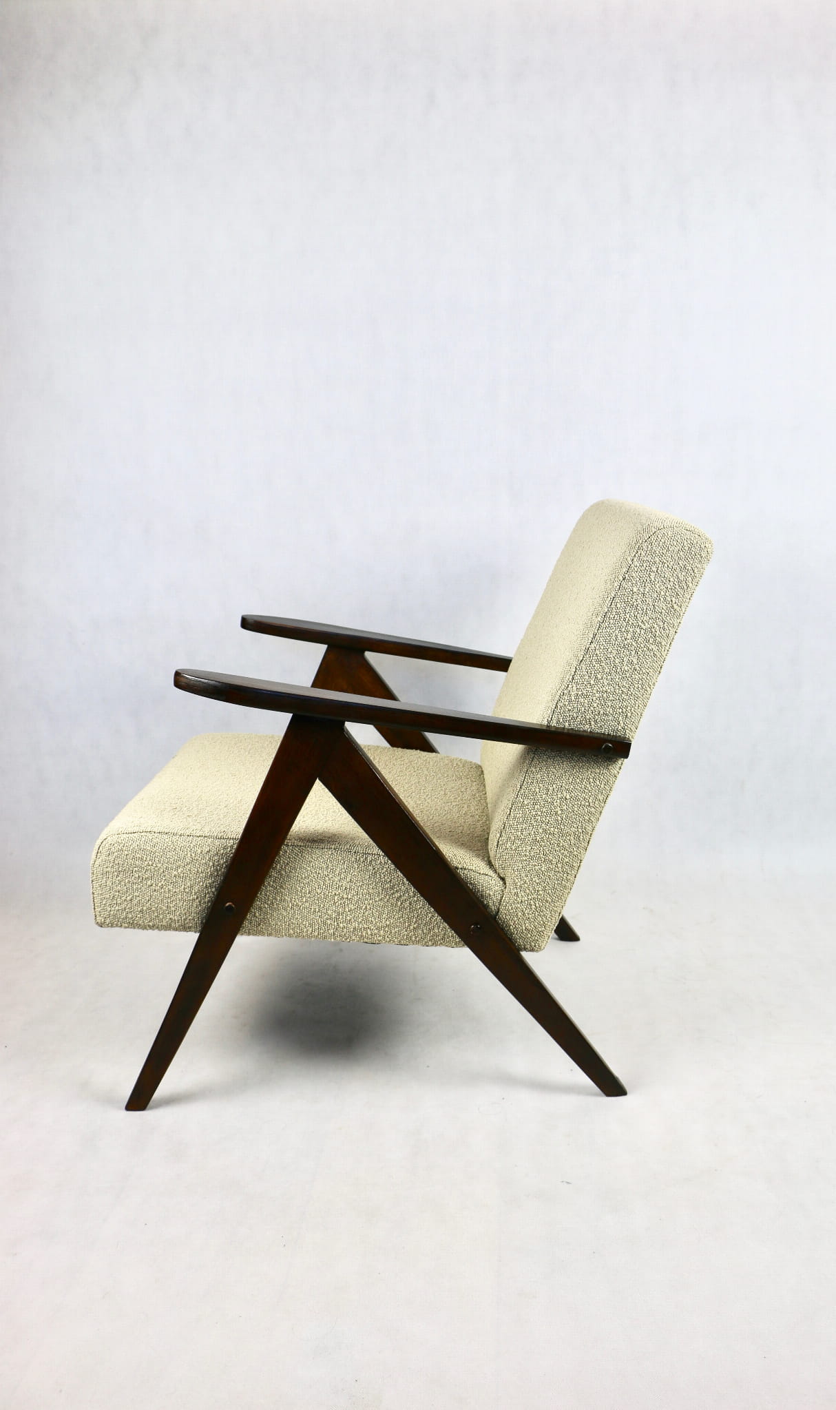 Fotel klasyczny Var B-310 prodokowany w latach 70tych. Całkowicie odrestaurowany, nowe obicie pokryte strukturalnym materiałem w kolorze beżowym/jasny brąz - kolekcja Boucle. Siedzisko bardzo wygodne, stelaż drewniany połączony z podłokietnikami w orzechowej kolorystyce drewna.