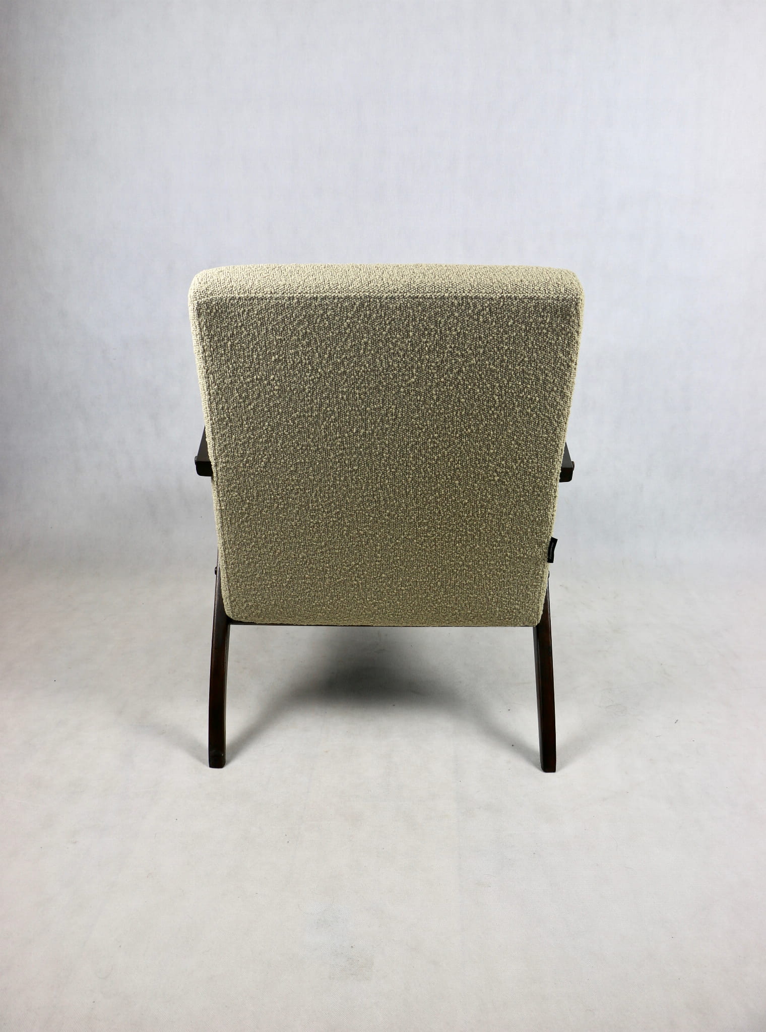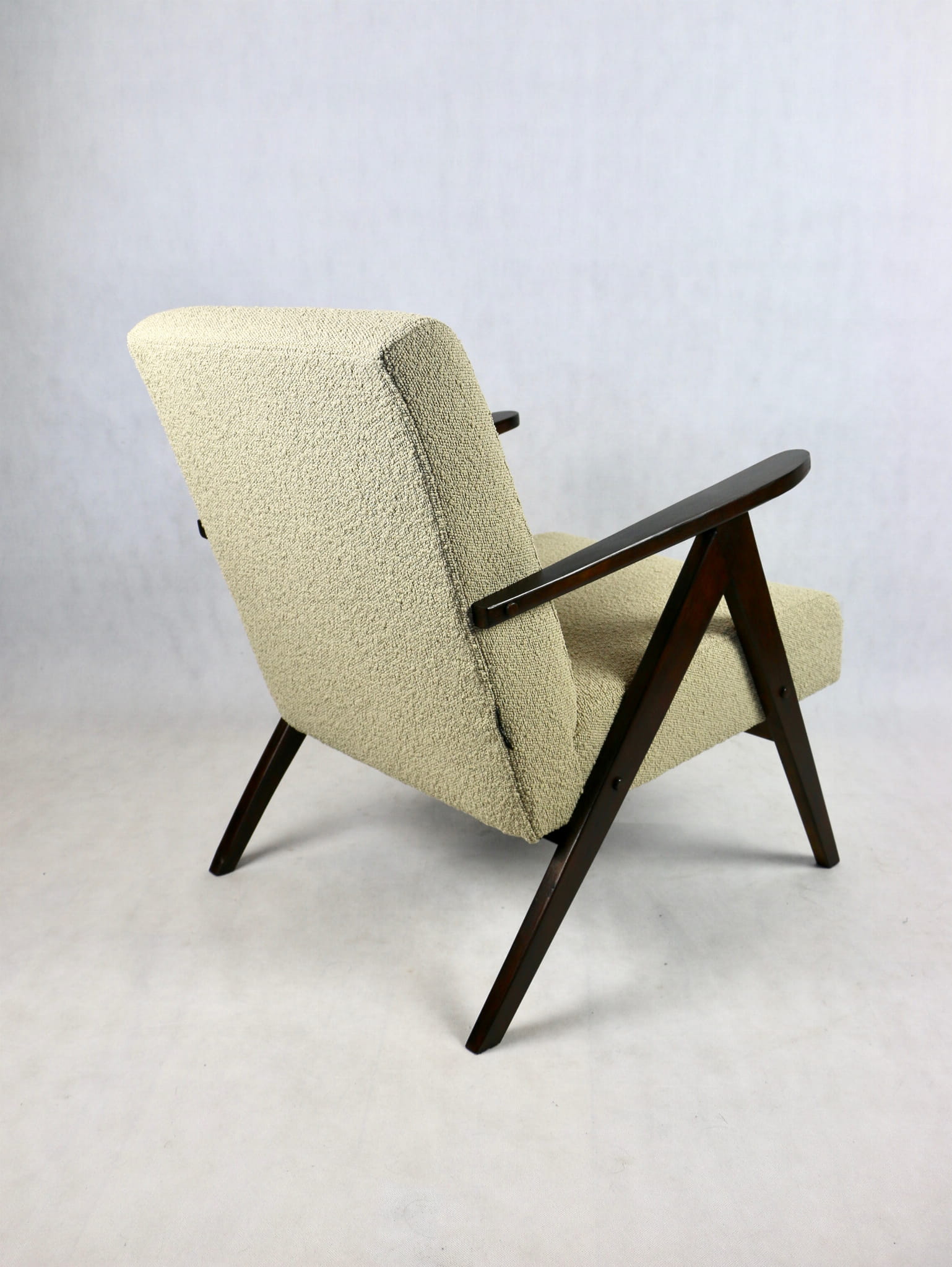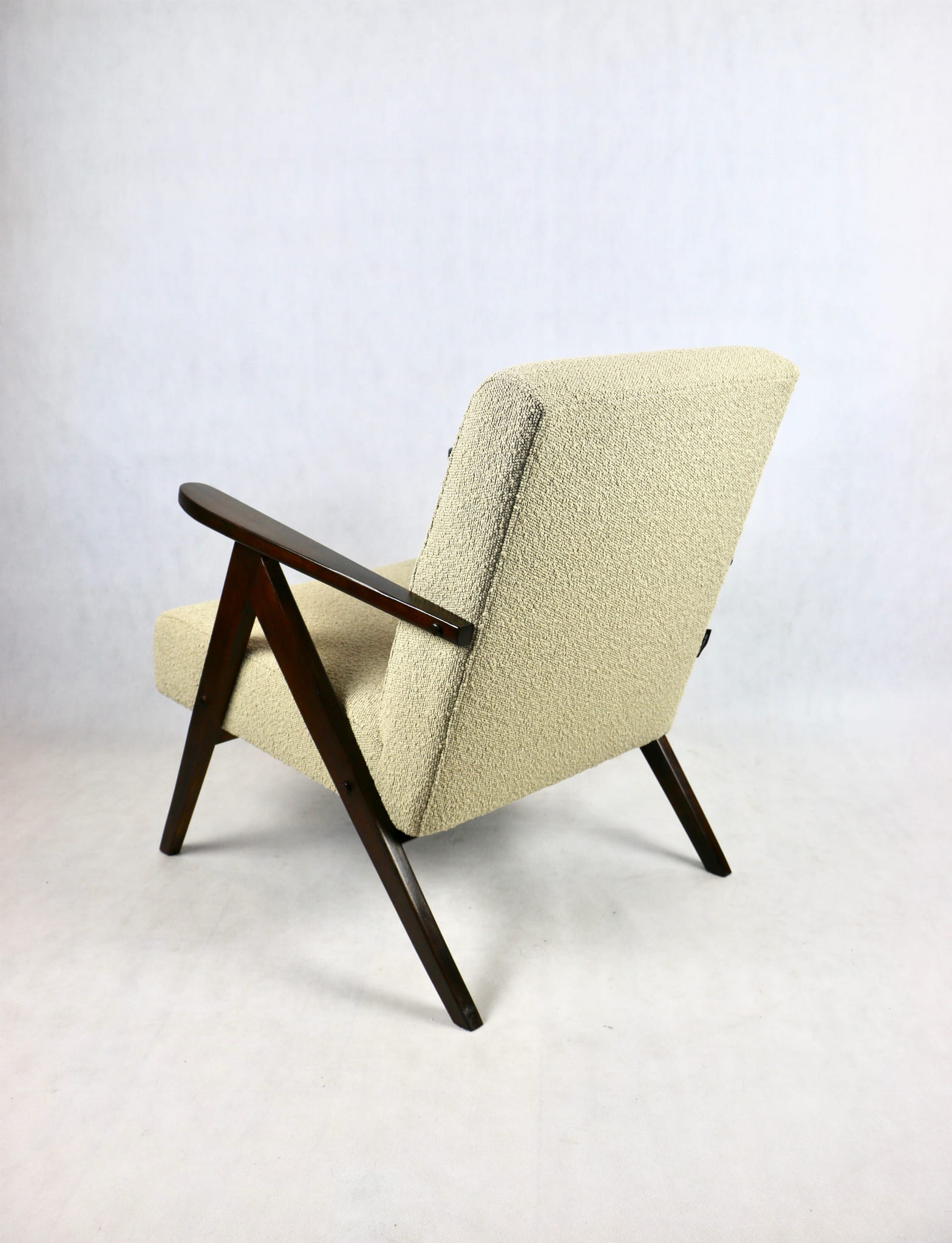 Fotel klasyczny Var B-310 prodokowany w latach 70tych. Całkowicie odrestaurowany, nowe obicie pokryte strukturalnym materiałem w kolorze beżowym/jasny brąz - kolekcja Boucle. Siedzisko bardzo wygodne, stelaż drewniany połączony z podłokietnikami w orzechowej kolorystyce drewna.