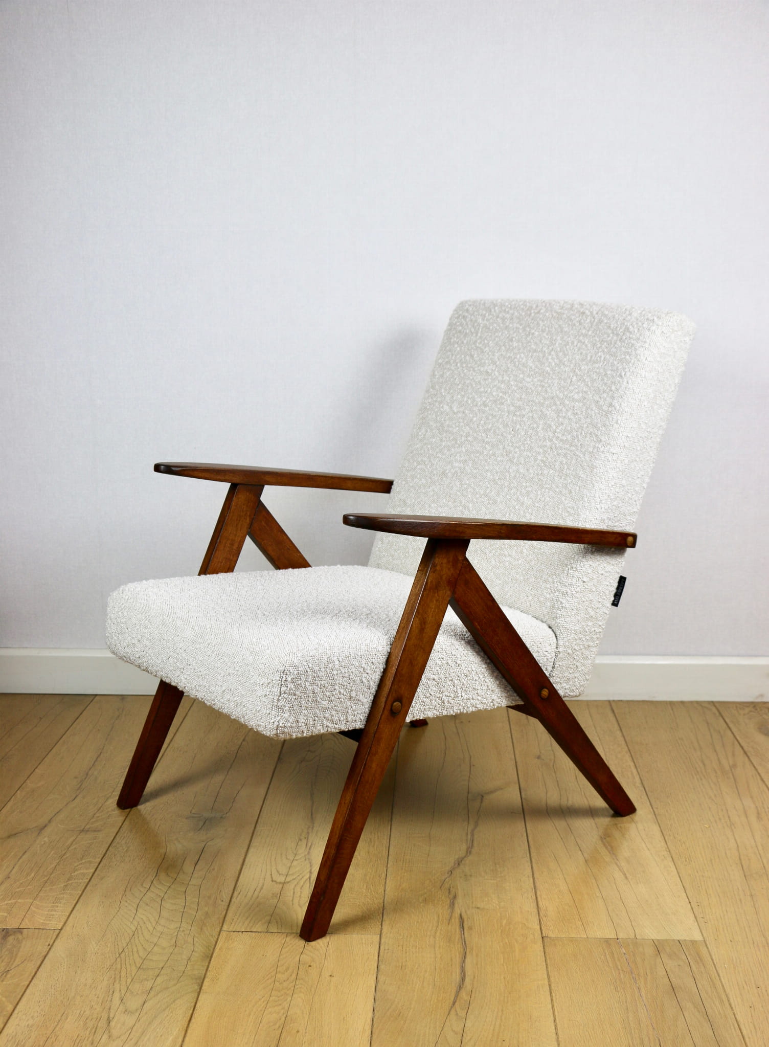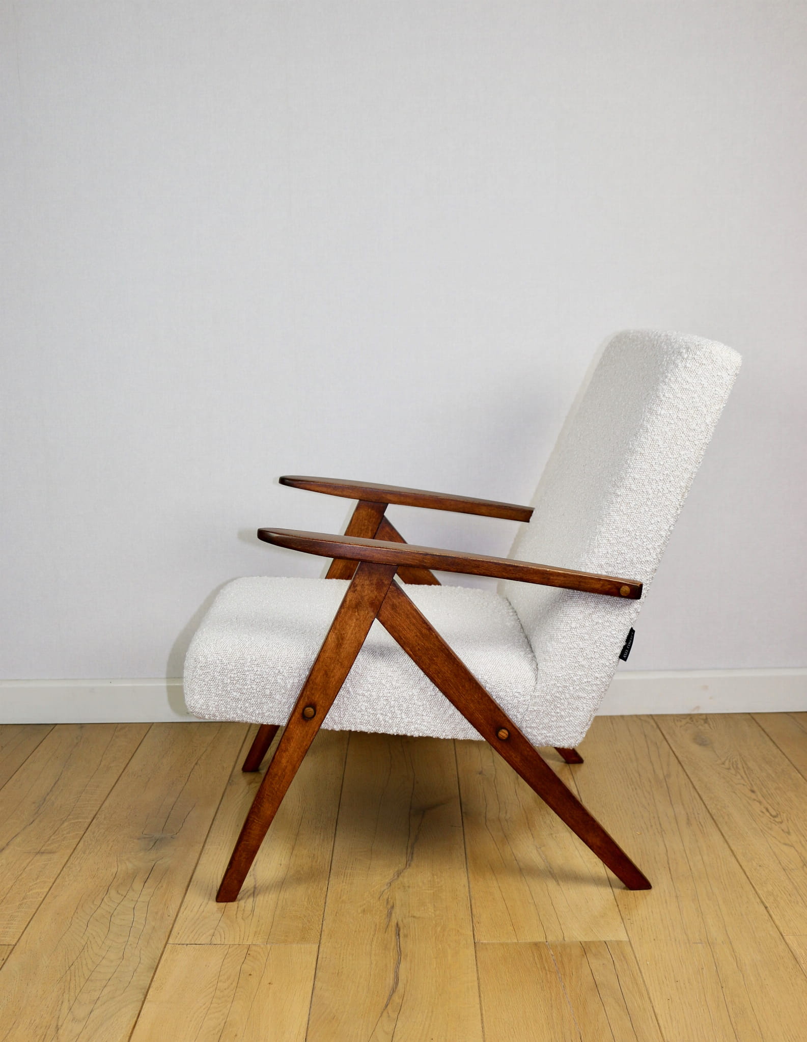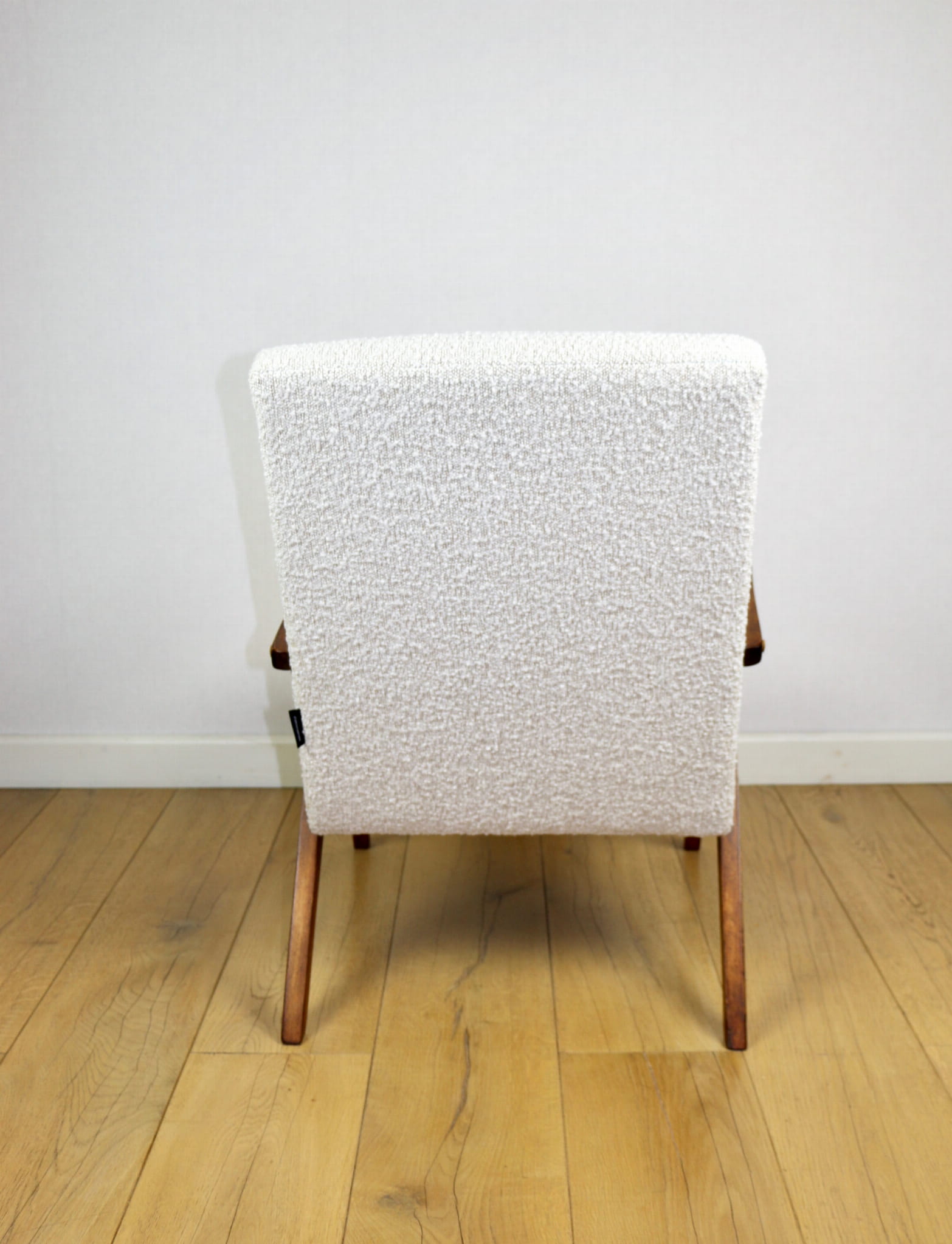Fotel Vintage B-310 VAR biały boucle strukturalny lata 70te - brązowe drewno