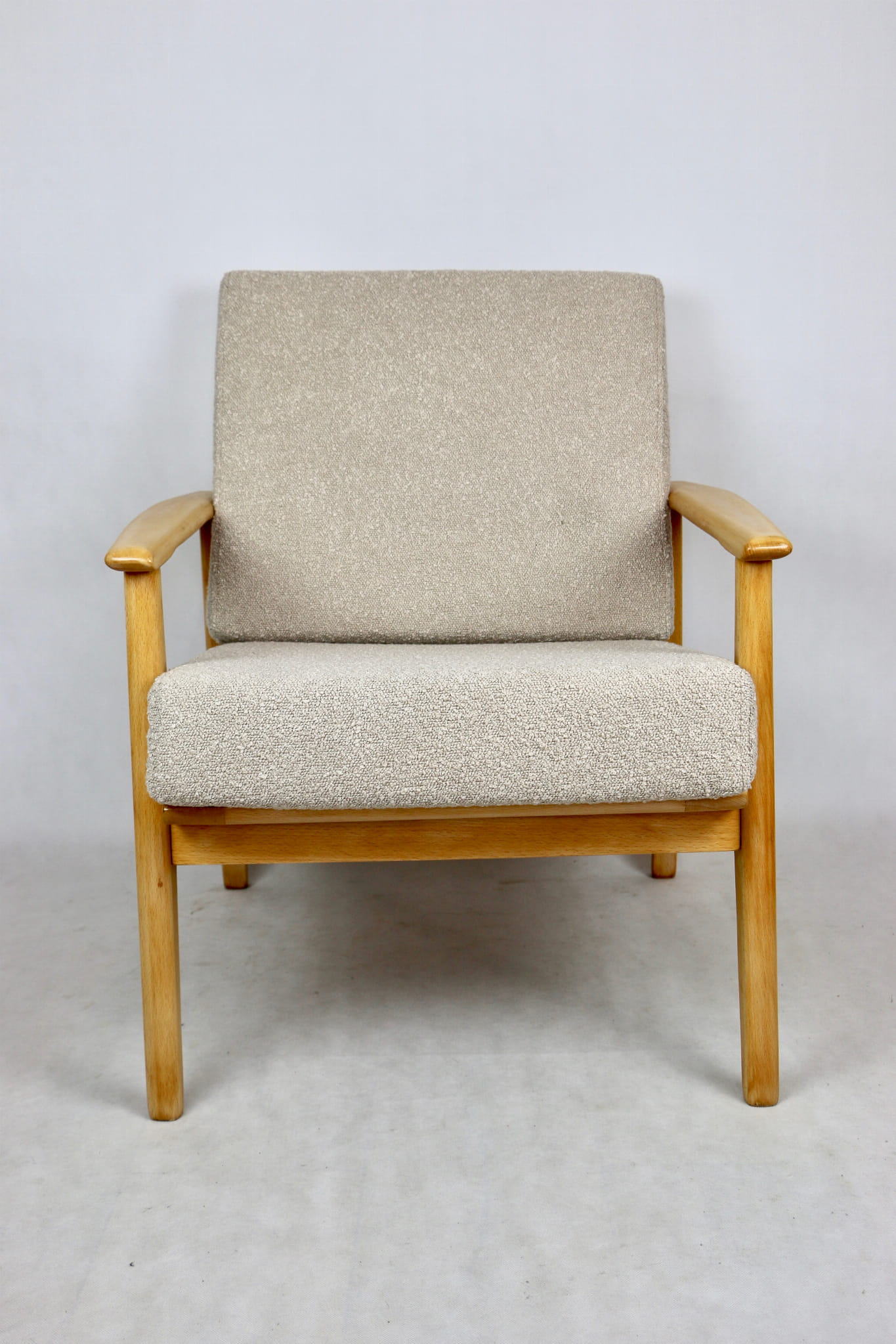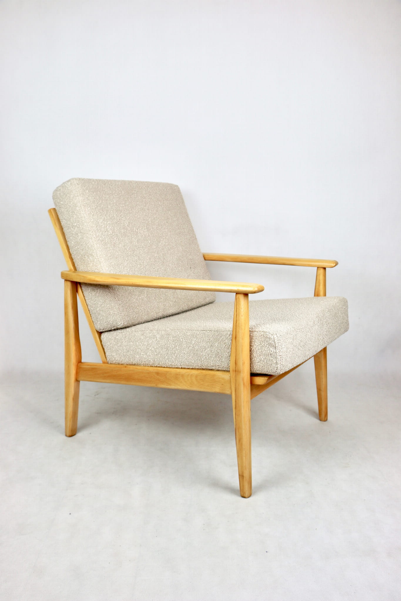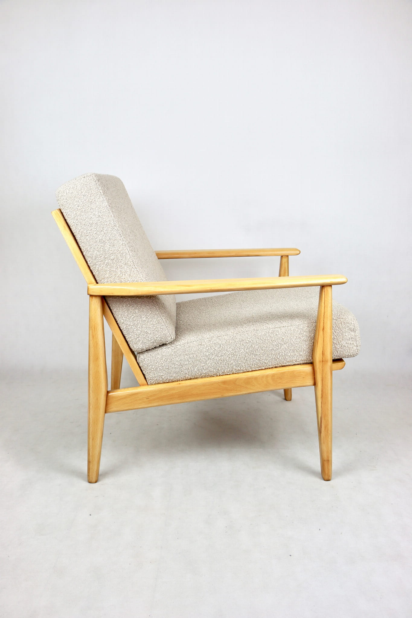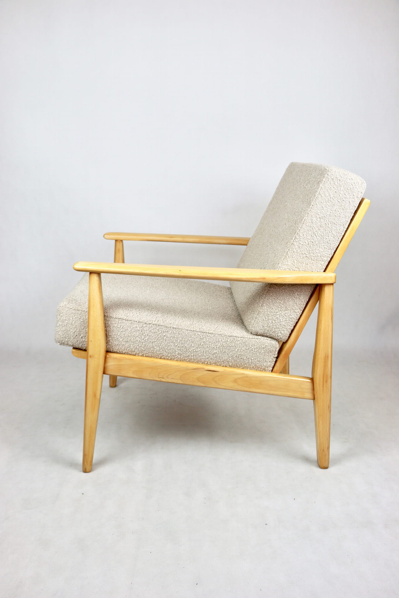 Fotel Duński całkowicie odrestaurowany na zdejmowanych poduszkach. Nowe obicie wraz z wypełnieniem pokryte najwyższej jakości materiałem tapicerskim w kolorze beżowym/caffe latte z serii strukturalnych tkanin jak wełna - Boucle. Stelaż drewniany z podłokietnikami pokryty lakierem w naturalnym kolorze drewna.