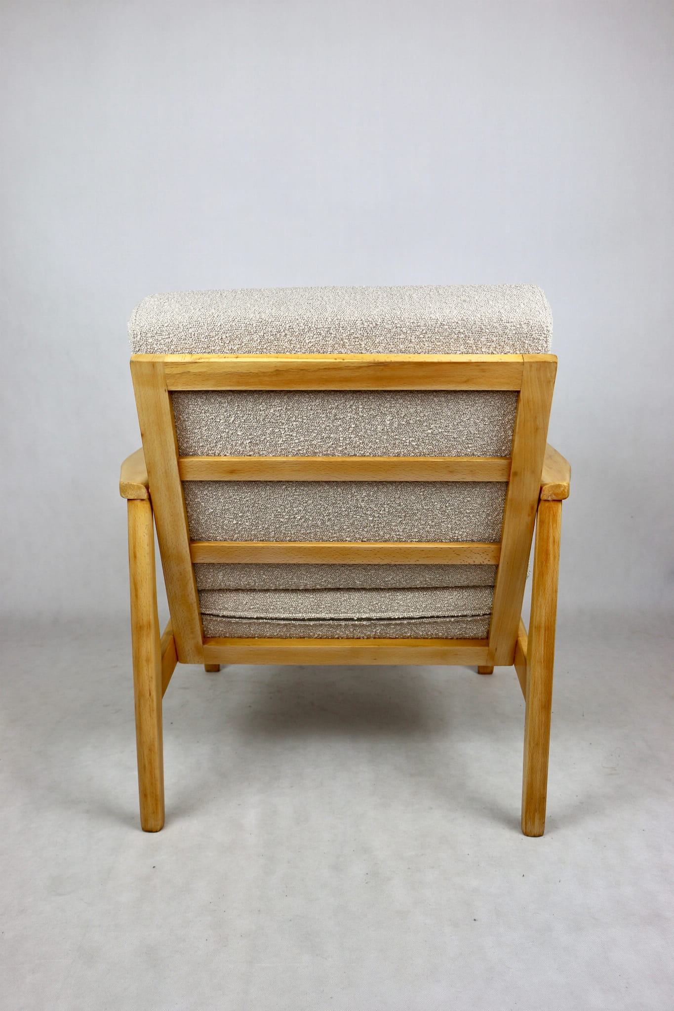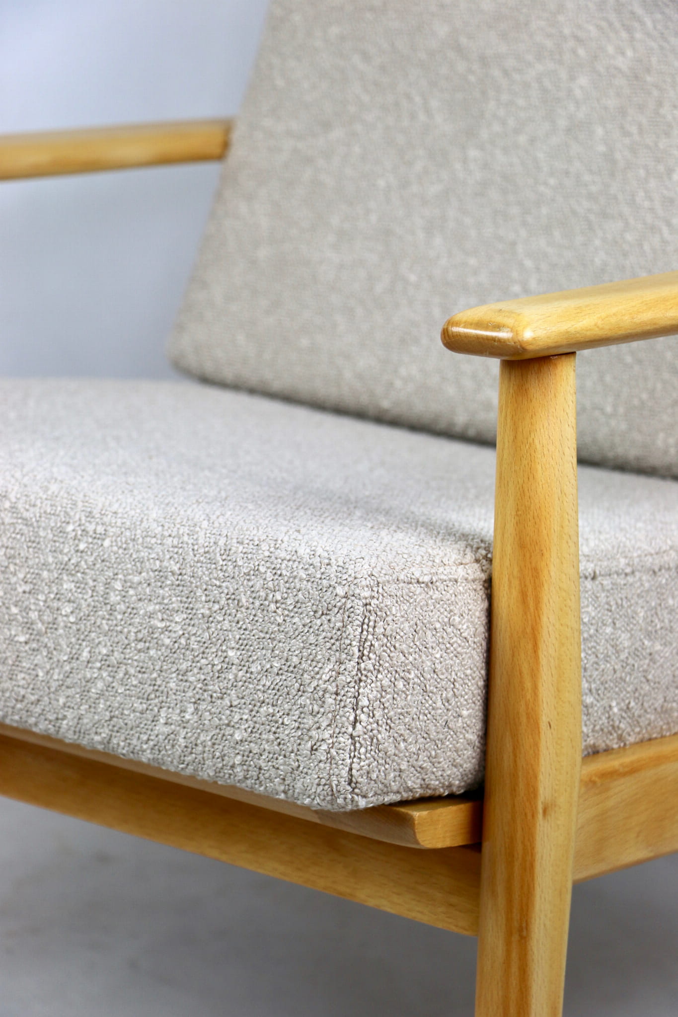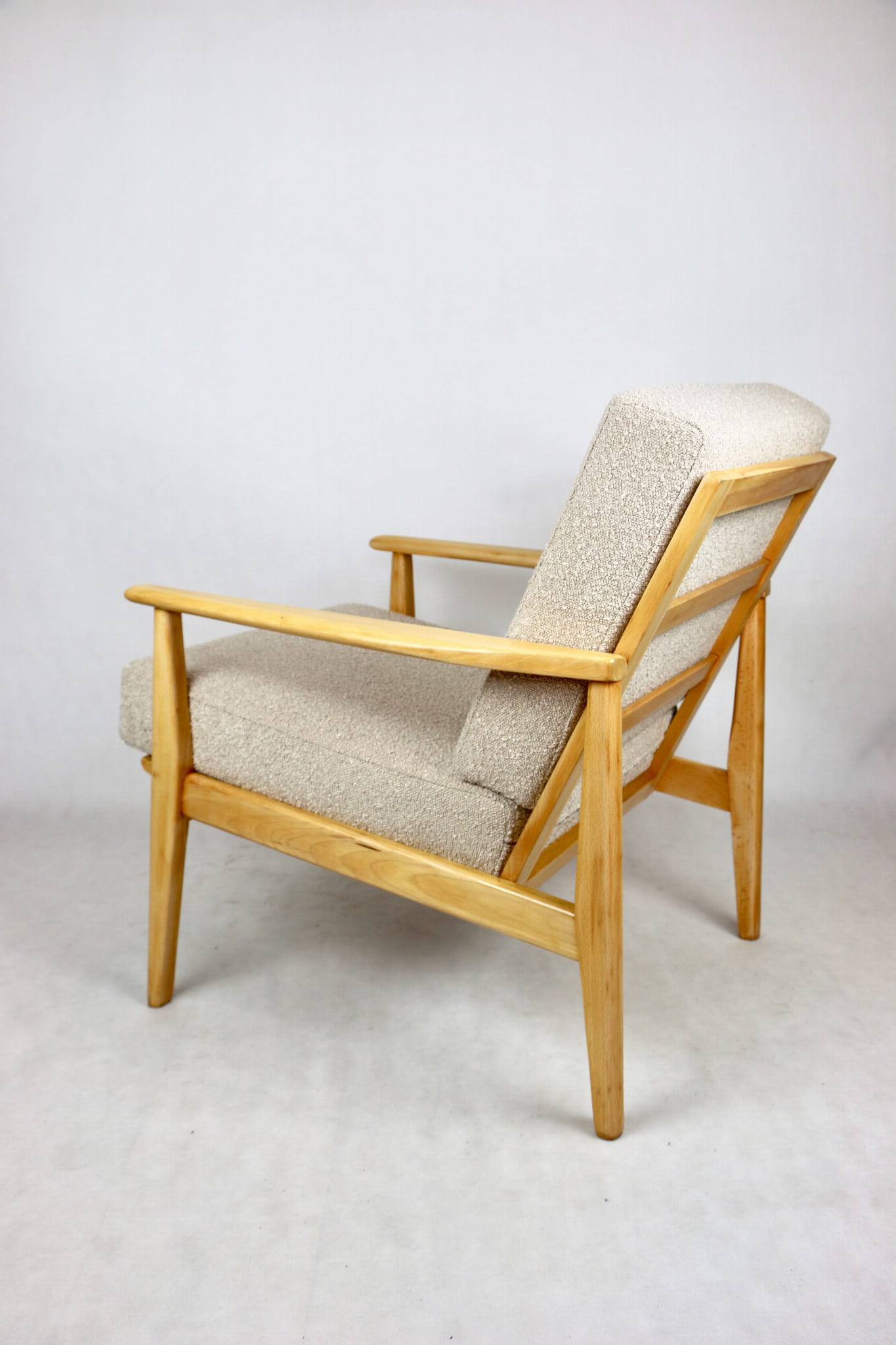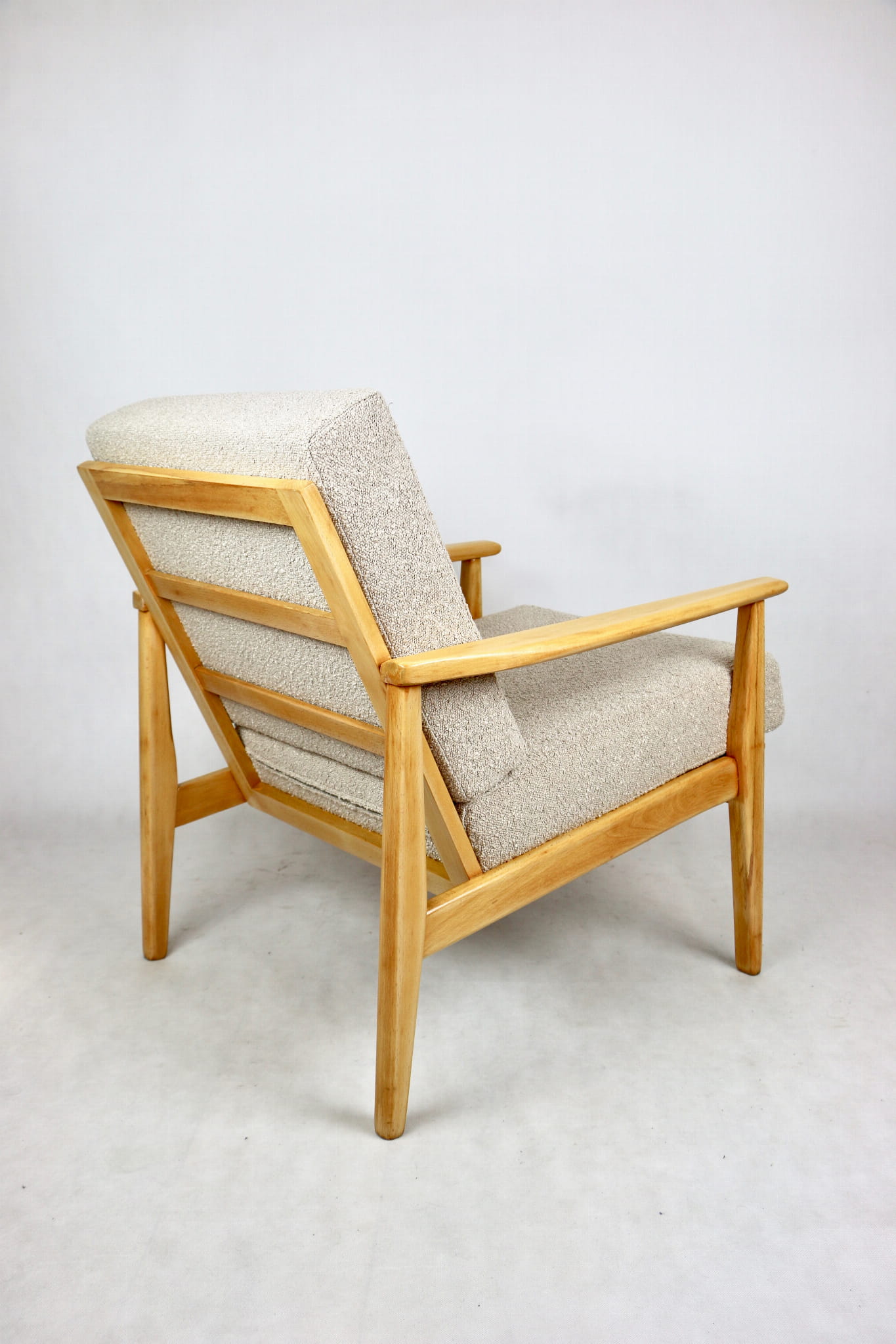 Fotel Vintage Duński, lata 70 beżowy Boucle - jasne drewno - dostępne 2 sztuki