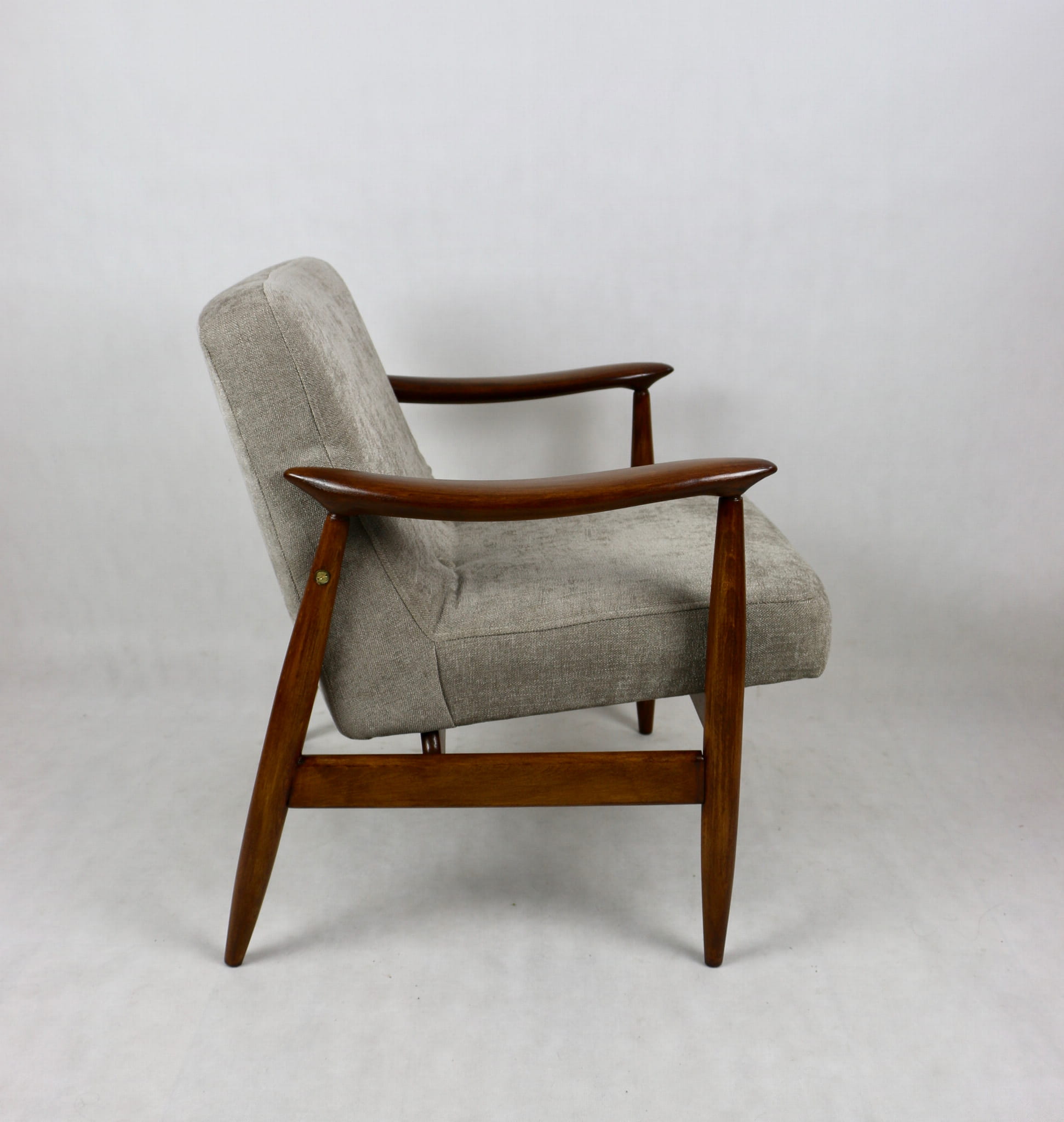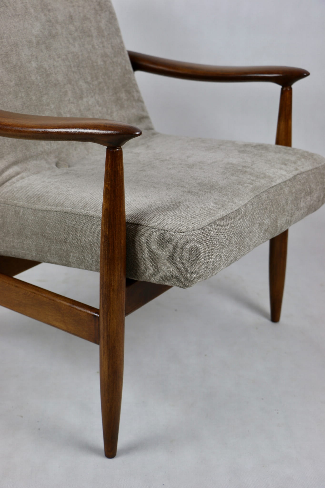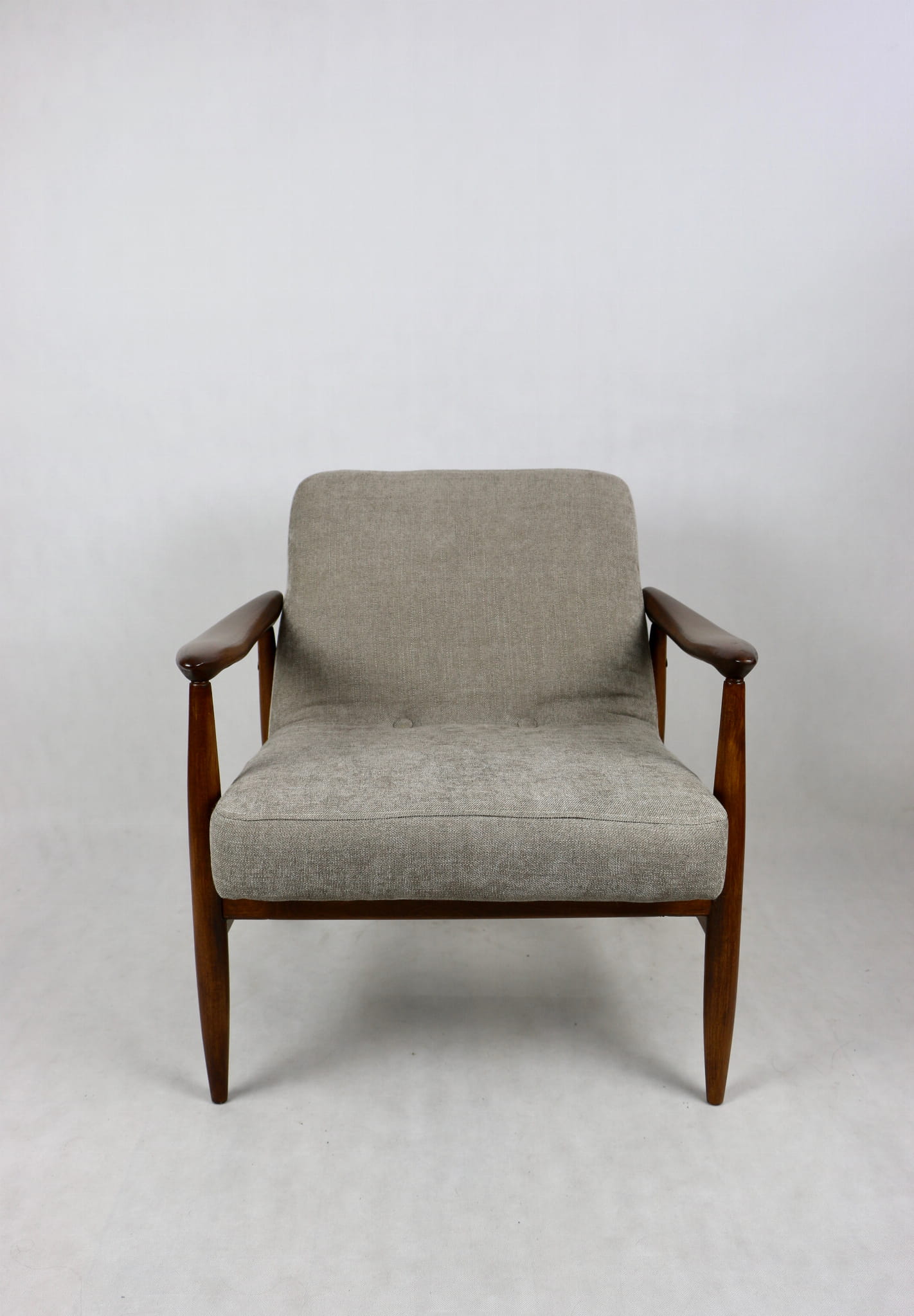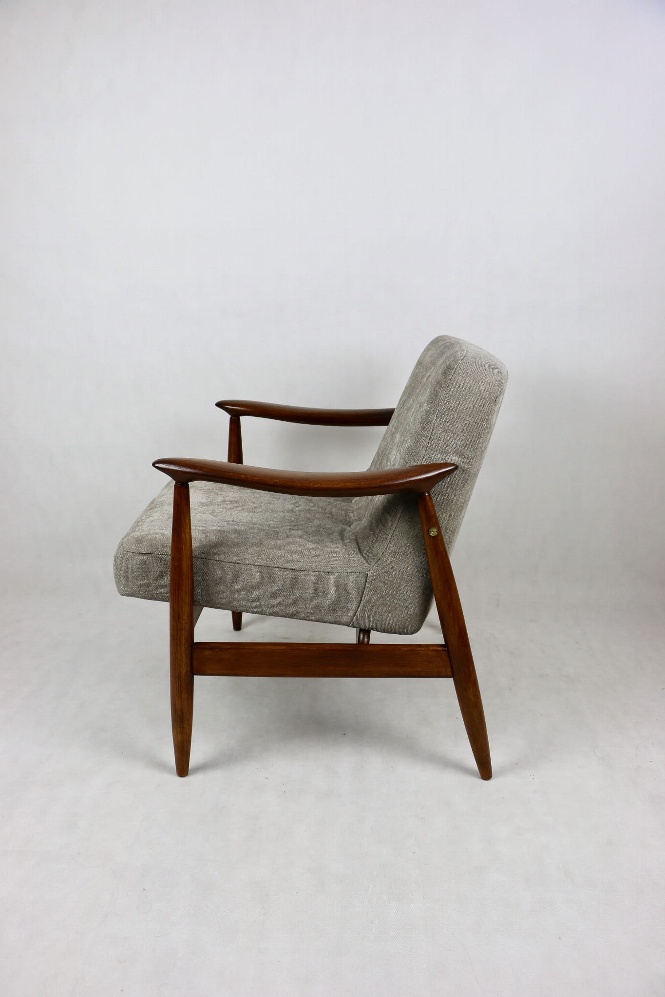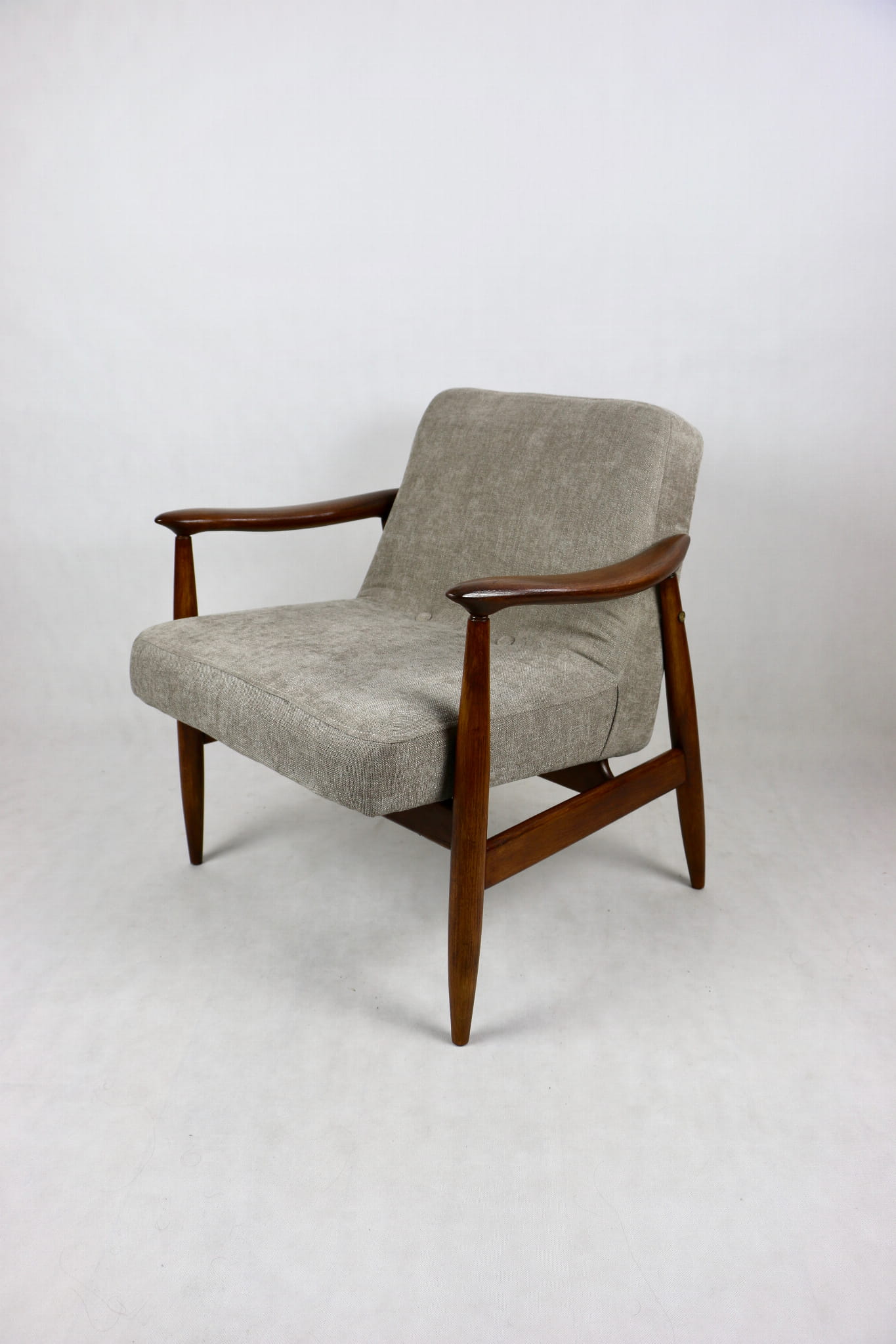 Odrestaurowany fotel GFM 300-202 Vintage projekt Józefa Kedziorka pokryty strukturalnym wysokiej jakości materiałem tapicerskim w kolorze brązowym z serii Danubio. Stelaż drewniany z podłokietnikami w ciemnej kolorystyce drewna. Bardzo wygodny model z 70 lat.