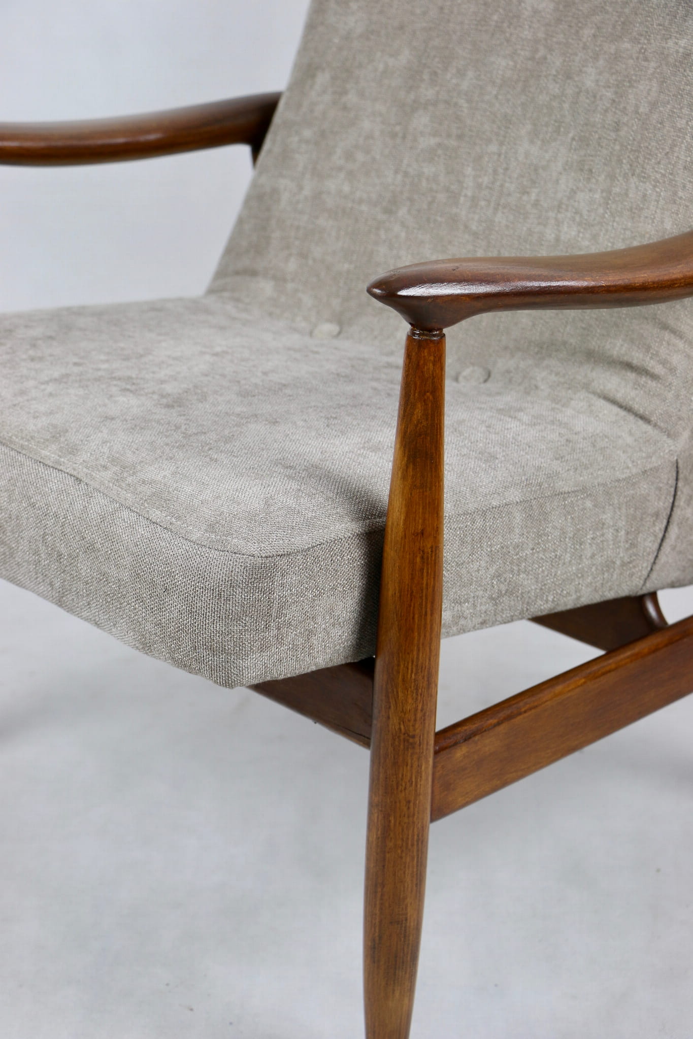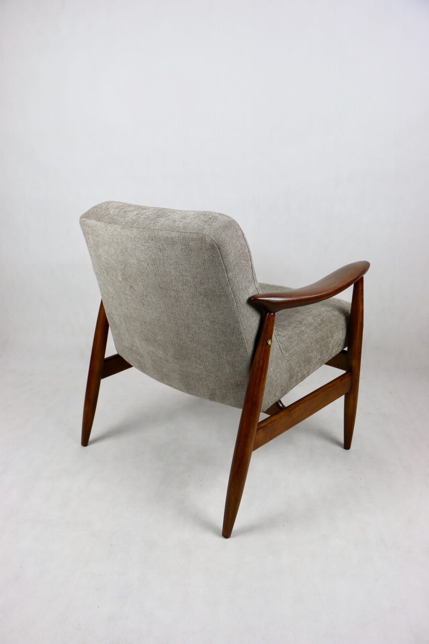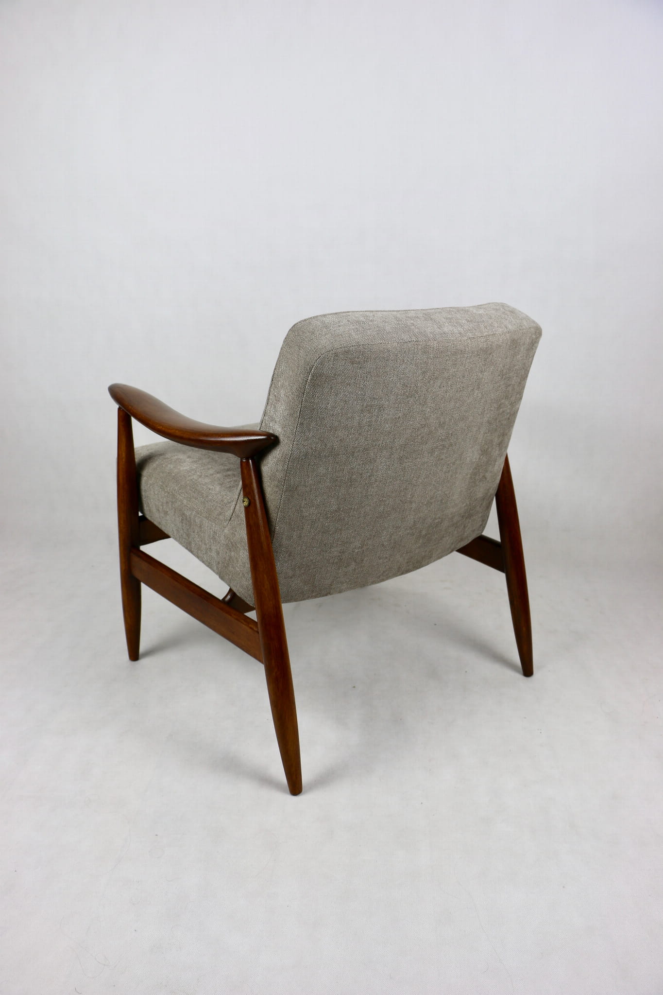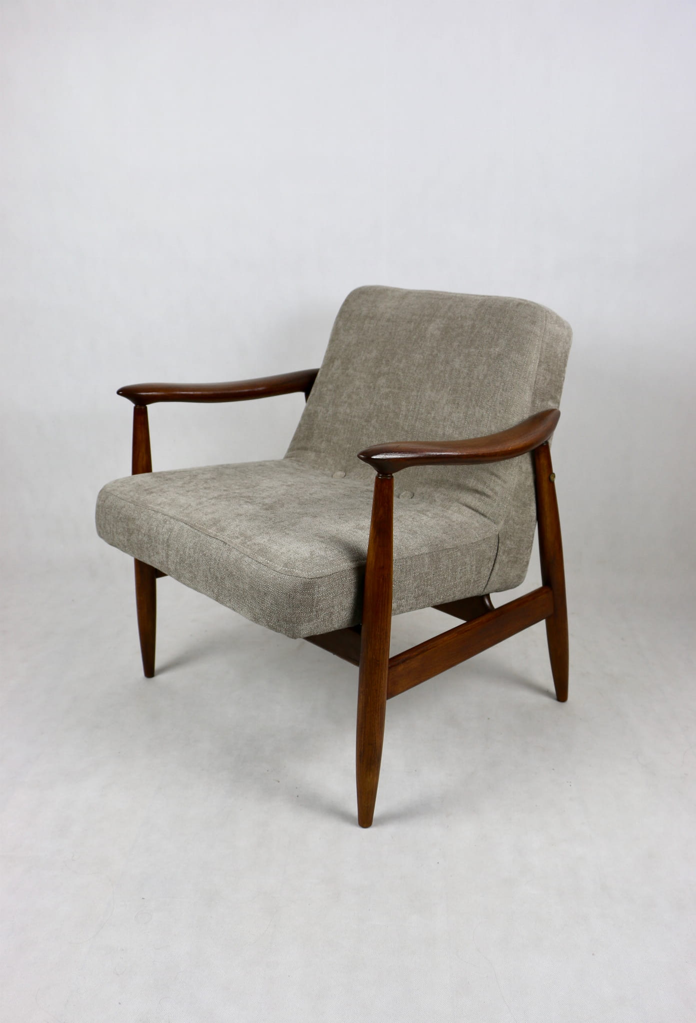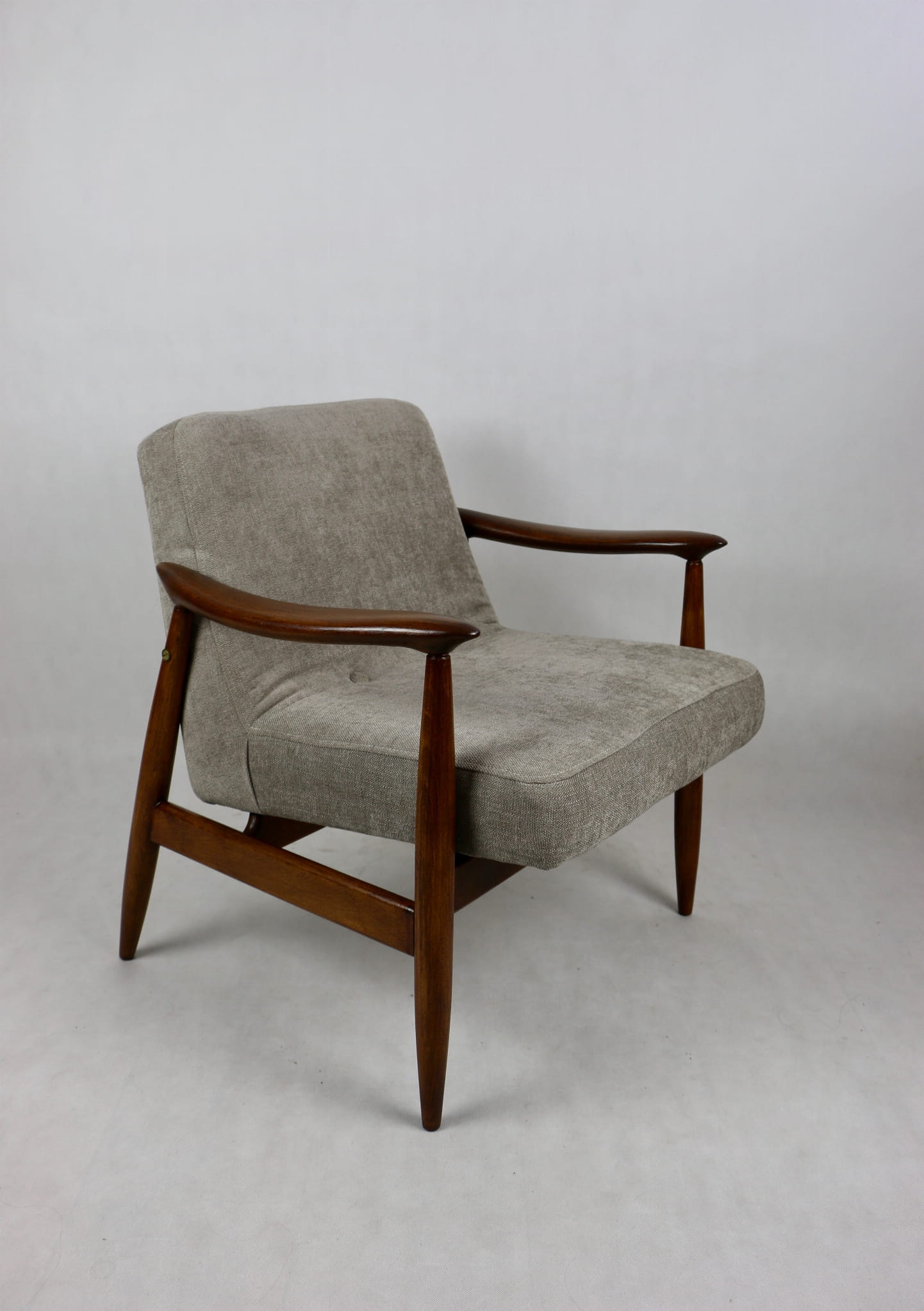 Odrestaurowany fotel GFM 300-202 Vintage projekt Józefa Kedziorka pokryty strukturalnym wysokiej jakości materiałem tapicerskim w kolorze brązowym z serii Danubio. Stelaż drewniany z podłokietnikami w ciemnej kolorystyce drewna. Bardzo wygodny model z 70 lat.