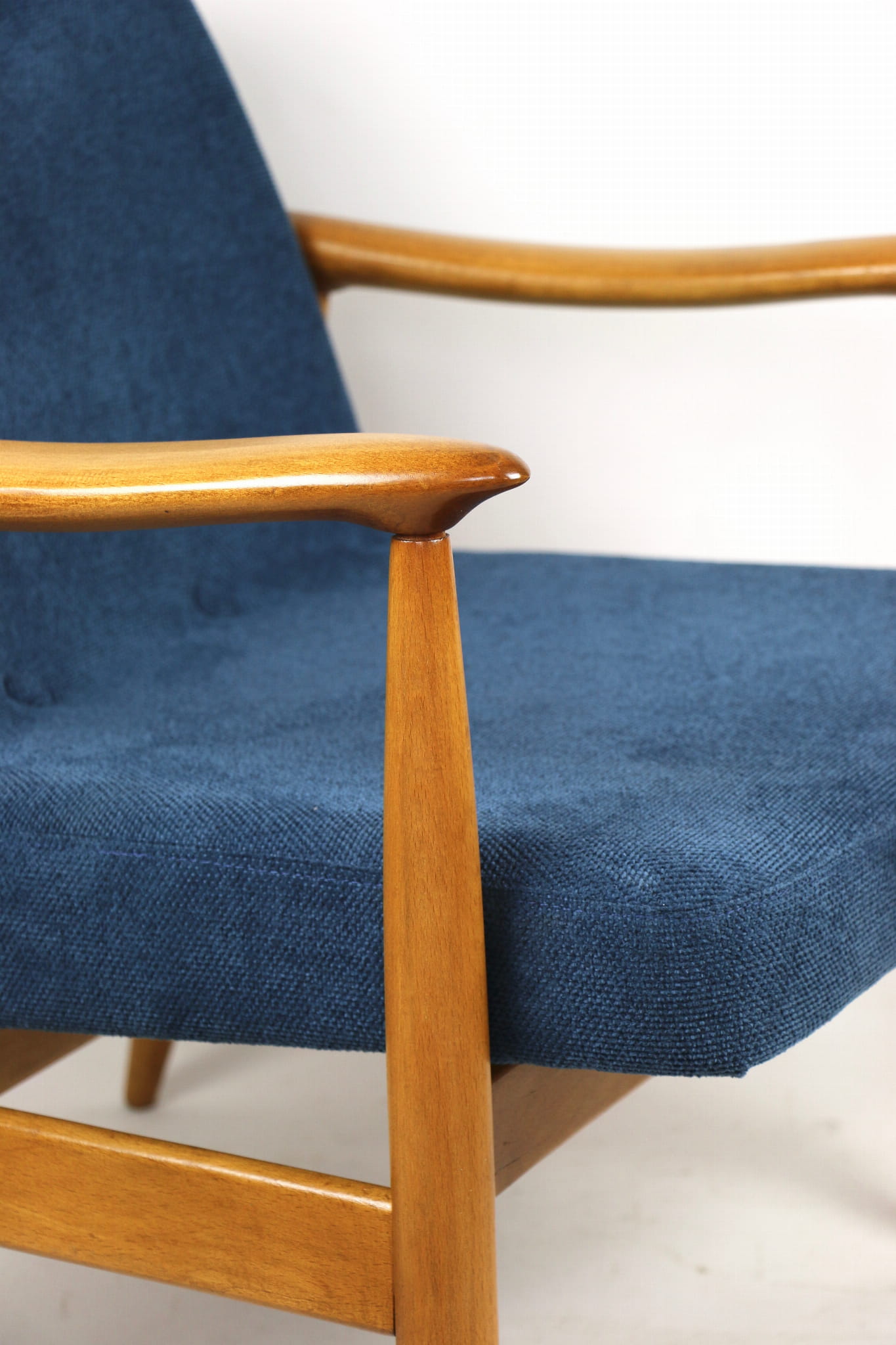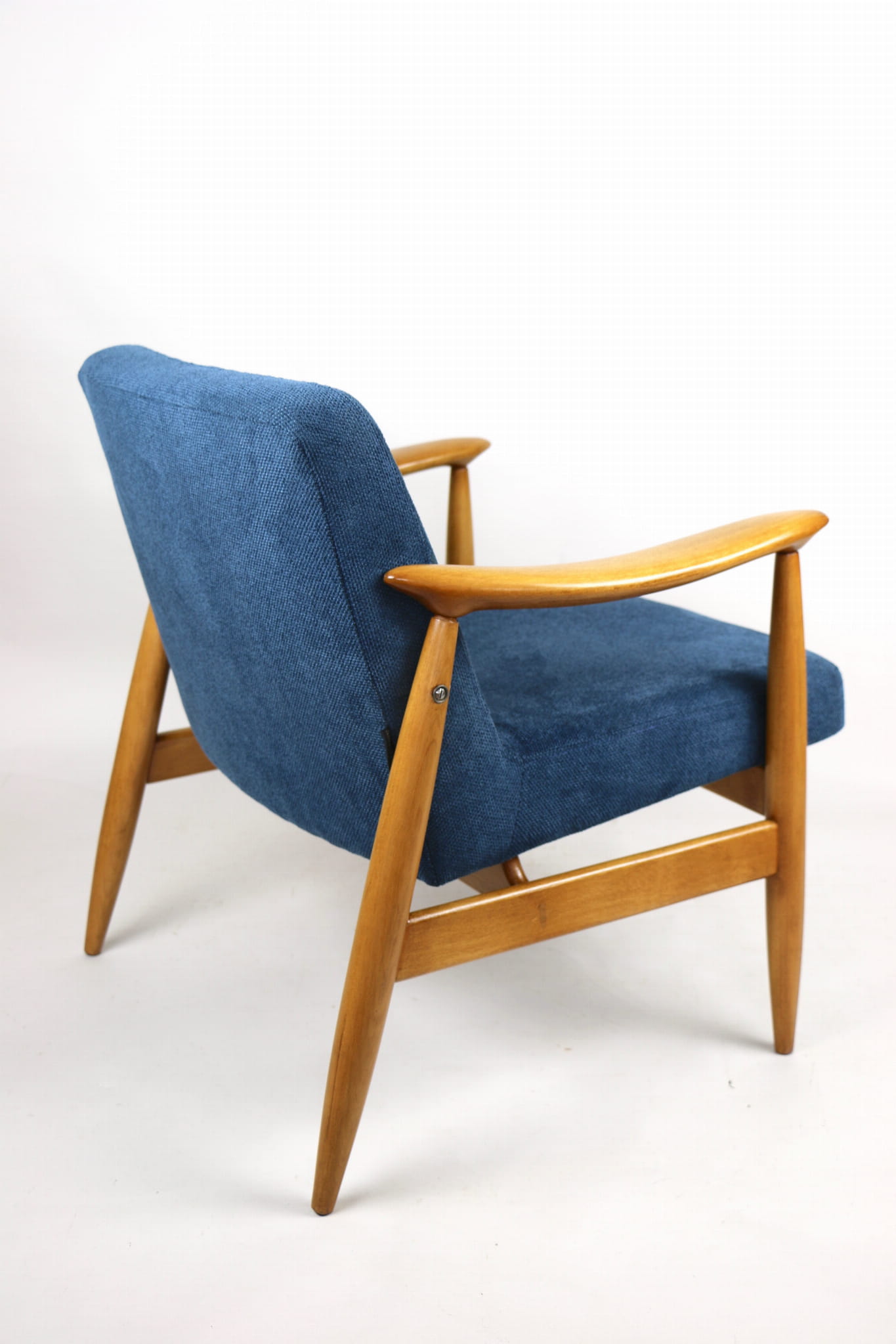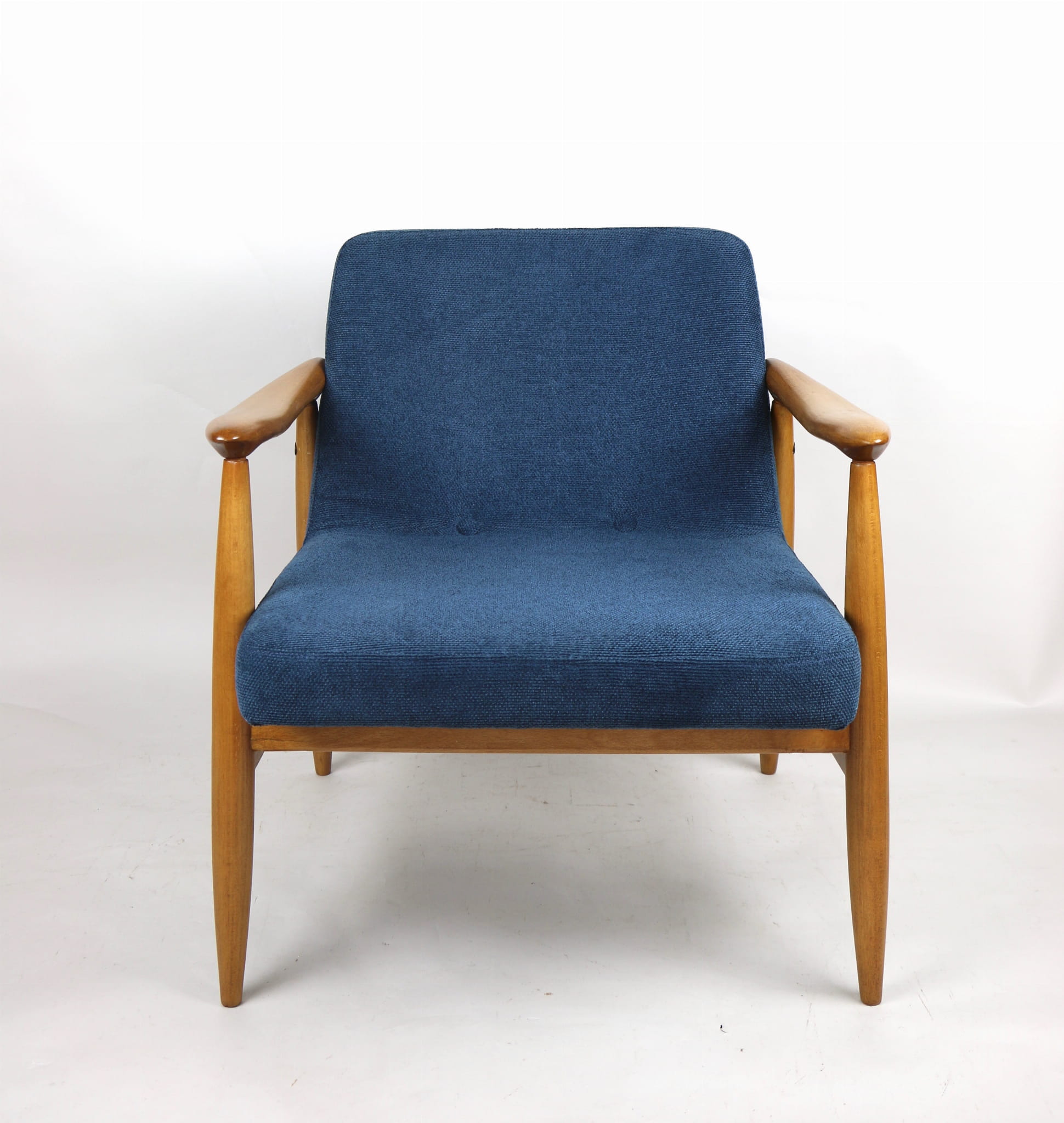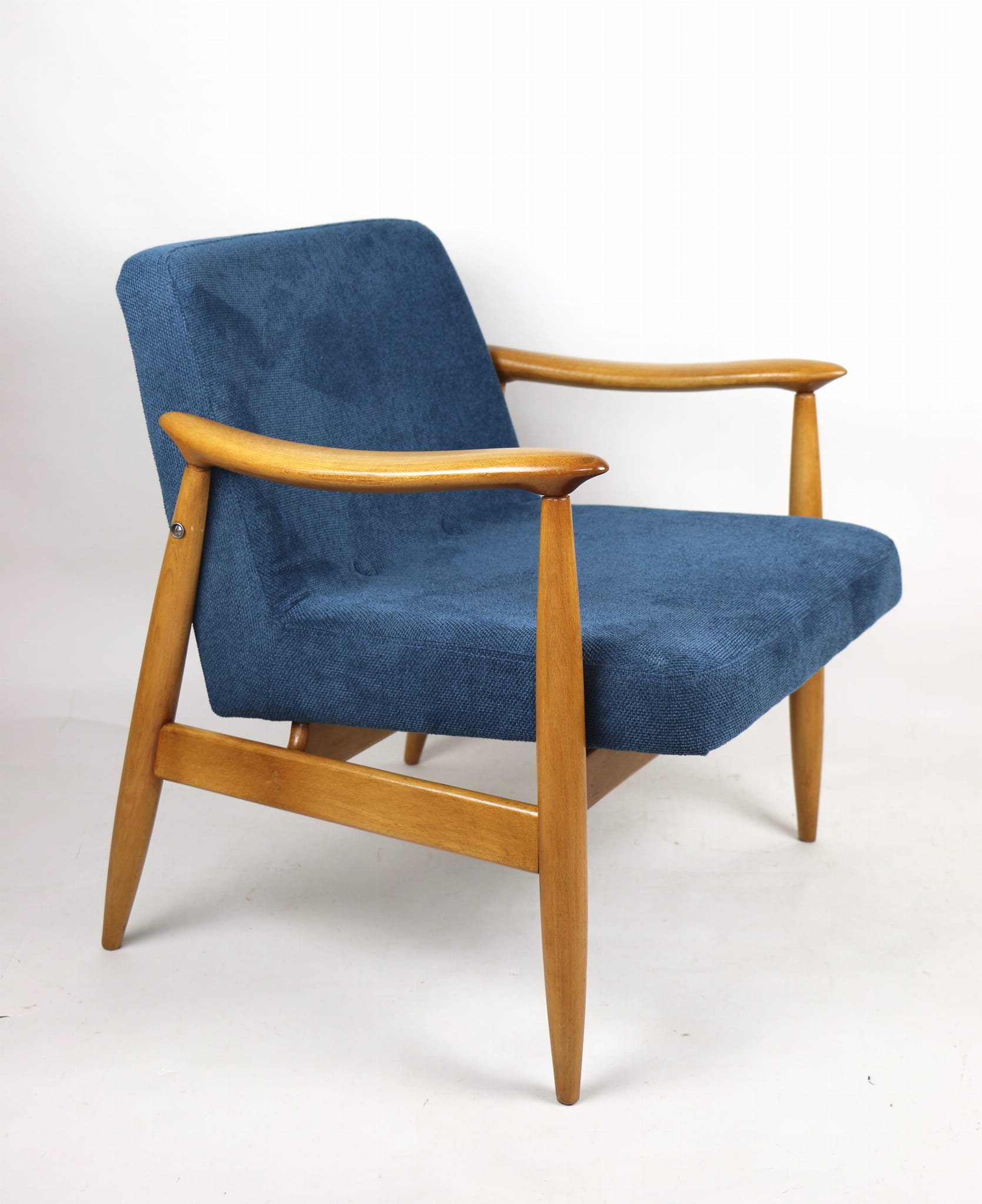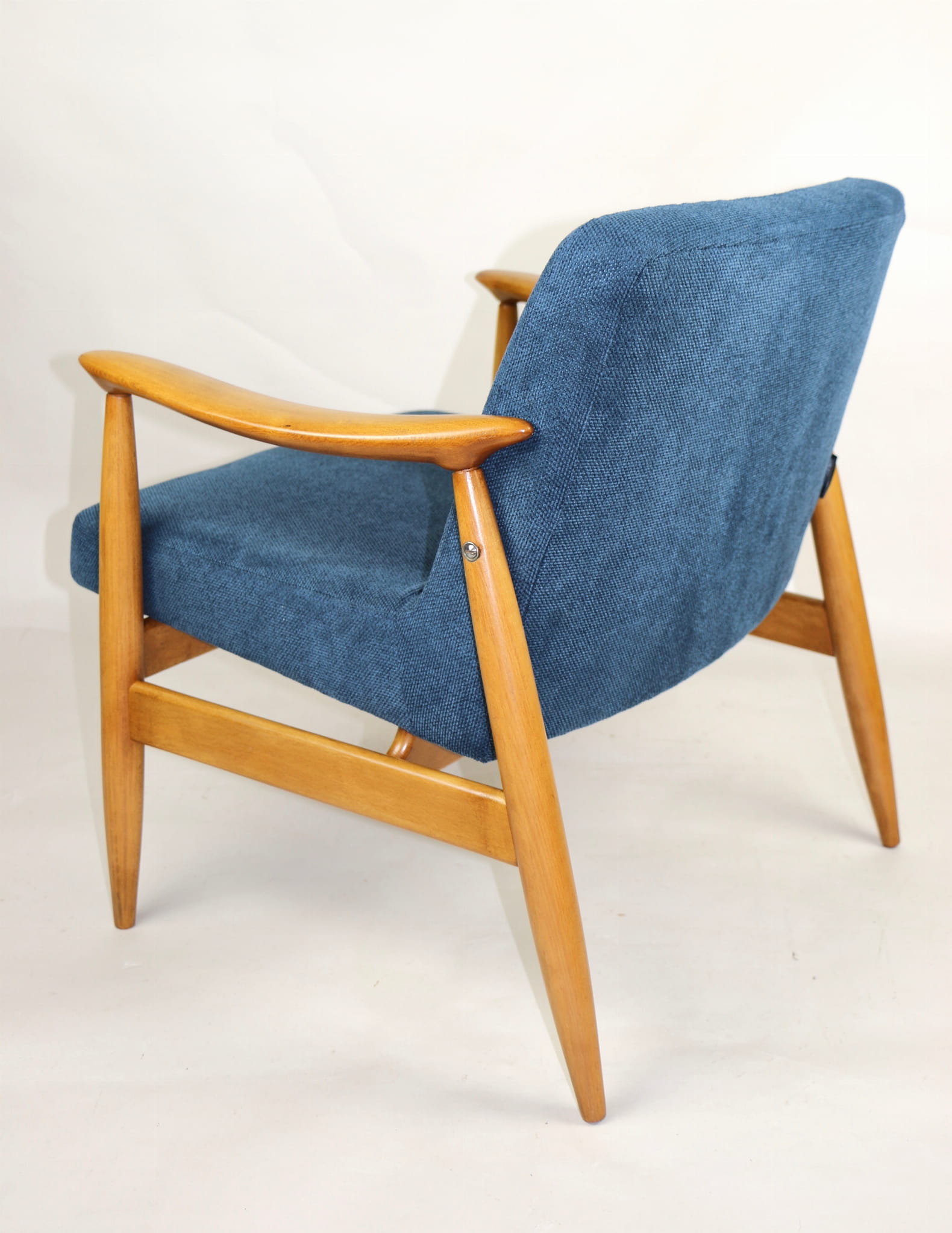 Odrestaurowany fotel GFM 300-202 Vintage projekt Józefa Kedziorka pokryty strukturalnym wysokiej jakości materiałem tapicerskim w granatowym kolorze. Stelaż drewniany z podłokietnikami w naturalnej kolorystyce drewna. Bardzo wygodny model z 70 lat.