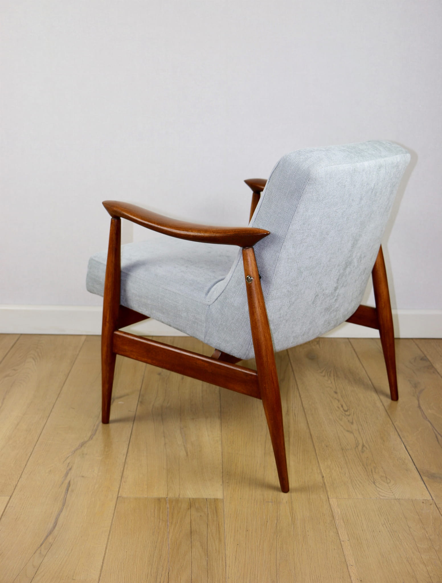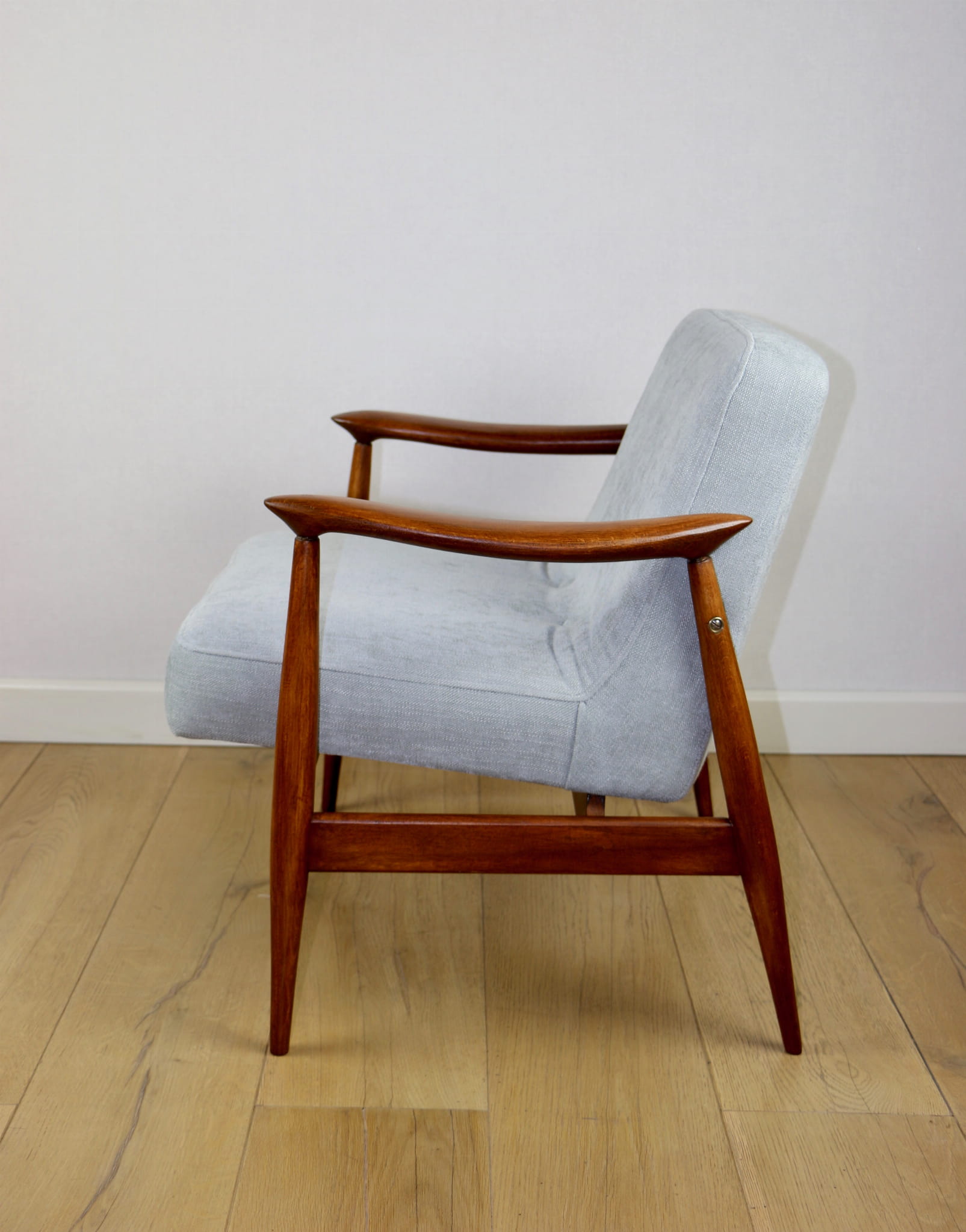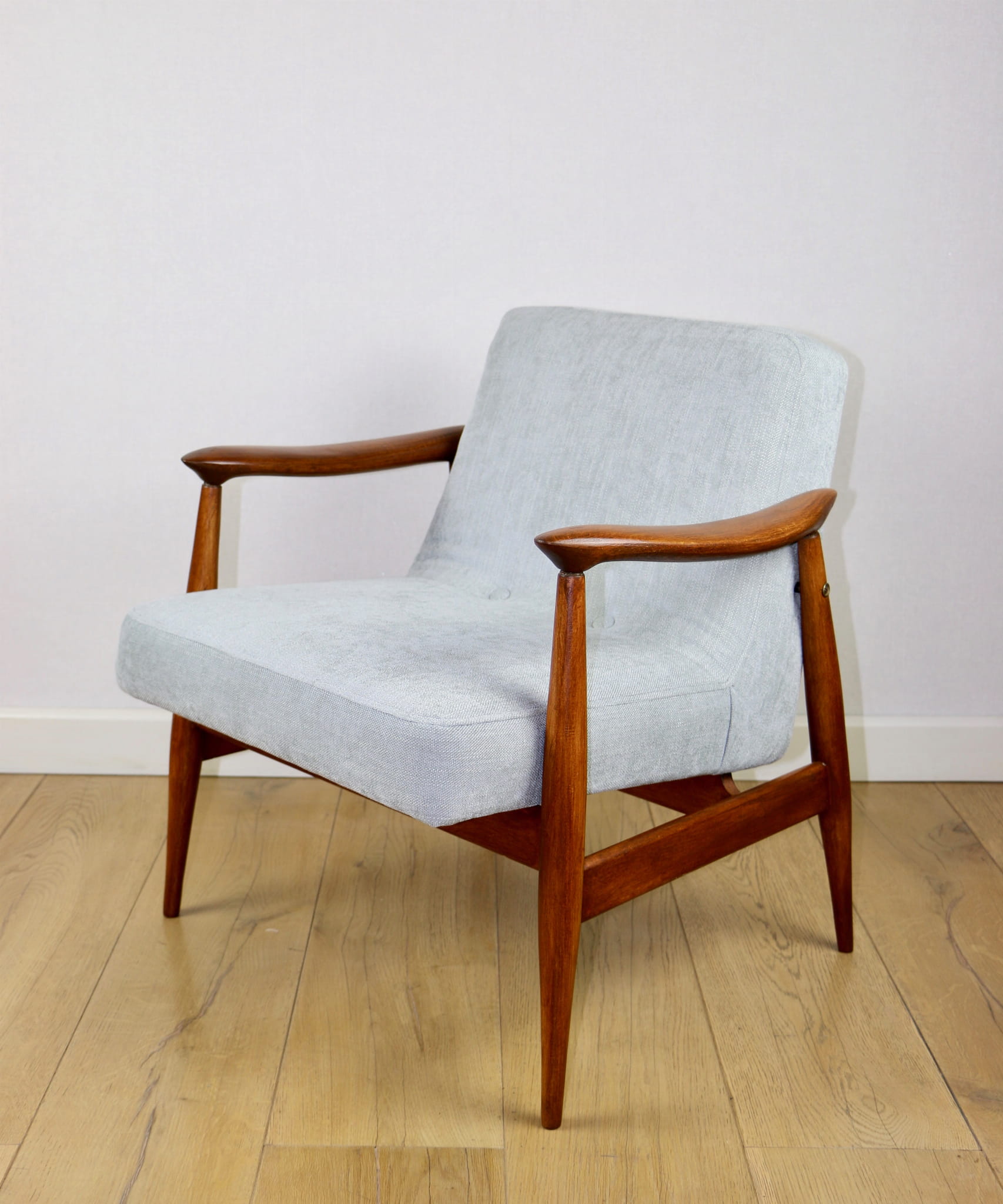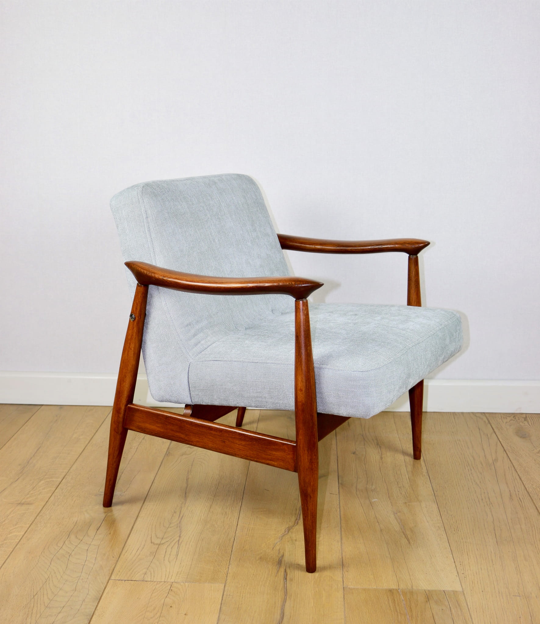 Odrestaurowany fotel GFM 300-202 Vintage projekt Józefa Kedziorka pokryty strukturalnym wysokiej jakości materiałem tapicerskim w kolorze niebieskim z serii Danubio. Stelaż drewniany z podłokietnikami w ciemnej kolorystyce drewna. Bardzo wygodny model z 70 lat.