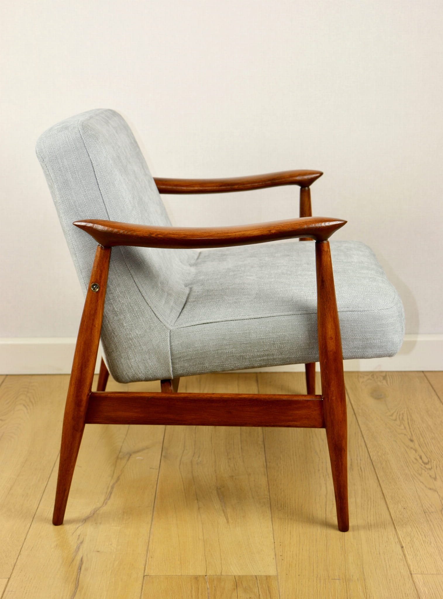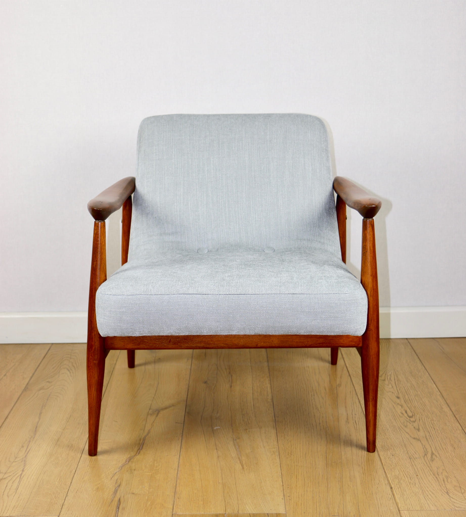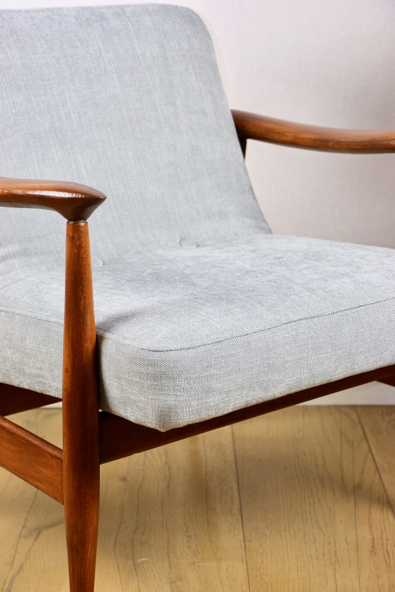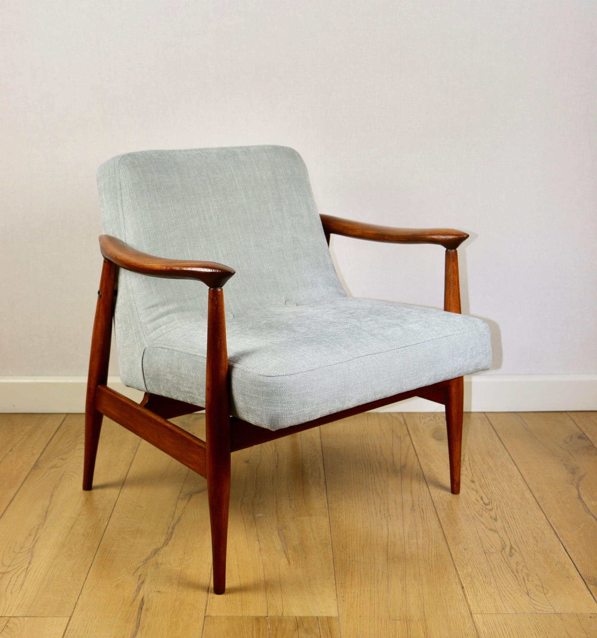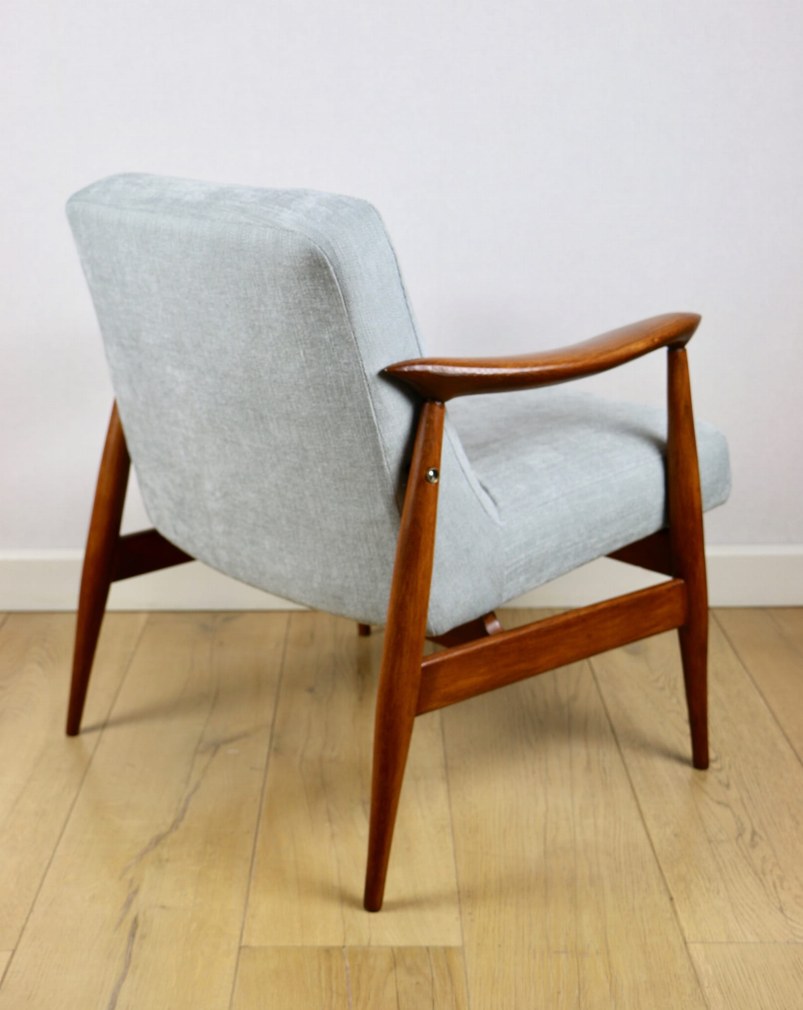 Odrestaurowany fotel GFM 300-202 Vintage projekt Józefa Kedziorka pokryty strukturalnym wysokiej jakości materiałem tapicerskim w kolorze niebieskim z serii Danubio. Stelaż drewniany z podłokietnikami w ciemnej kolorystyce drewna. Bardzo wygodny model z 70 lat.