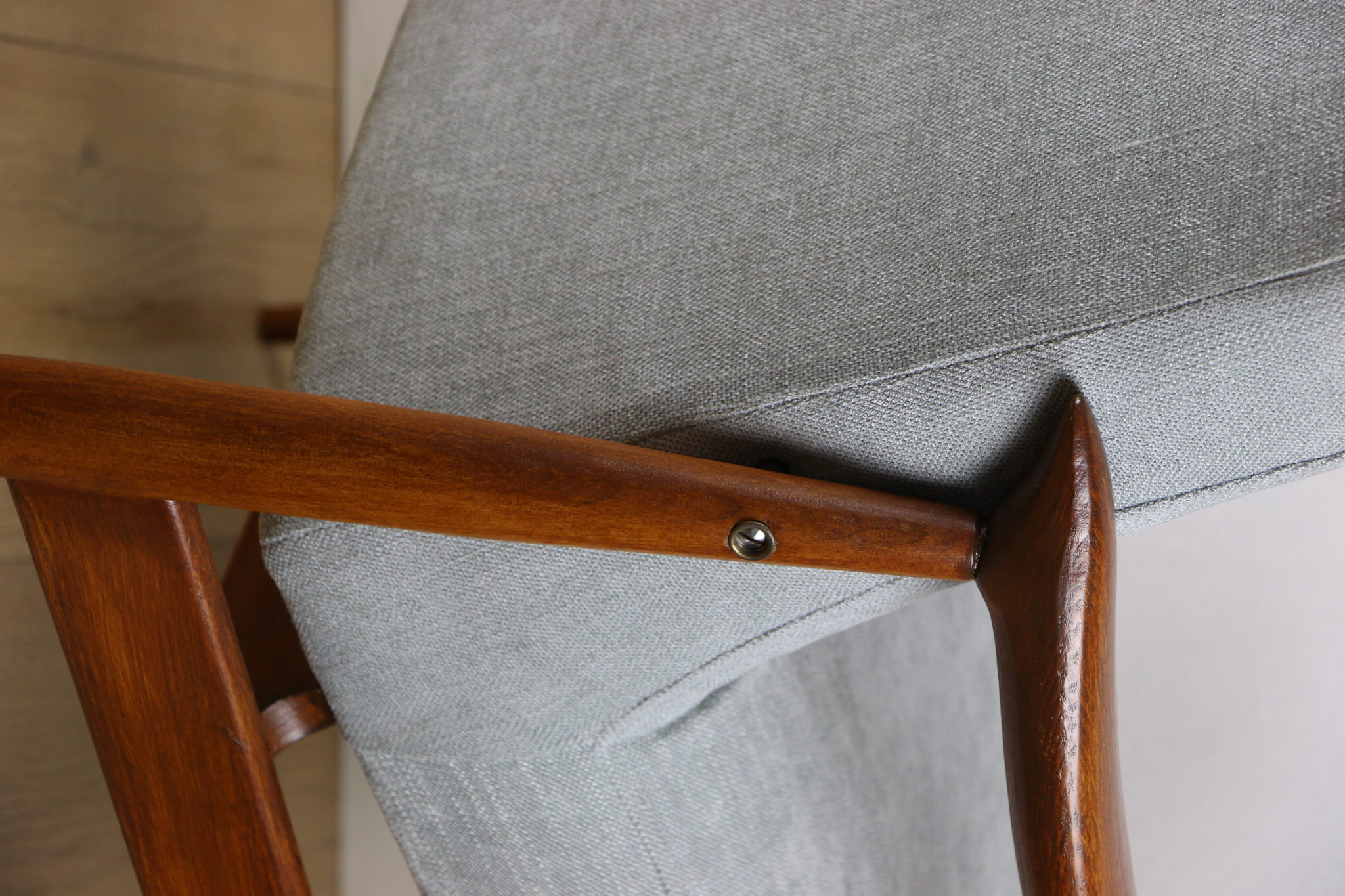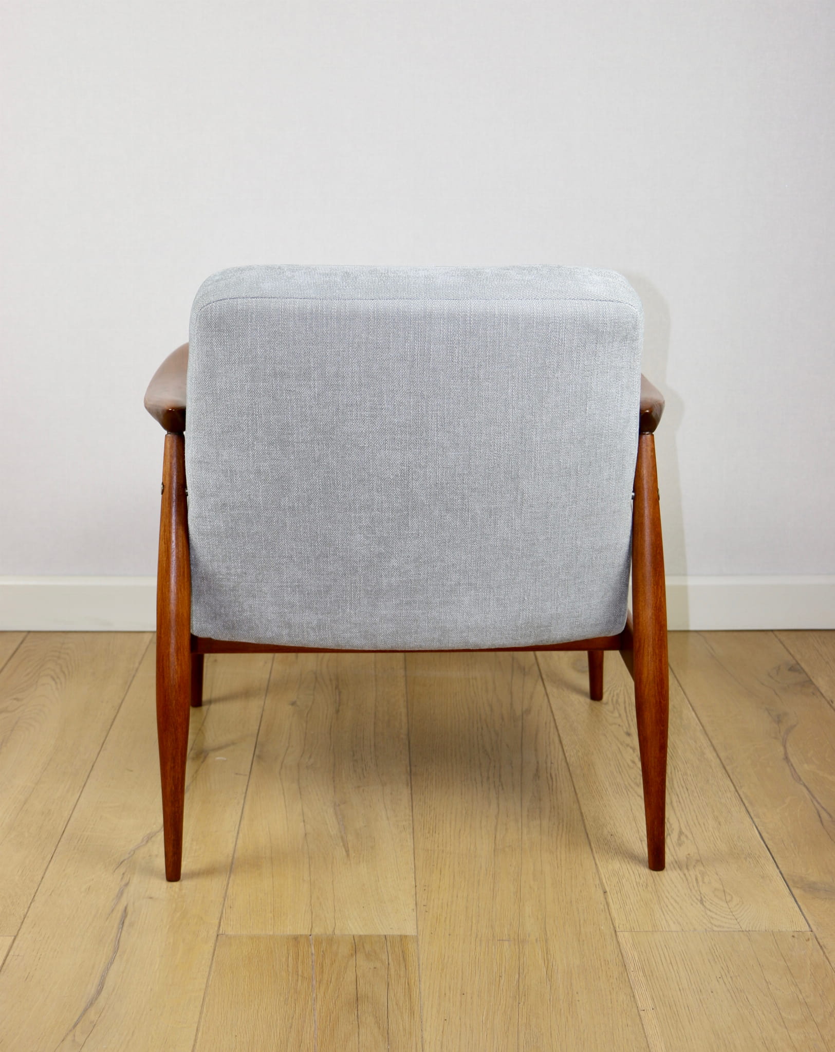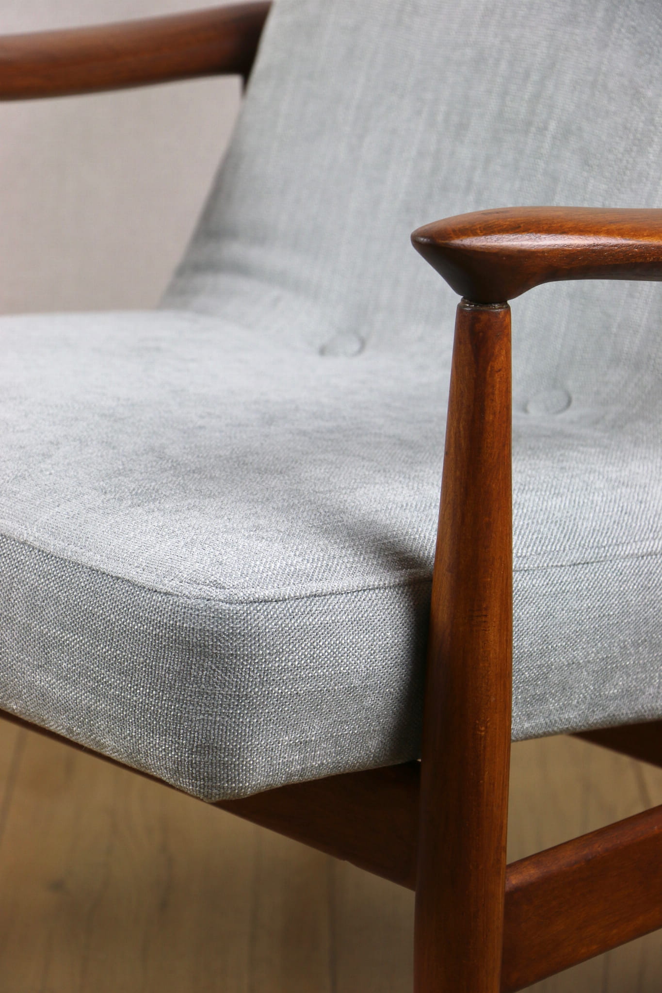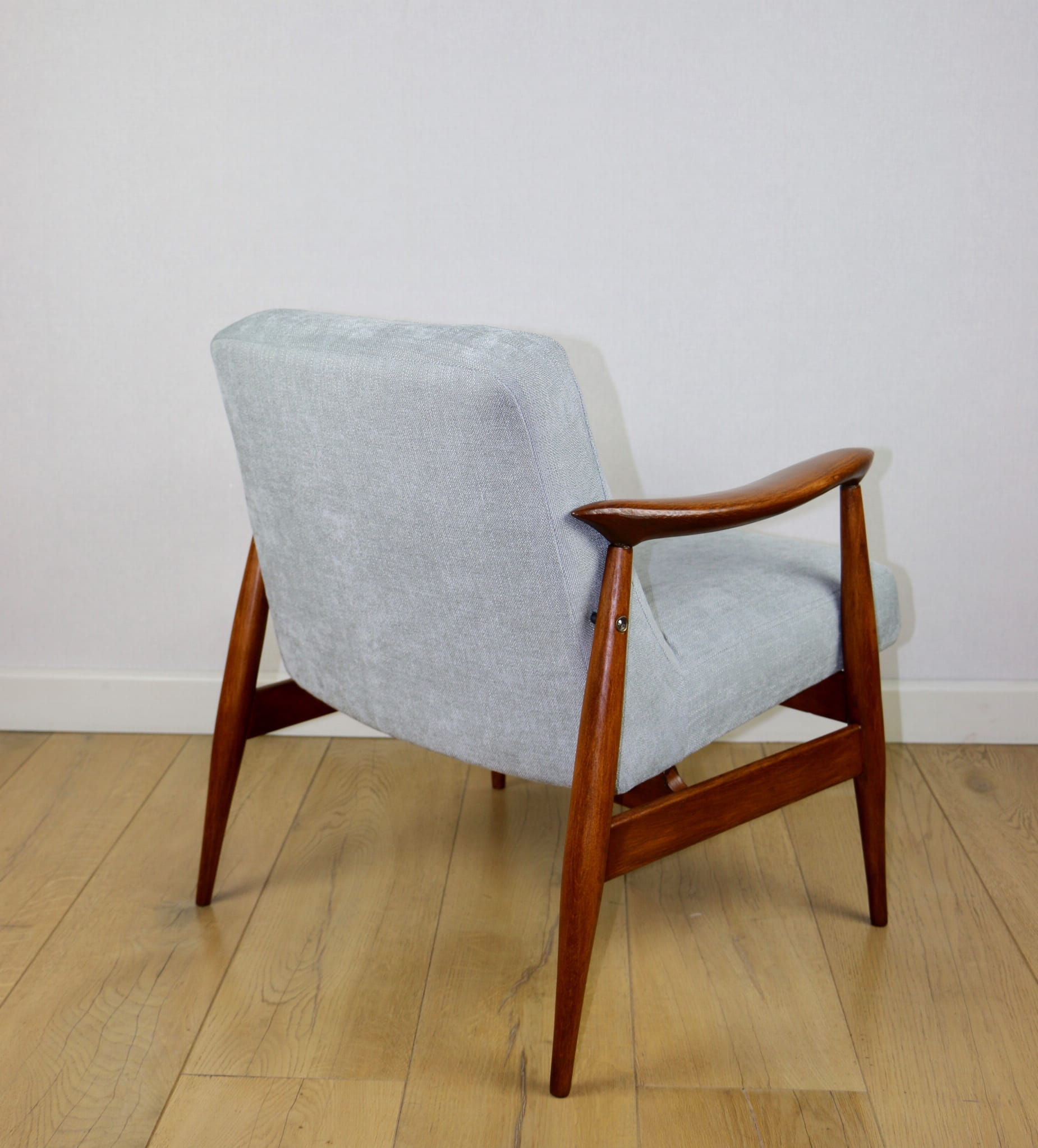 Odrestaurowany fotel GFM 300-202 Vintage projekt Józefa Kedziorka pokryty strukturalnym wysokiej jakości materiałem tapicerskim w kolorze niebieskim z serii Danubio. Stelaż drewniany z podłokietnikami w ciemnej kolorystyce drewna. Bardzo wygodny model z 70 lat.