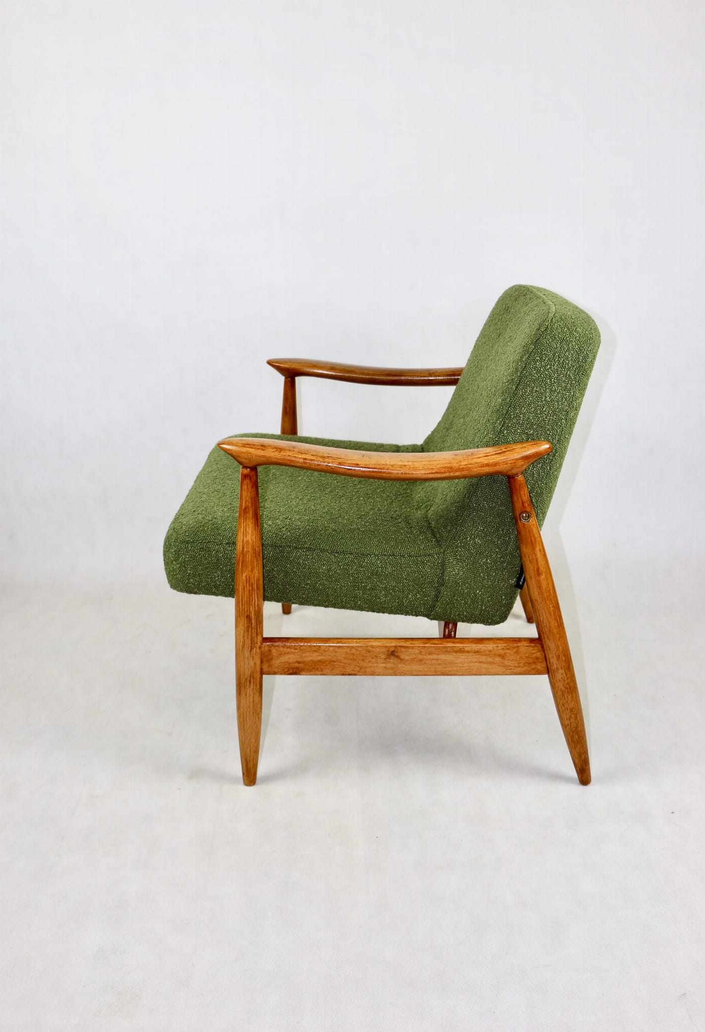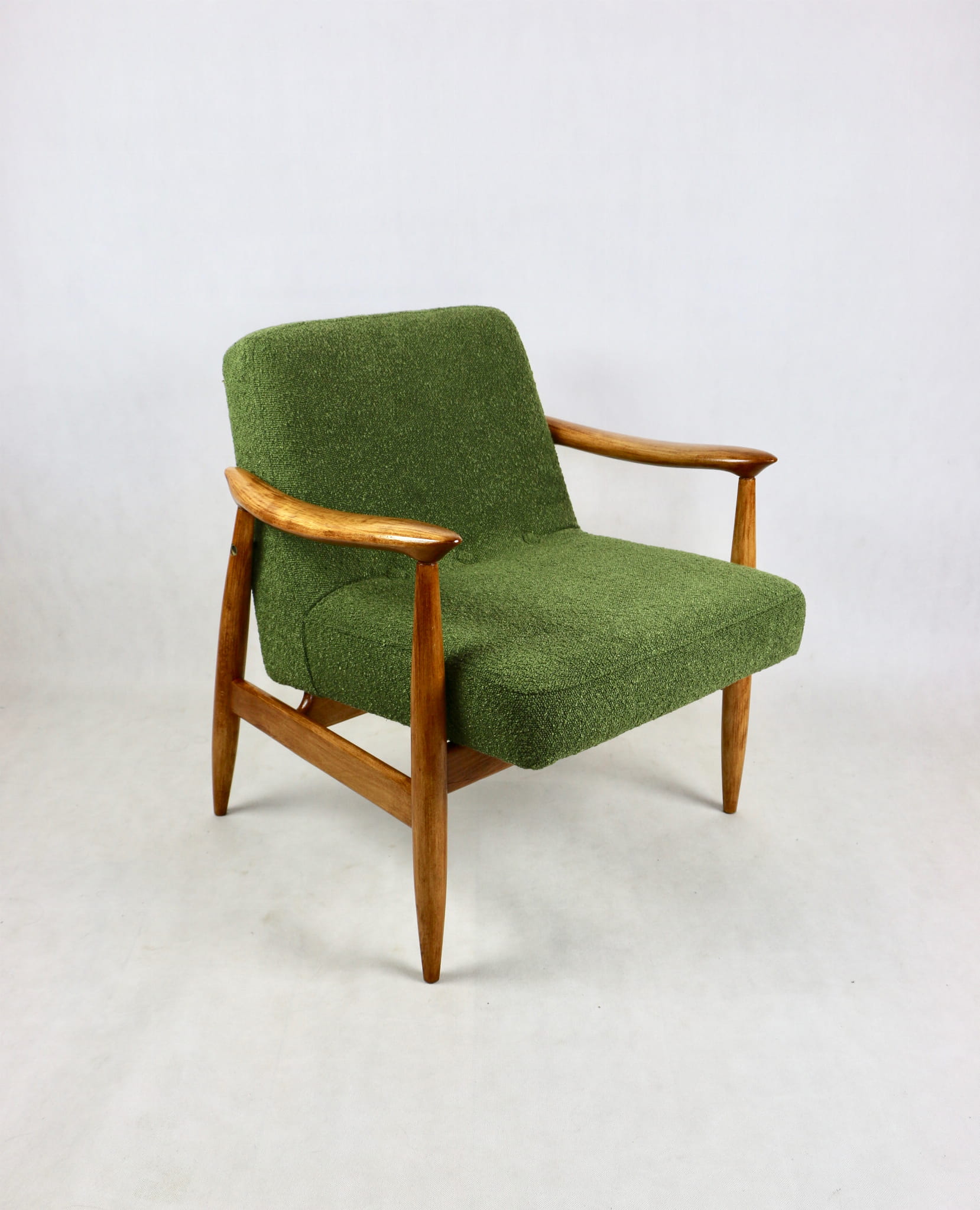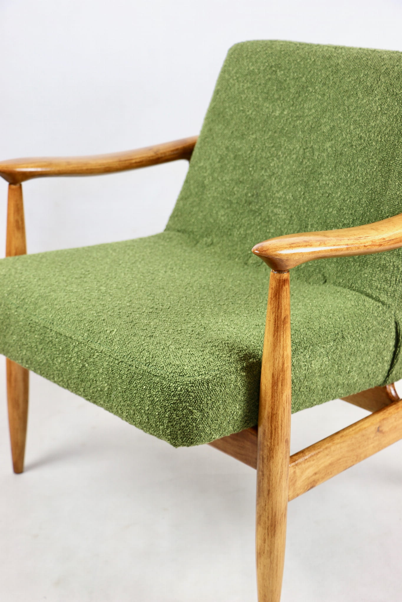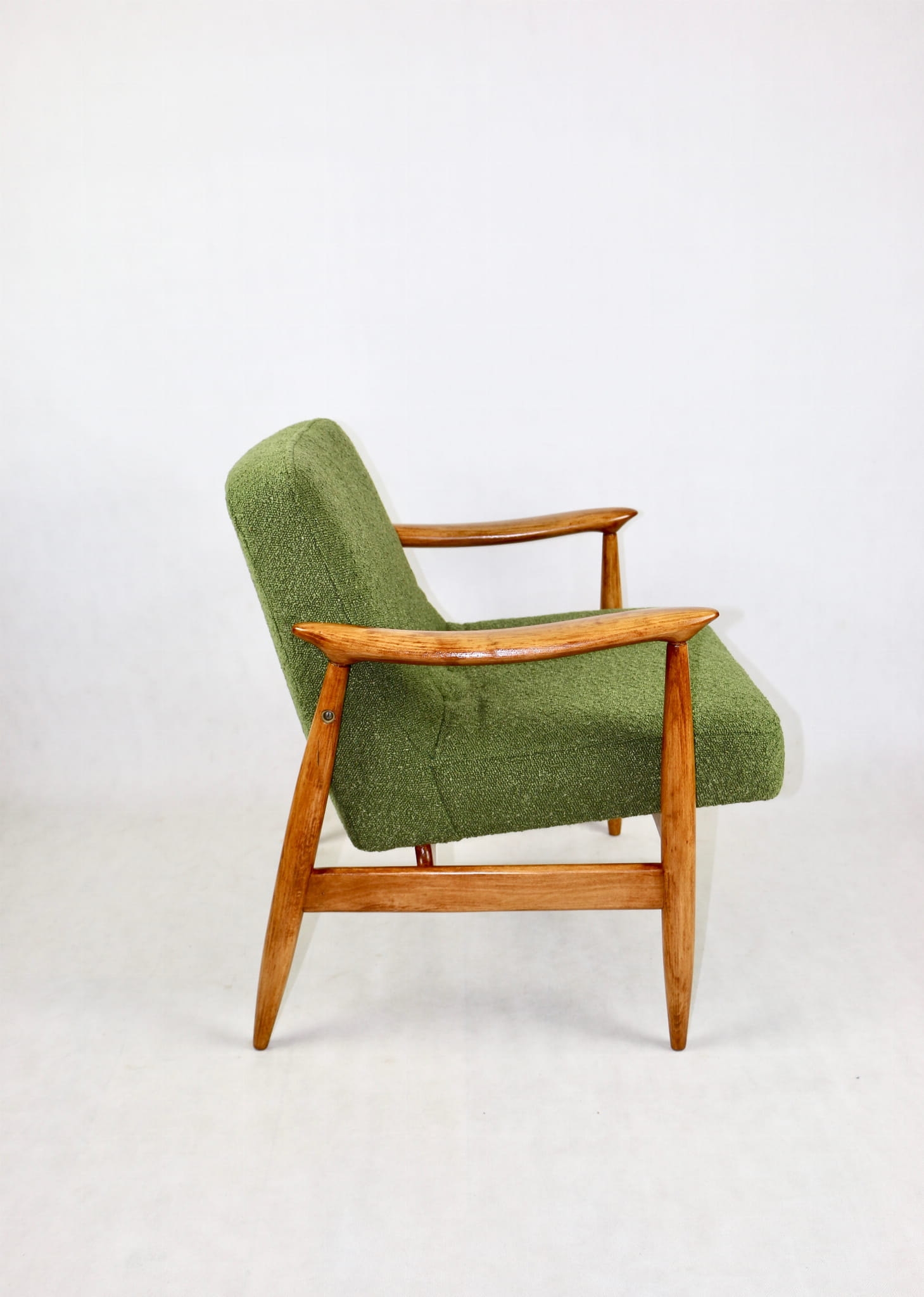 Odrestaurowany fotel GFM 300-202 Vintage projekt Józefa Kedziorka pokryty strukturalnym wysokiej jakości materiałem tapicerskim w kolorze zielonym z serii Boucle. Stelaż drewniany z podłokietnikami w jasnej kolorystyce drewna. Bardzo wygodny model z 70 lat.
