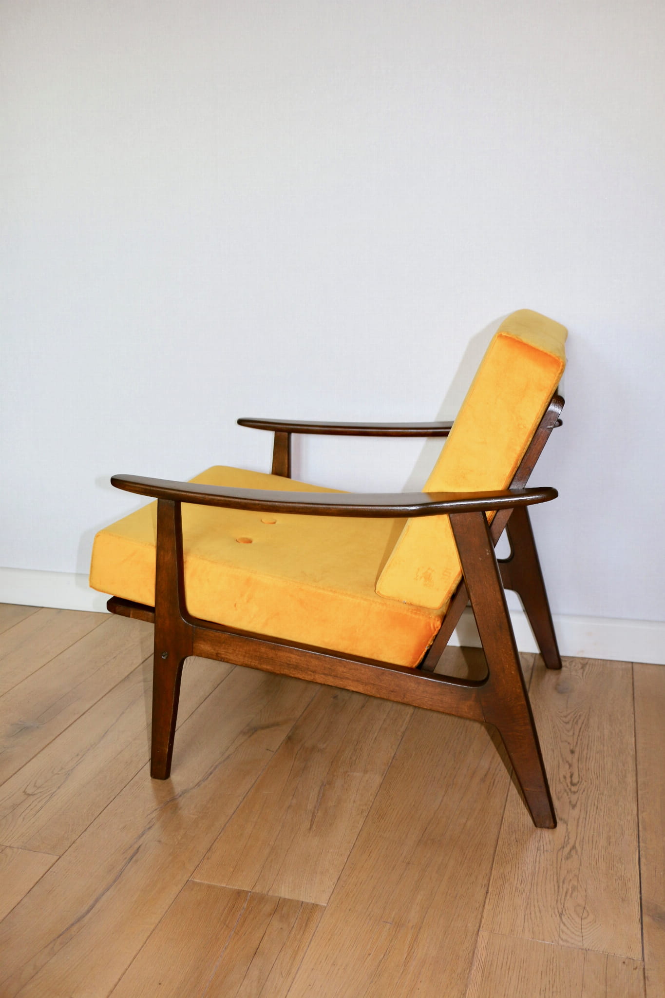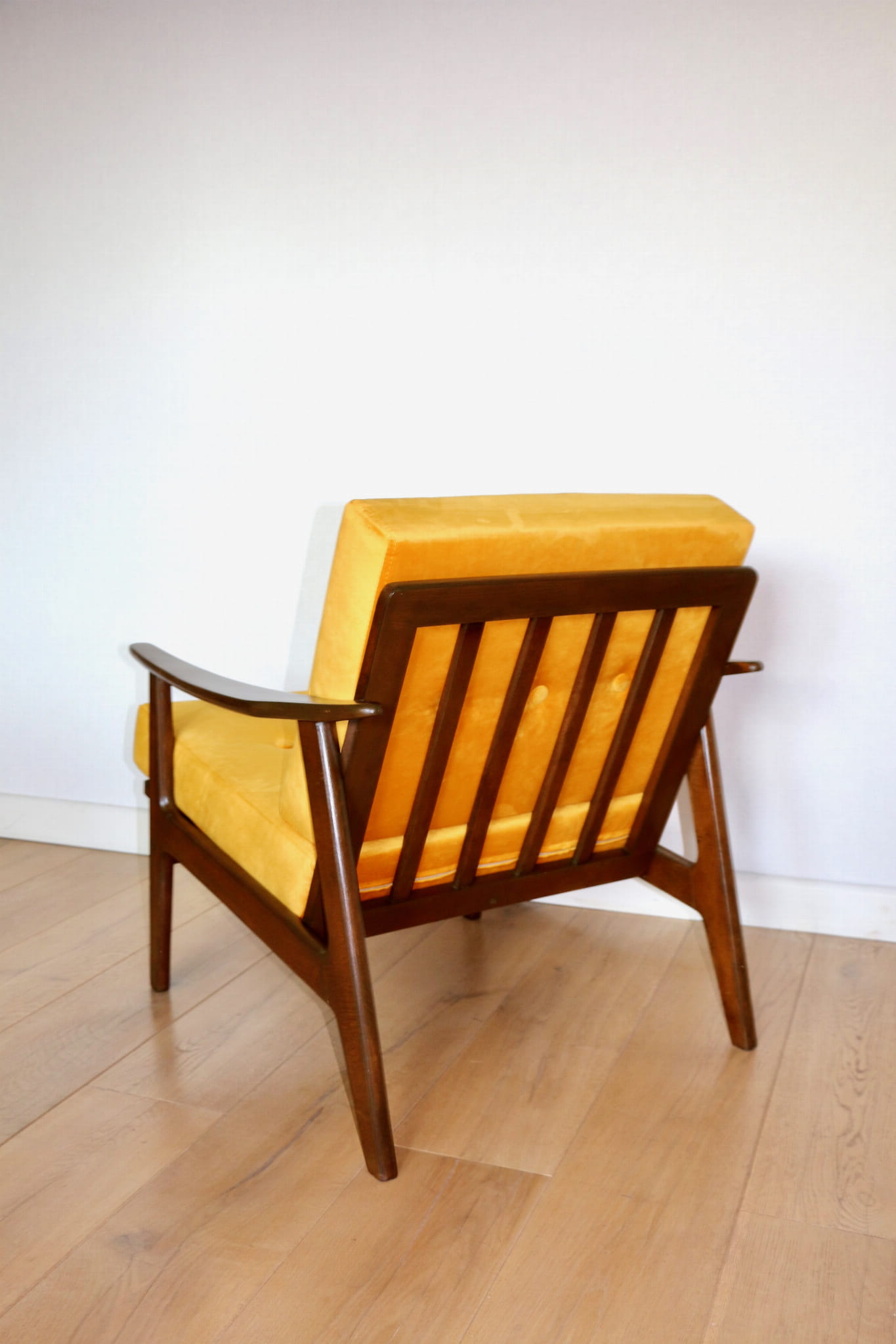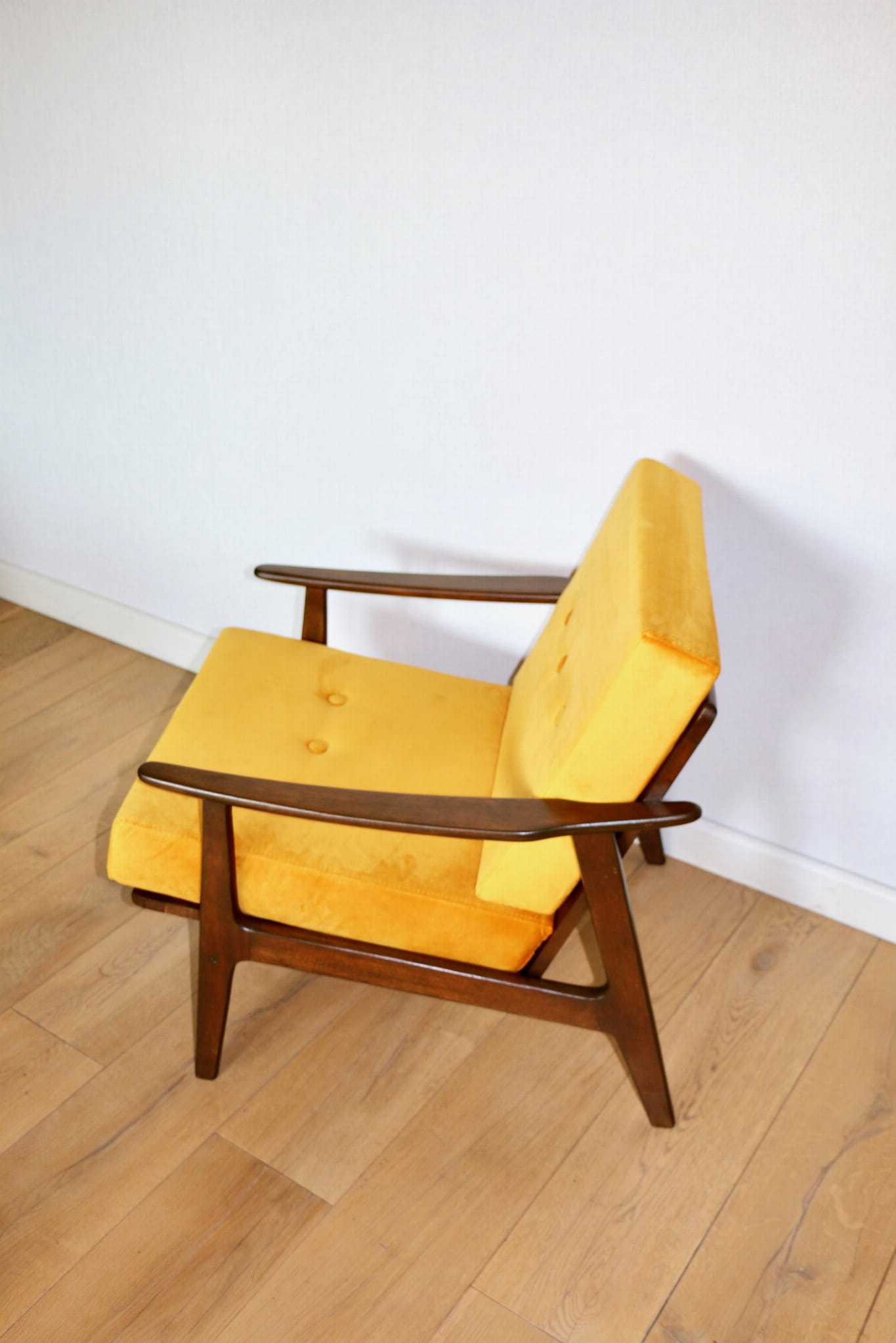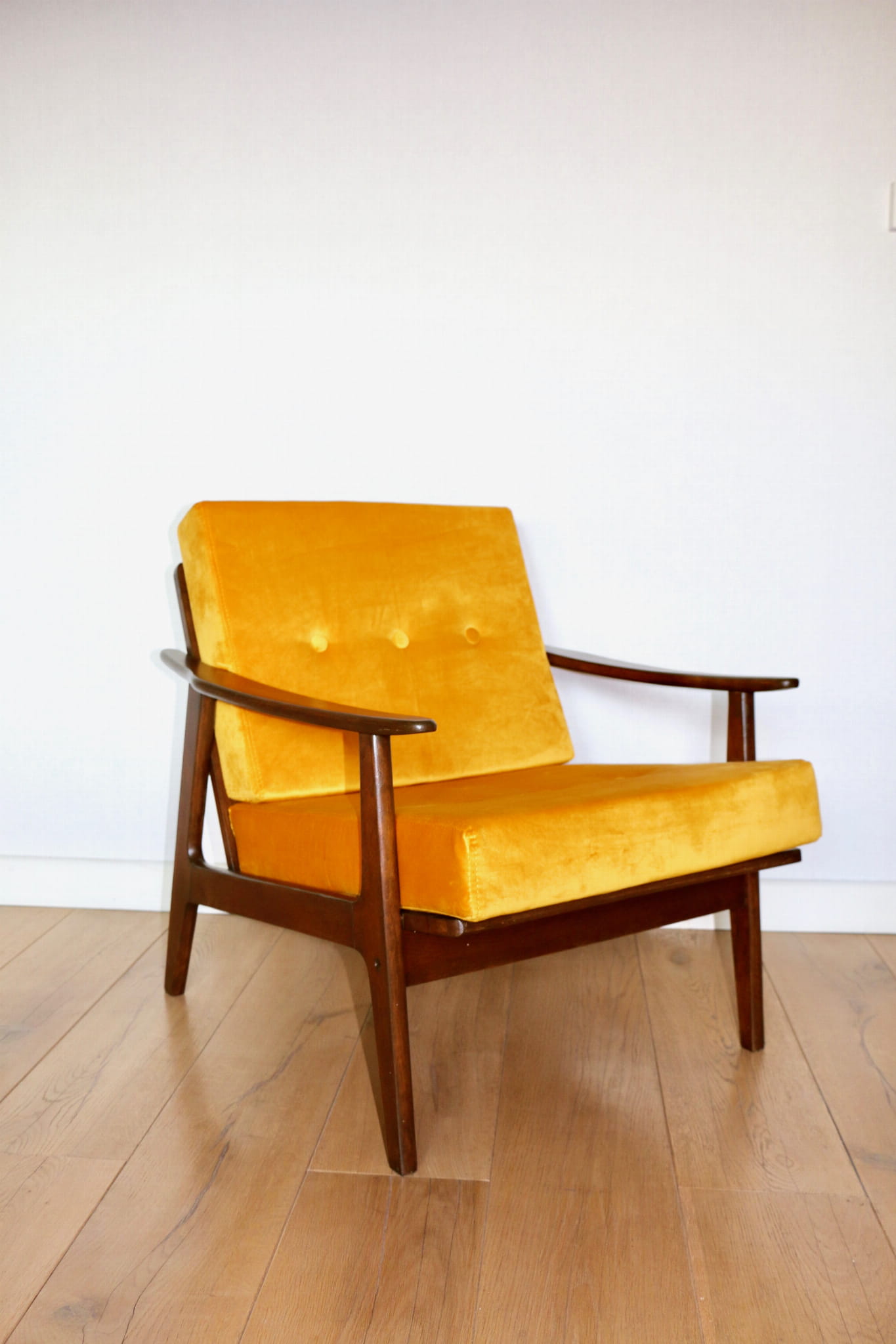 Jugosławiański fotel vintage na szczebelkach ze zdejmowanymi poduszkami z lat 80 tych całkowicie odrestaurowany. Nowe obicie pokryte najwyższej jakości materiałem tapicerskim w kolorze żółto-złotym z serii welvetowych tkanin. Stelaż drewniany z podłokietnikami pokryty lakierem w ciemnym kolorze drewna .