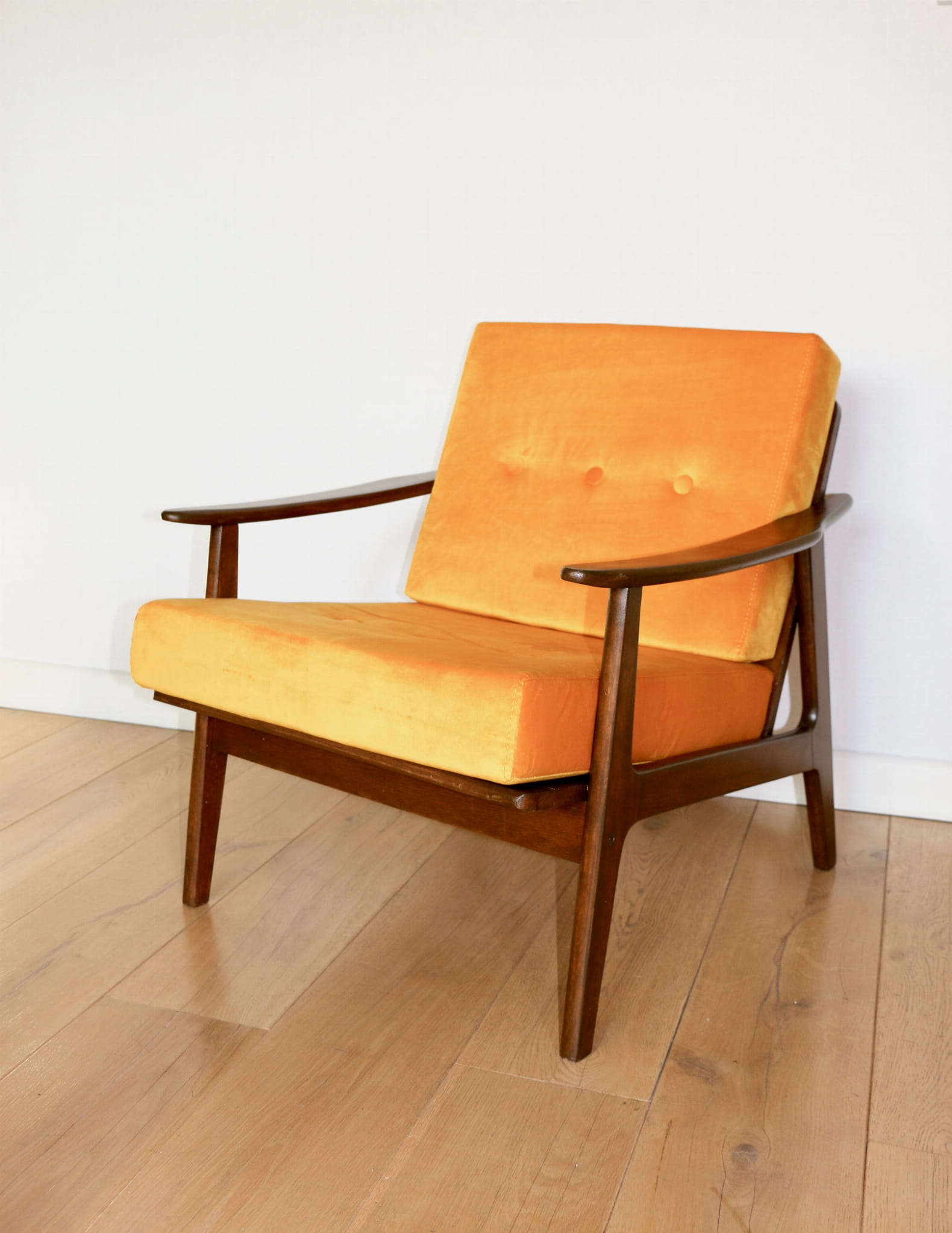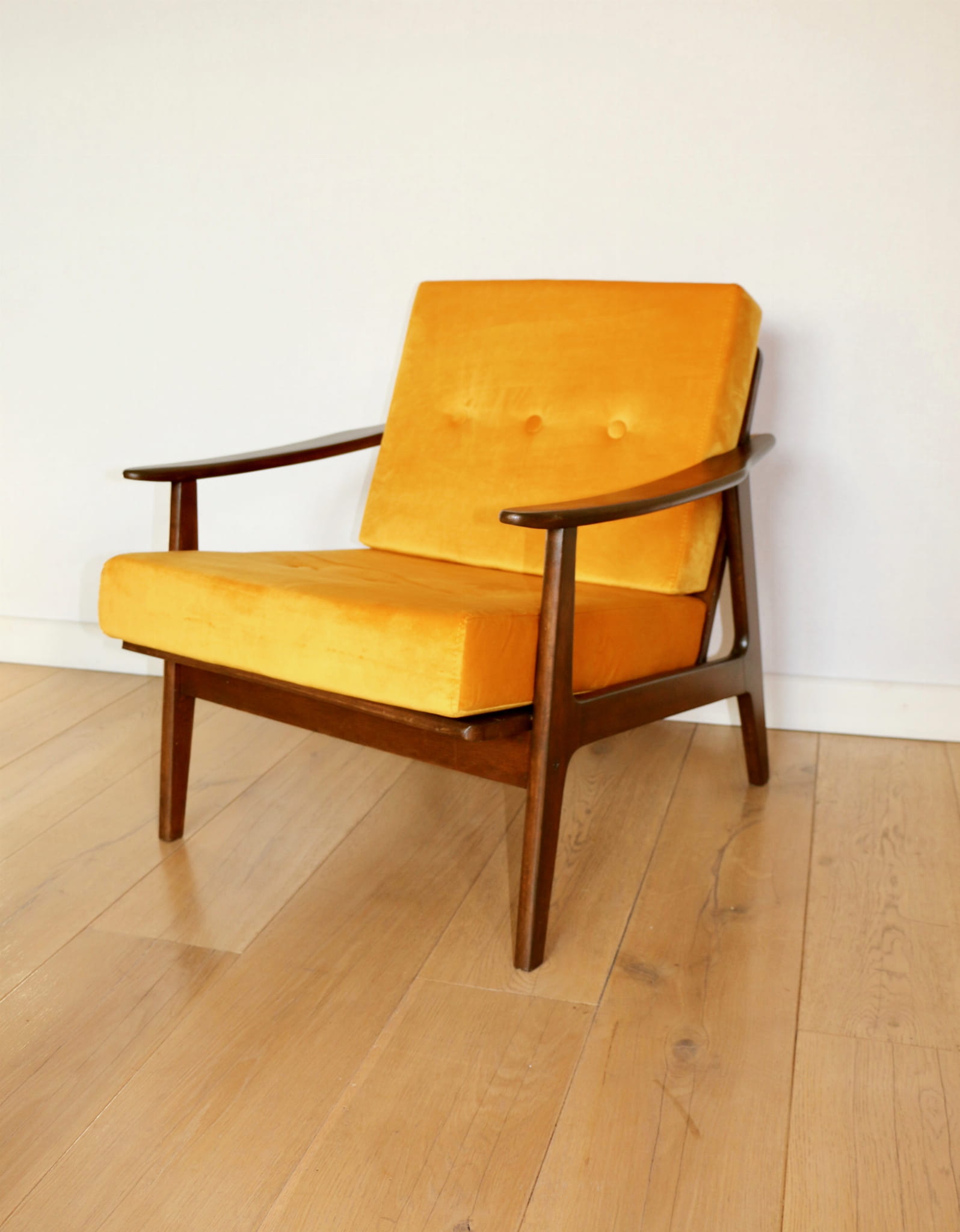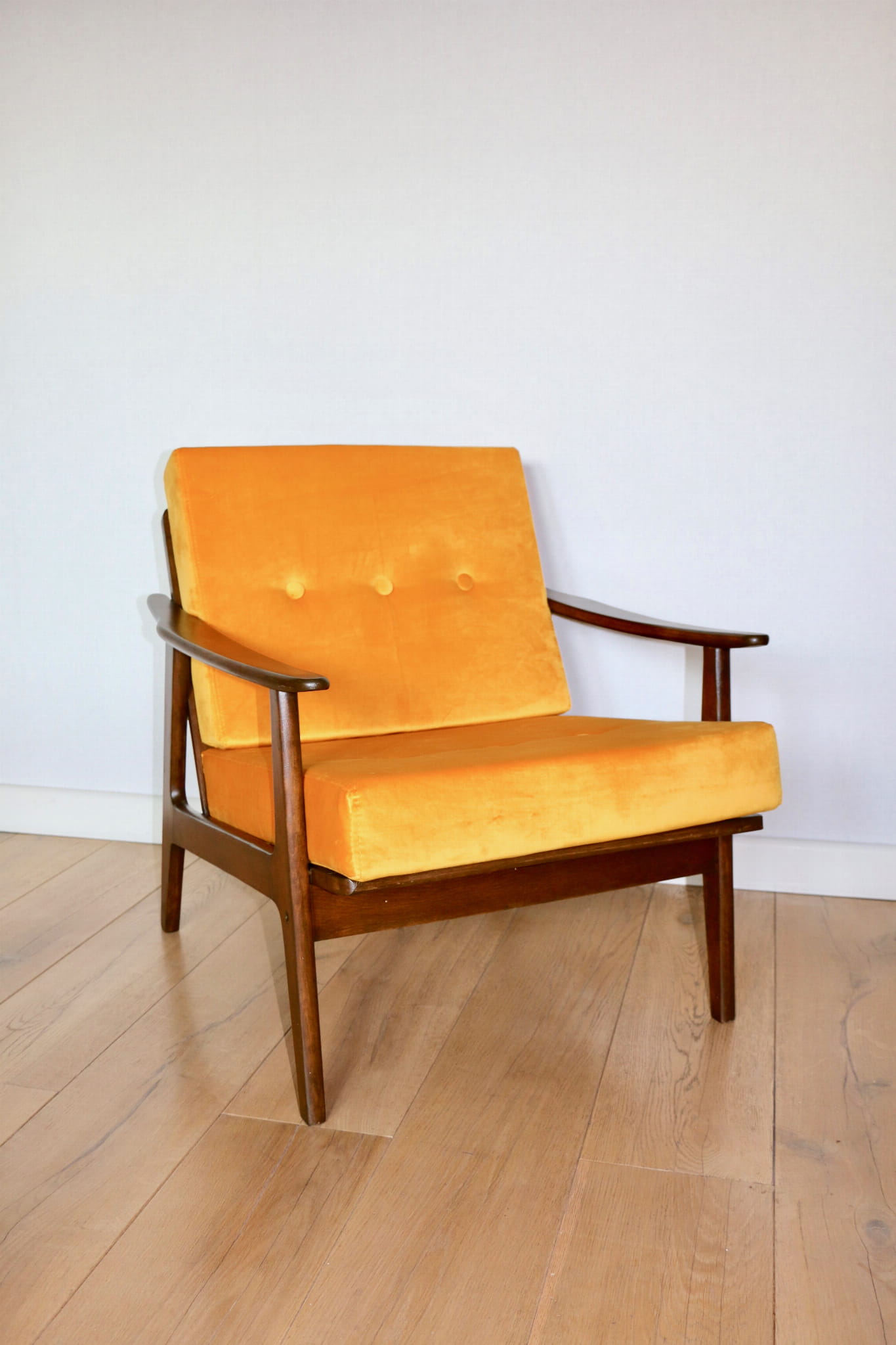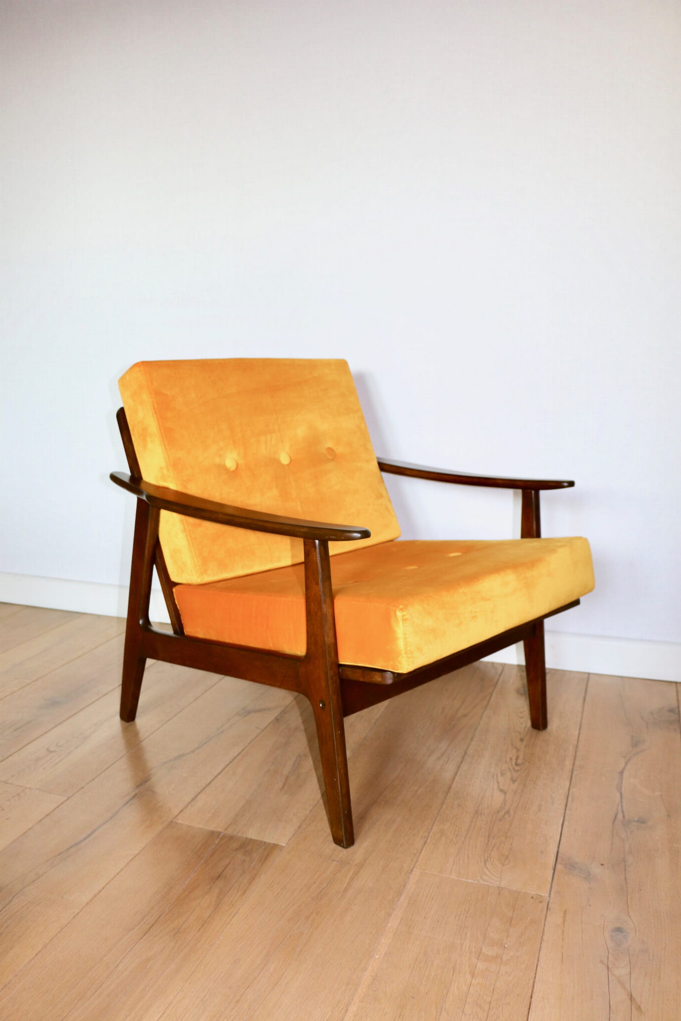 Jugosławiański fotel vintage na szczebelkach ze zdejmowanymi poduszkami z lat 80 tych całkowicie odrestaurowany. Nowe obicie pokryte najwyższej jakości materiałem tapicerskim w kolorze żółto-złotym z serii welvetowych tkanin. Stelaż drewniany z podłokietnikami pokryty lakierem w ciemnym kolorze drewna .