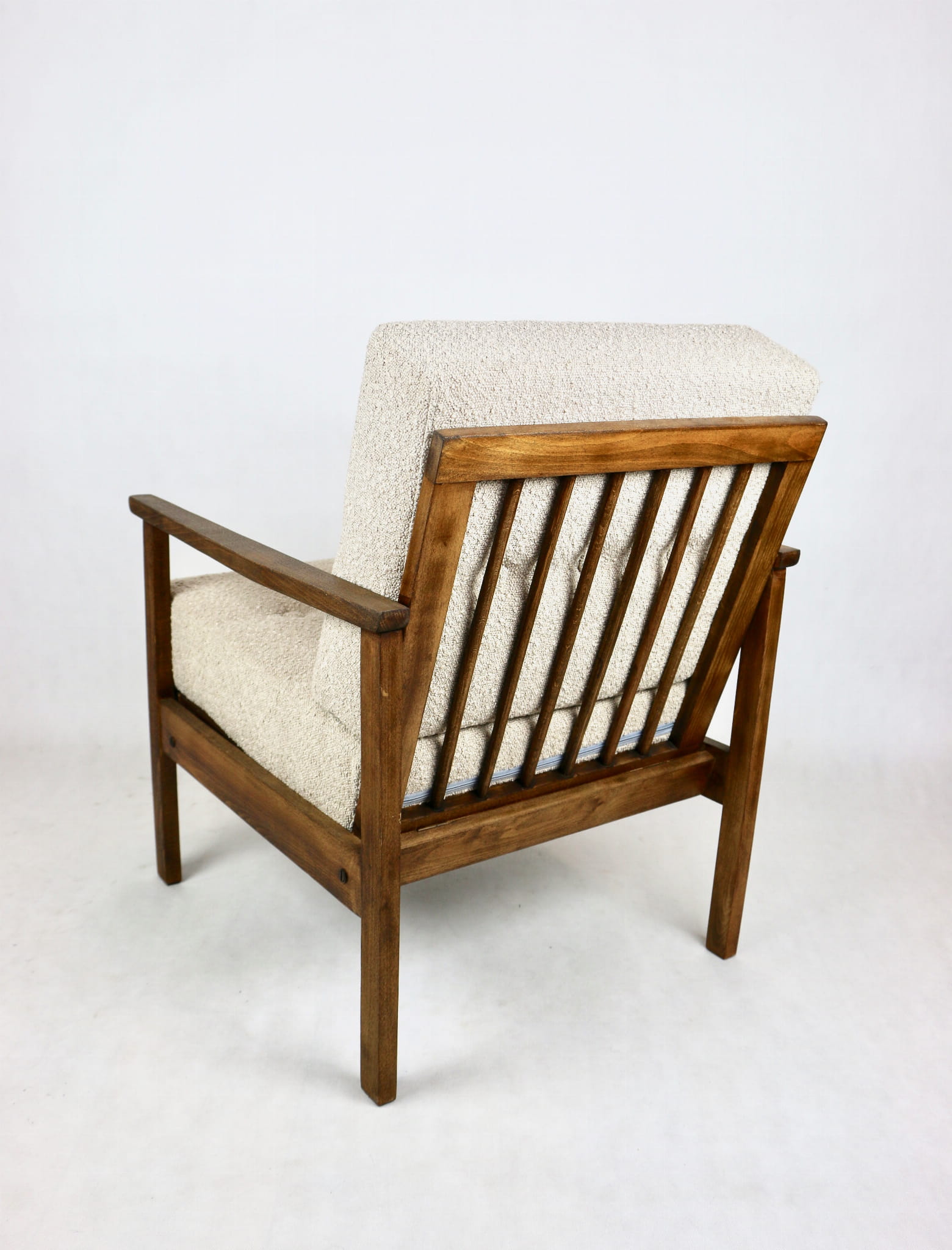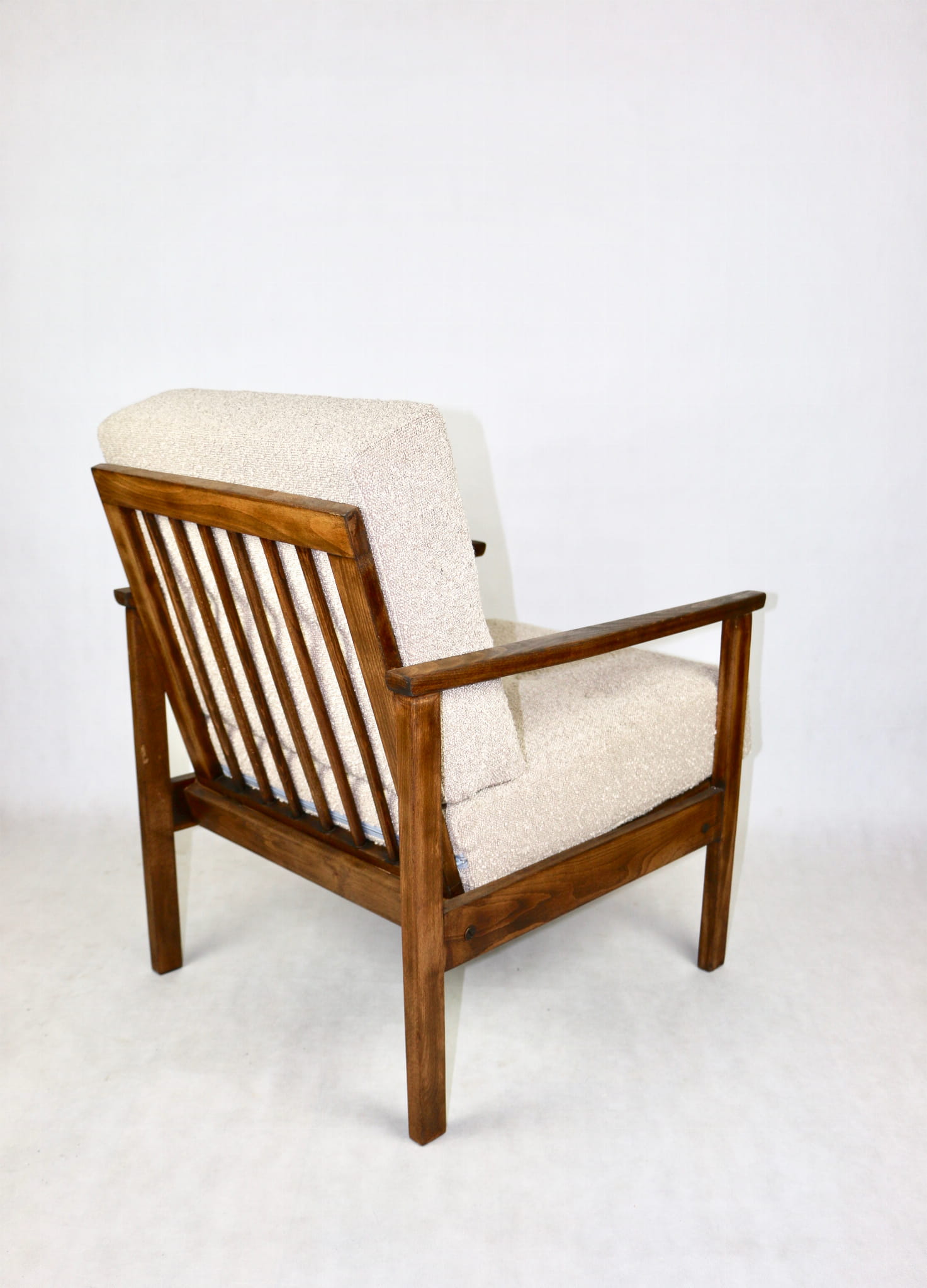 Szukasz mebla z duszą, który doda wnętrzu charakteru? Ten przepiękny fotel w stylu vintage to połączenie ponadczasowego designu i współczesnego komfortu. Starannie odrestaurowany, zyskał nową jakość dzięki tapicerce z modnej tkaniny Bouclé – miękkiej, przyjemnej w dotyku i niezwykle stylowej.