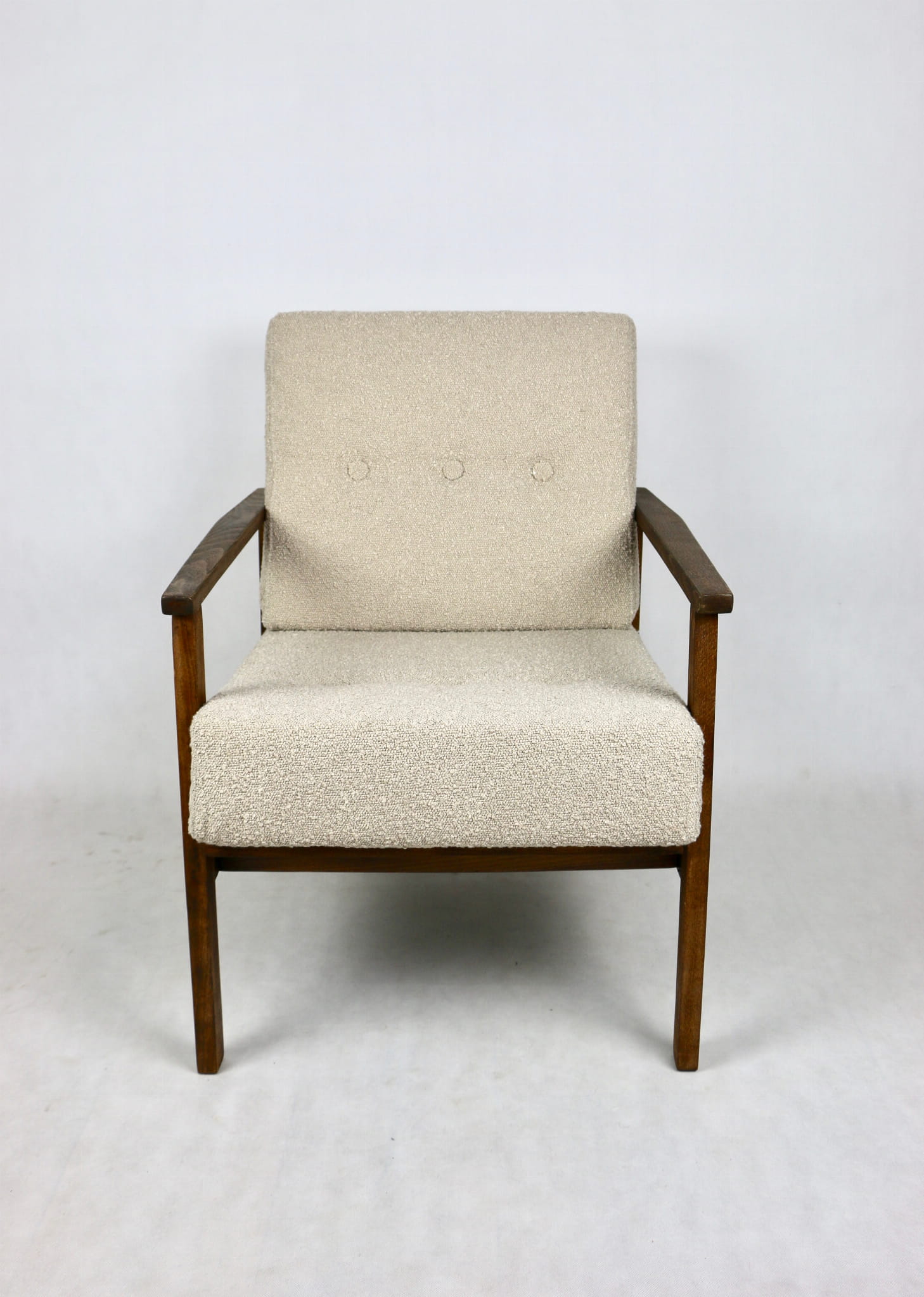 Fotel beżowy w stylu Vintage w tkaninie boucle na zdejmowanych poduszkach