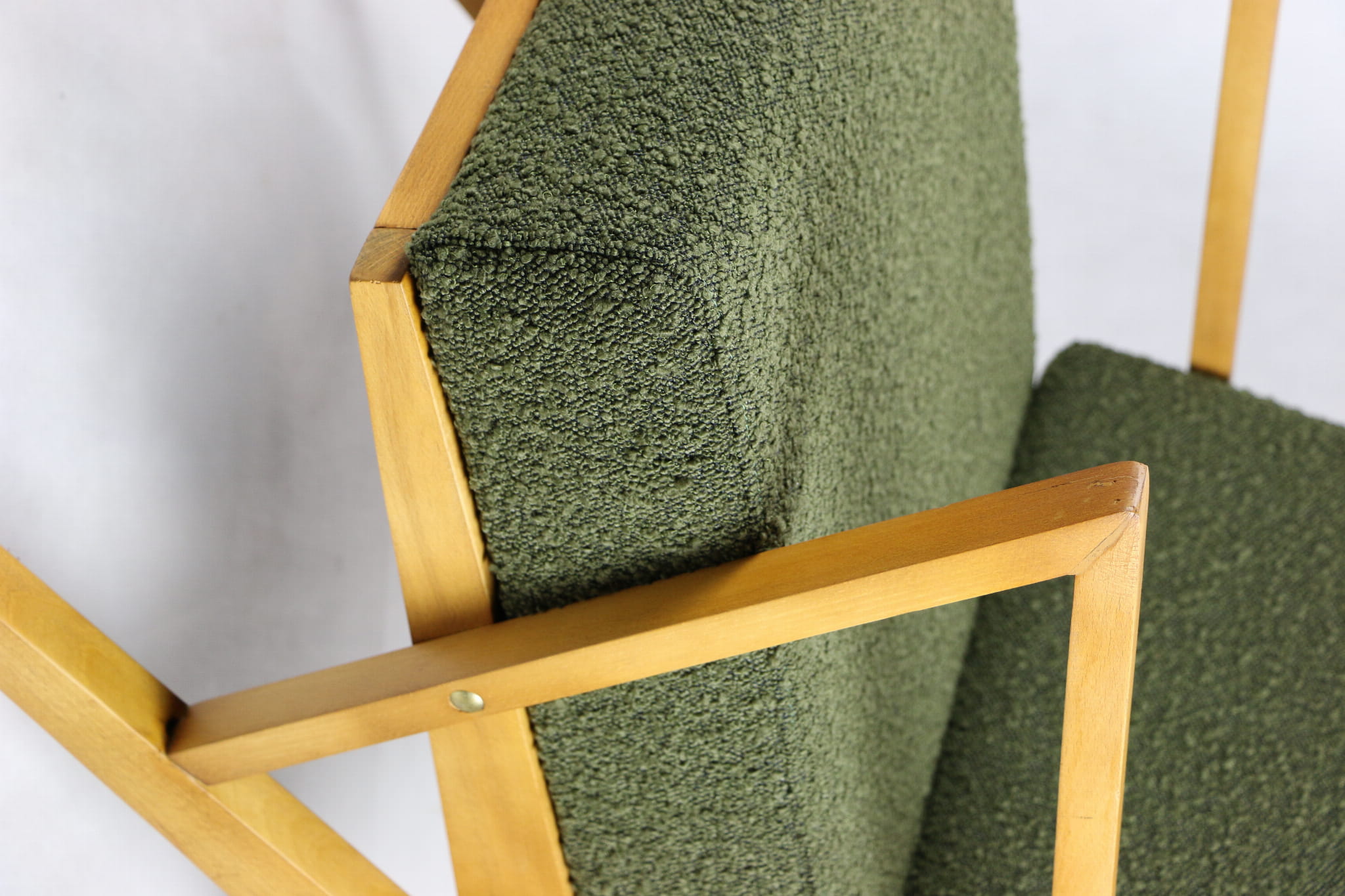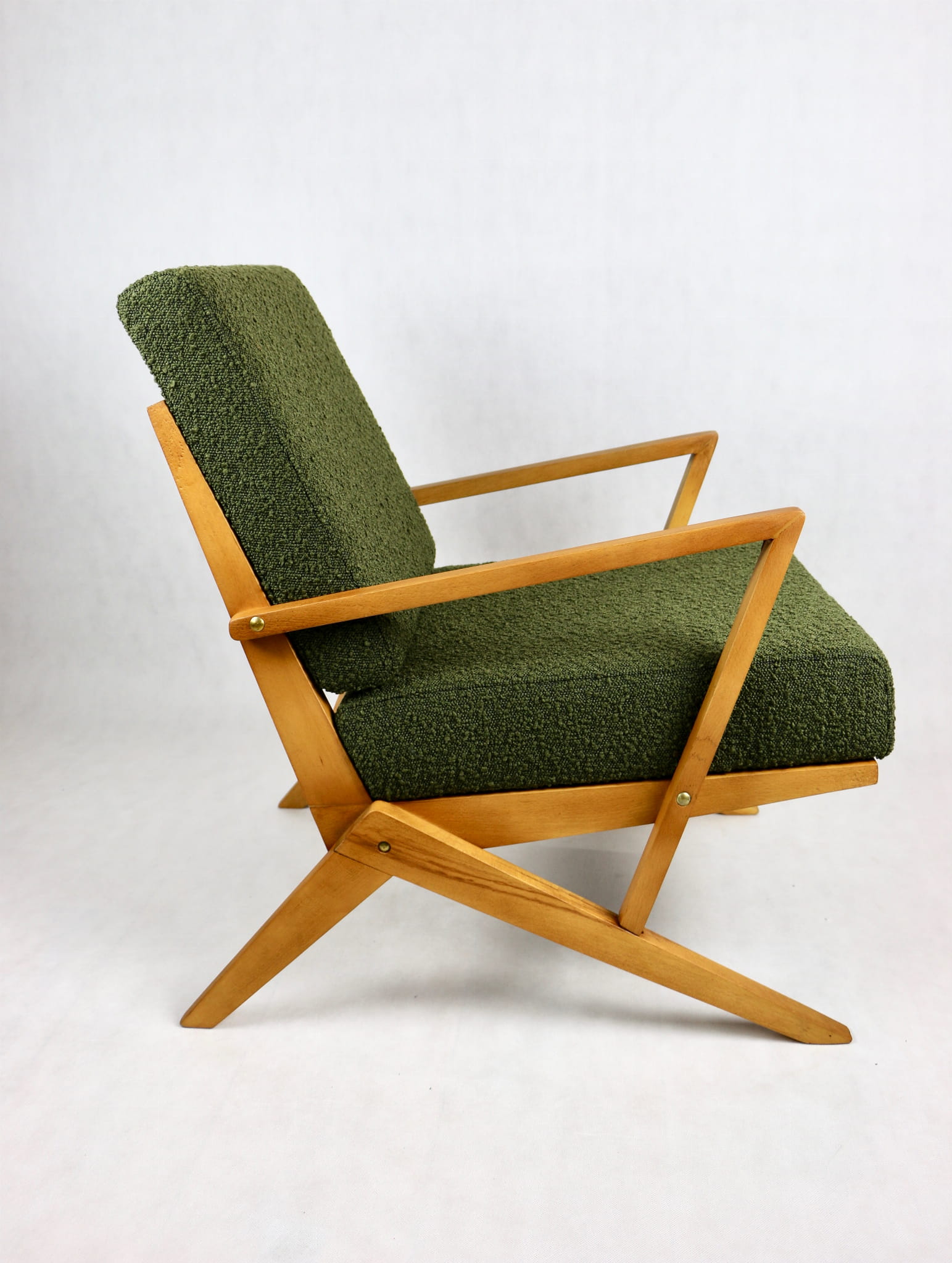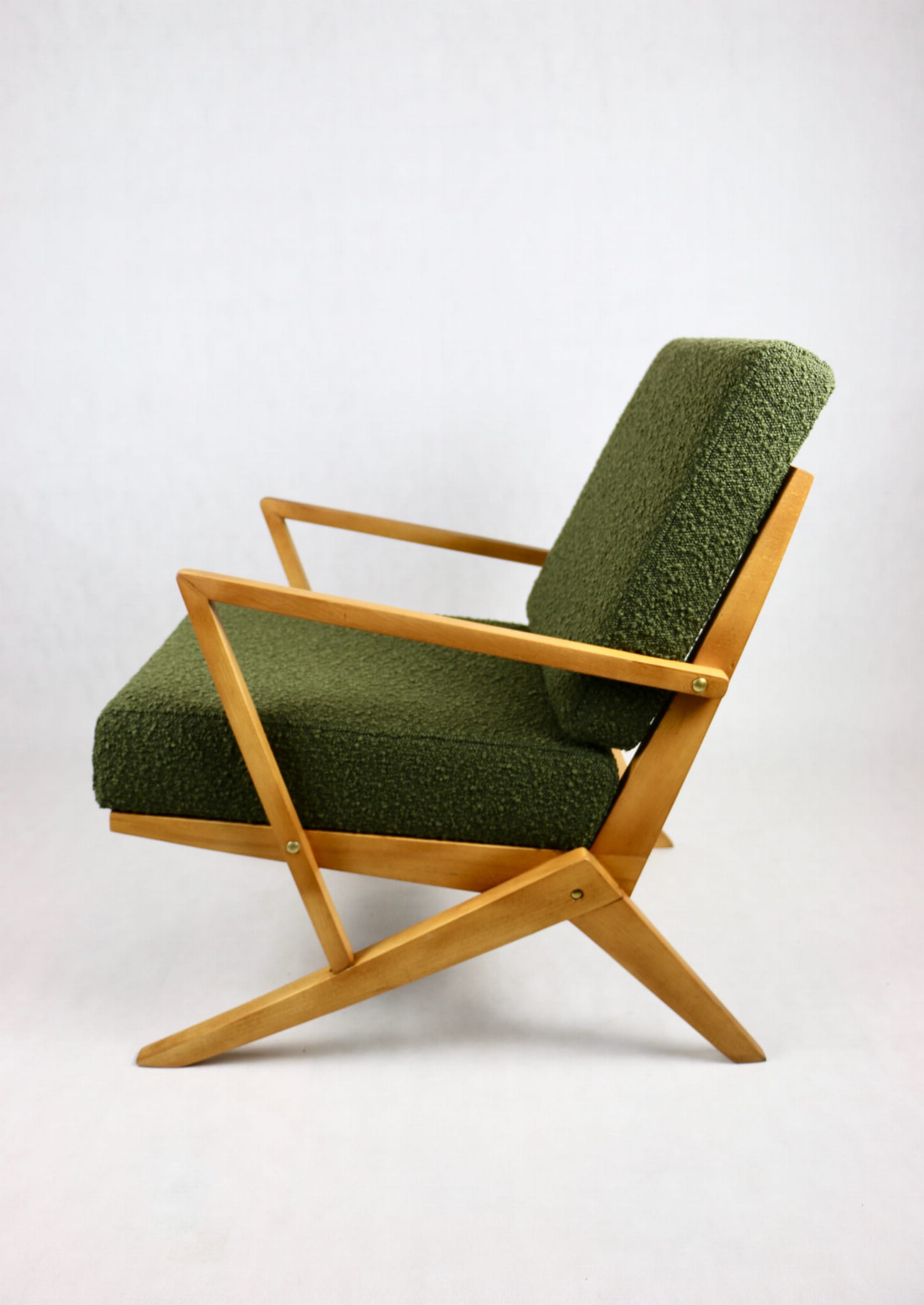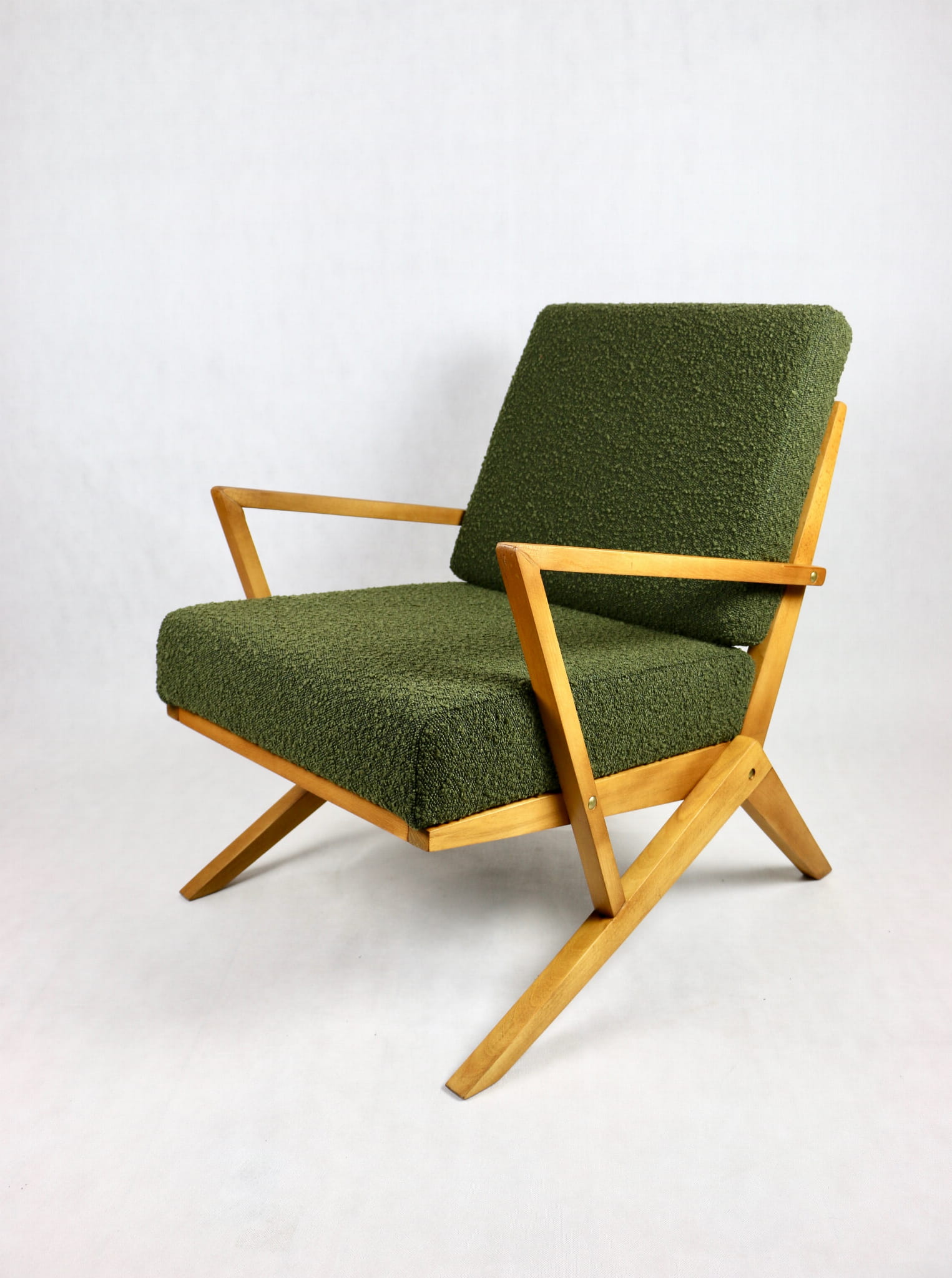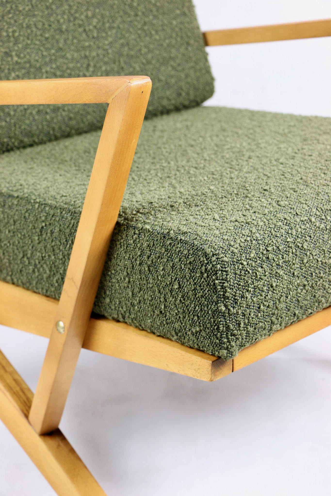Fotel Loft design Vintage z lat 70 tych. Został całkowicie odrestaurowany, nowe obicie pokryte materiałem w kolorze oliwkowym - zielonym - materiał typu boucle. Siedzisko i oparcie bardzo wygodne jako zdejmowane poduszki, stelaż drewniany połączony z podłokietnikami w jasnej kolorystyce drewna dębowego - drewno bukowe.