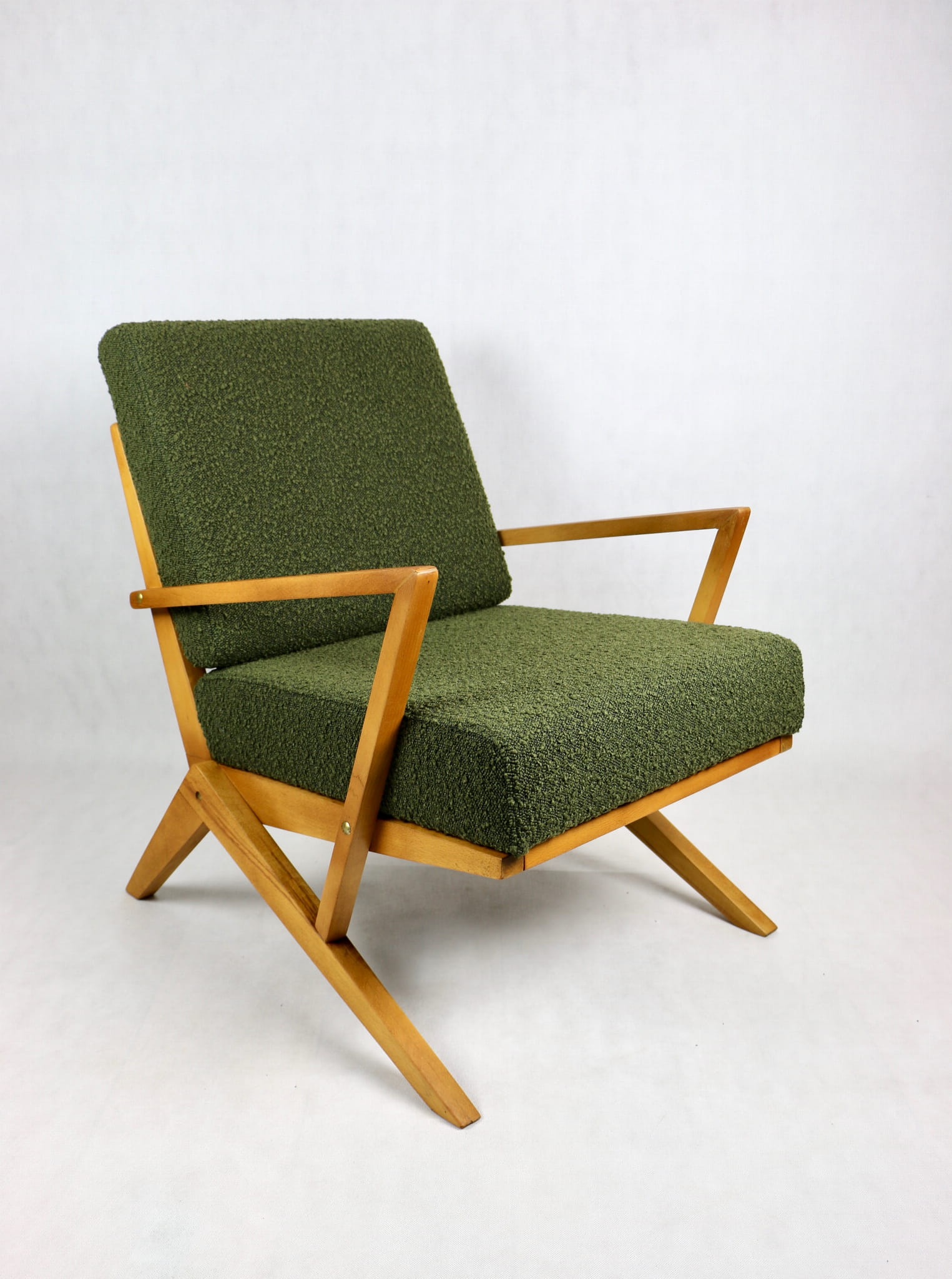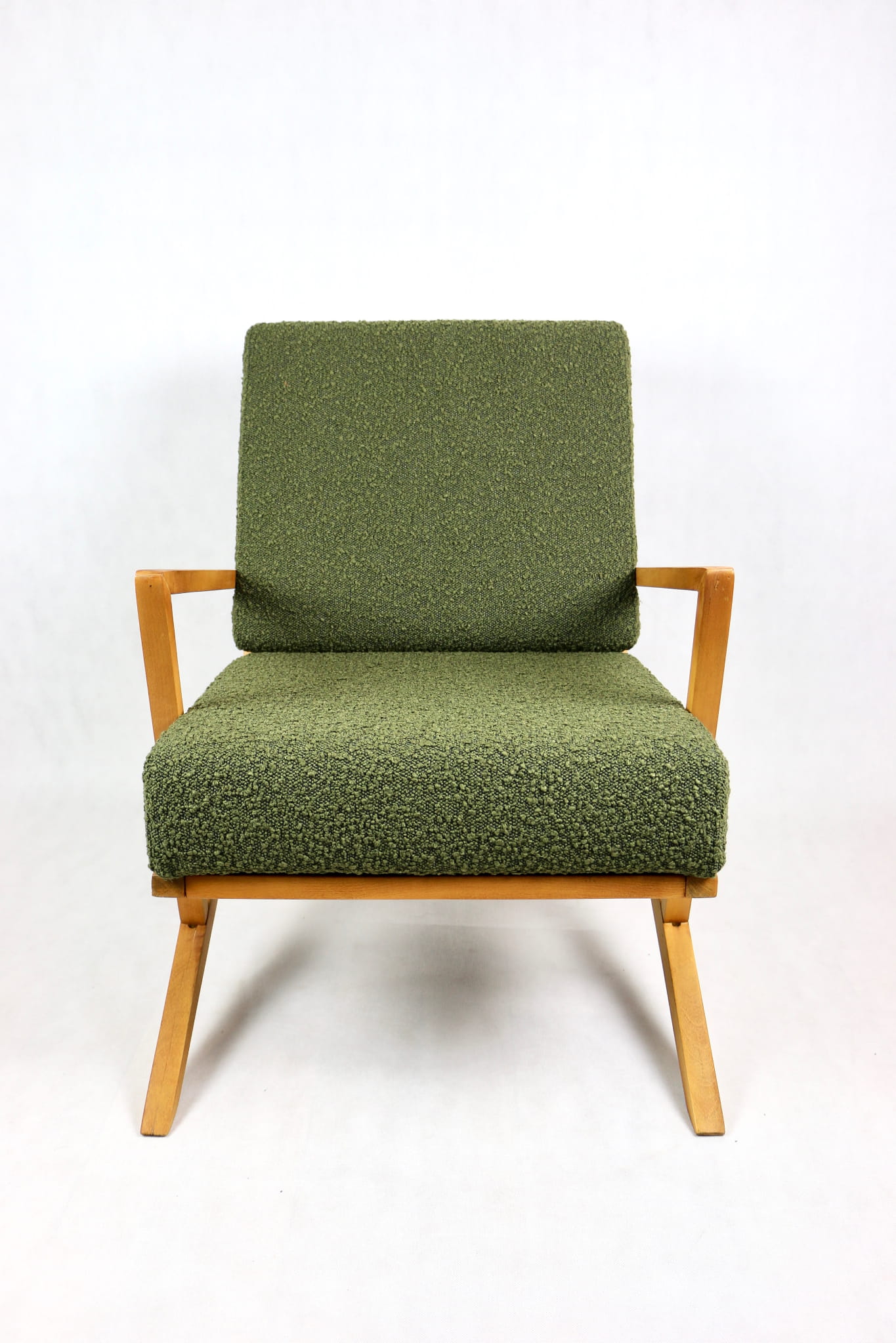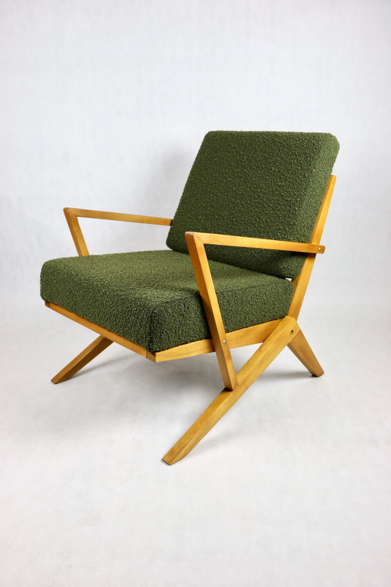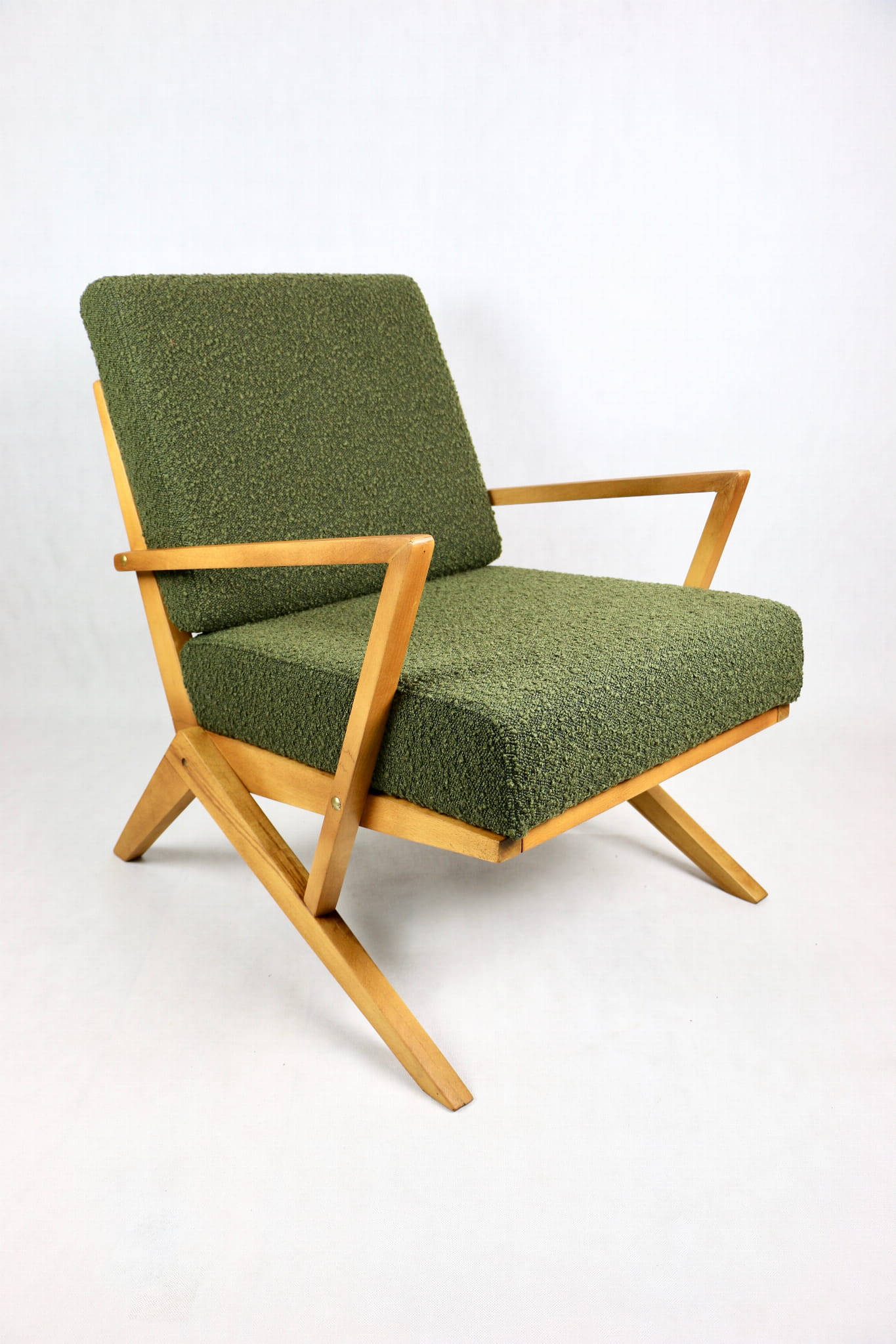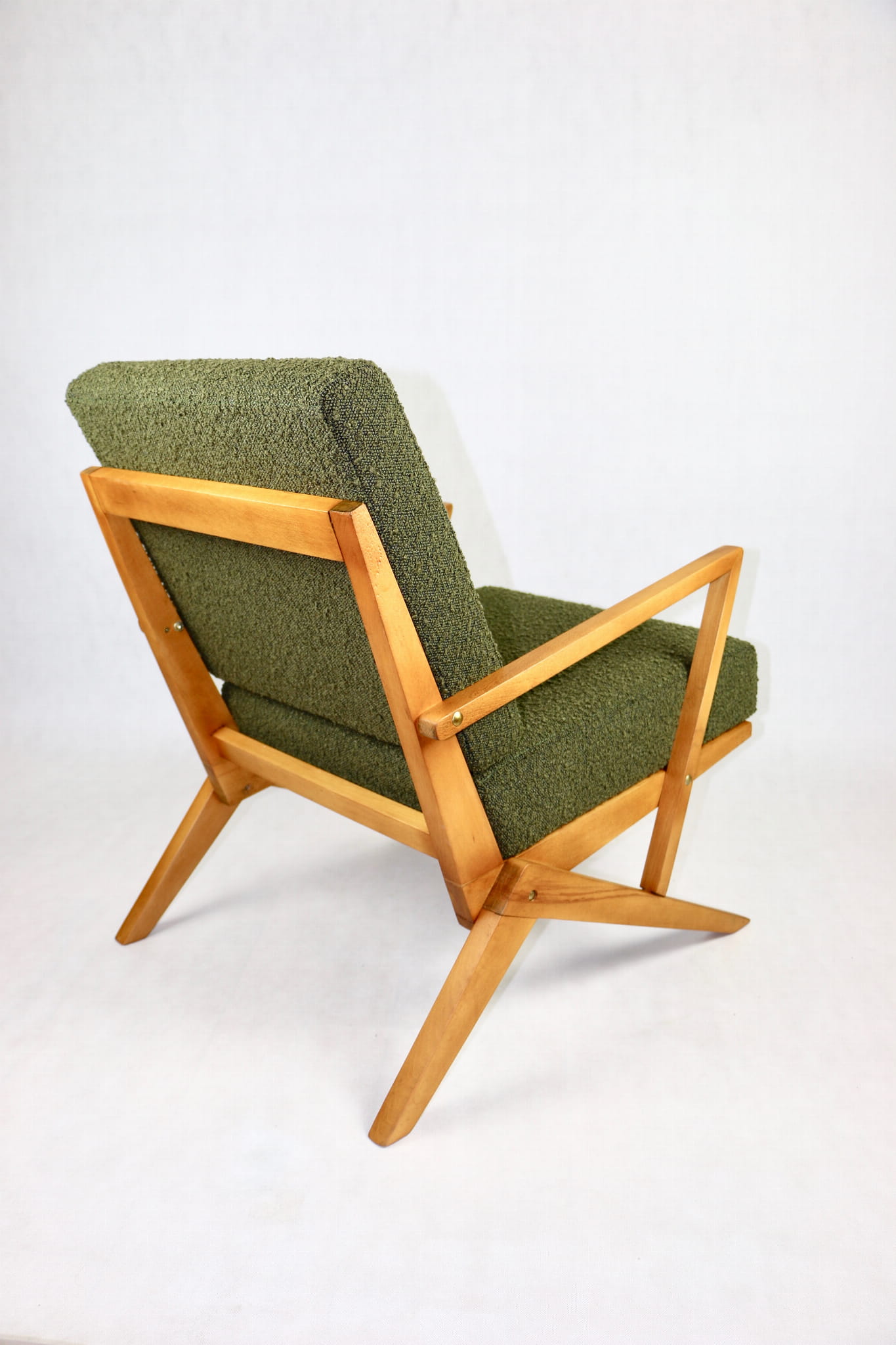 Fotel Loft design Vintage z lat 70 tych. Został całkowicie odrestaurowany, nowe obicie pokryte materiałem w kolorze oliwkowym - zielonym - materiał typu boucle. Siedzisko i oparcie bardzo wygodne jako zdejmowane poduszki, stelaż drewniany połączony z podłokietnikami w jasnej kolorystyce drewna dębowego - drewno bukowe.