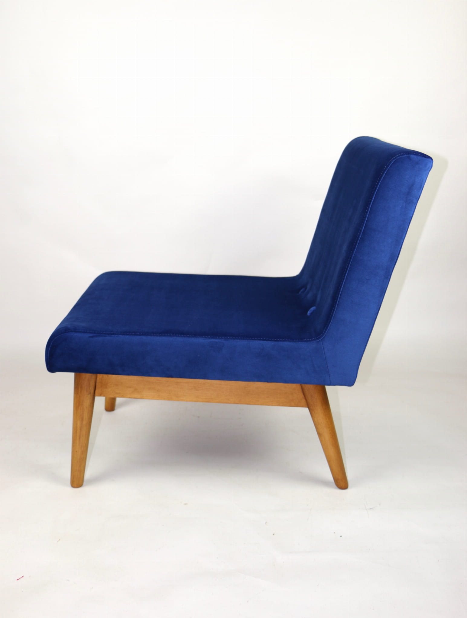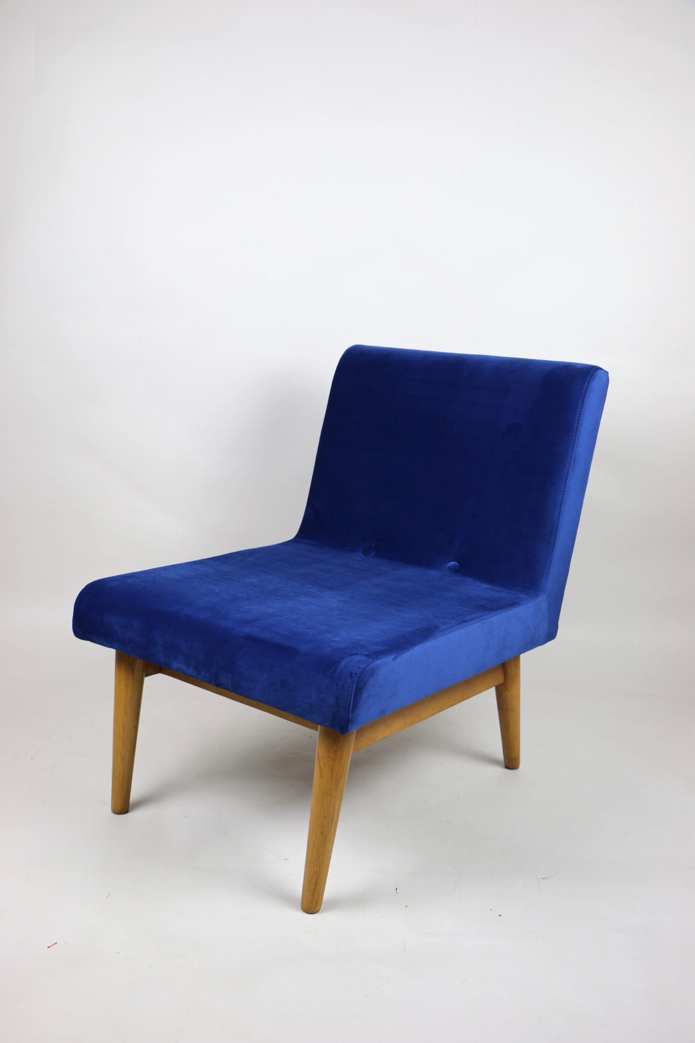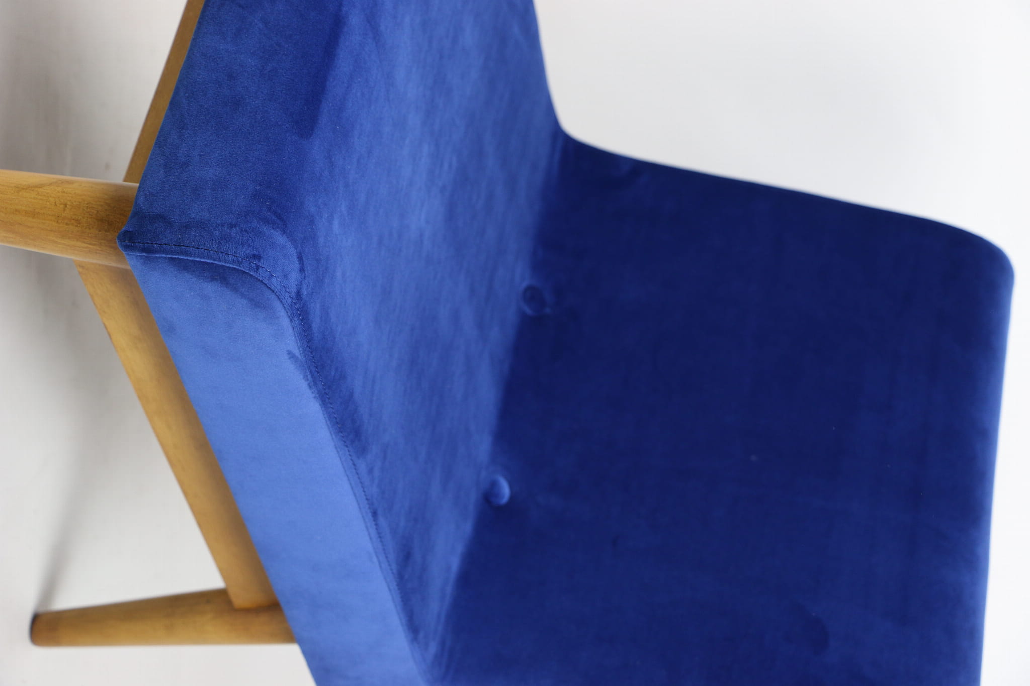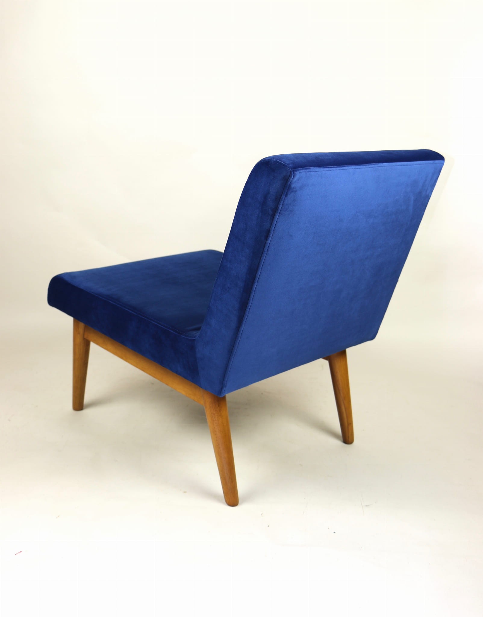 Odrestaurowany fotel Vintage Loft nowe obicie pokryte aksamitnym materiałem tapicerskim w granatowym kolorze. Stelaż drewniany w naturalnej kolorystyce drewna, odświeżony i zachowany w stanie oryginalnym z lat siedemdziesiątych. Bardzo wygodny model z 70 lat.