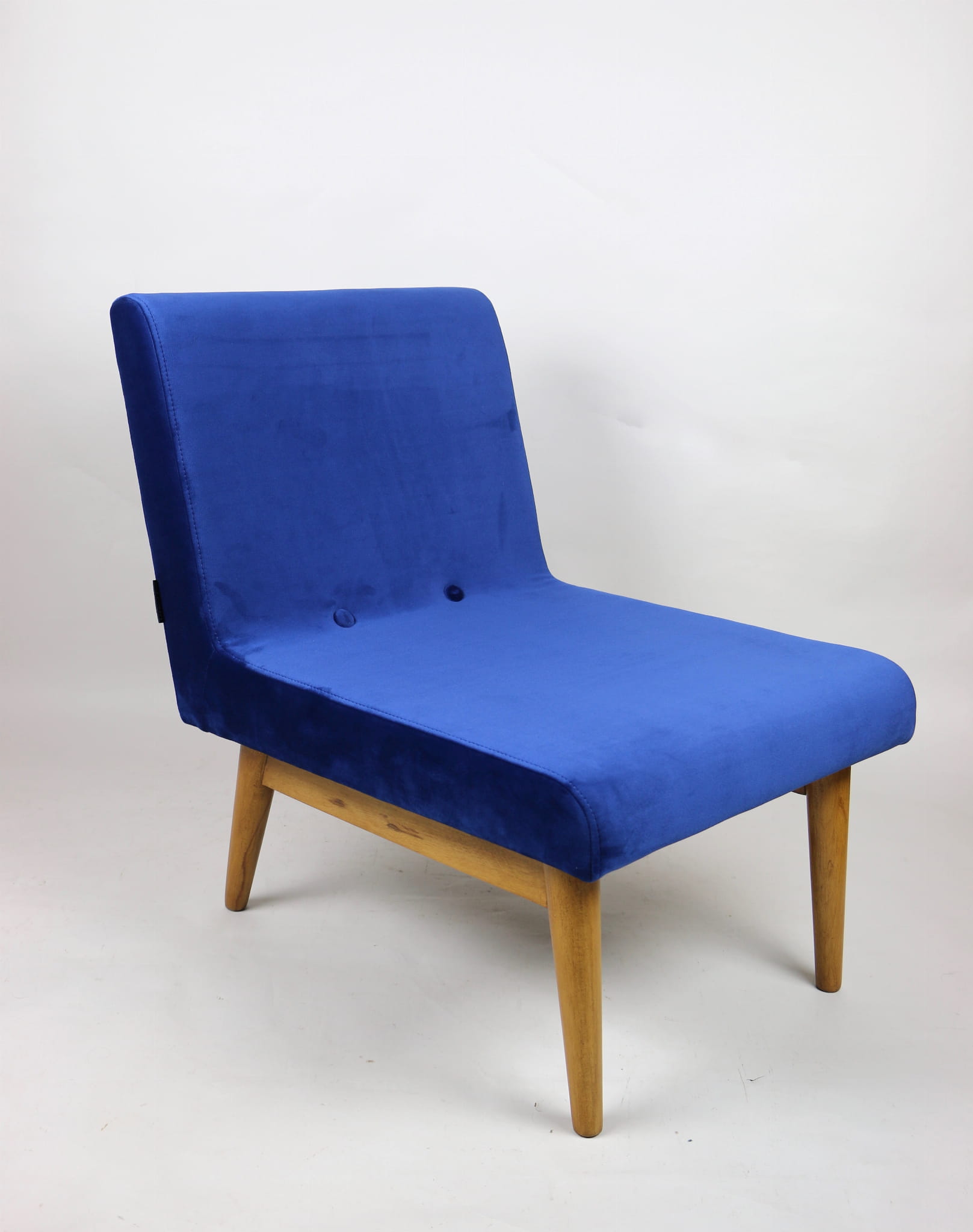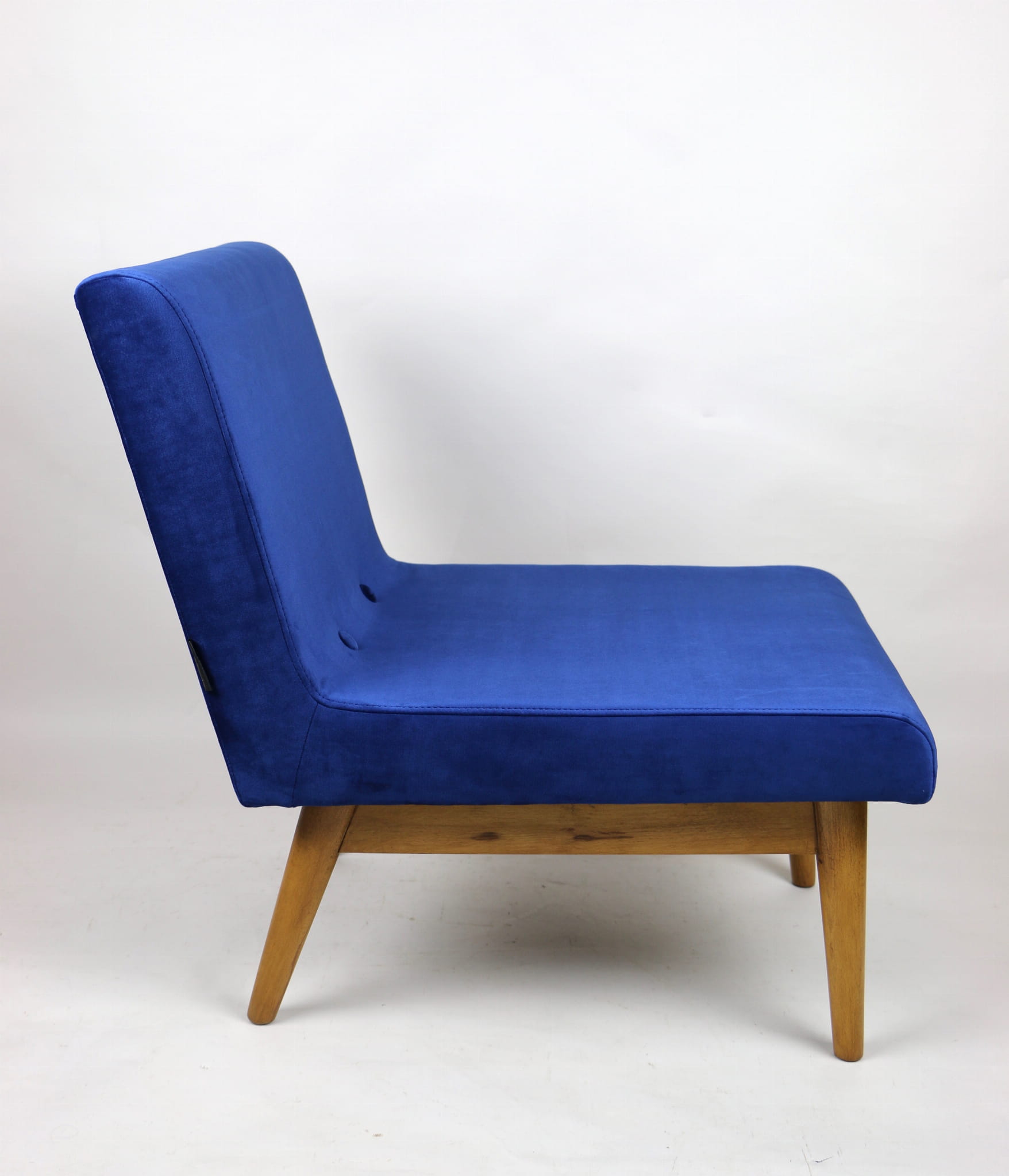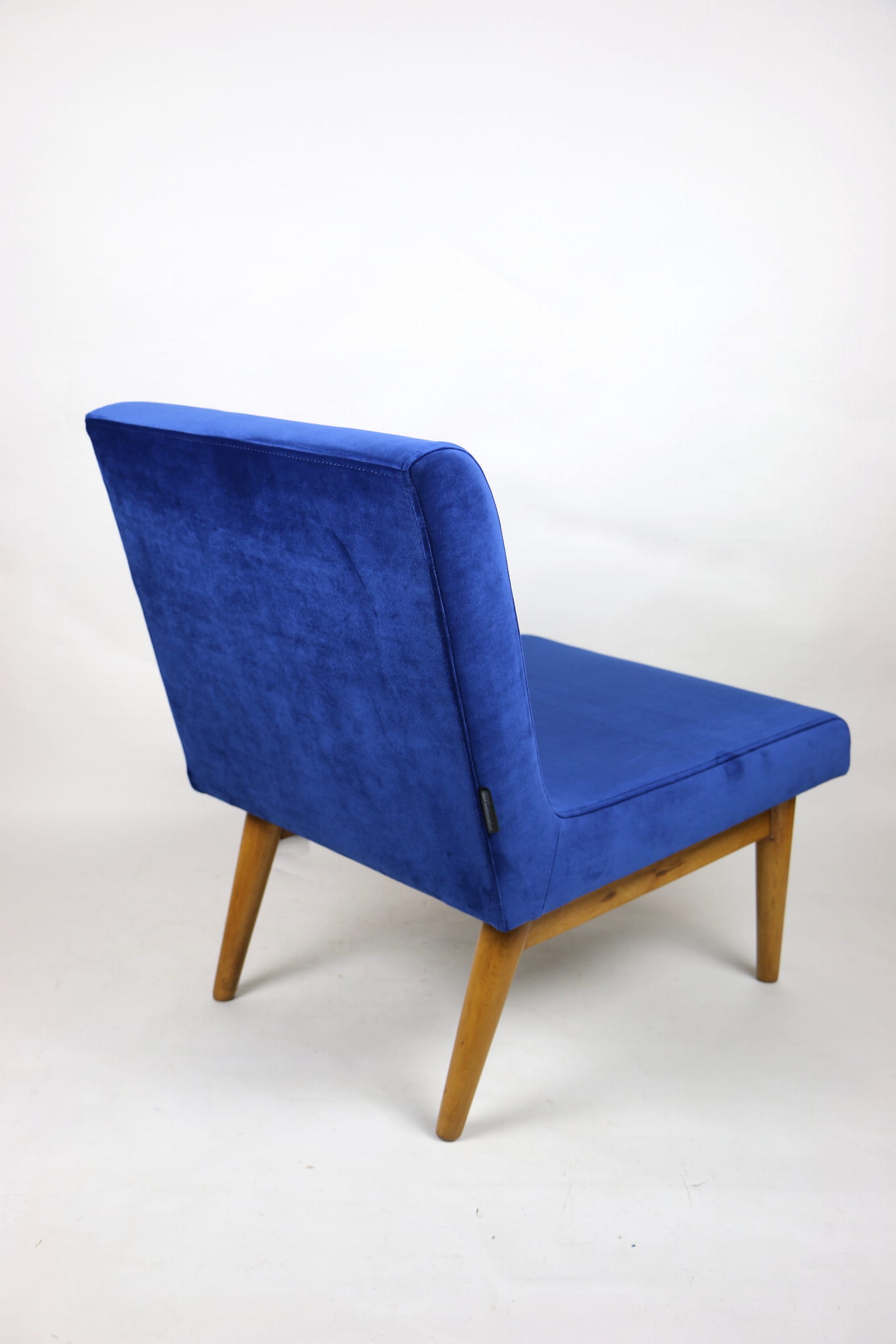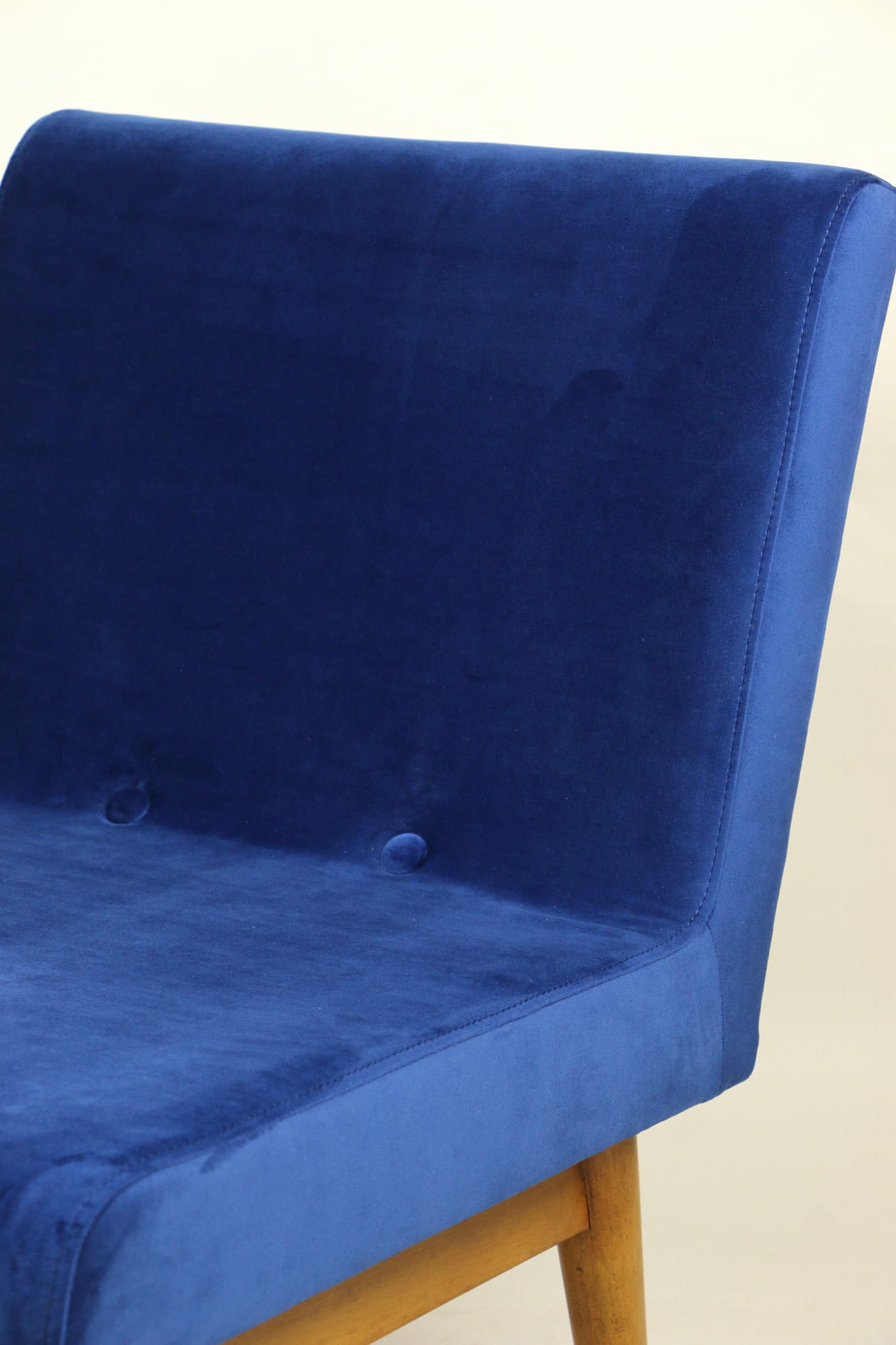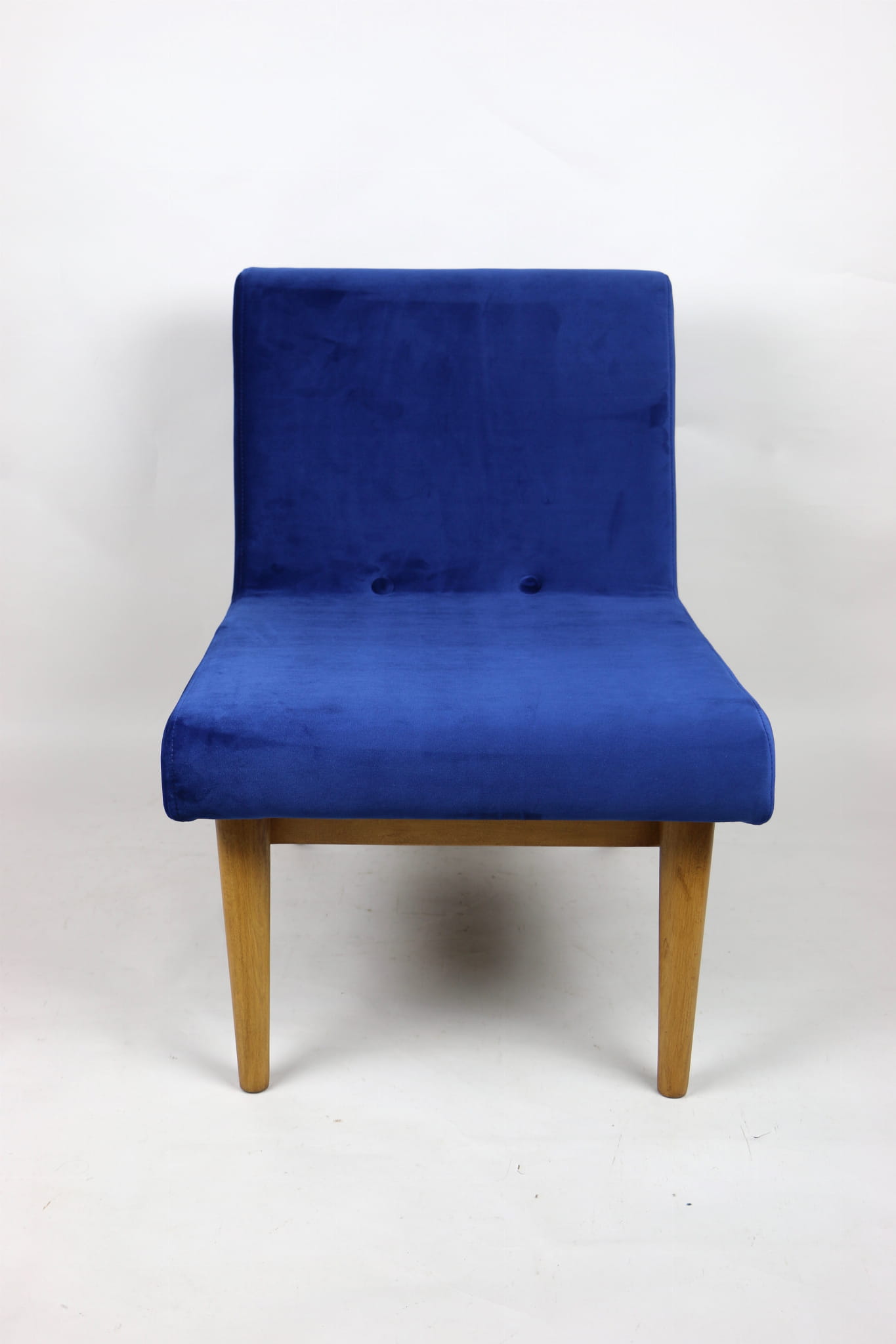Odrestaurowany fotel Vintage Loft nowe obicie pokryte aksamitnym materiałem tapicerskim w granatowym kolorze. Stelaż drewniany w naturalnej kolorystyce drewna, odświeżony i zachowany w stanie oryginalnym z lat siedemdziesiątych. Bardzo wygodny model z 70 lat.
