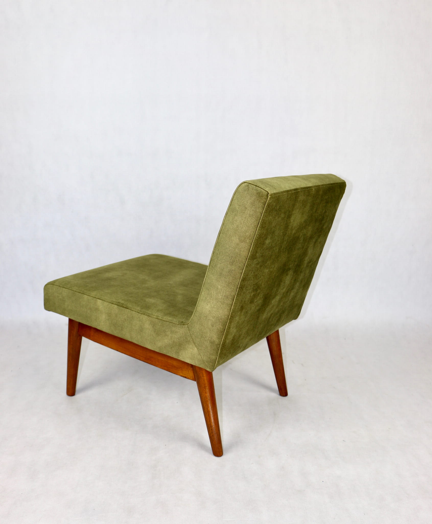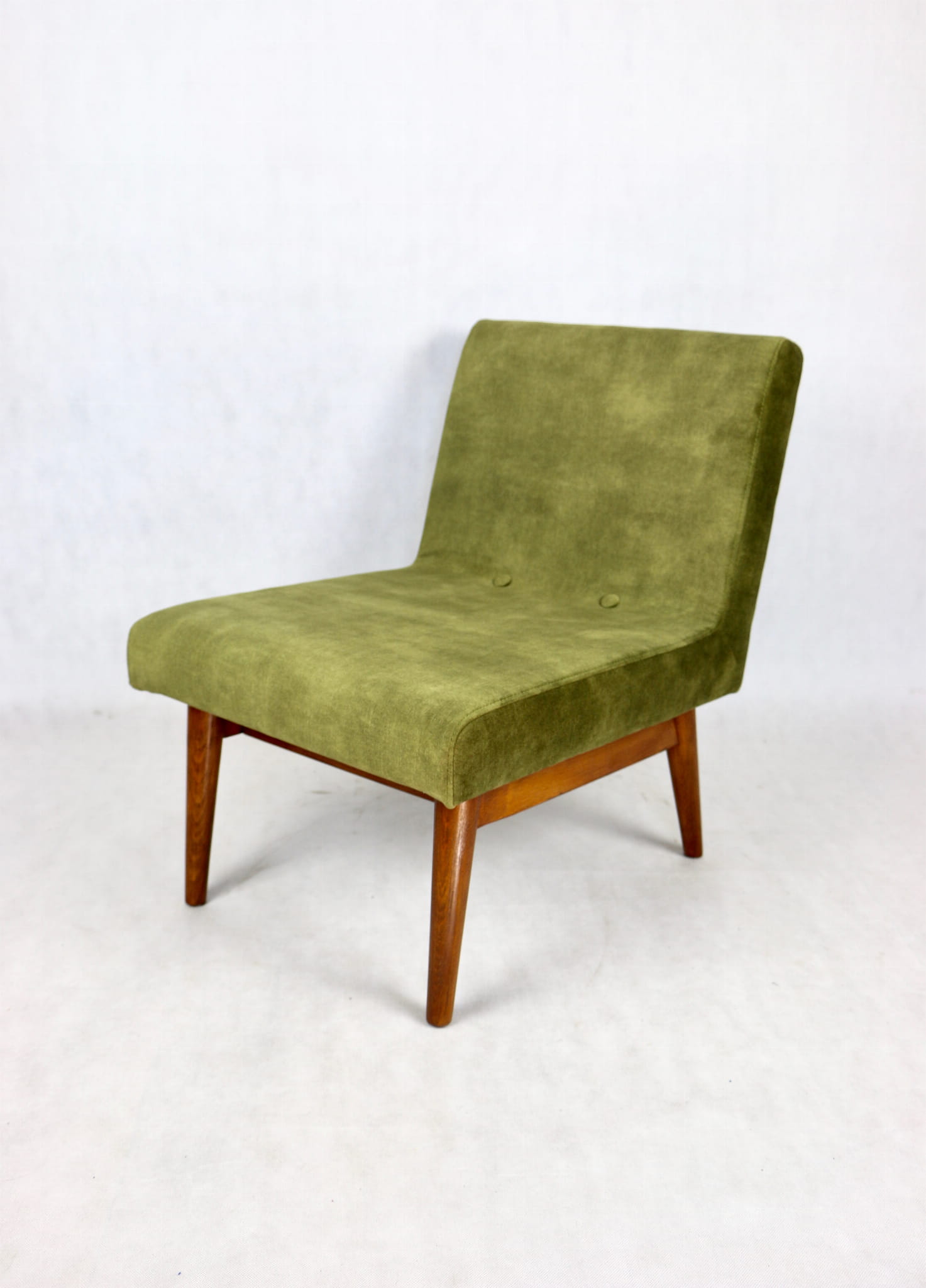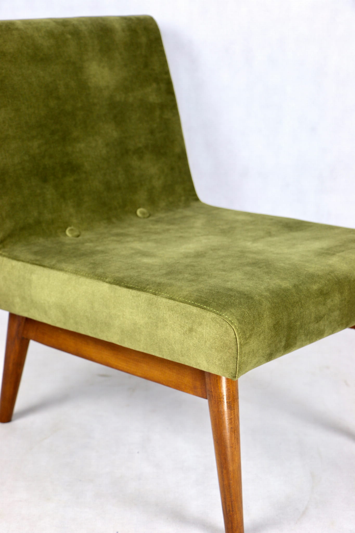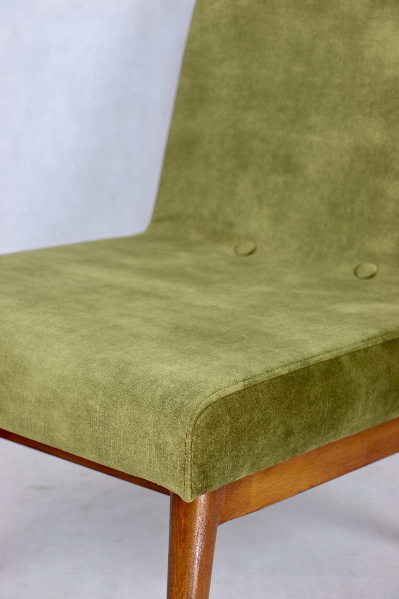 Odrestaurowane fotele Vintage Loft nowe obicie pokryte aksamitnym materiałem tapicerskim w oliwkowym kolorze z serii Macau. Stelaż drewniany z podłokietnikami w ciemnej kolorystyce drewna, oszlifowany i ponownie przemalowany. Bardzo wygodny model z 70 lat.