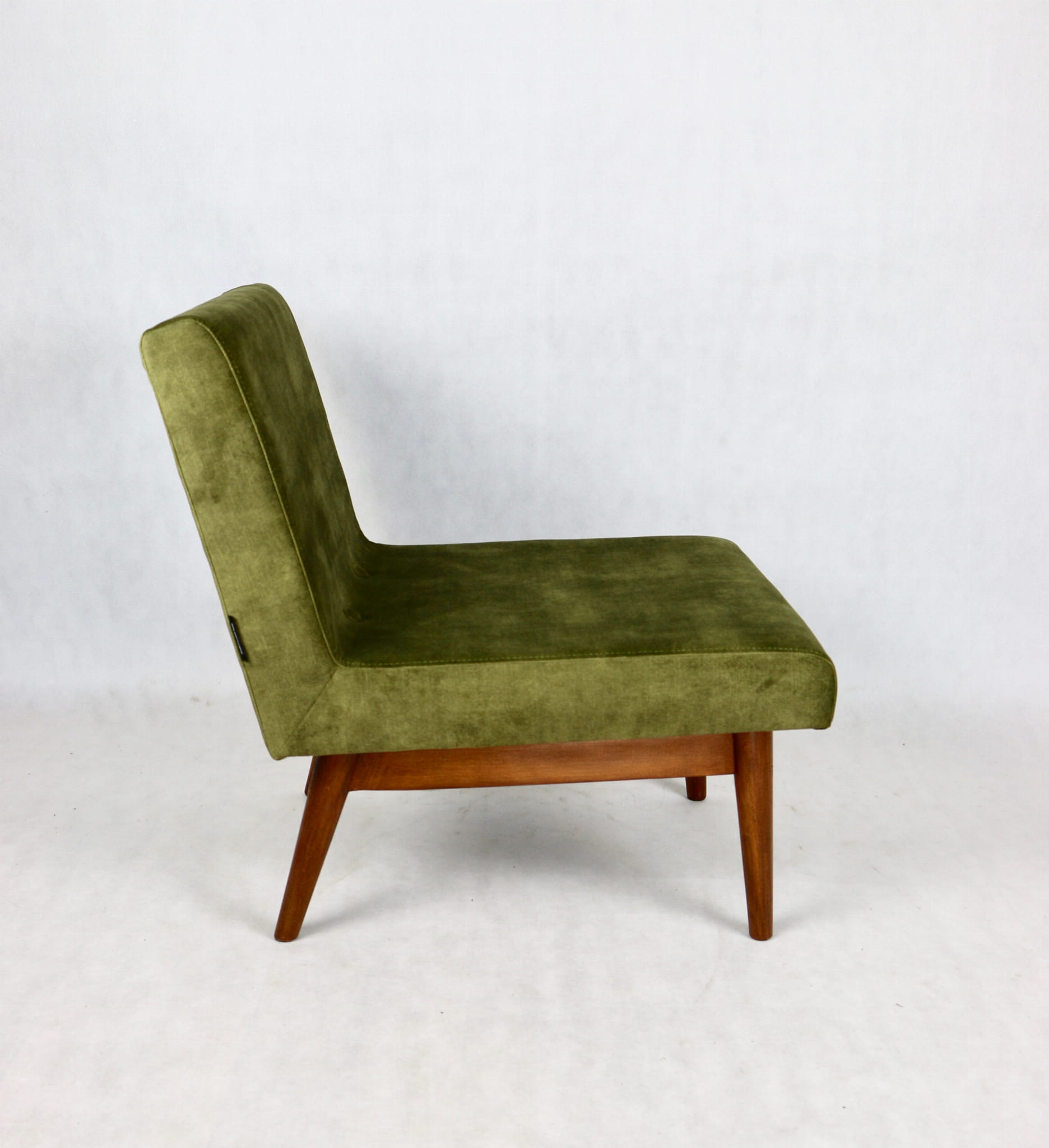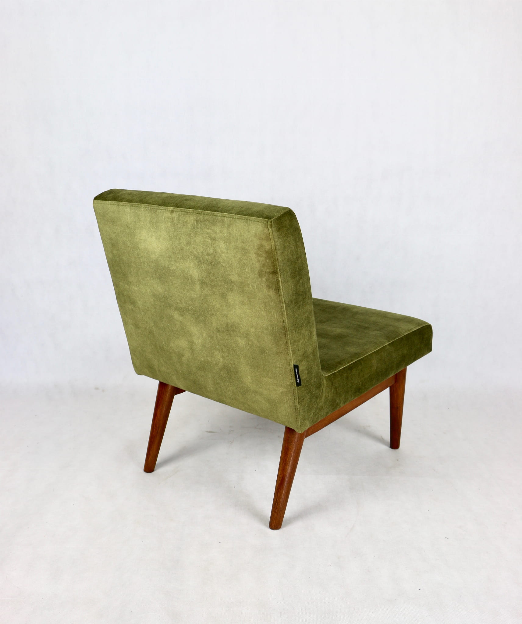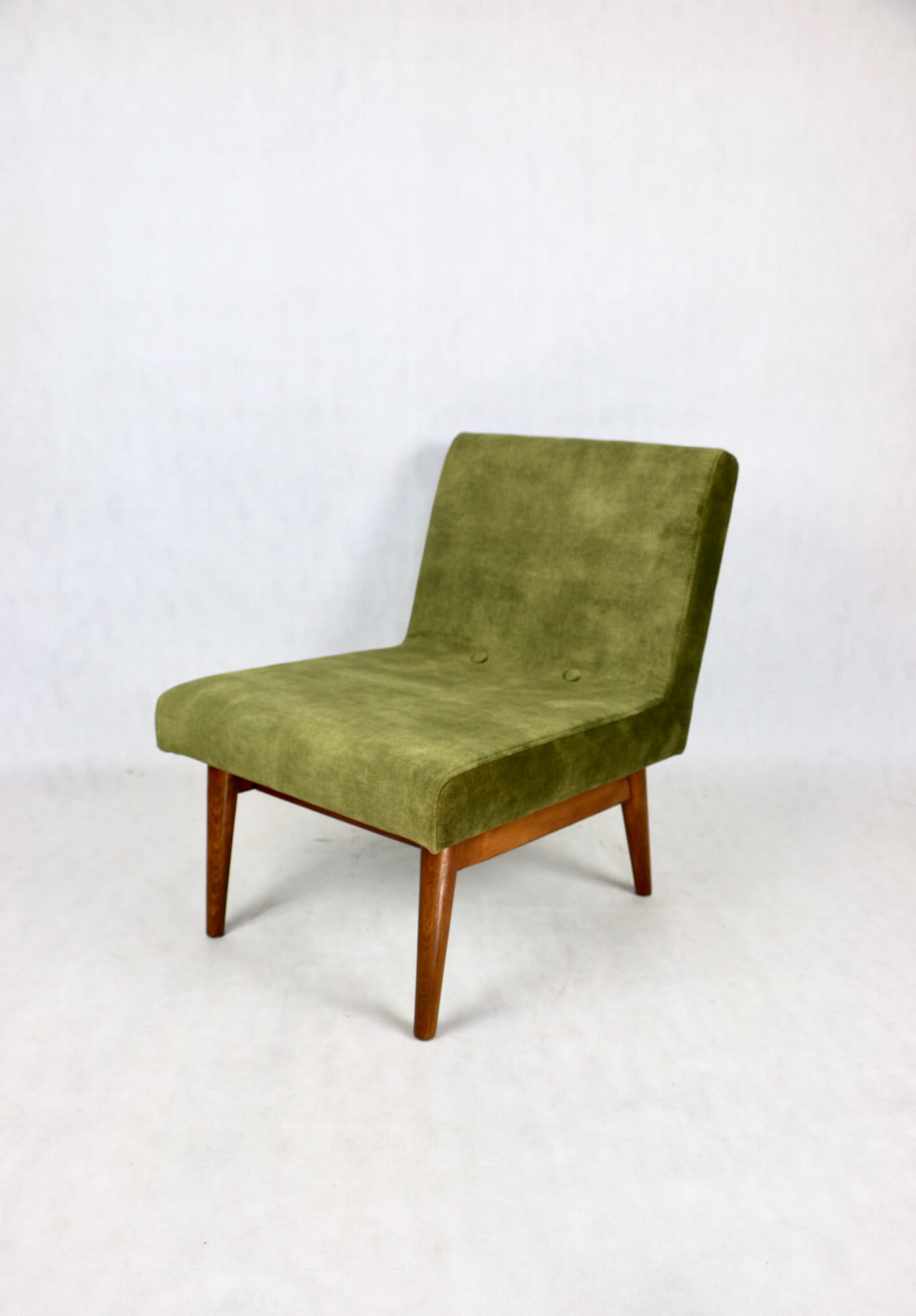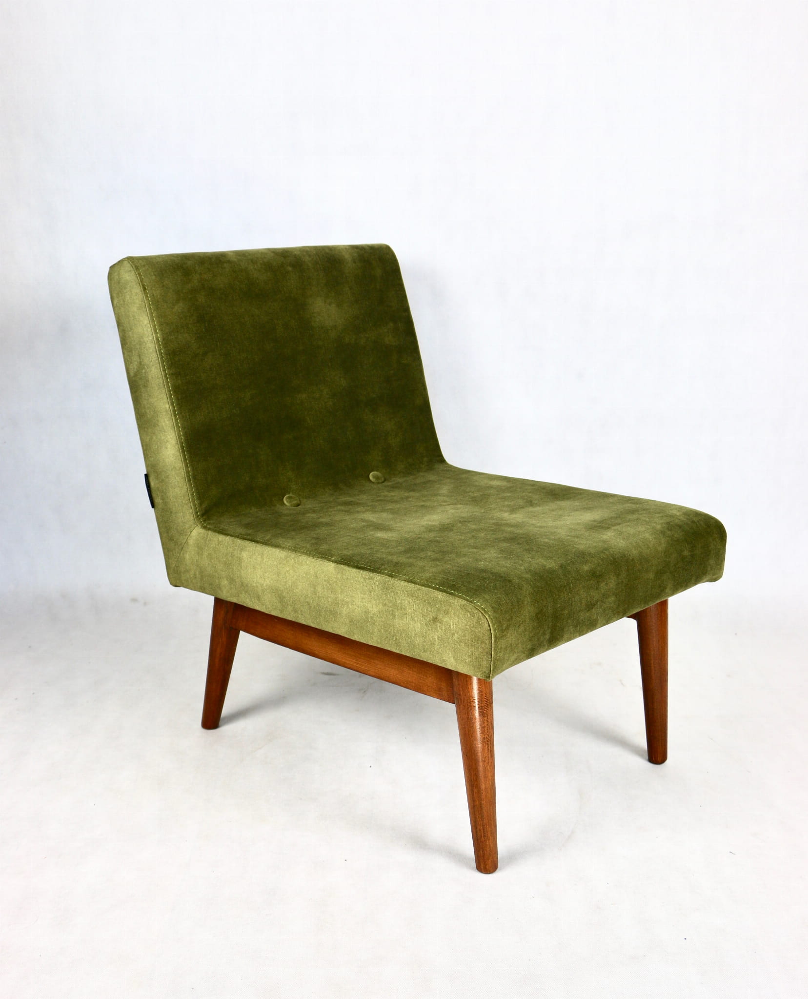 Odrestaurowane fotele Vintage Loft nowe obicie pokryte aksamitnym materiałem tapicerskim w oliwkowym kolorze z serii Macau. Stelaż drewniany z podłokietnikami w ciemnej kolorystyce drewna, oszlifowany i ponownie przemalowany. Bardzo wygodny model z 70 lat.