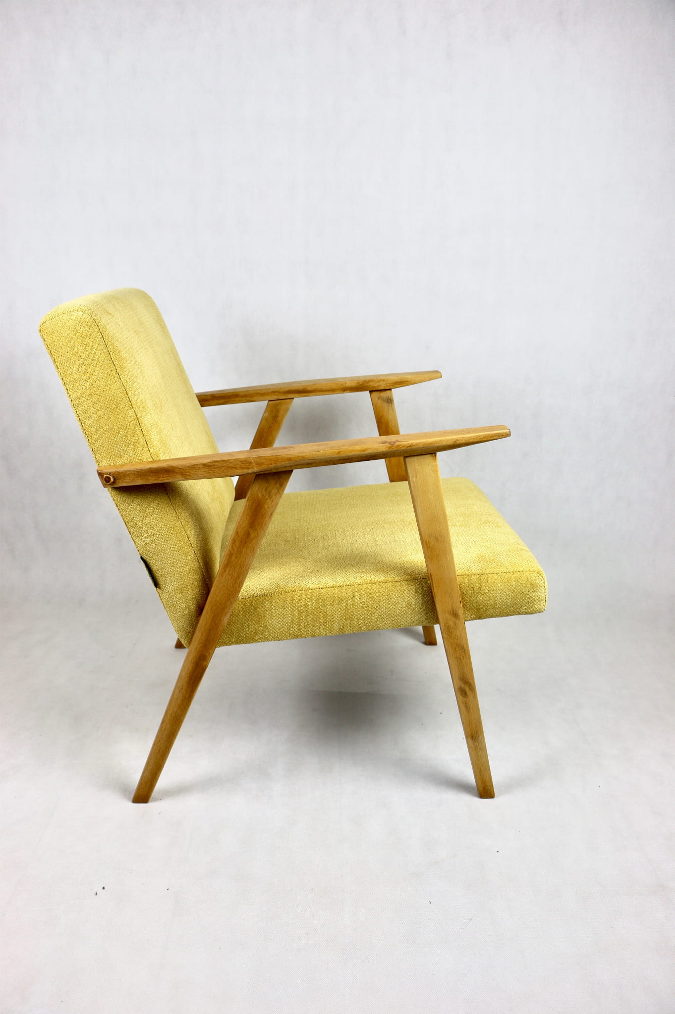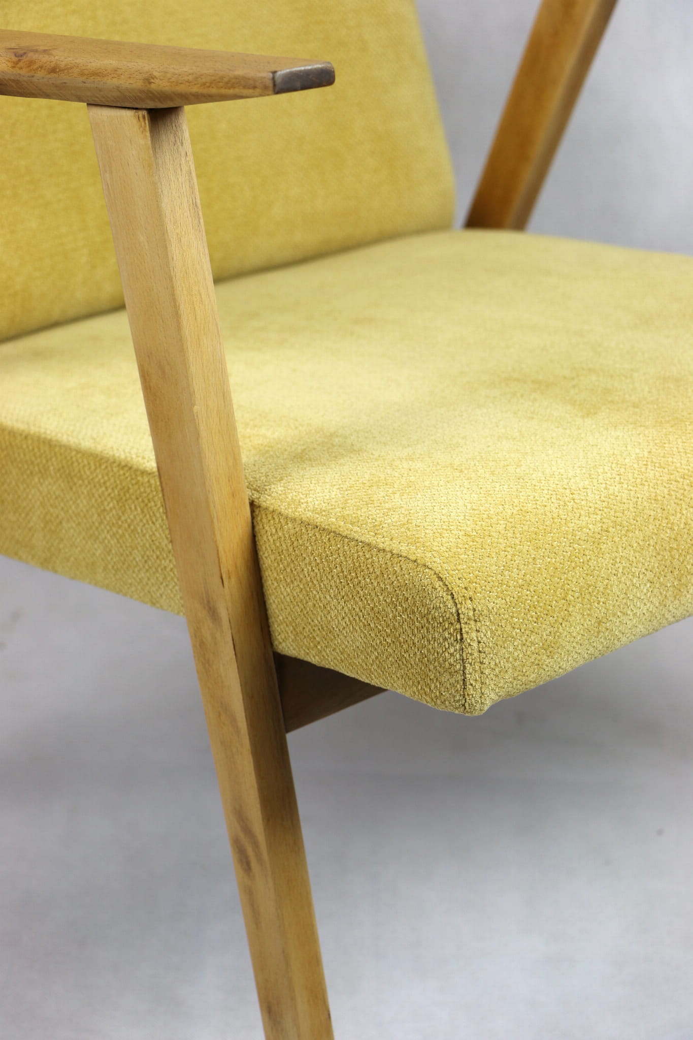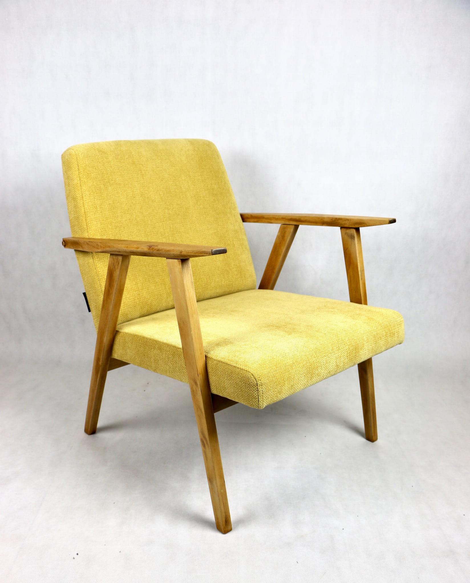 Odrestaurowany fotel Vintage pokryty strukturalnym materiałem tapicerskim w żółtym kolorze z serii Vienna. Stelaż drewniany z podłokietnikami w naturalnej kolorystyce drewna. Bardzo wygodny model z 70 lat.