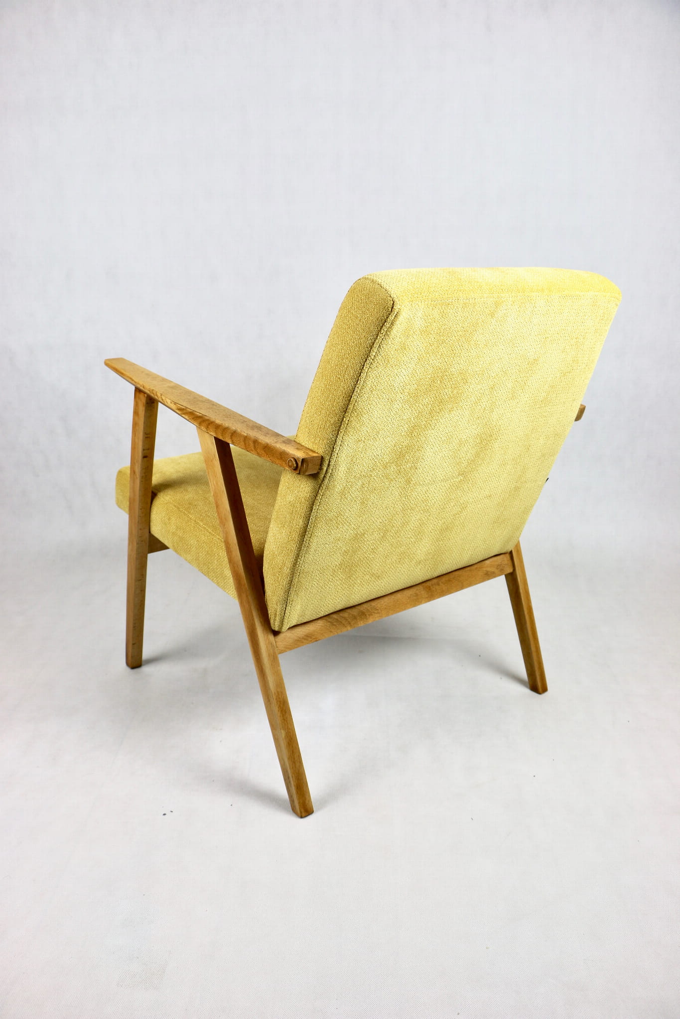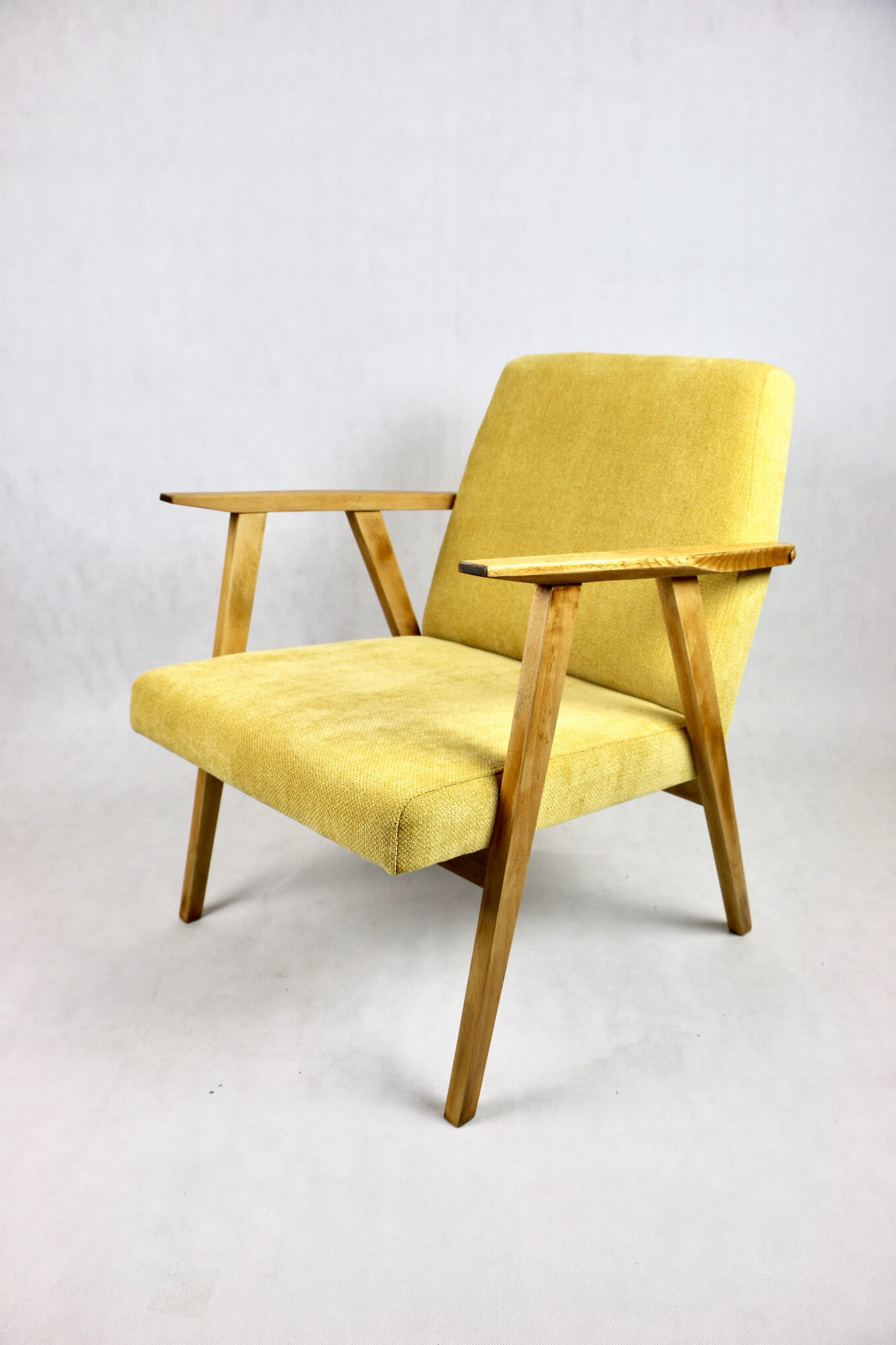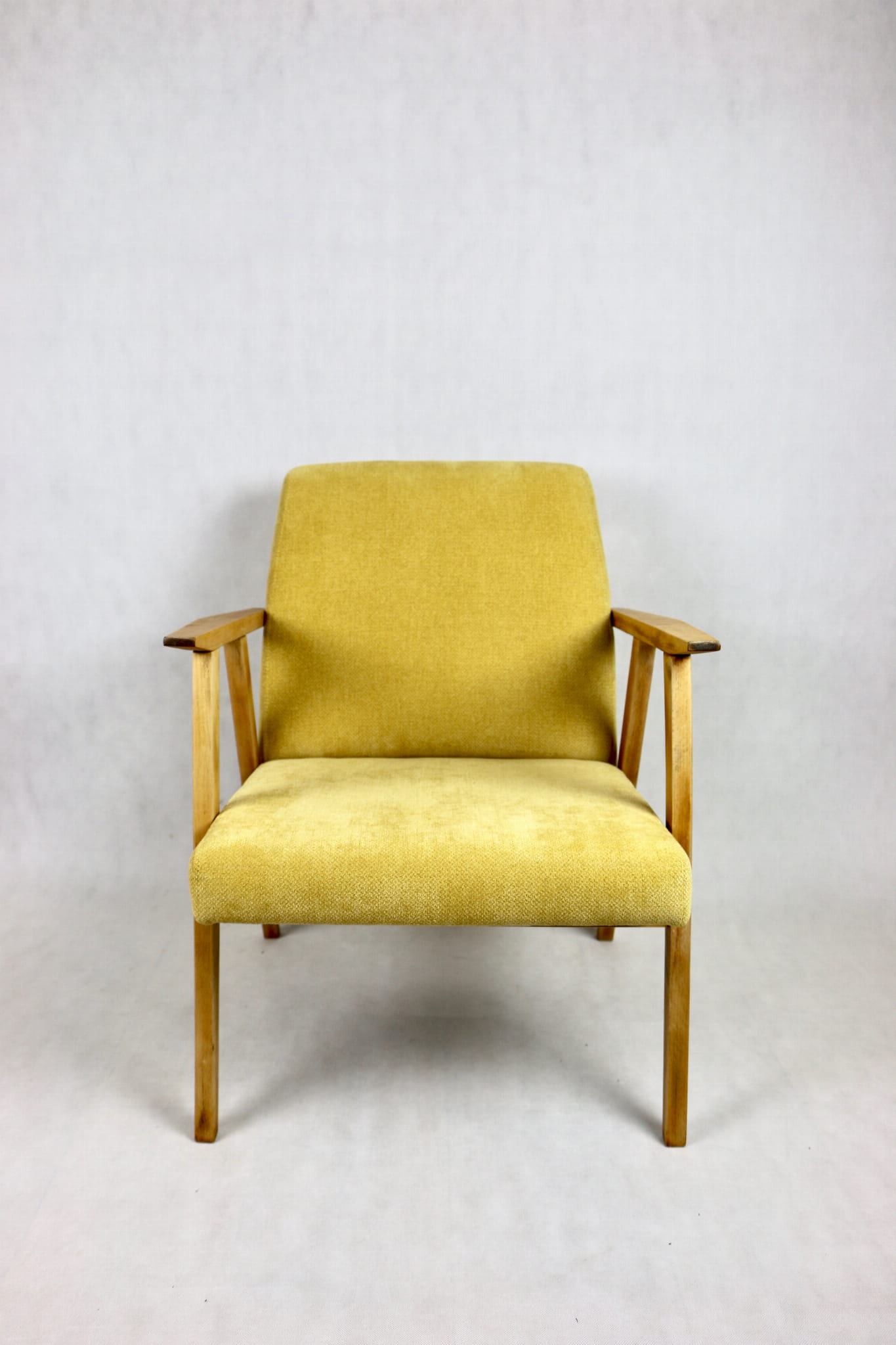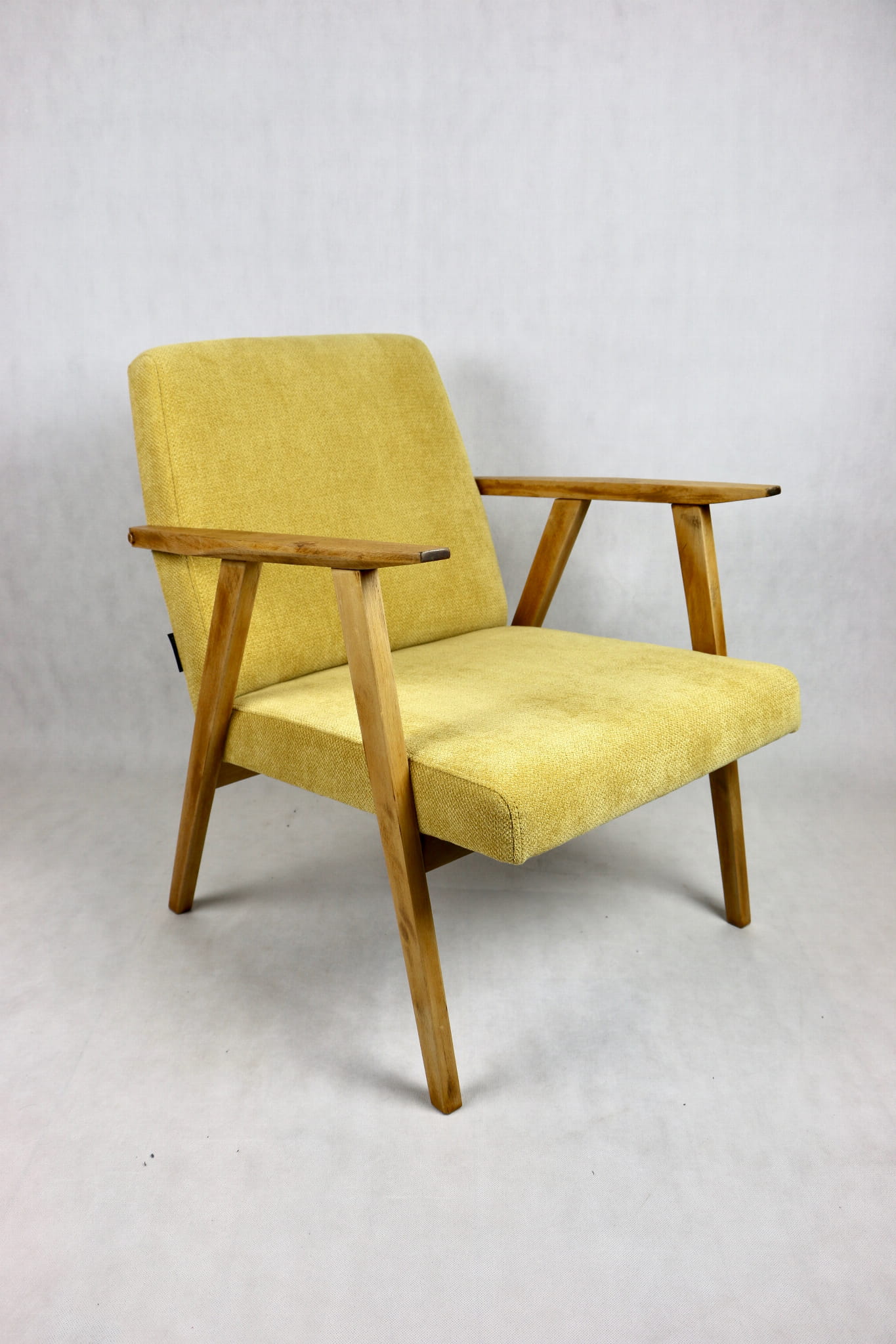 Odrestaurowany fotel Vintage pokryty strukturalnym materiałem tapicerskim w żółtym kolorze z serii Vienna. Stelaż drewniany z podłokietnikami w naturalnej kolorystyce drewna. Bardzo wygodny model z 70 lat.