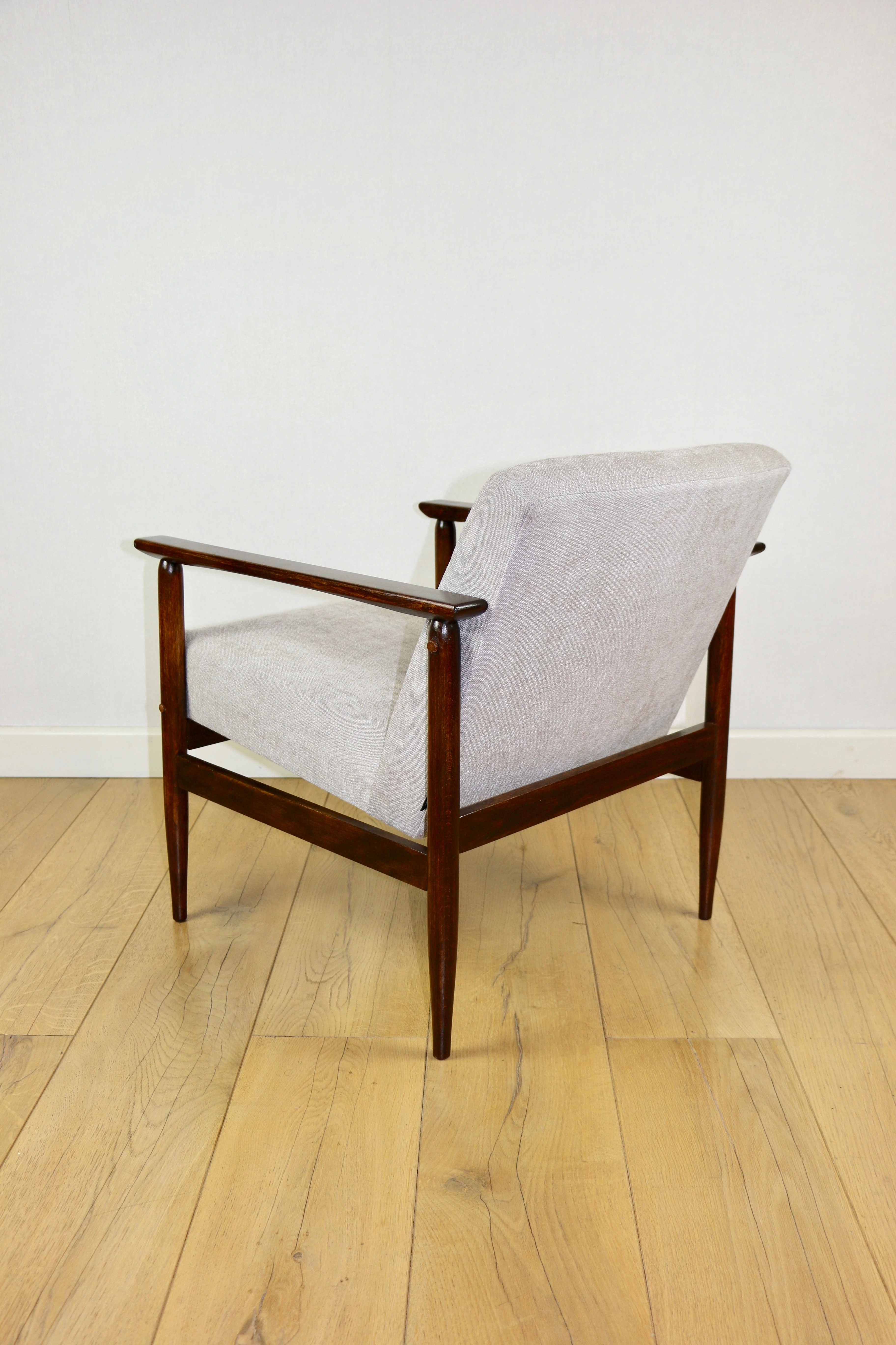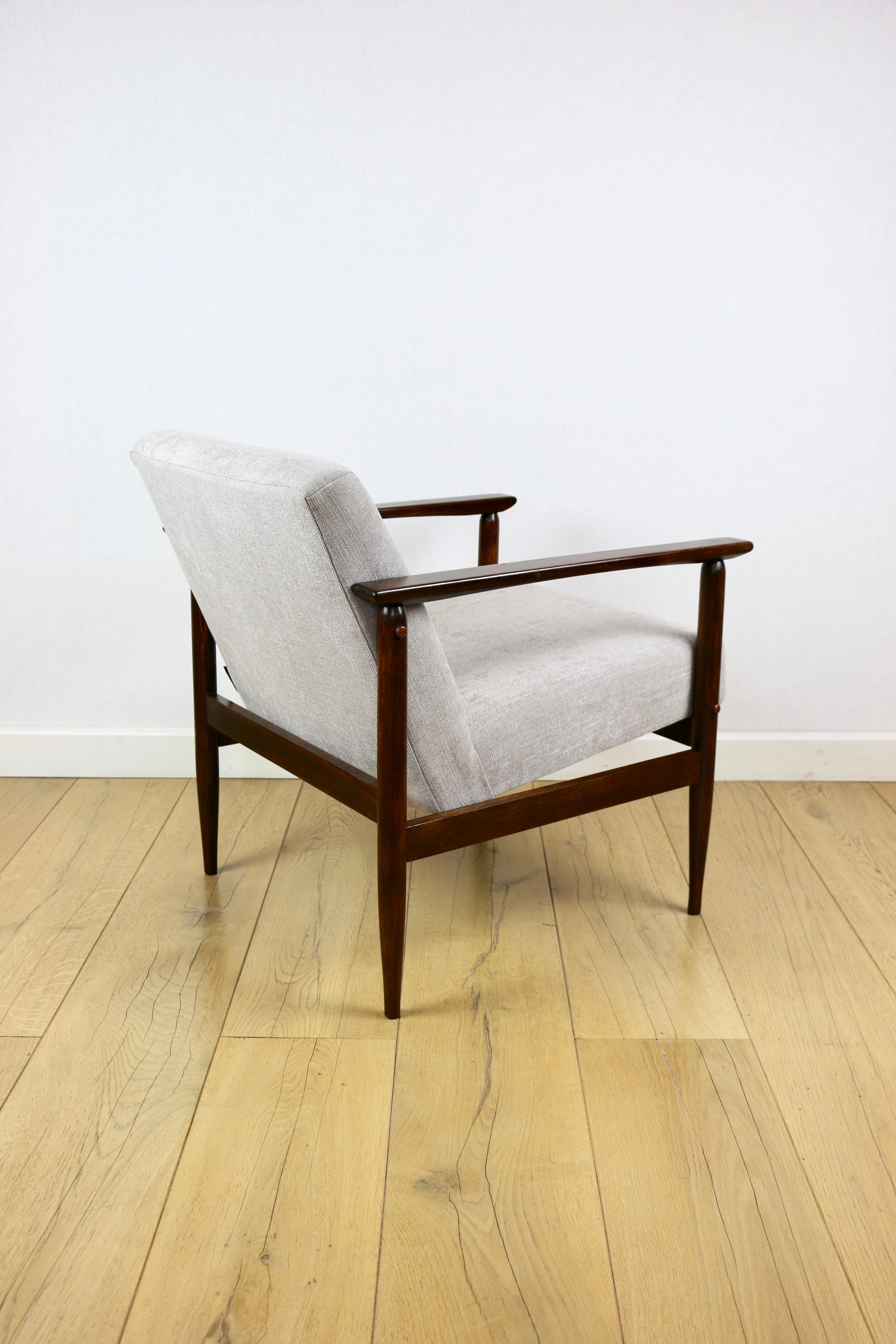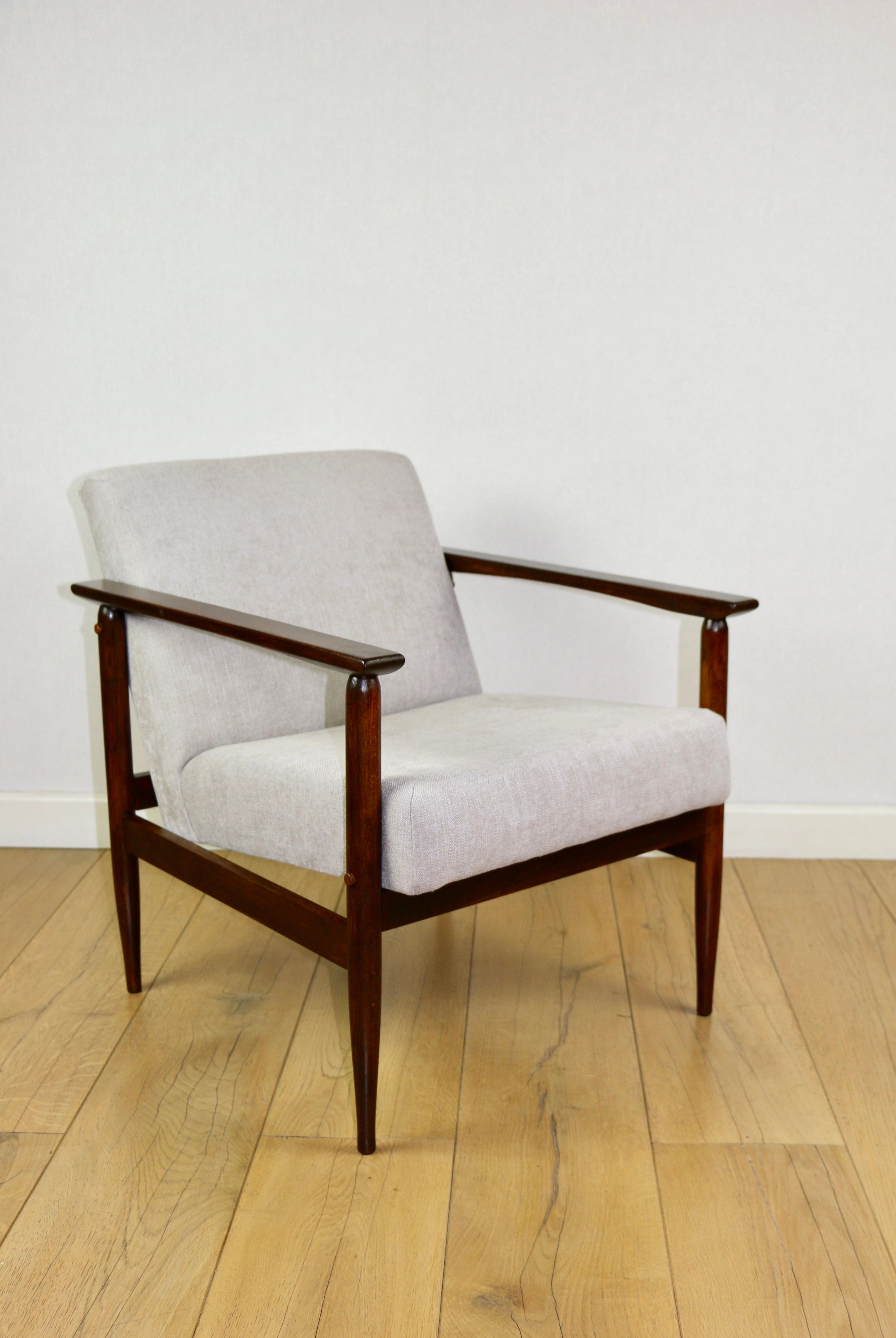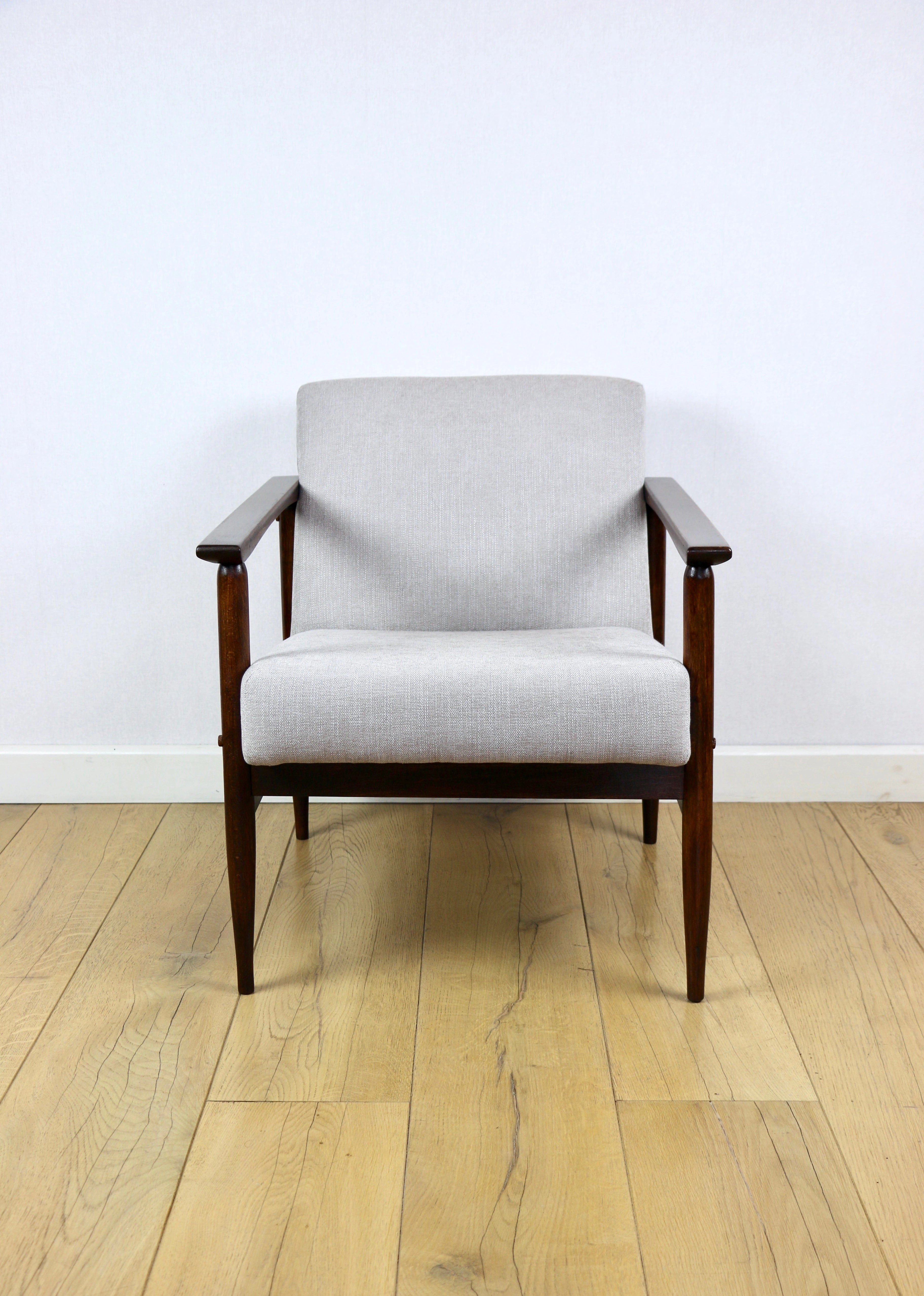 Odrestaurowany fotel Vintage z roku 1970, nowe strukturalne obicie w tkaninie typu Danubio w kolorze jasno-szarym.