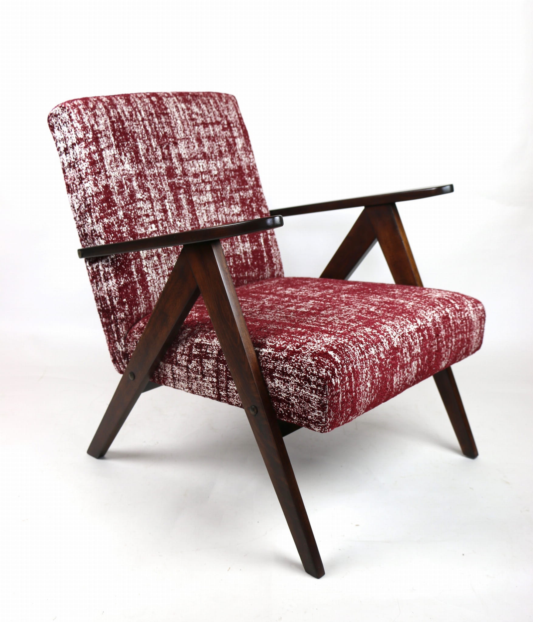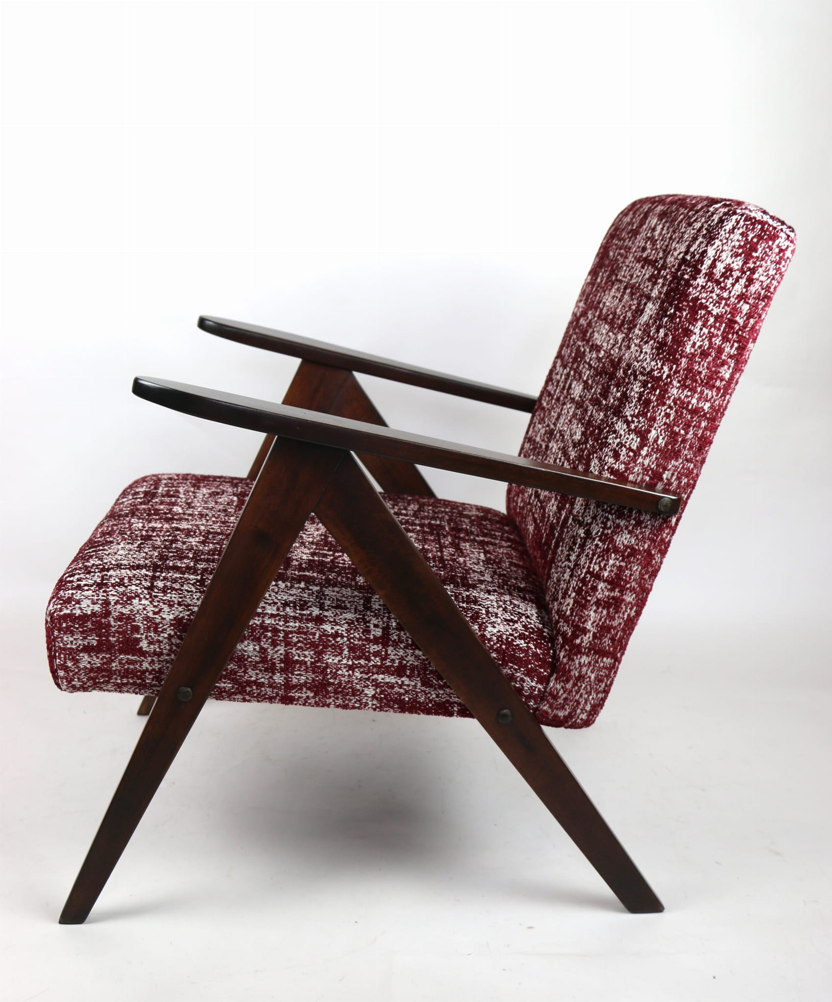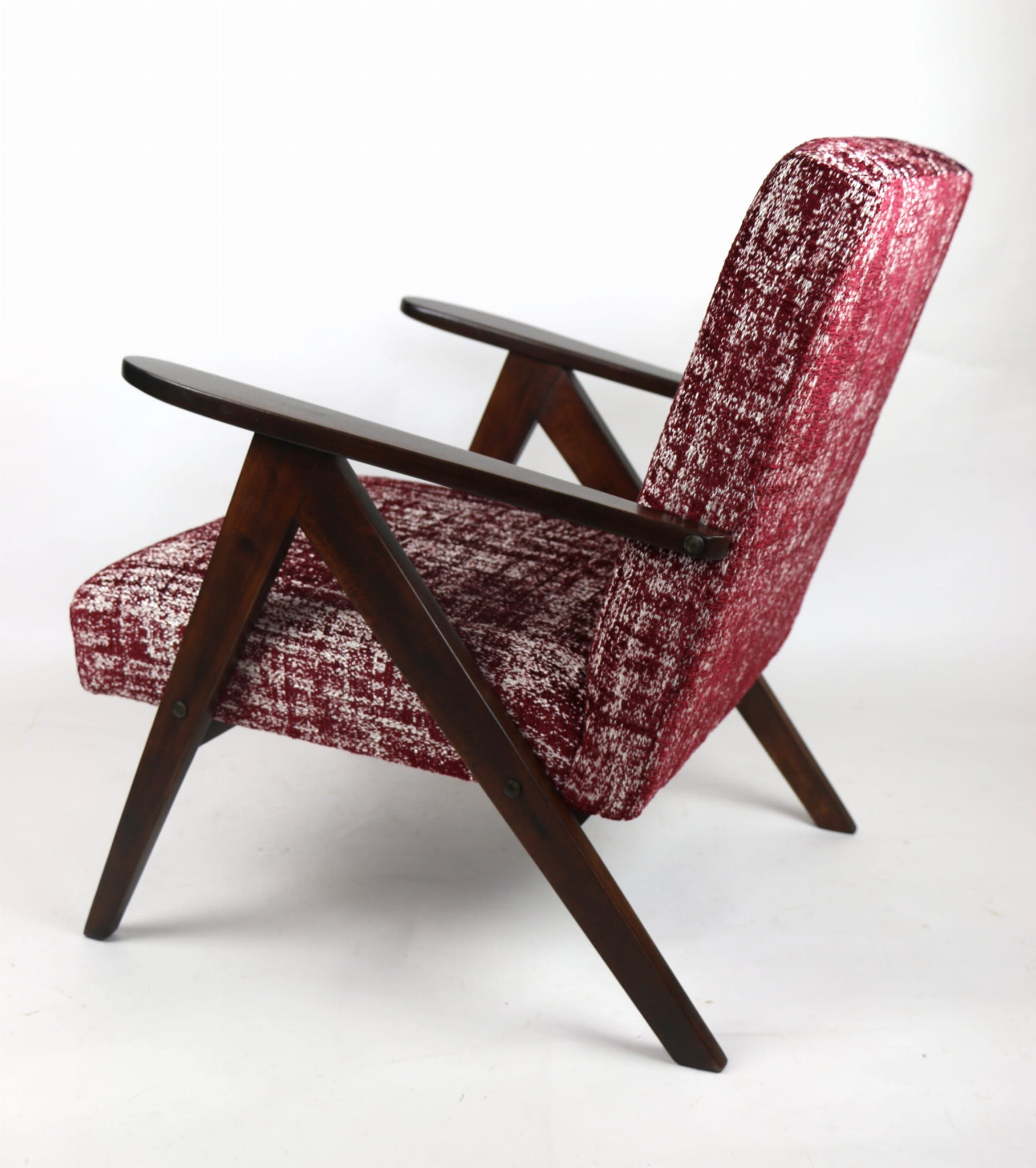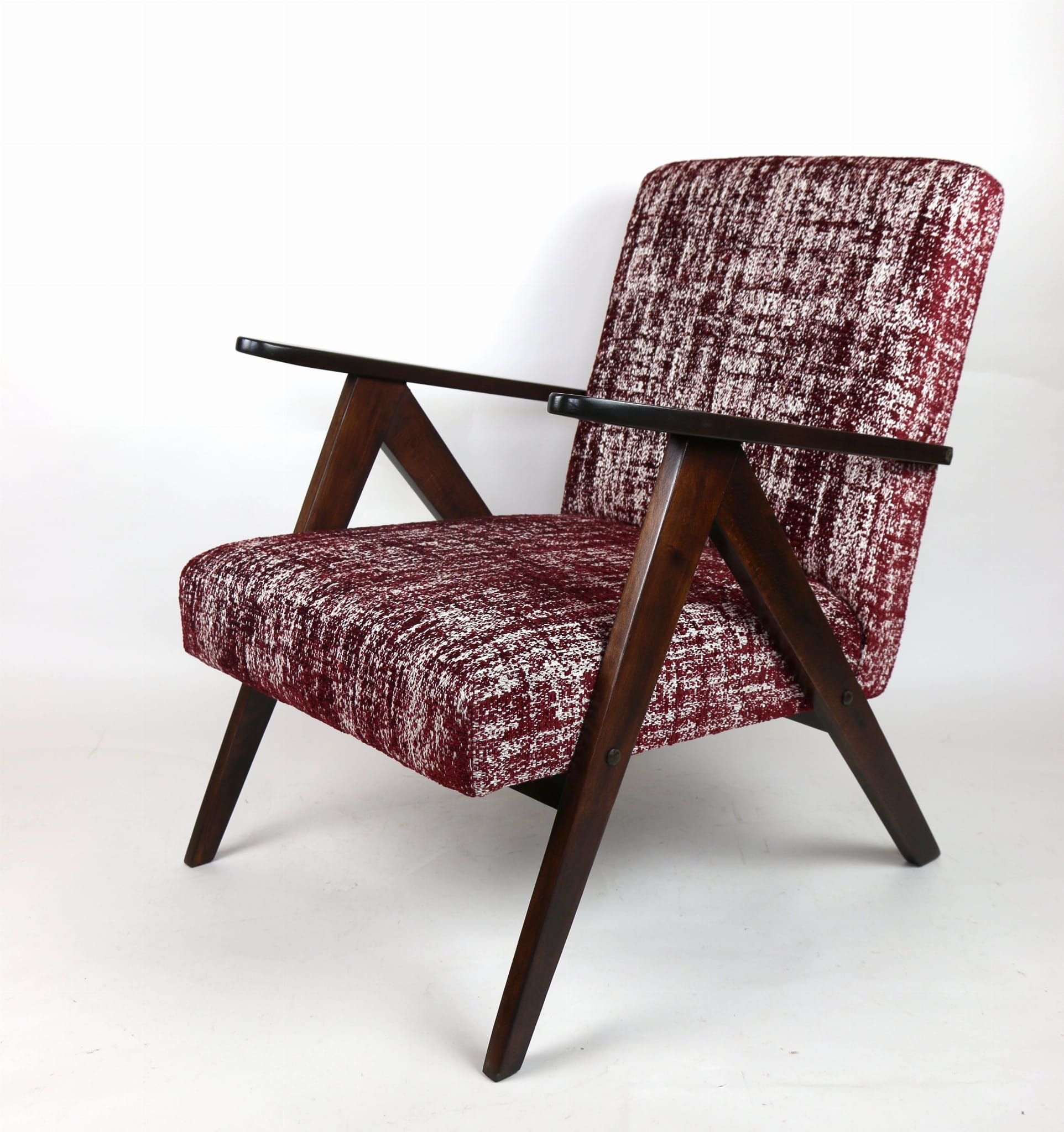 Fotel klasyczny Vintage Var B-310 z lat 70 tych. Odrestaurowany, nowe obicie pokryte materiałem strukturalnym w kolorze bordowym - materiał naturalny. Siedzisko bardzo wygodne, stelaż drewniany połączony z podłokietnikami w ciemnej kolorystyce drewna bukowego.