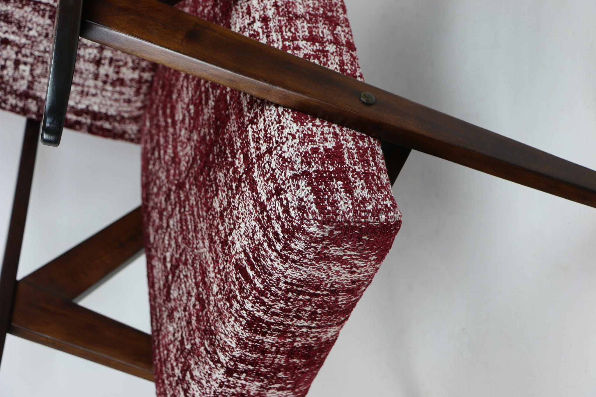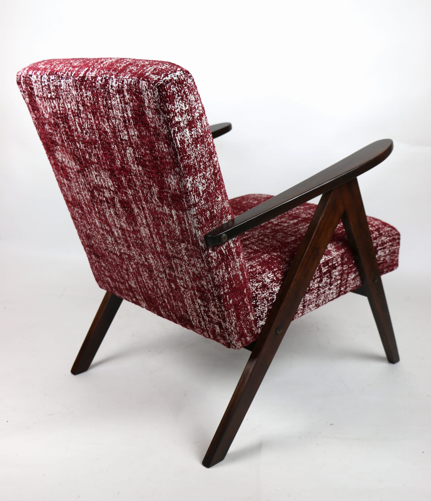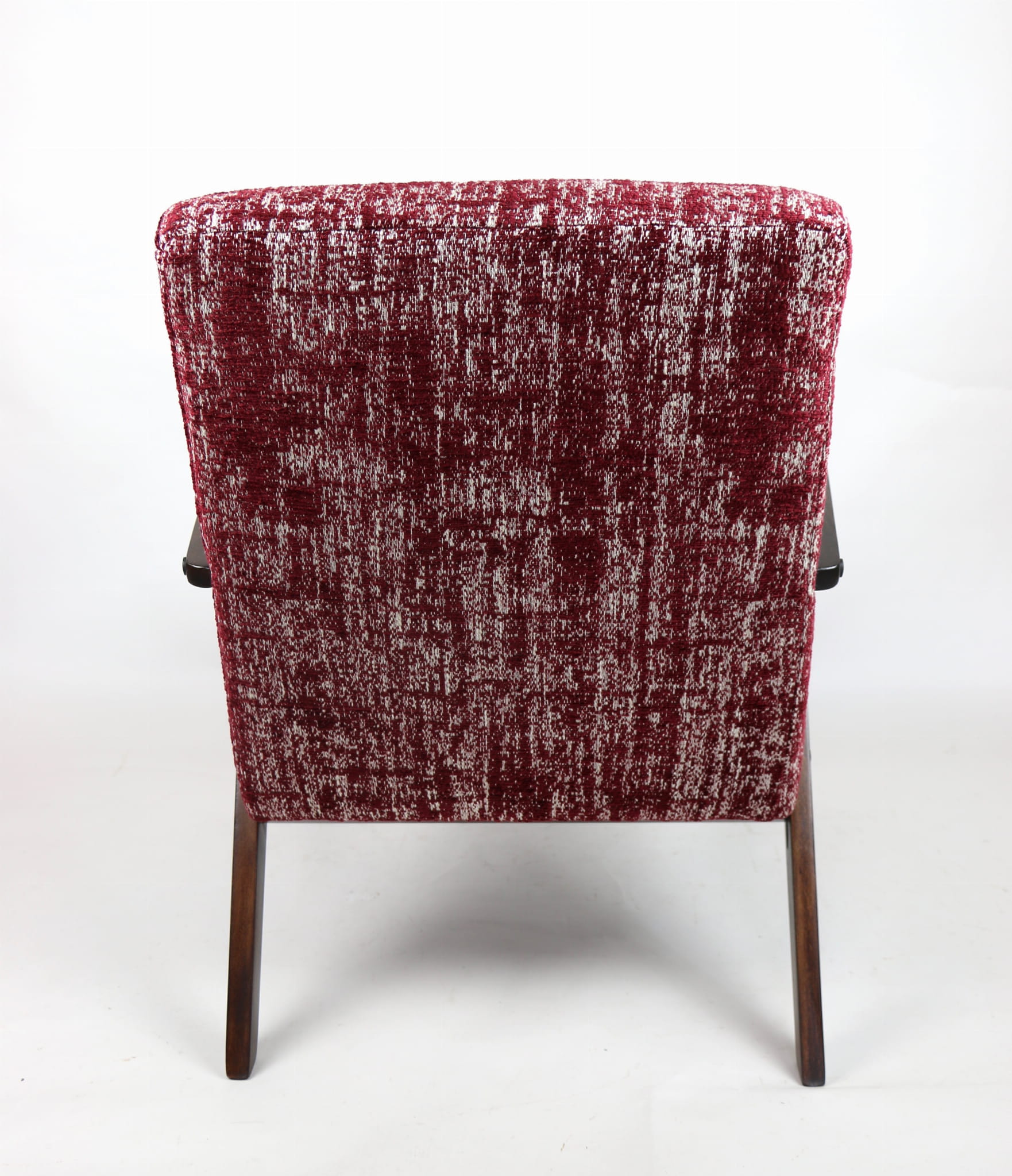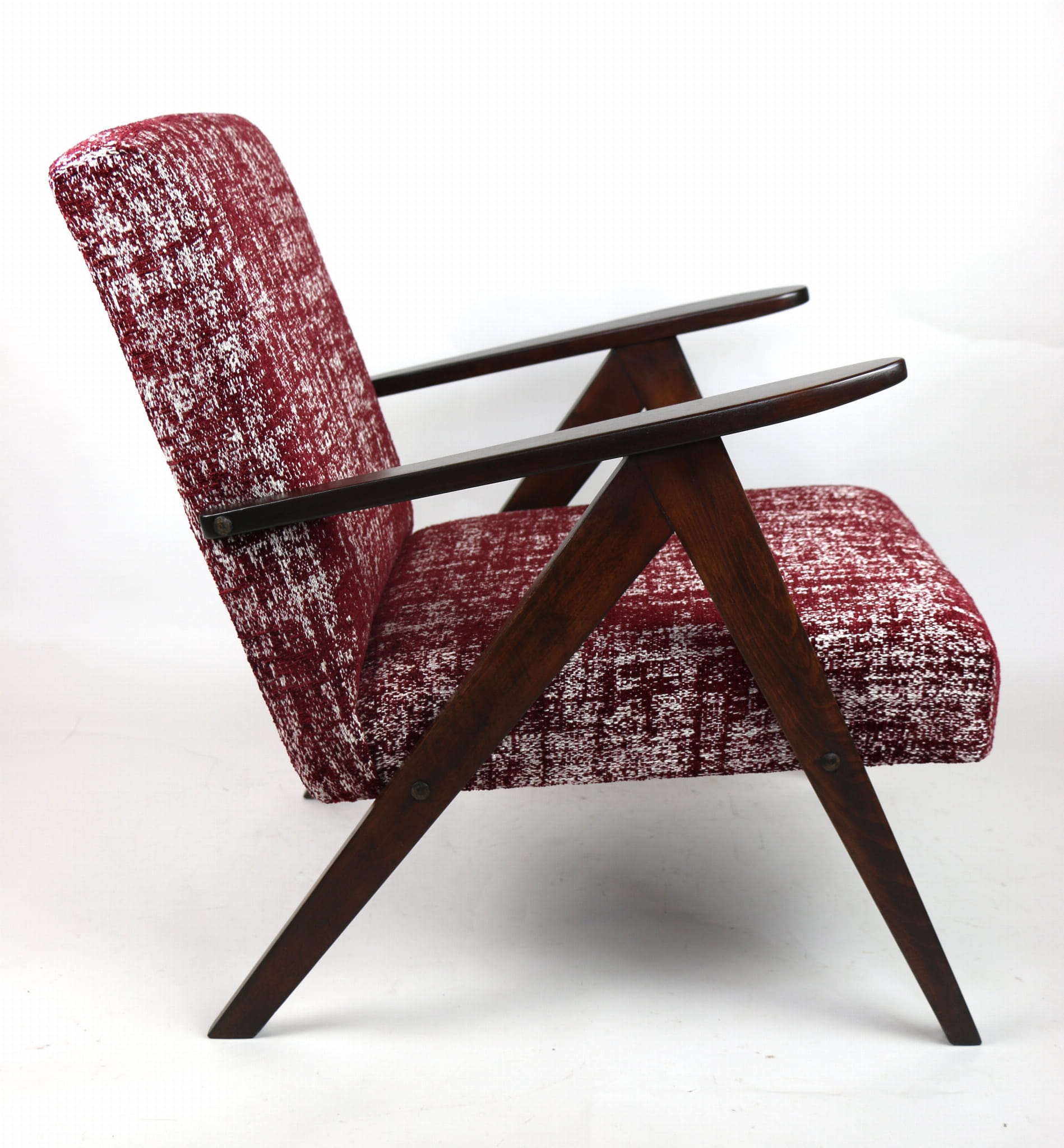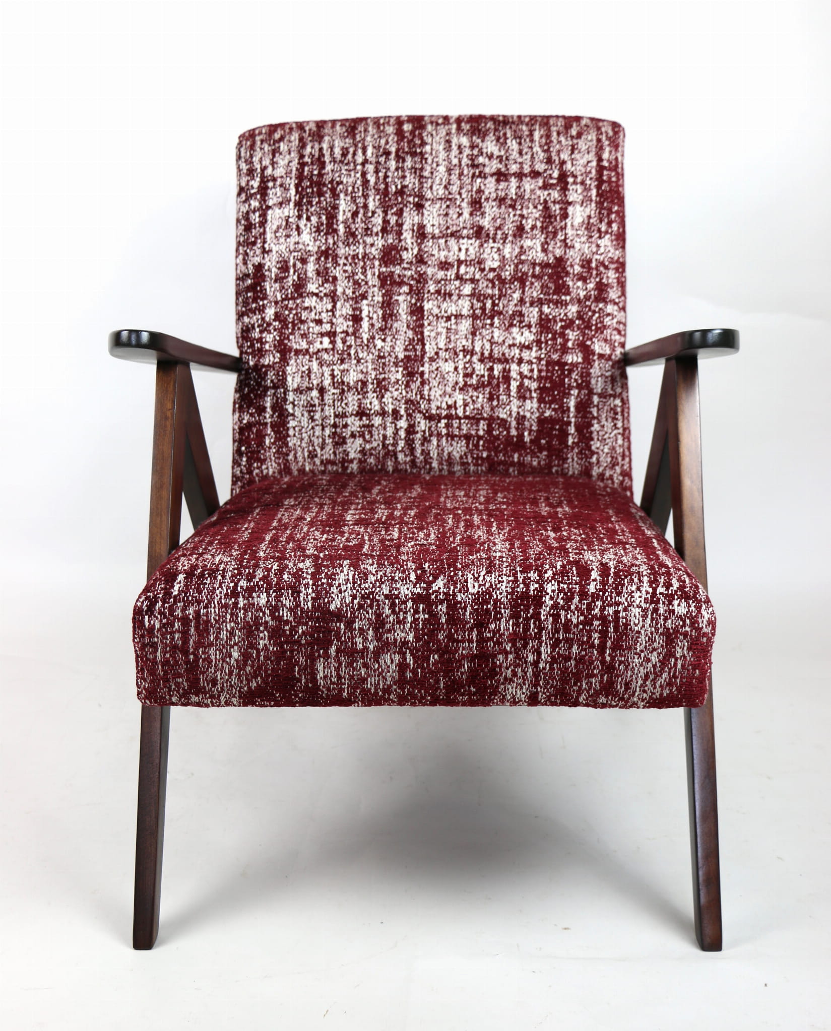 Fotel klasyczny Vintage Var B-310 z lat 70 tych. Odrestaurowany, nowe obicie pokryte materiałem strukturalnym w kolorze bordowym - materiał naturalny. Siedzisko bardzo wygodne, stelaż drewniany połączony z podłokietnikami w ciemnej kolorystyce drewna bukowego.