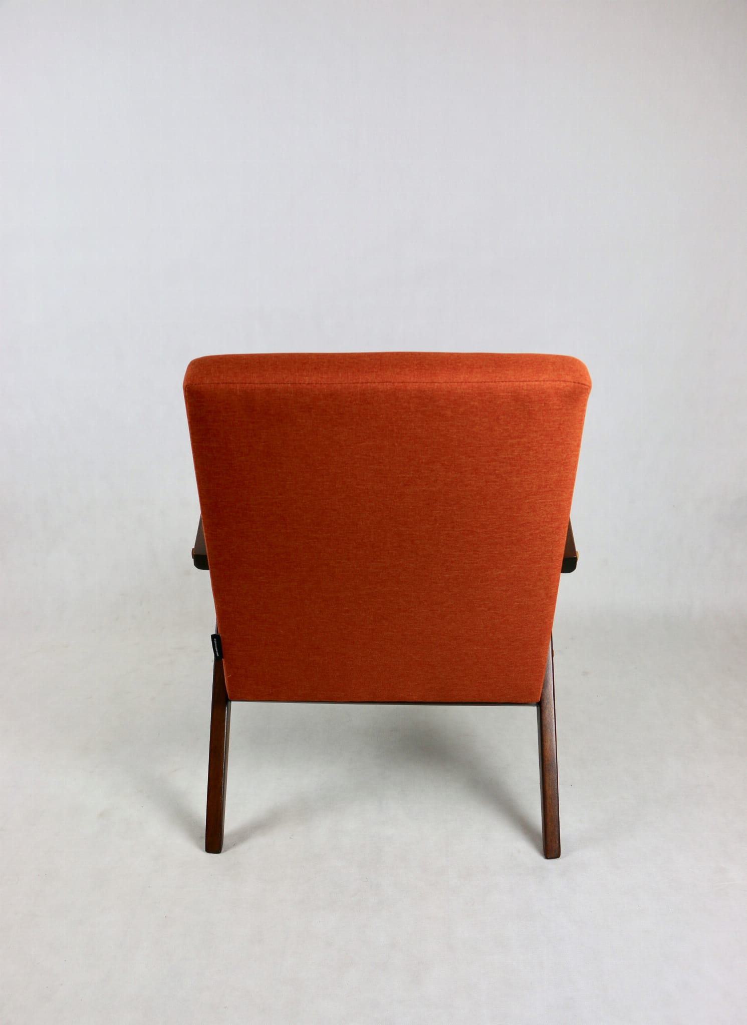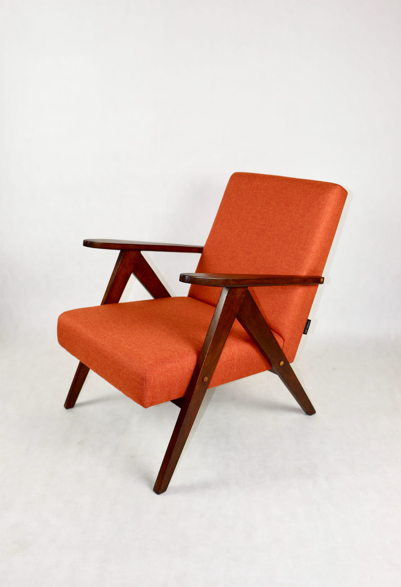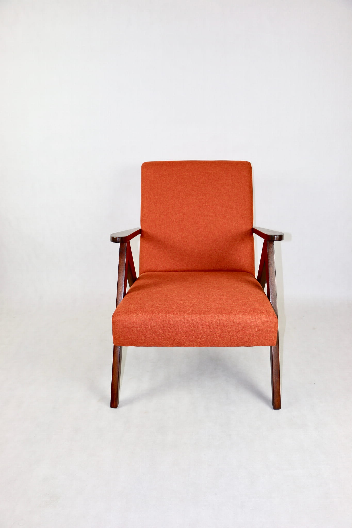 Fotel klasyczny Vintage Var B-310 z lat 70 tych. Odrestaurowany, nowe obicie pokryte materiałem strukturalnym w kolorze pomarańczowo-brązowy. Kolor terakota - ceglasty. Siedzisko bardzo wygodne, stelaż drewniany połączony z podłokietnikami w ciemnej kolorystyce drewna bukowego.