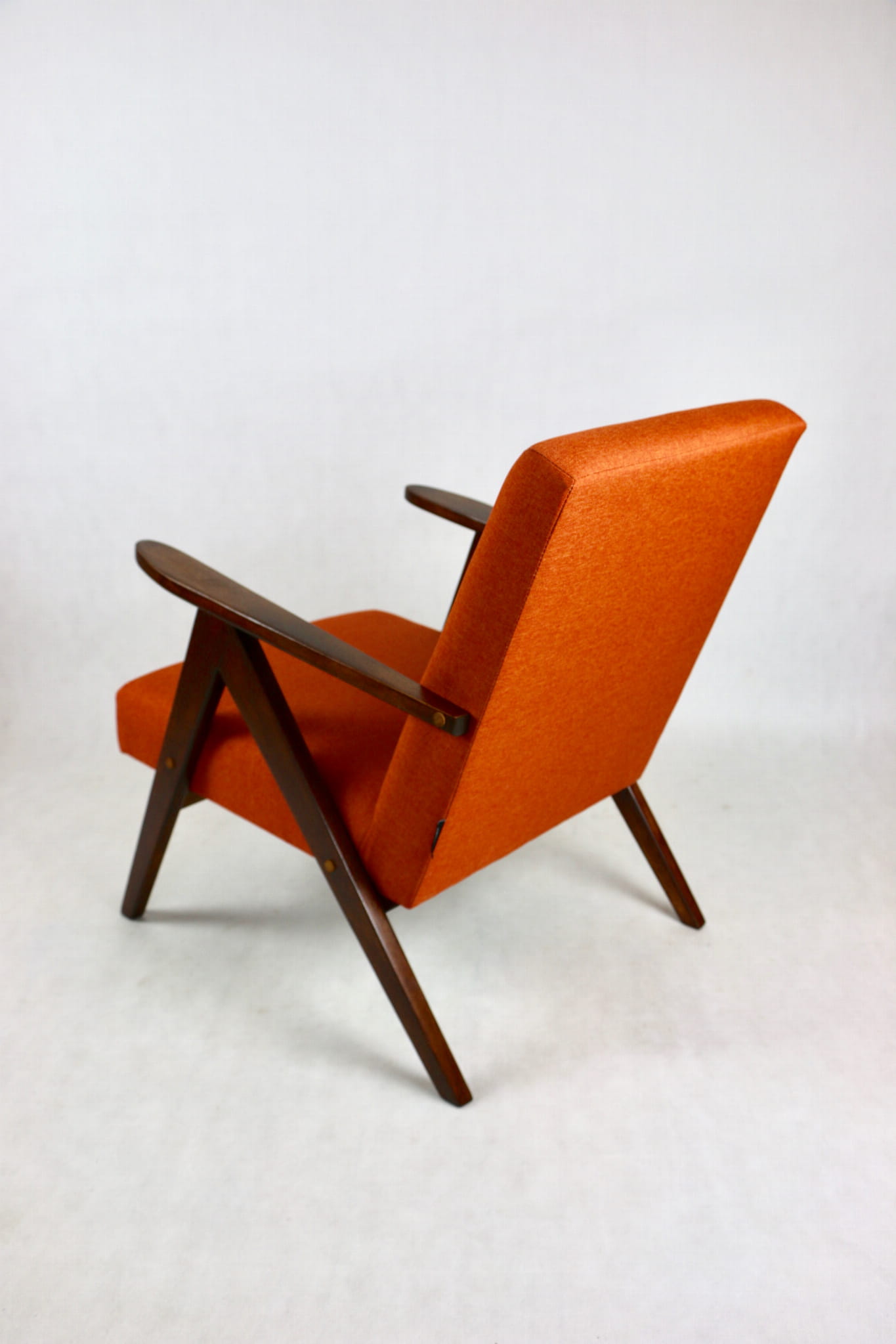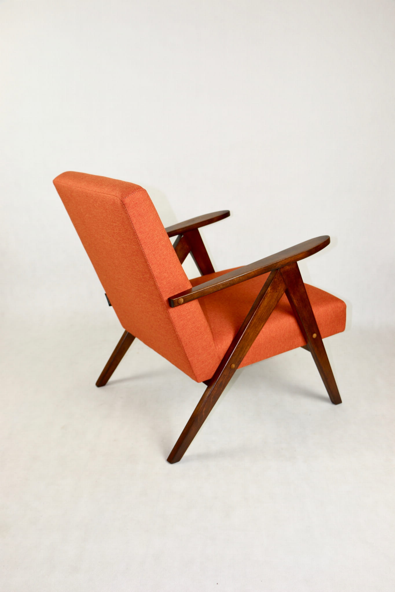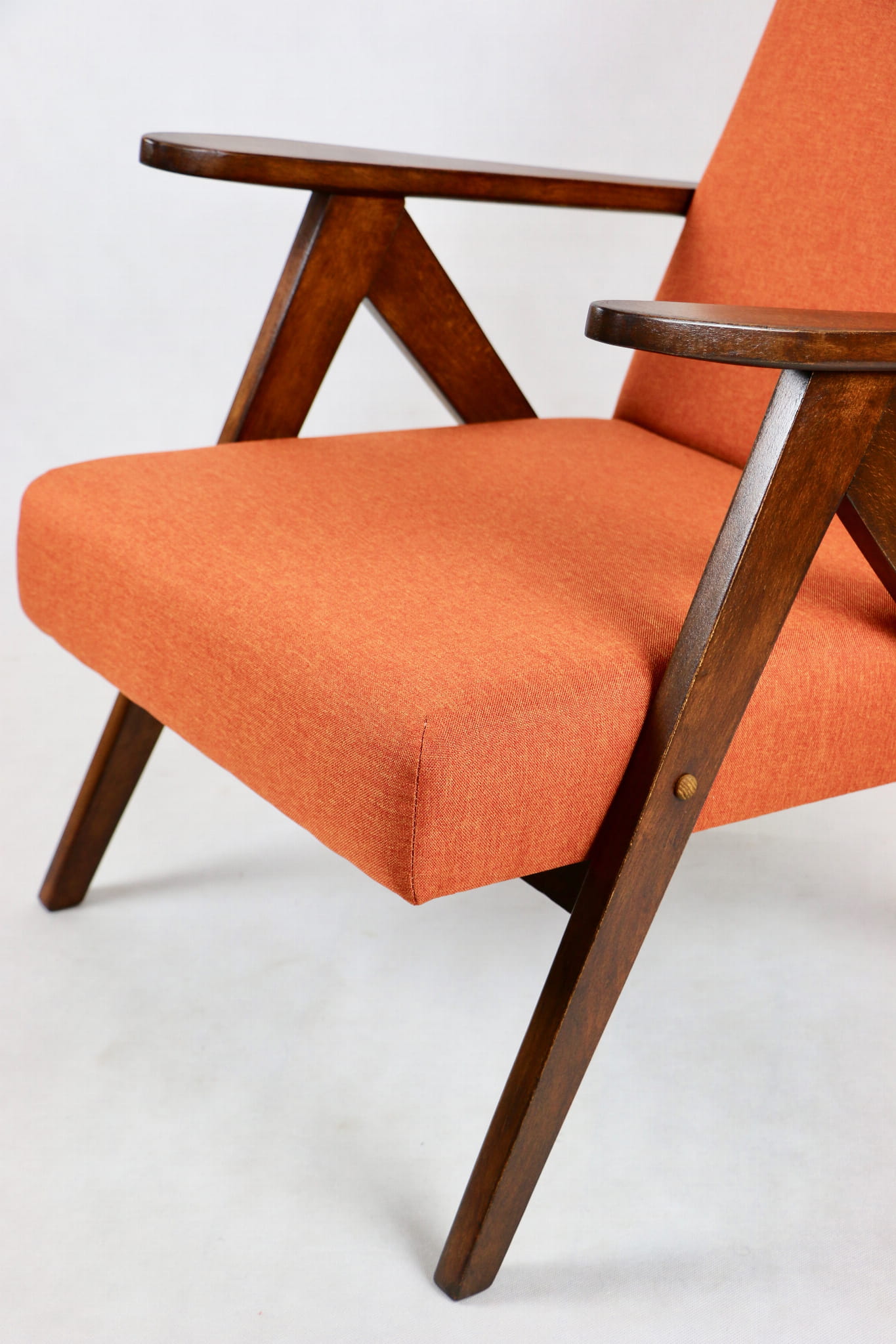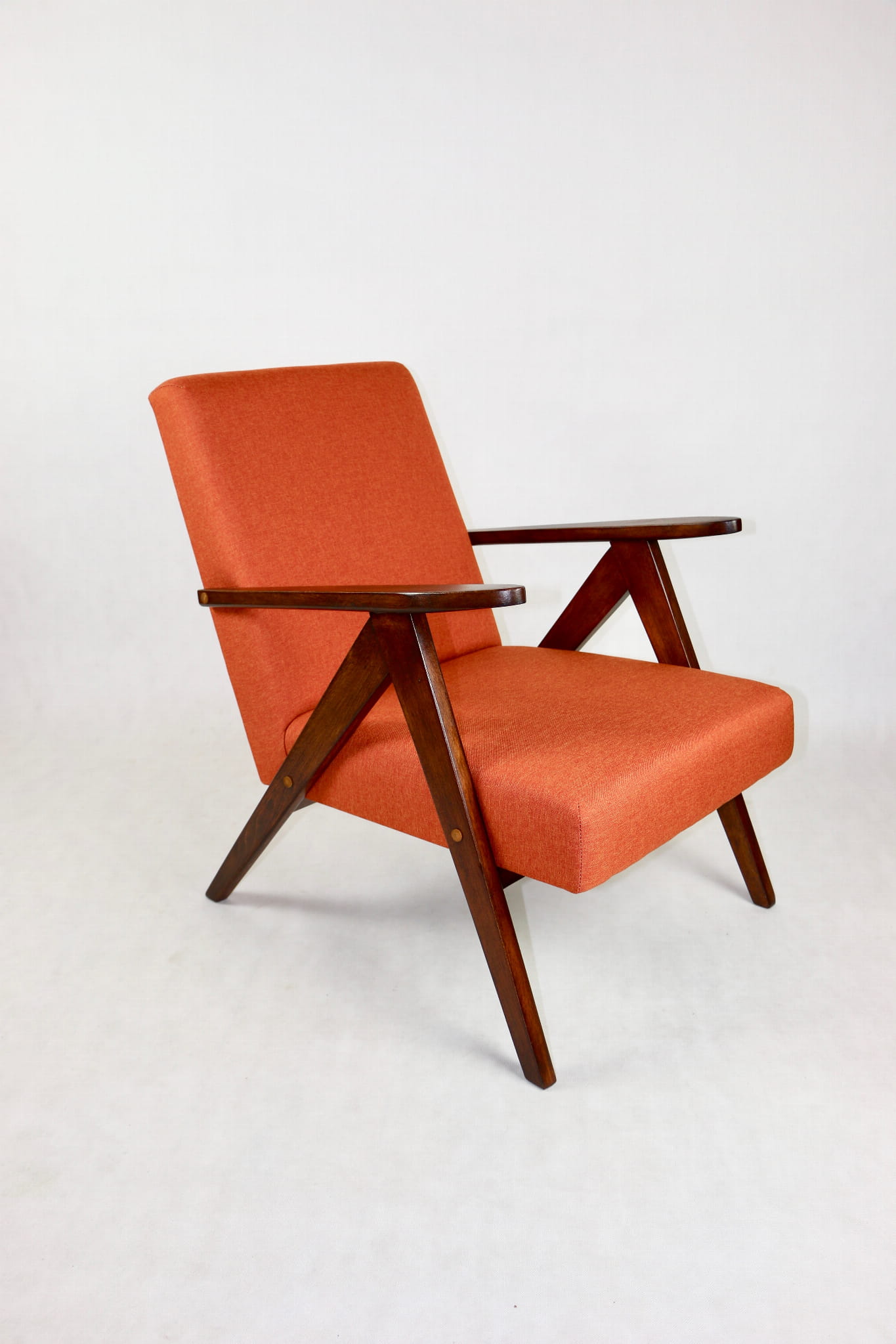 Fotel klasyczny Vintage Var B-310 z lat 70 tych. Odrestaurowany, nowe obicie pokryte materiałem strukturalnym w kolorze pomarańczowo-brązowy. Kolor terakota - ceglasty. Siedzisko bardzo wygodne, stelaż drewniany połączony z podłokietnikami w ciemnej kolorystyce drewna bukowego.