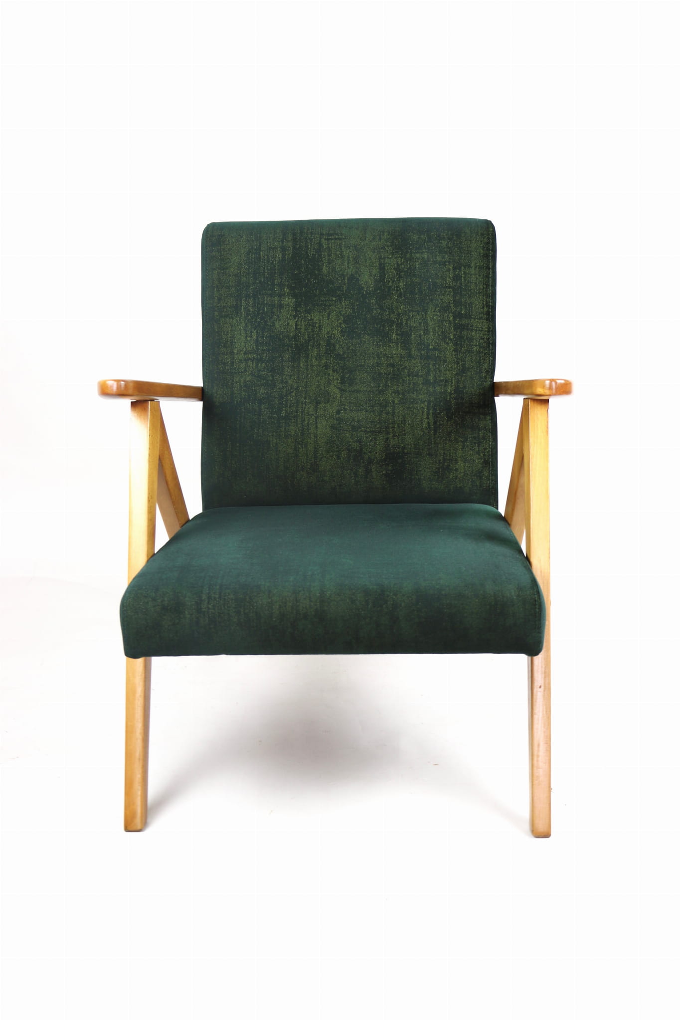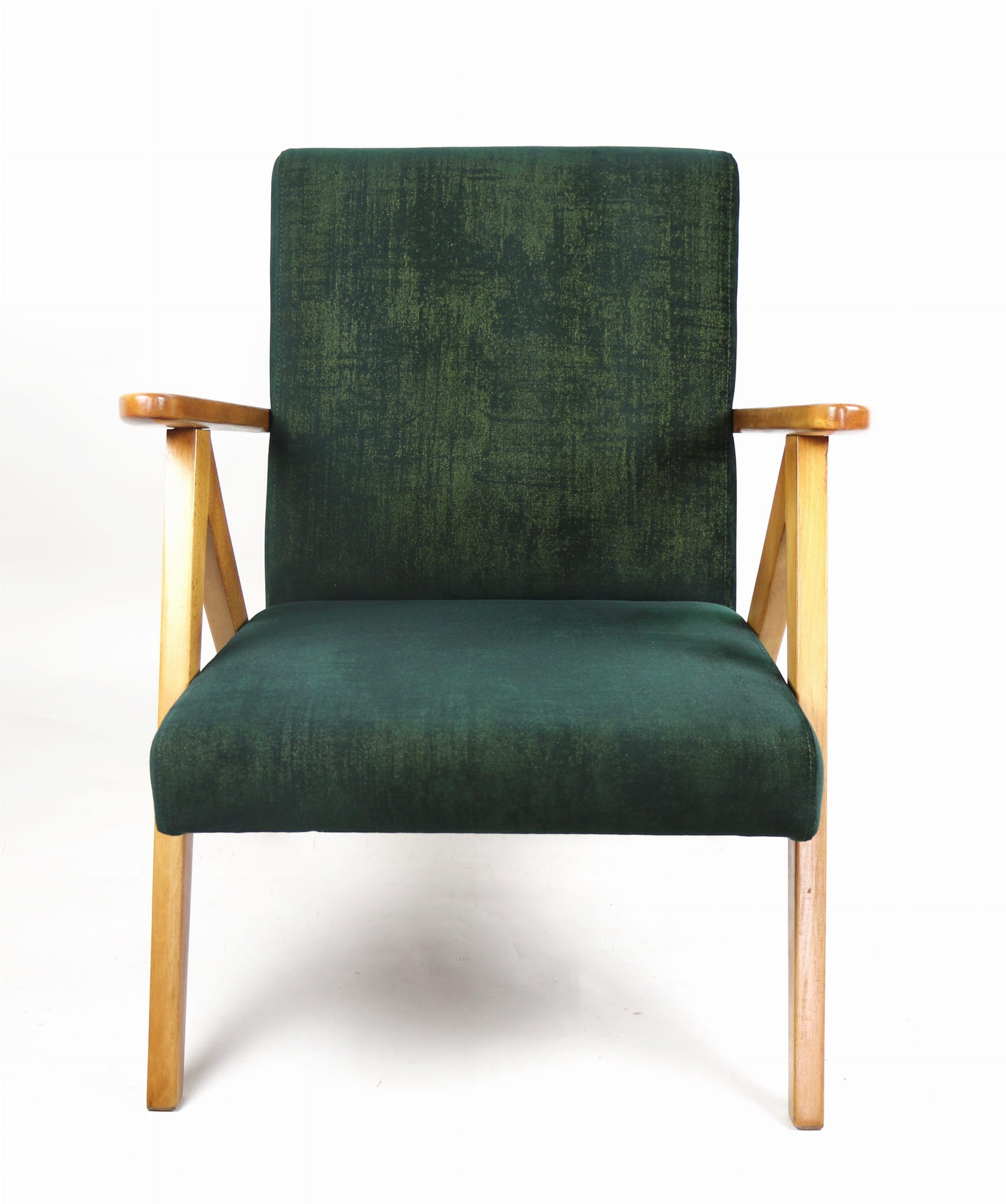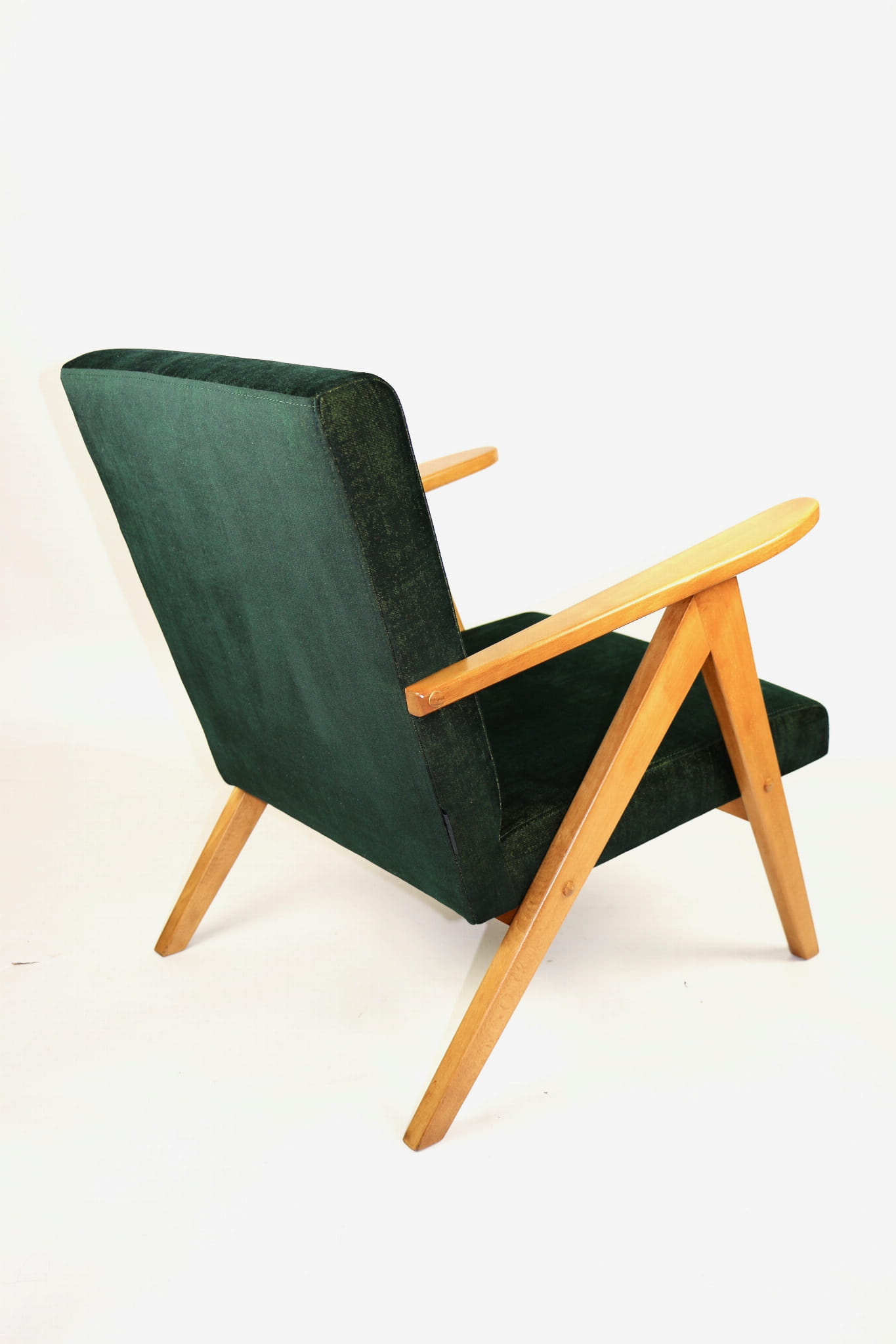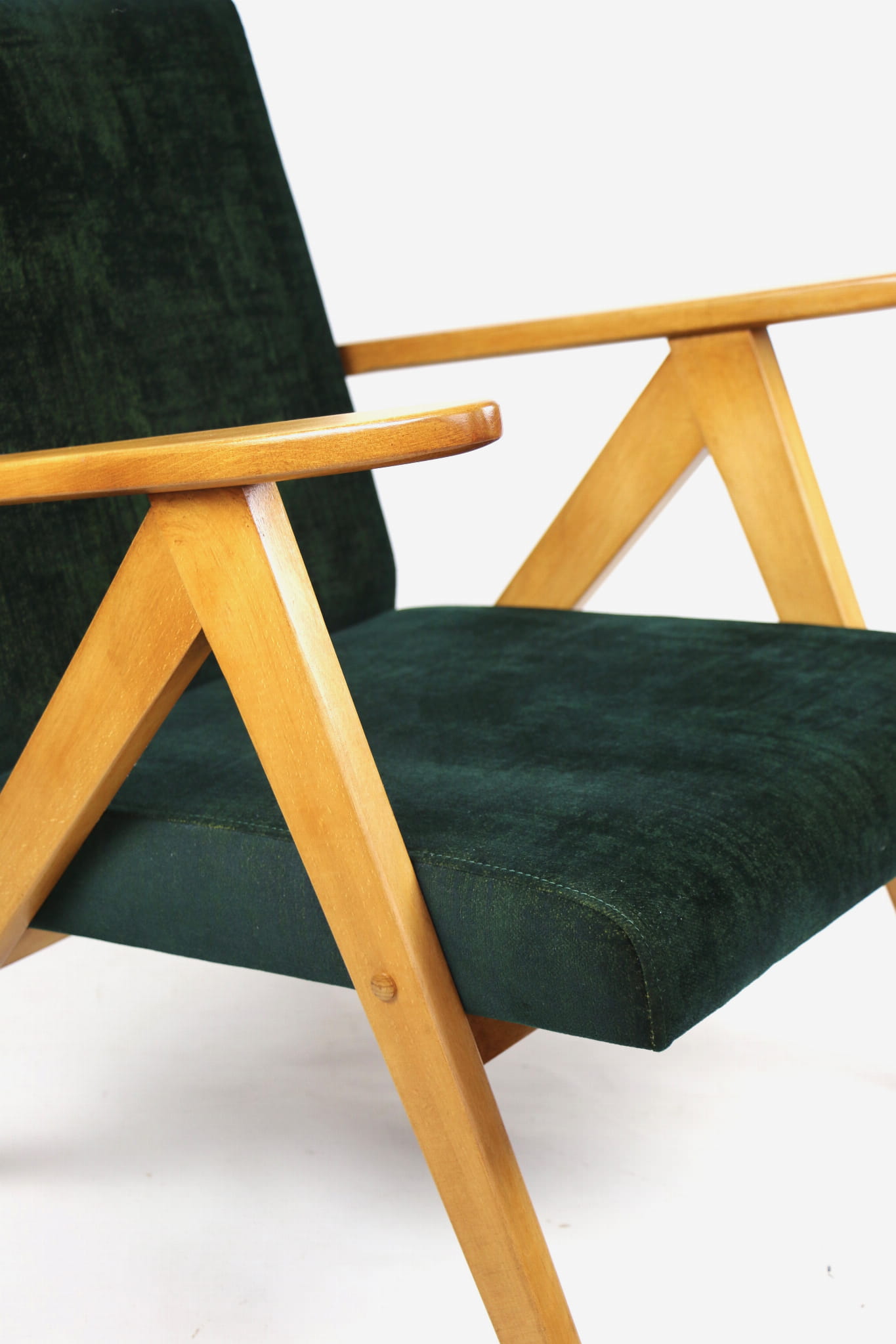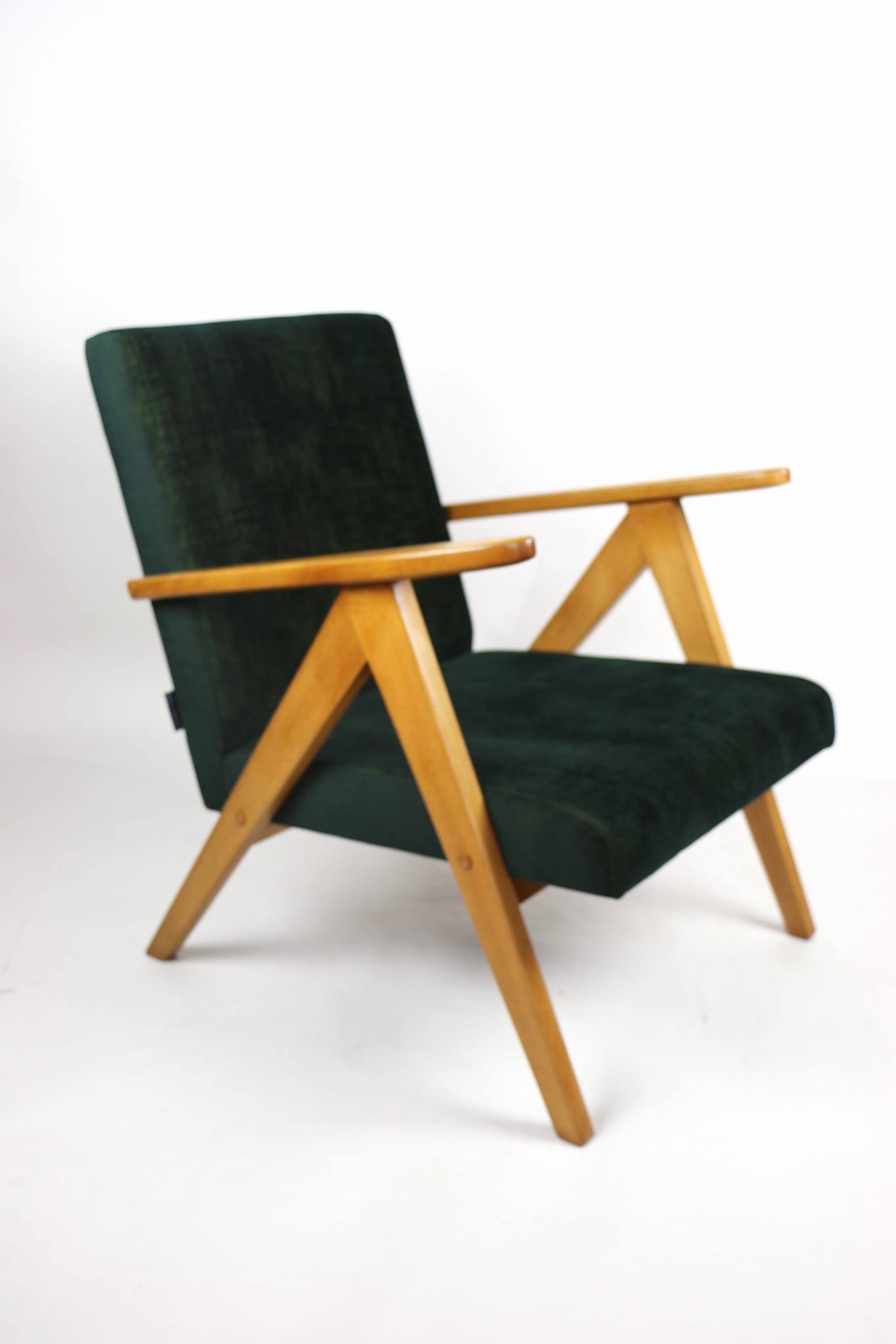 Fotel klasyczny Vintage Var B-310 z lat 70 tych. Odrestaurowany, nowe obicie pokryte aksamitnym materiałem w kolorze zielono-złotym z serii chameleon- materiał strukturalny welwet. Siedzisko bardzo wygodne, stelaż drewniany połączony z podłokietnikami w jasnej kolorystyce drewna.