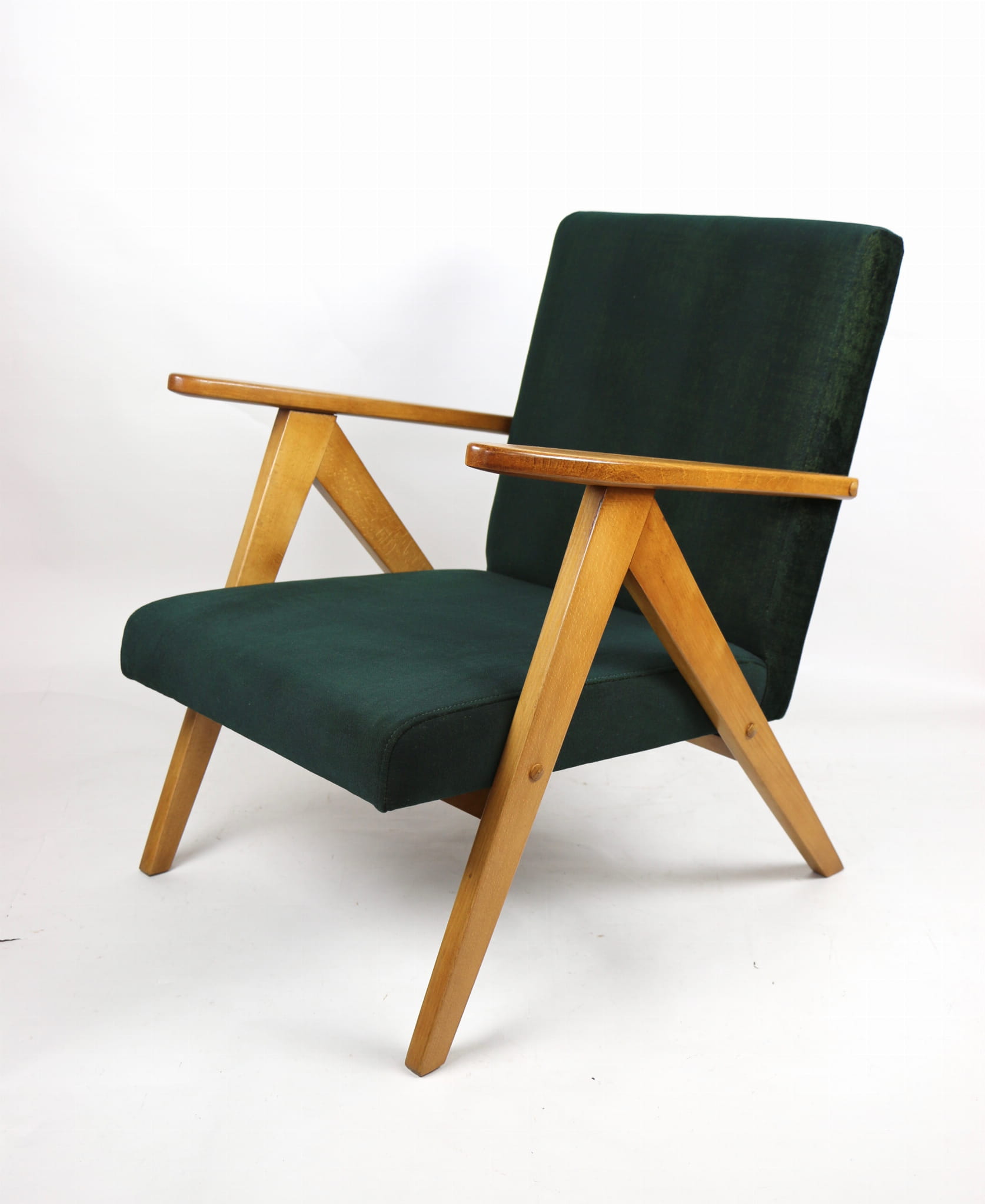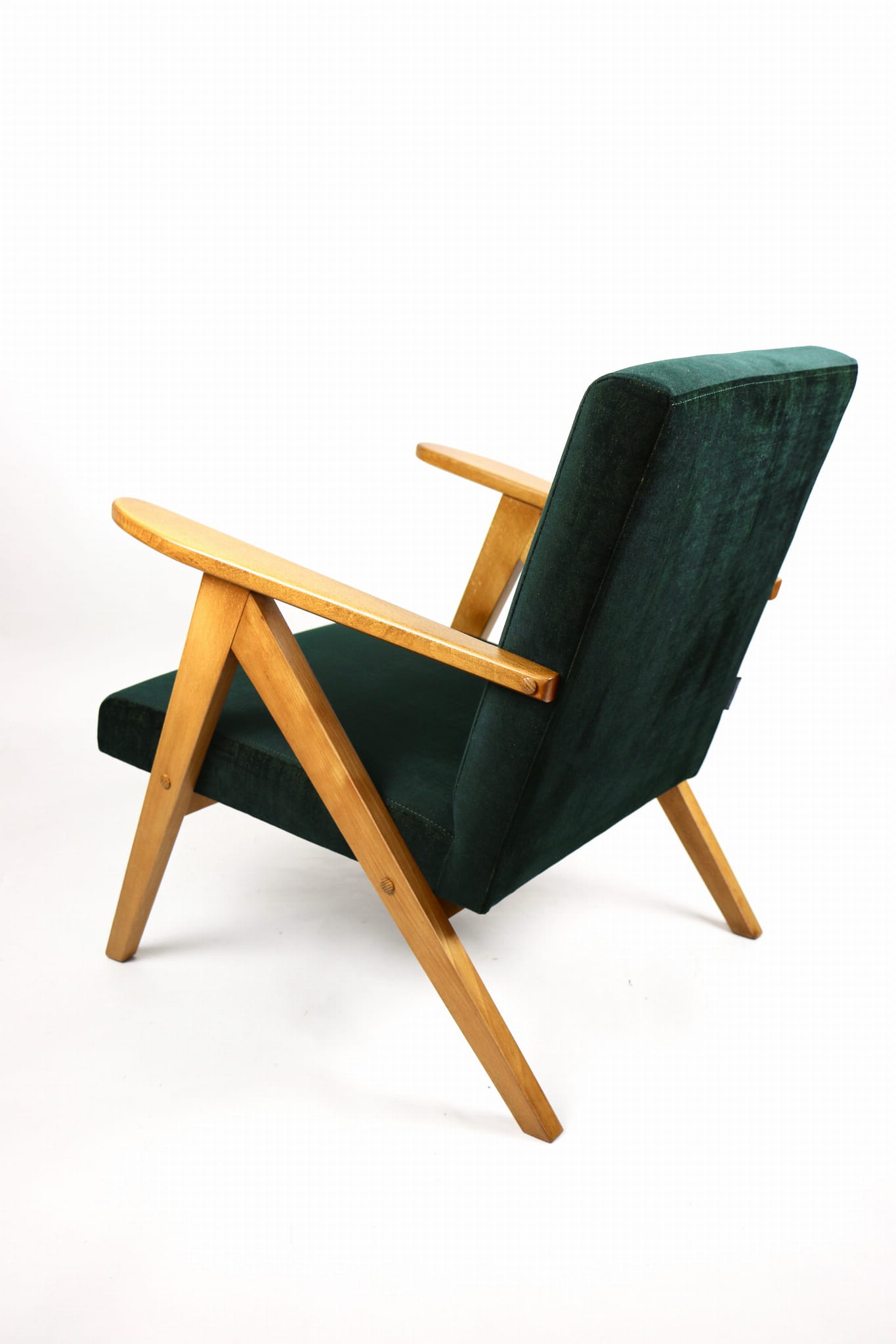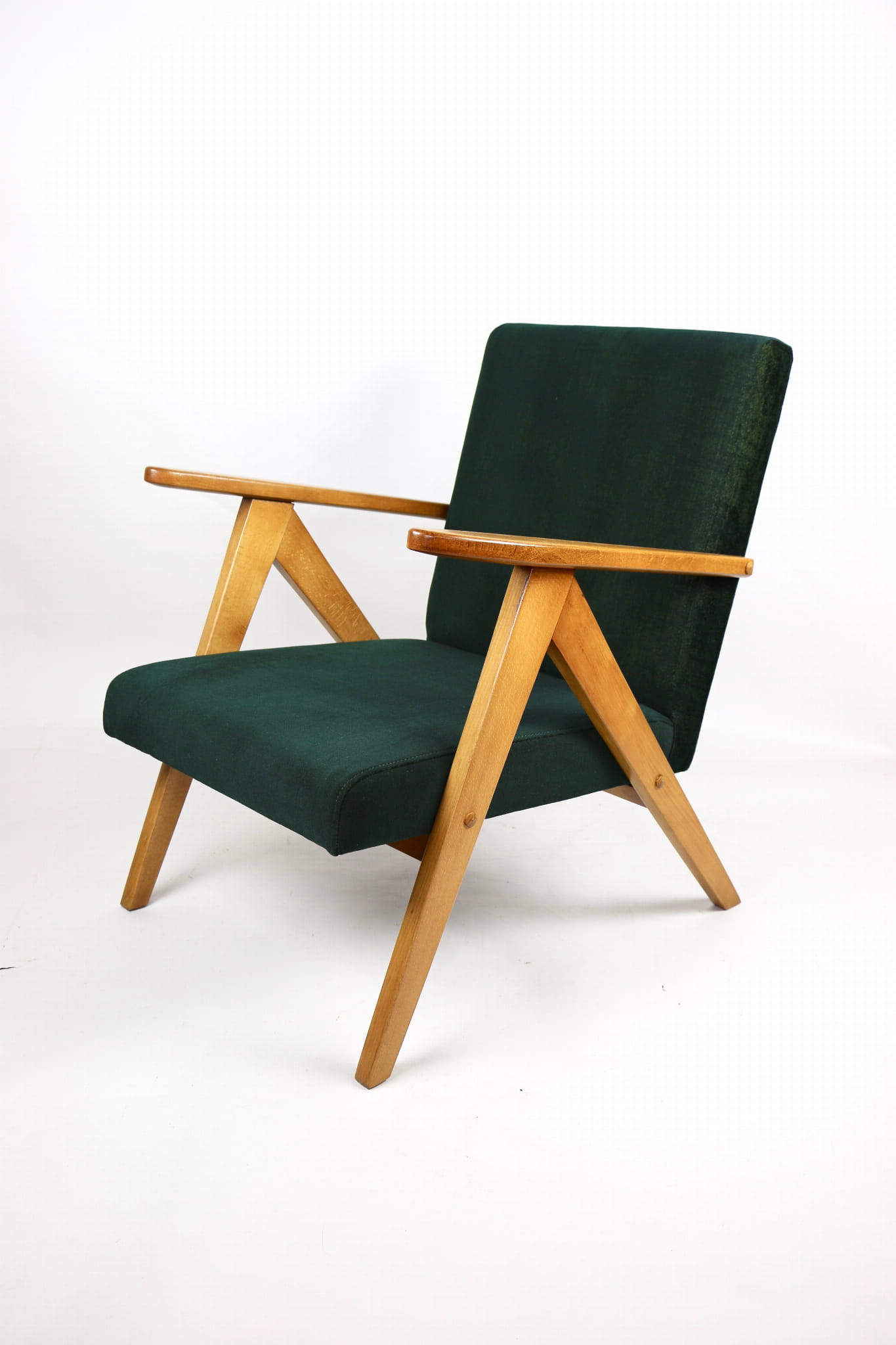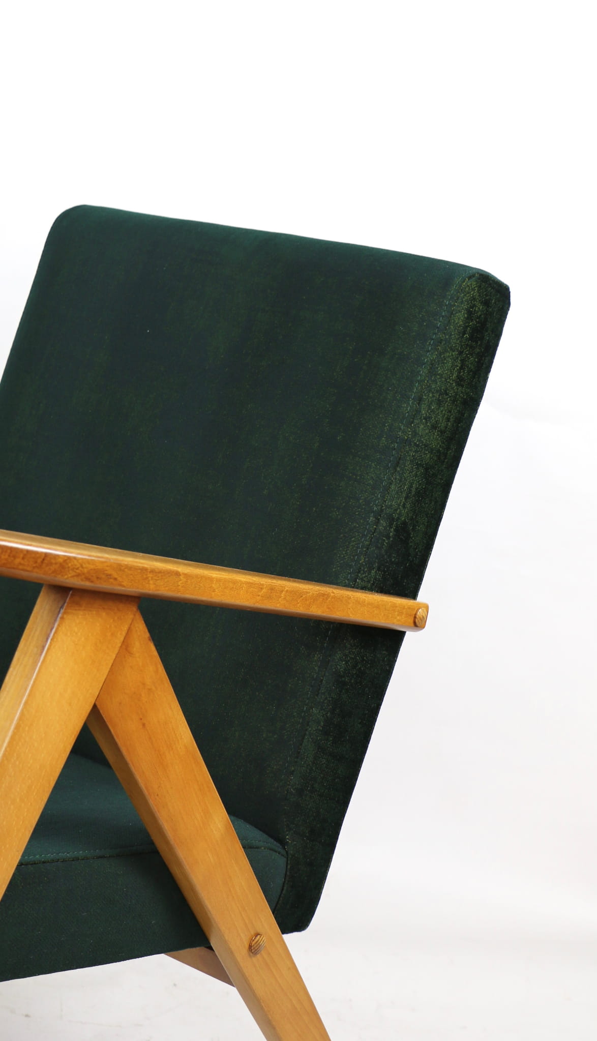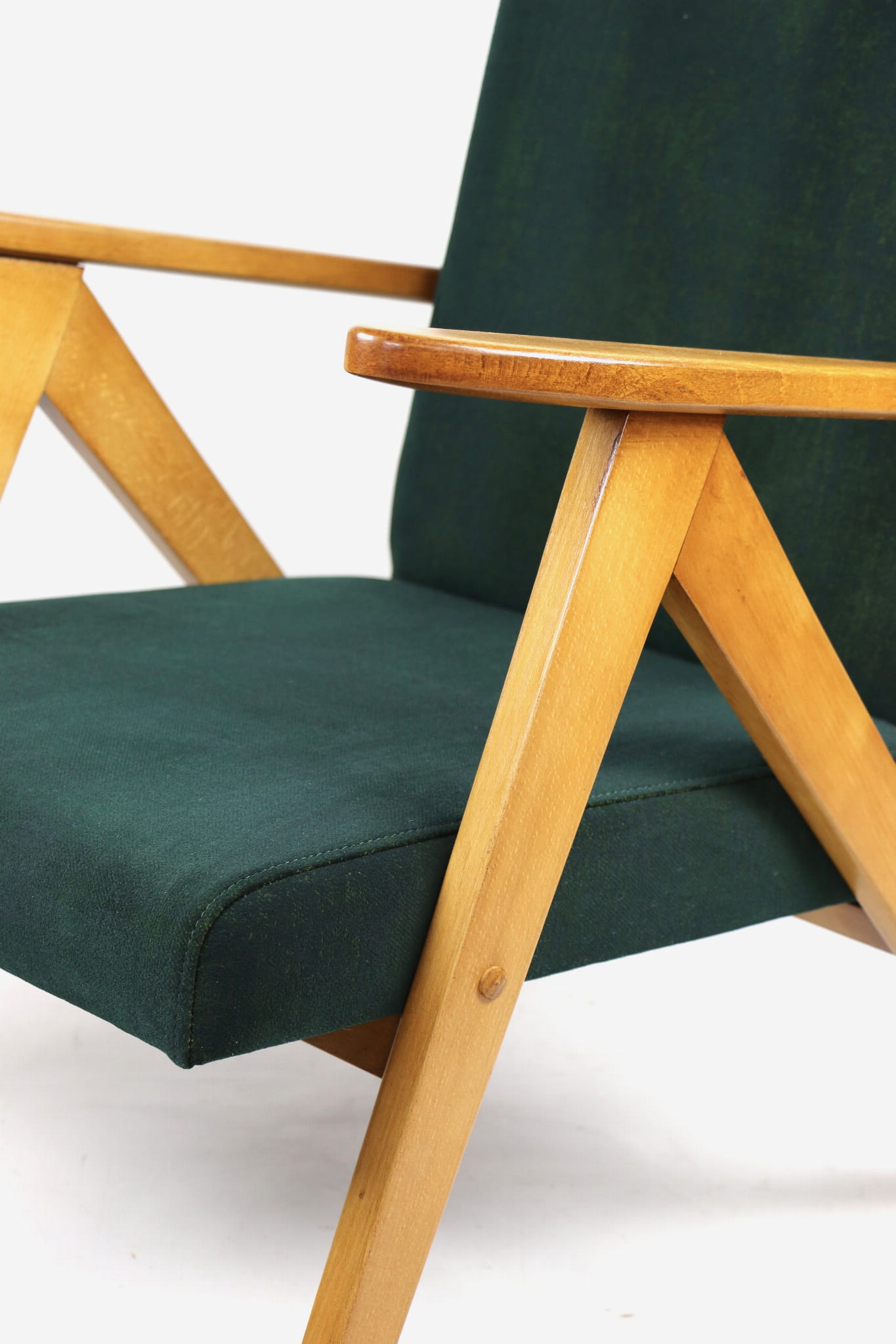 Fotel klasyczny Vintage Var B-310 z lat 70 tych. Odrestaurowany, nowe obicie pokryte aksamitnym materiałem w kolorze zielono-złotym z serii chameleon- materiał strukturalny welwet. Siedzisko bardzo wygodne, stelaż drewniany połączony z podłokietnikami w jasnej kolorystyce drewna.