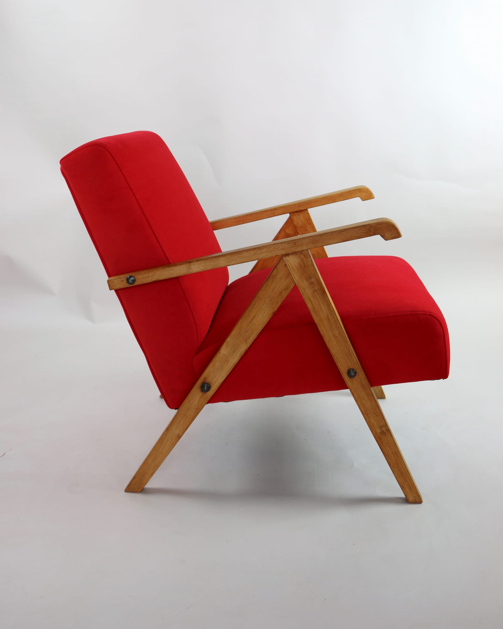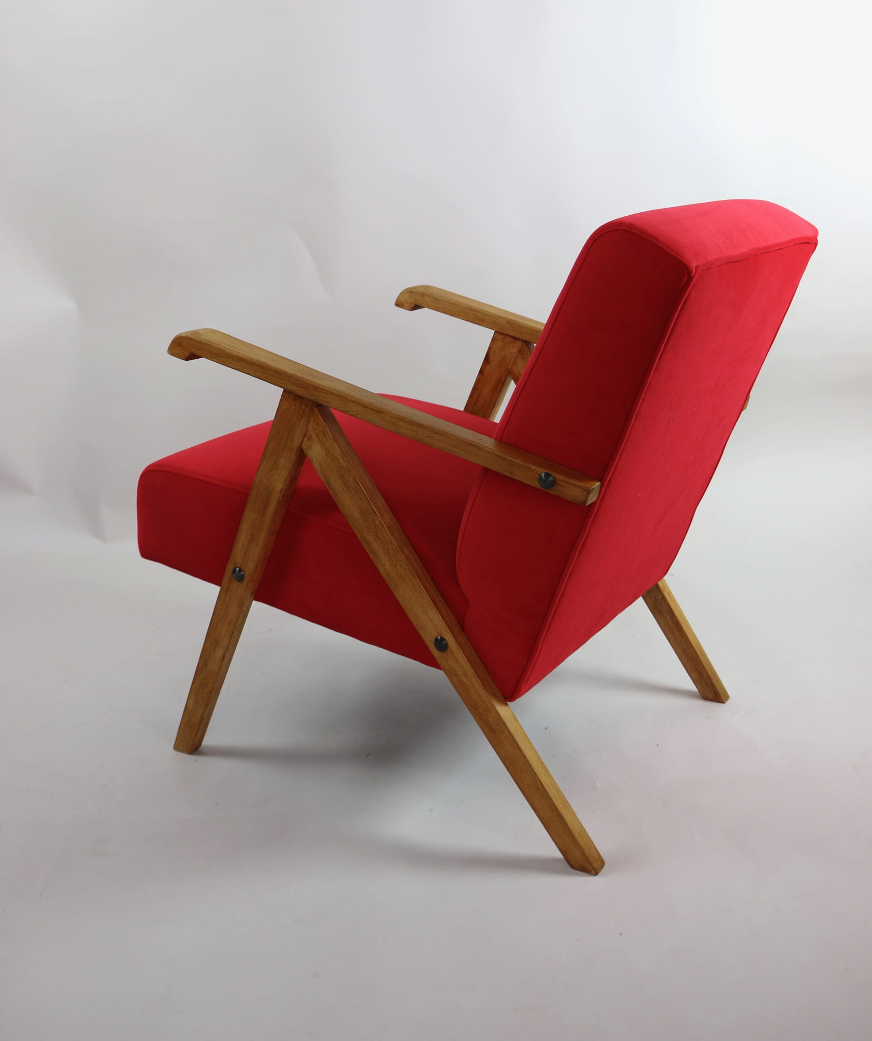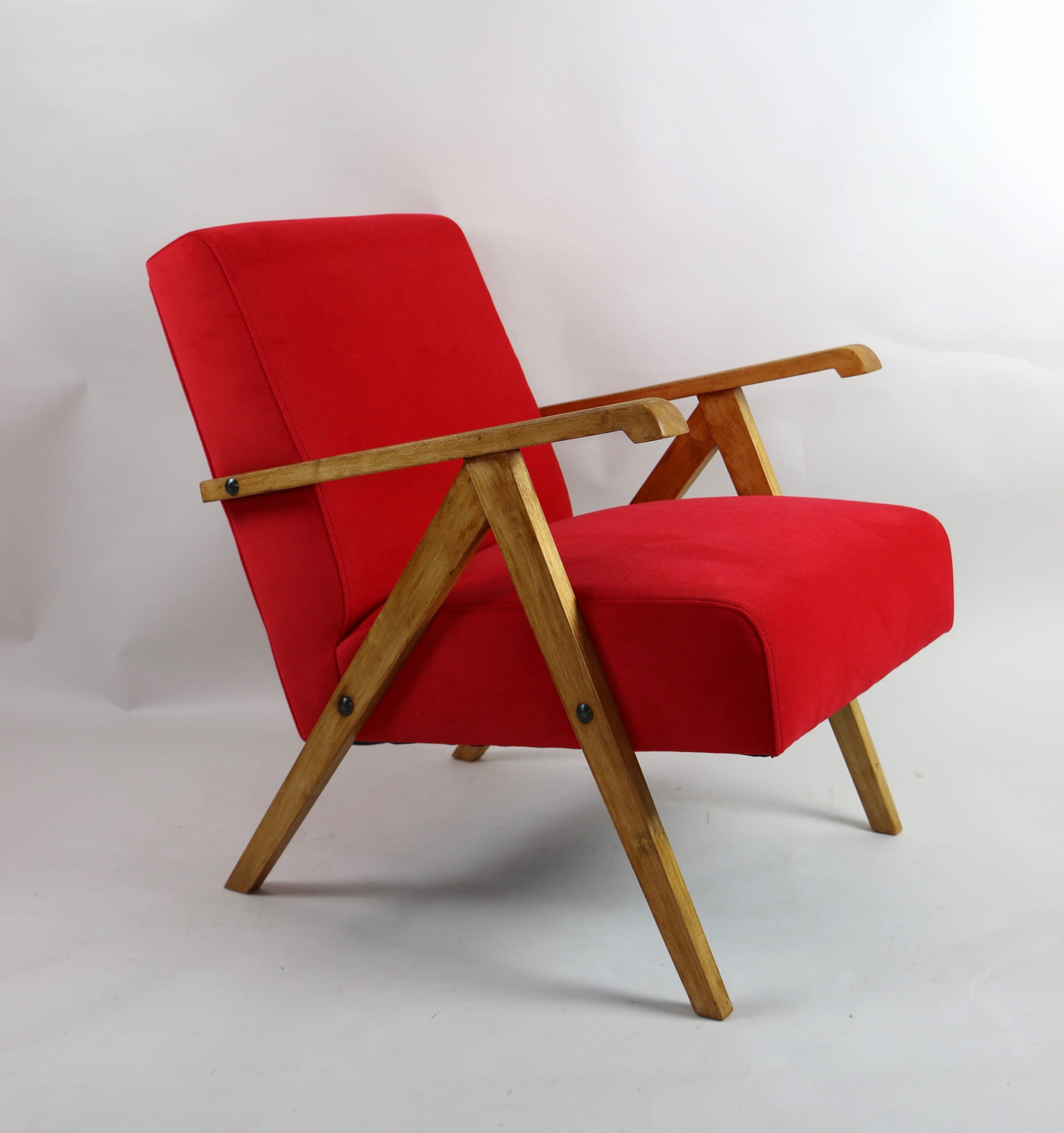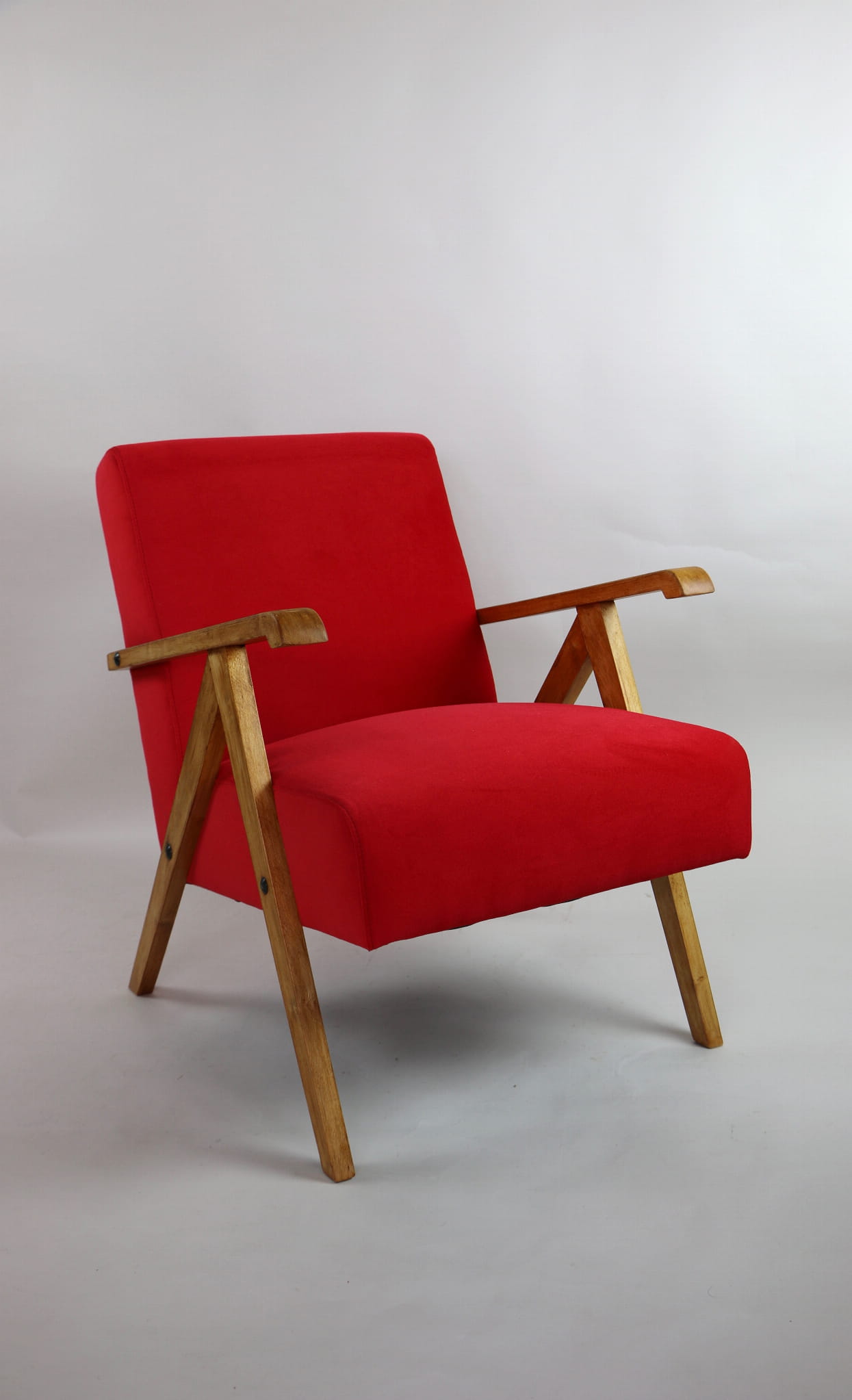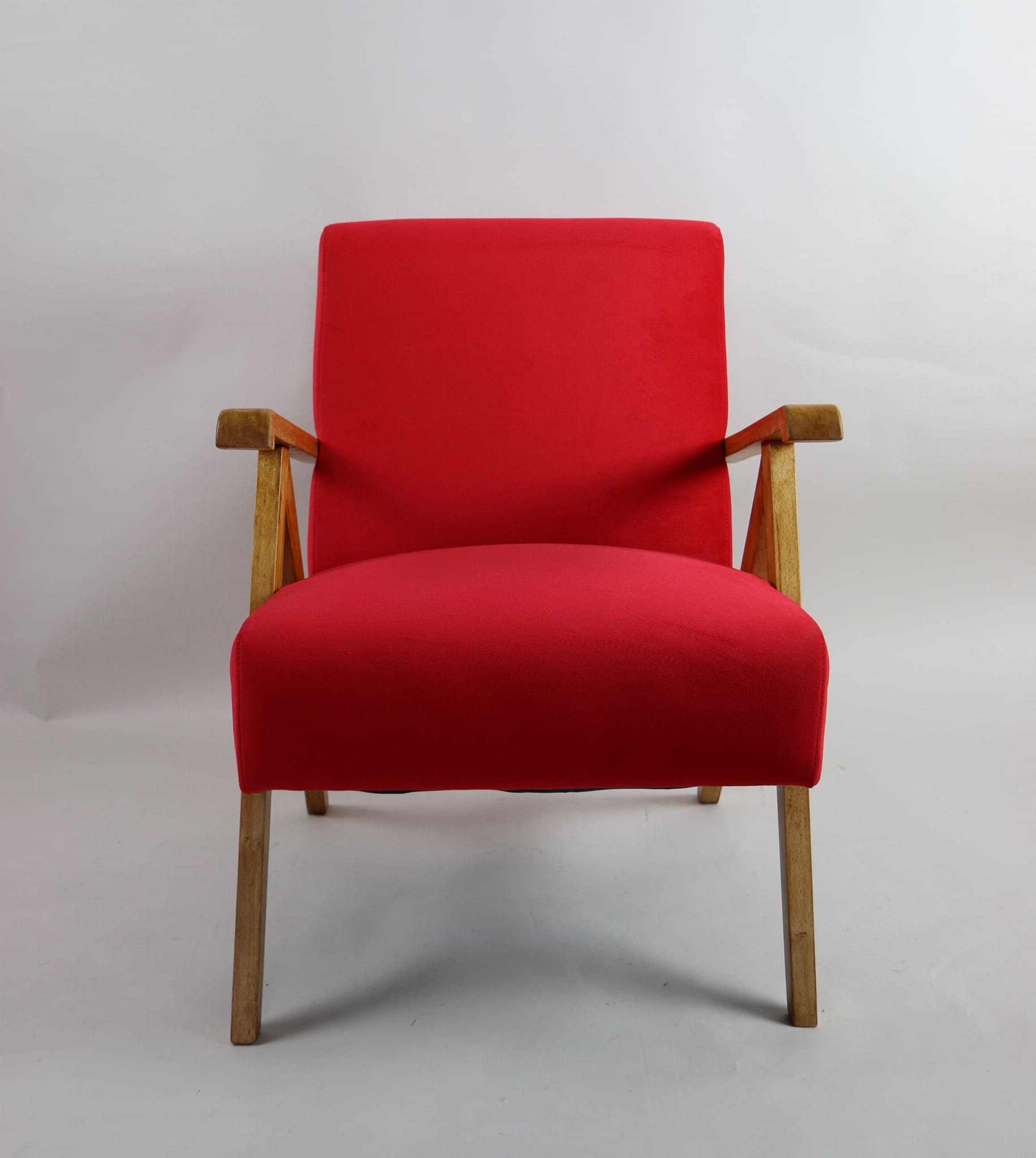 Fotel klasyczny Vintage w stylu Var z lat 70 tych. Odrestaurowany, nowe obicie pokryte aksamitnym materiałem w kolorze czerwonym - materiał typu welwet Jade 205. Siedzisko bardzo wygodne, stelaż drewniany połączony z podłokietnikami w jasnej kolorystyce drewna. Wymiary wysokość : 72 cm, szerokość : 56 cm, szerokość siedziska: 49 cm, głębokość siedziska: 46cm, głębokość mebla: 69 cm, wysokość siedziska: 42 cm, wysokość podłokietnika:60 cm